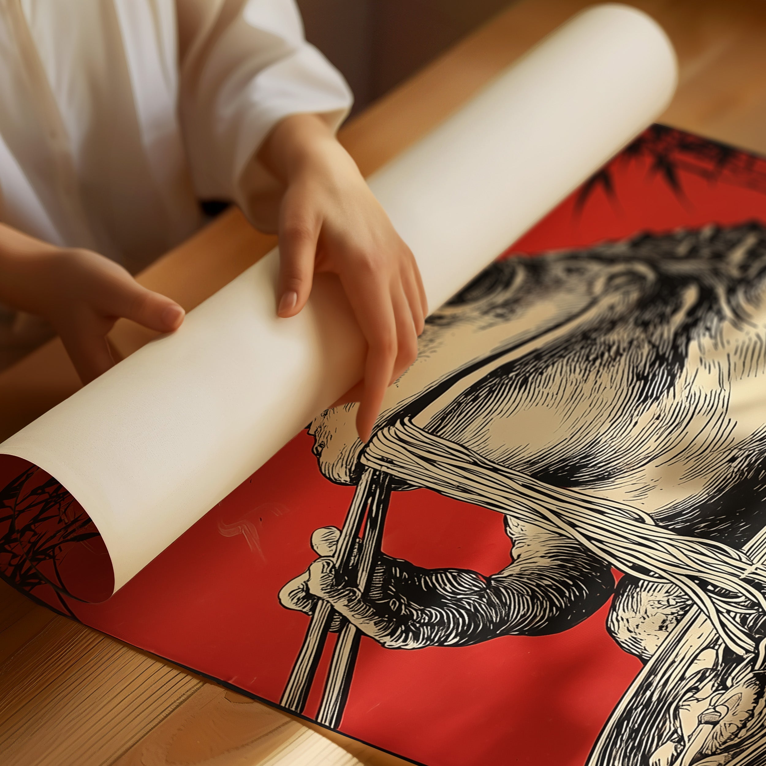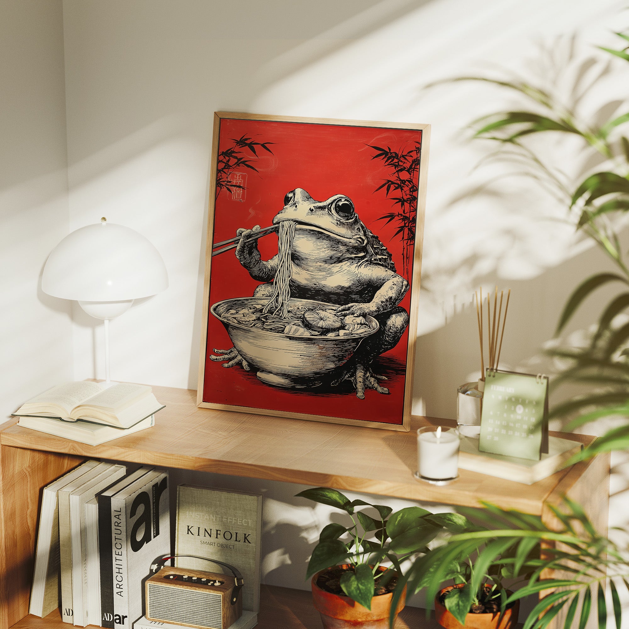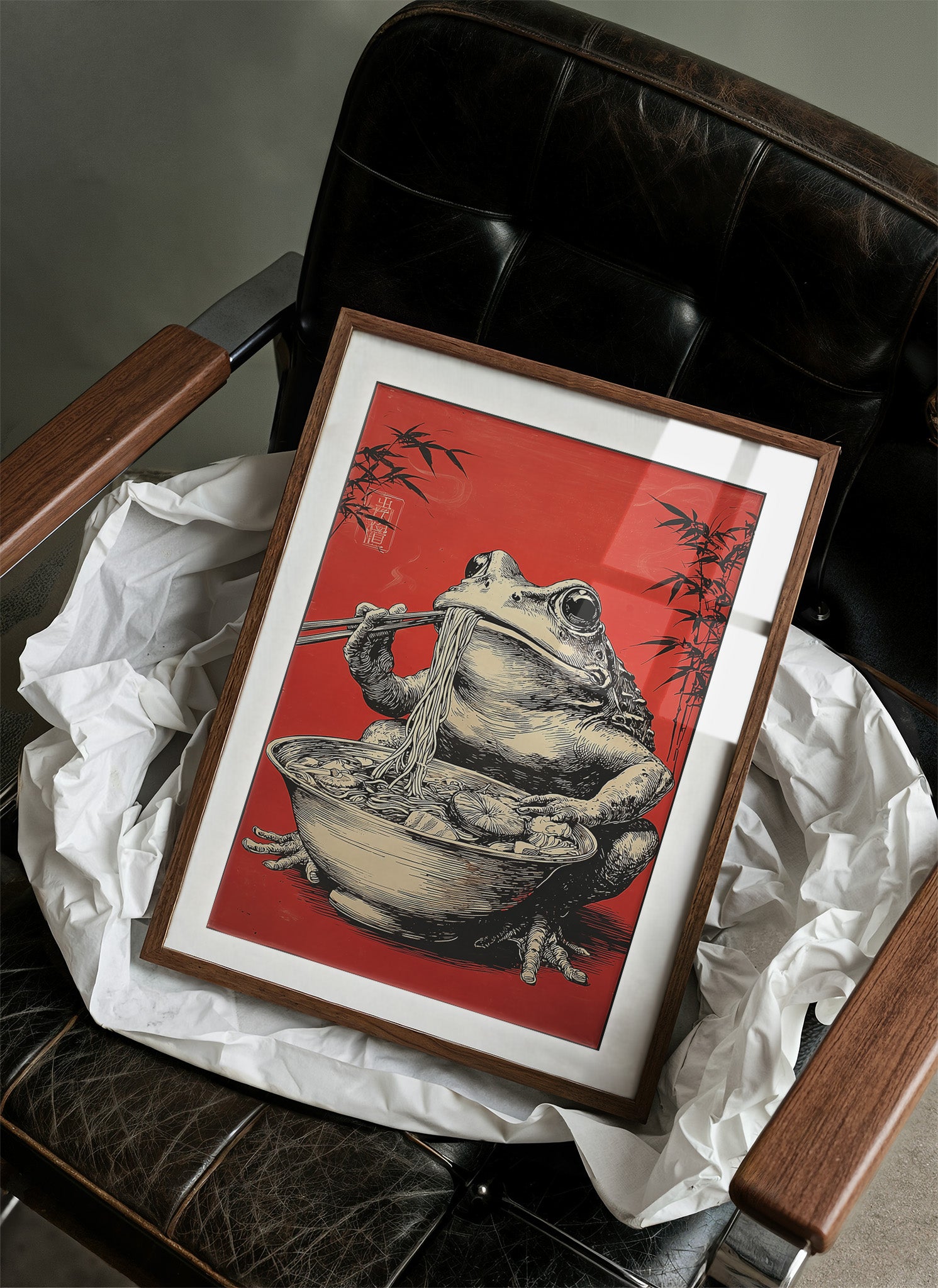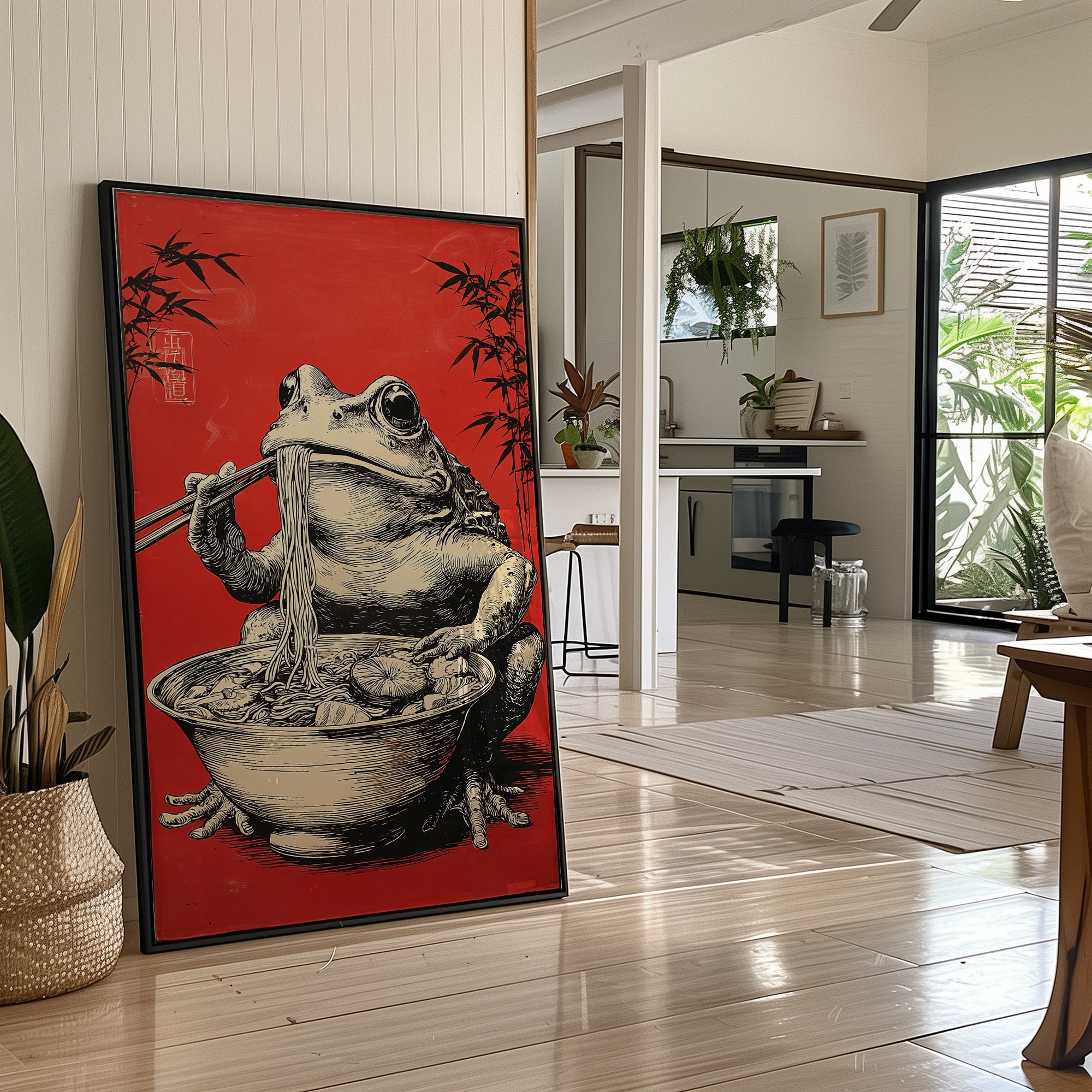 A whimsical scene unfolds as a rotund frog perches contentedly over a steaming bowl of noodles, chopsticks poised with practiced precision. Against a striking crimson background adorned with delicate bamboo silhouettes, this illustration marries Eastern artistic traditions with contemporary humor. The detailed crosshatching and masterful linework bring the amphibian gourmand to life, creating an engaging character study that balances sophistication with playful charm. This piece would make a delightful focal point in a modern dining room or add personality to a minimalist kitchen space, where its bold red backdrop and artistic narrative can spark conversation.