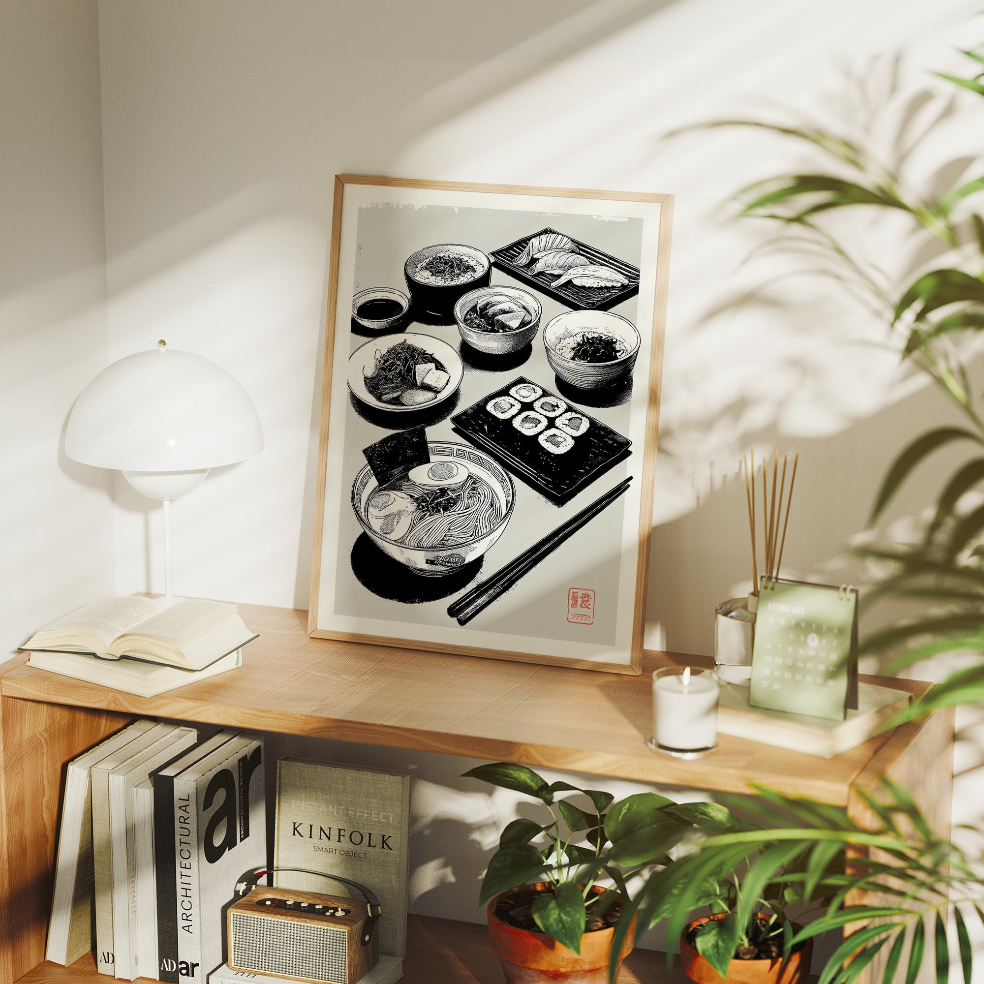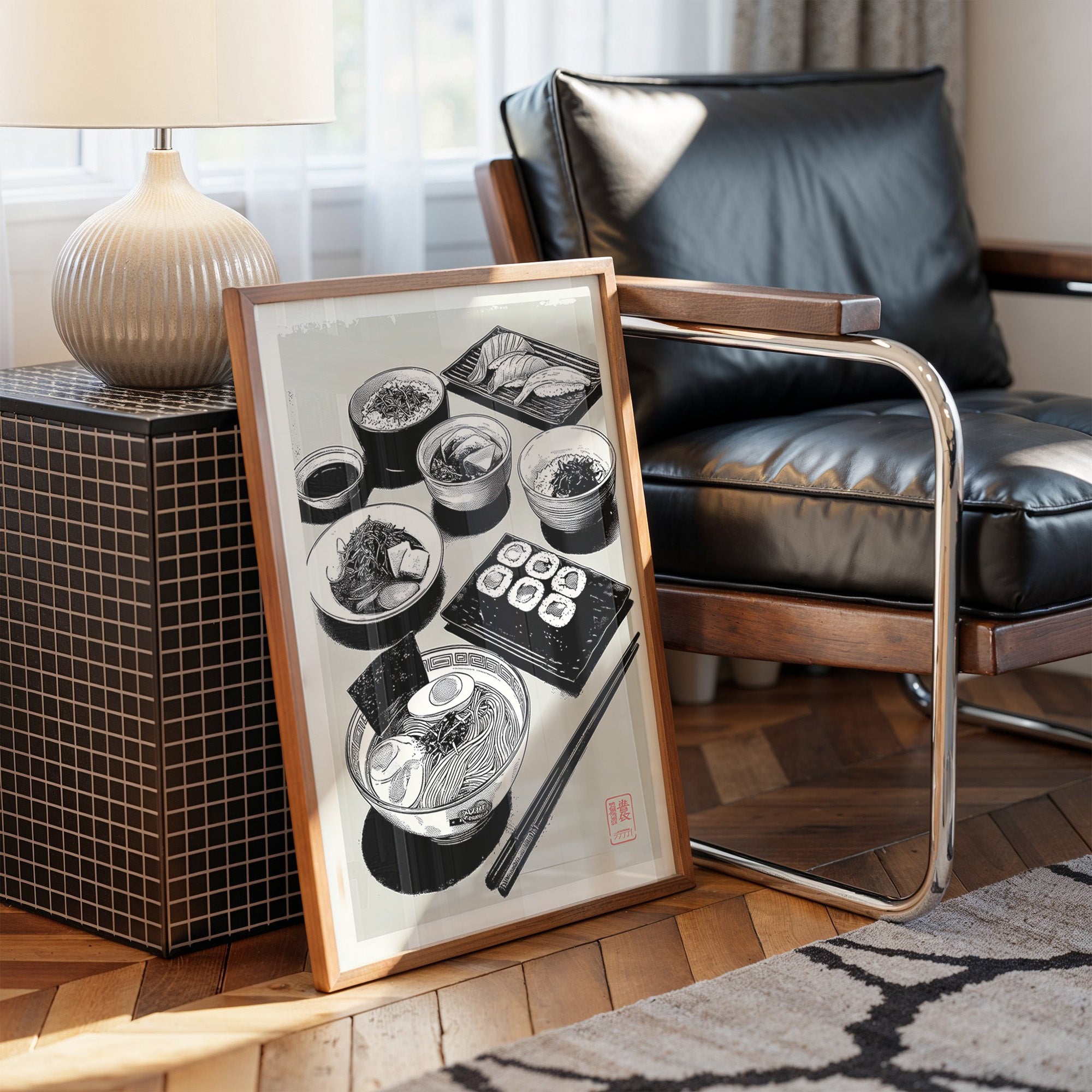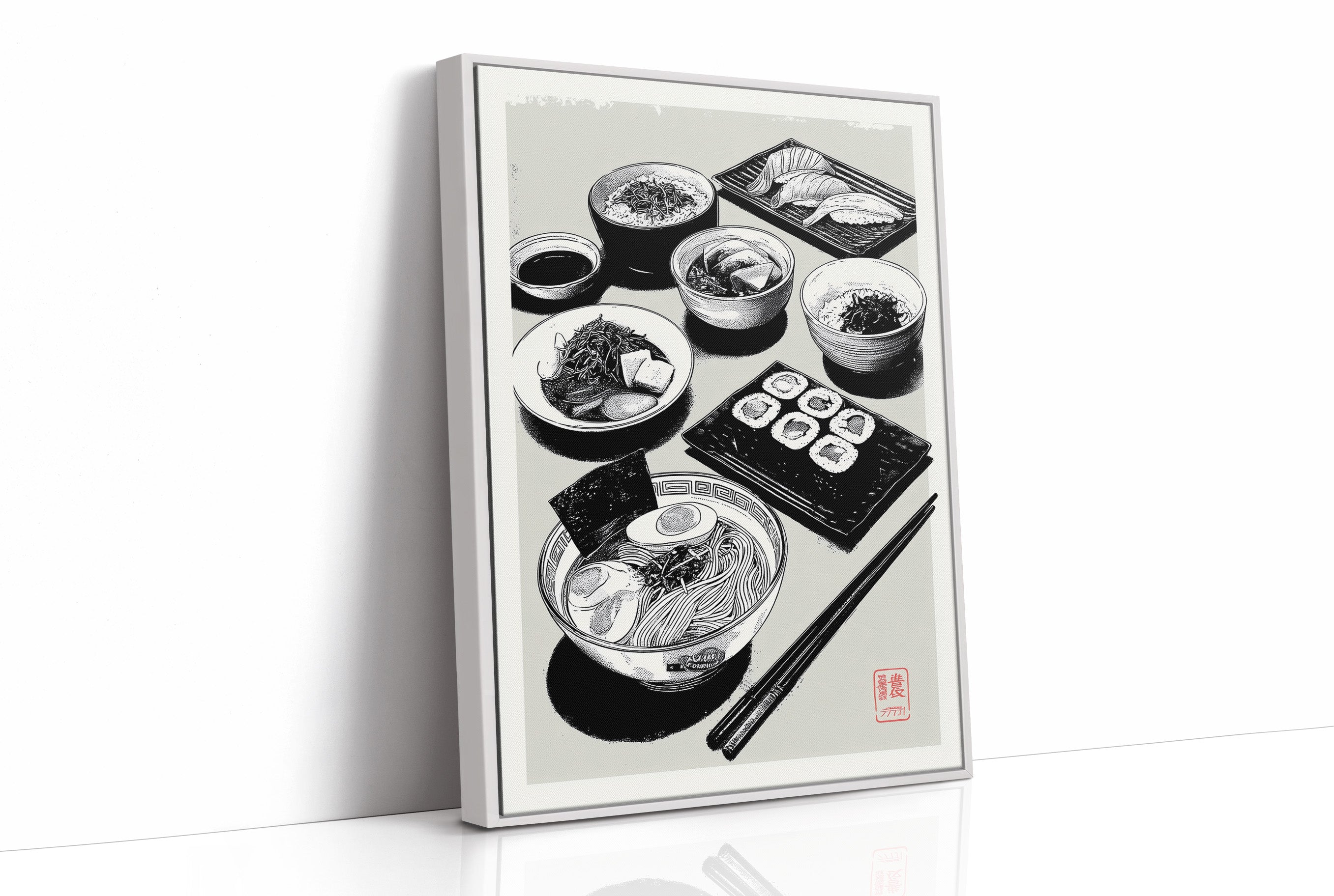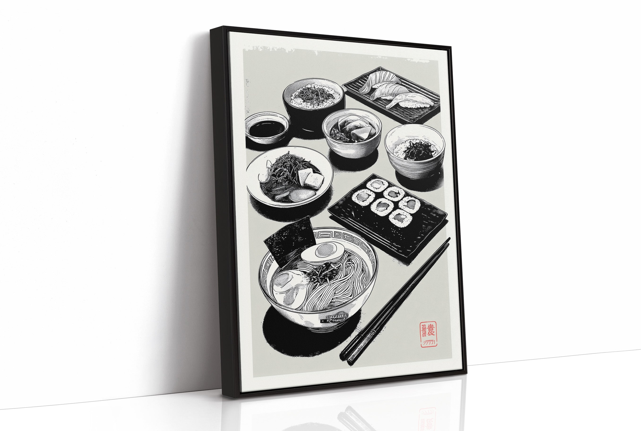 Steam rises from bowls of ramen while sushi waits in perfect formation, each dish a chapter in an evening's story. The monochromatic illustration captures the essence of Japanese cuisine through bold strokes and delicate details, from the spiral of noodles to the precise arrangement of rolls. The composition speaks of both tradition and artistry, where every element from the chopsticks to the signature seal contributes to the cultural narrative. This striking black and white piece would bring sophisticated charm to a modern dining room or add character to a minimalist kitchen space.