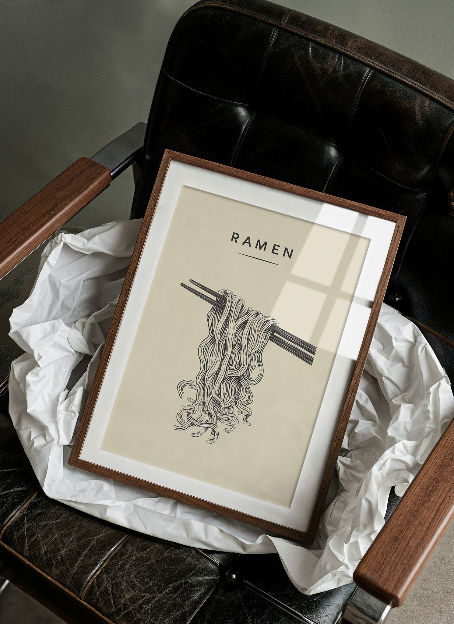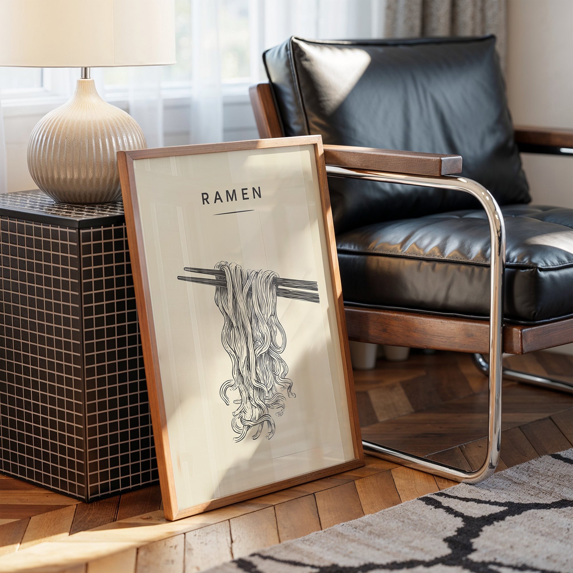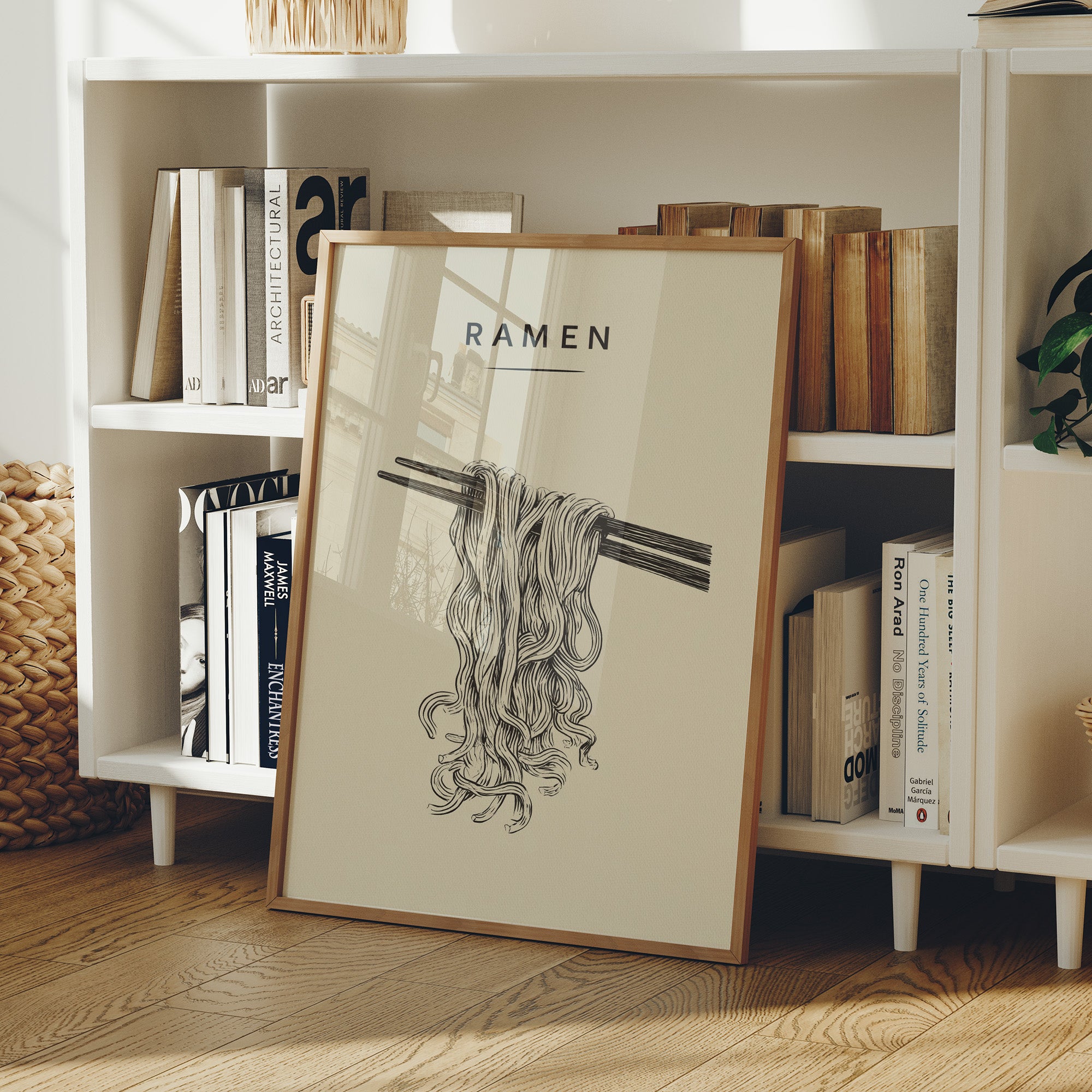 Sunlight streams across a serene corner, casting gentle shadows on a minimalist ramen illustration that captures the essence of Japanese cuisine. The simple black line drawing against cream paper tells a story of culinary artistry, with flowing noodles suspended in perfect balance by chopsticks. This tranquil scene is complemented by the natural warmth of wooden furniture, lush plants, and carefully curated lifestyle elements. This piece would bring a sophisticated touch to a modern dining room or kitchen, especially in spaces that embrace Japanese minimalism or contemporary design aesthetics.
