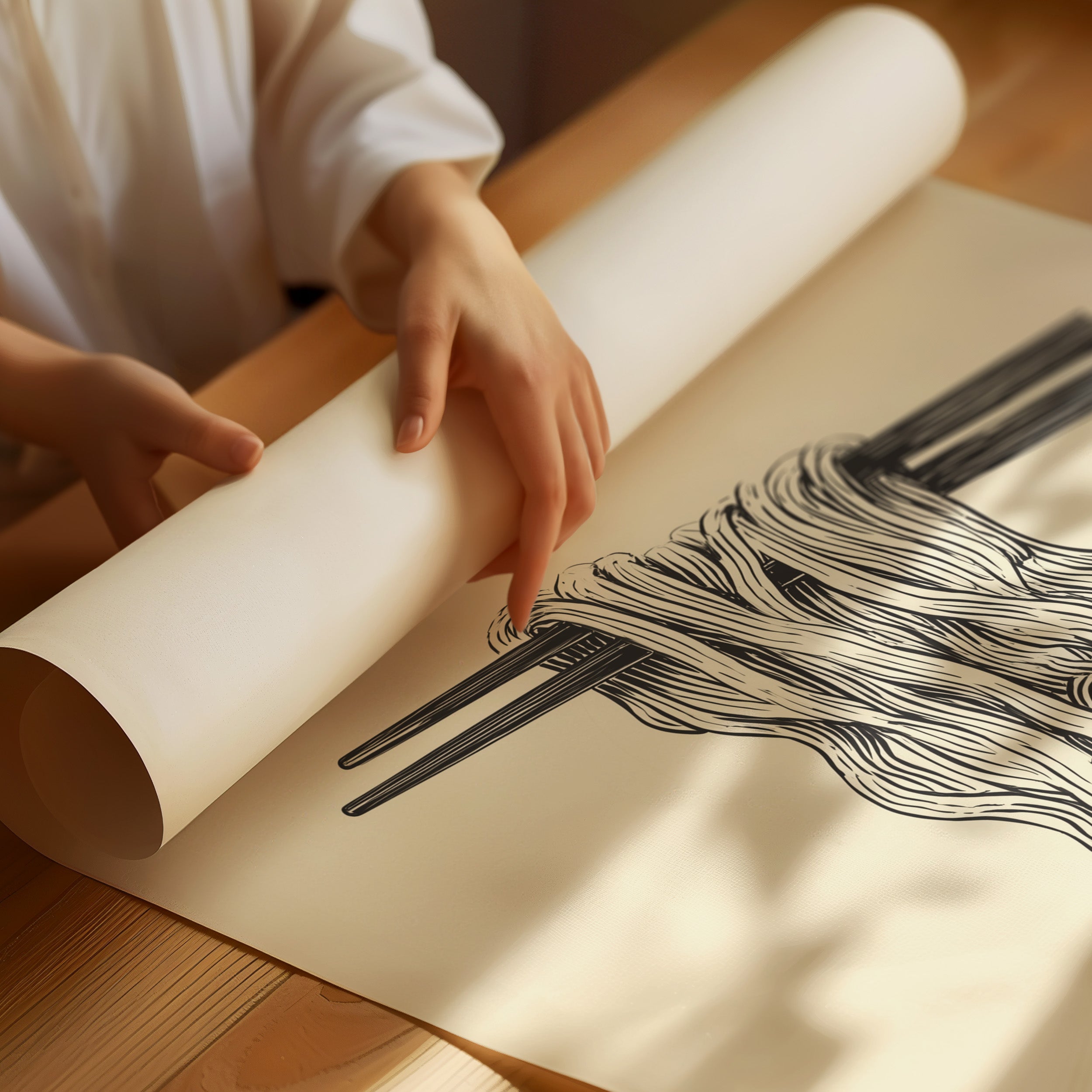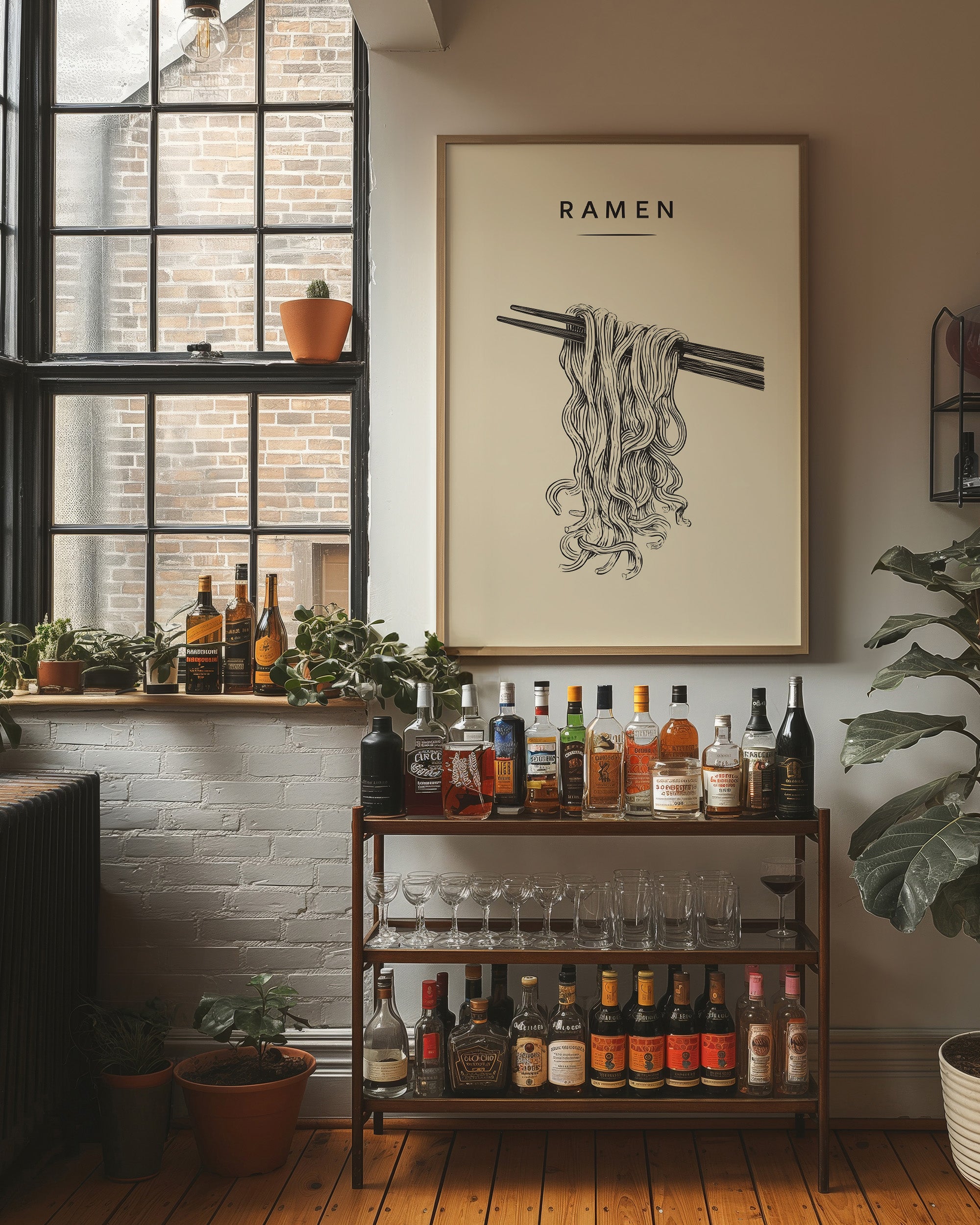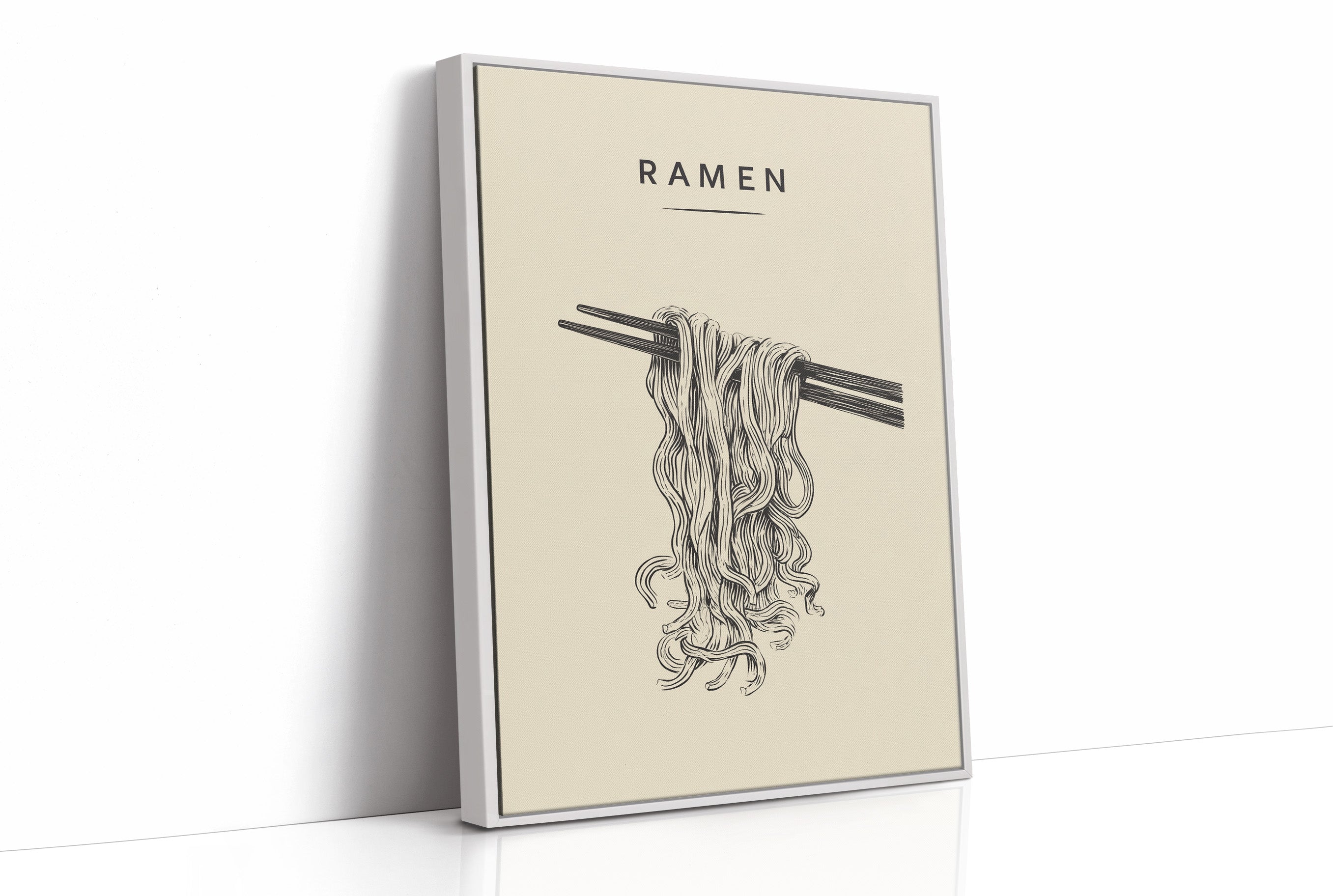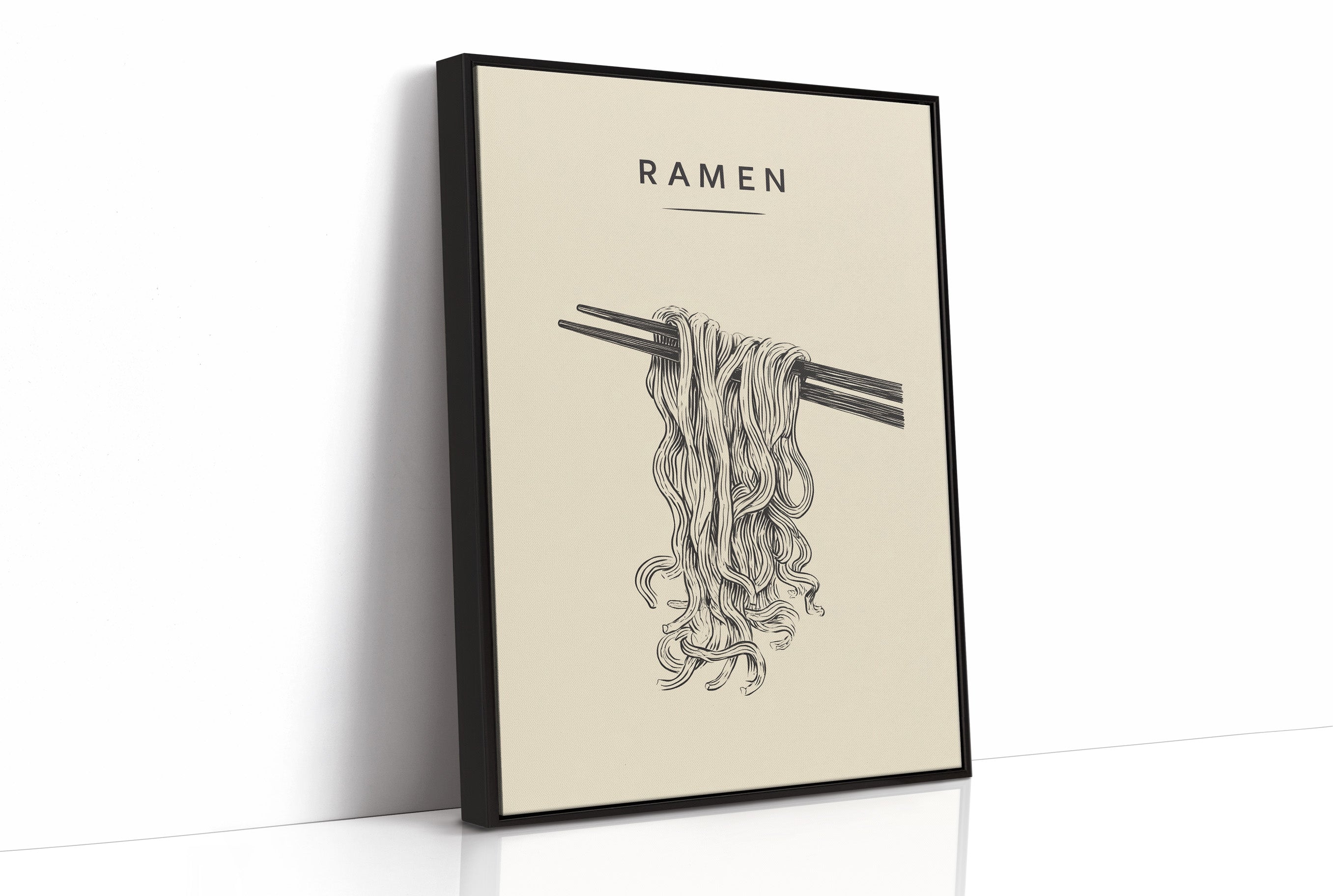 Sunlight streams across a serene corner, casting gentle shadows on a minimalist ramen illustration that captures the essence of Japanese cuisine. The simple black line drawing against cream paper tells a story of culinary artistry, with flowing noodles suspended in perfect balance by chopsticks. This tranquil scene is complemented by the natural warmth of wooden furniture, lush plants, and carefully curated lifestyle elements. This piece would bring a sophisticated touch to a modern dining room or kitchen, especially in spaces that embrace Japanese minimalism or contemporary design aesthetics.