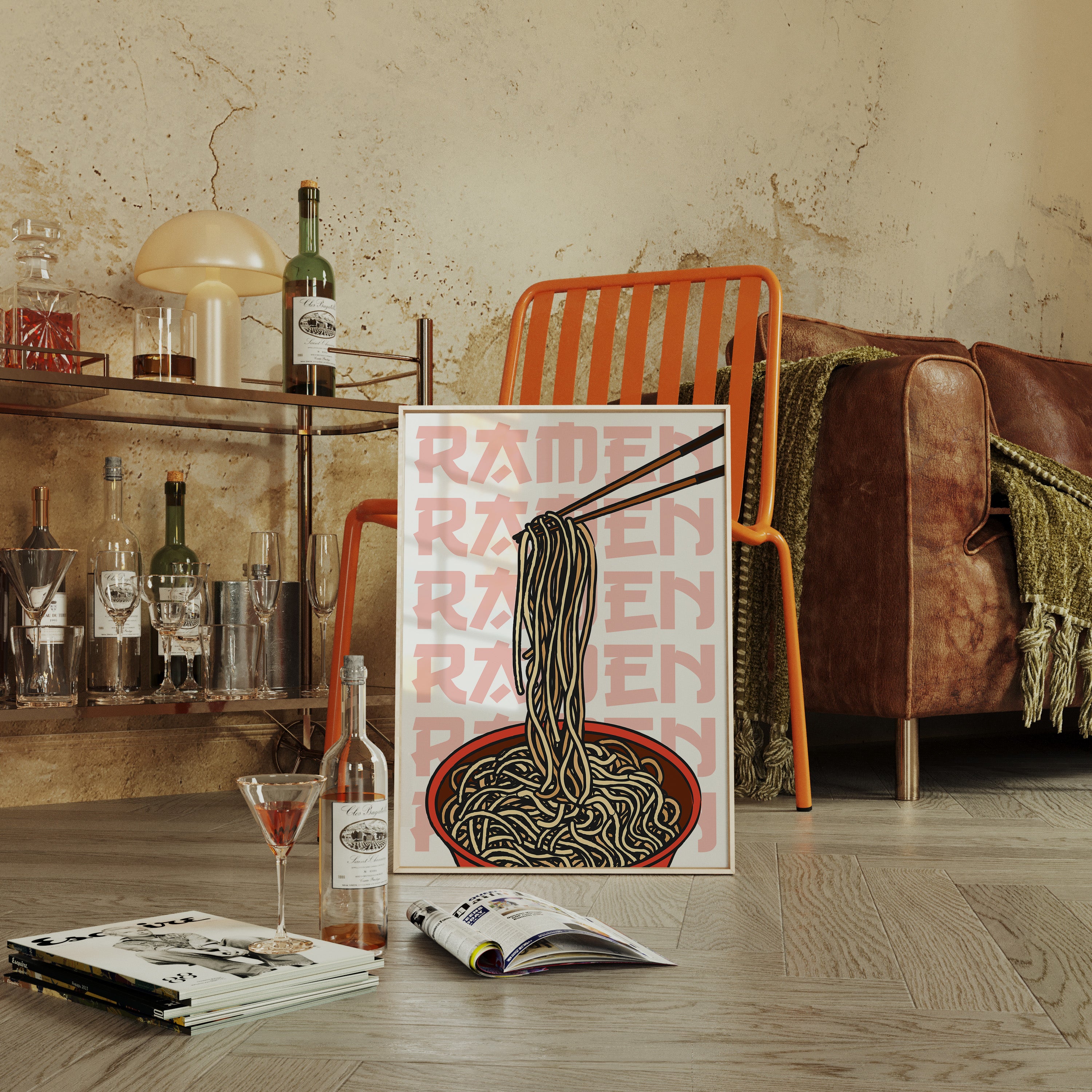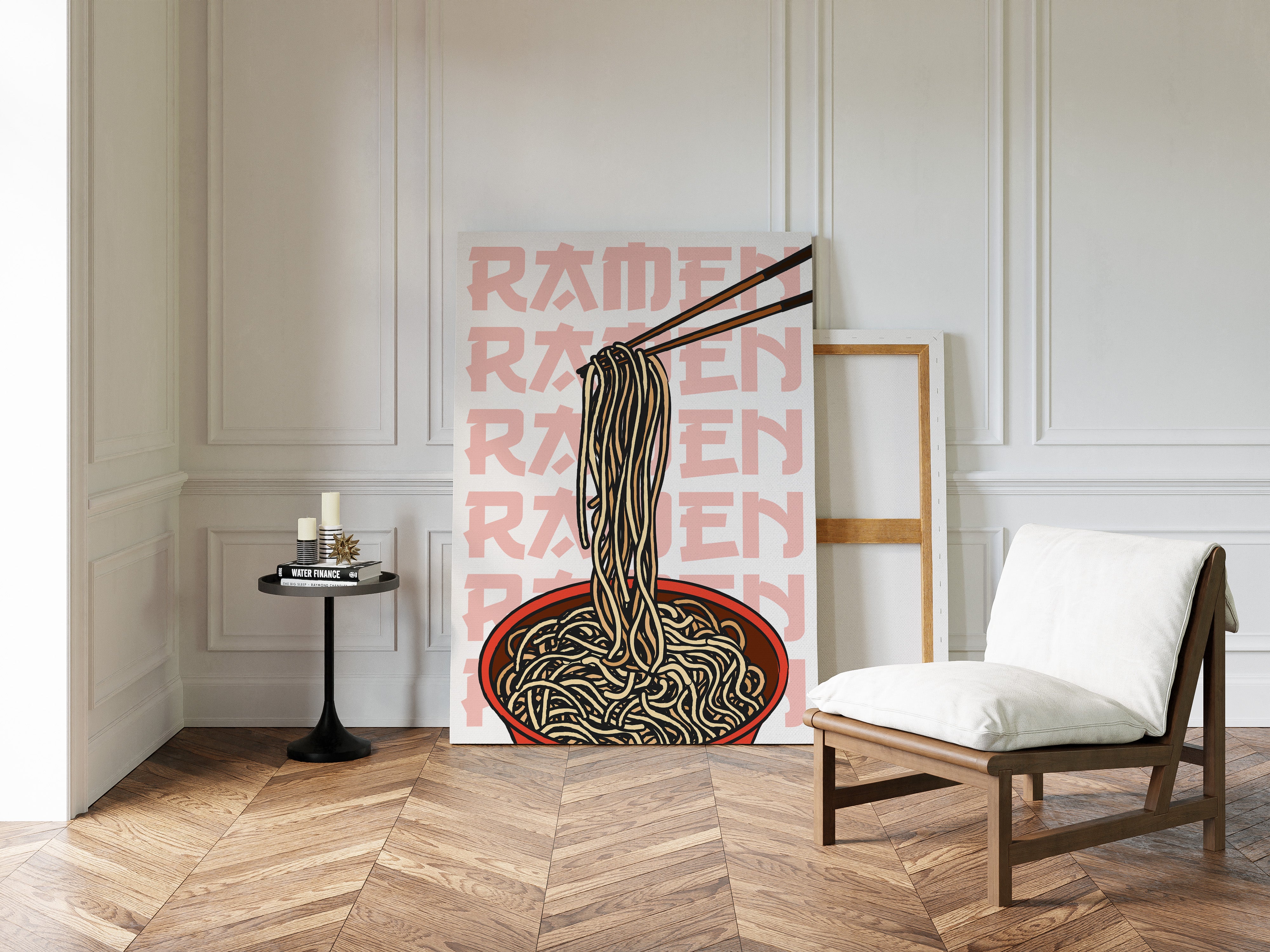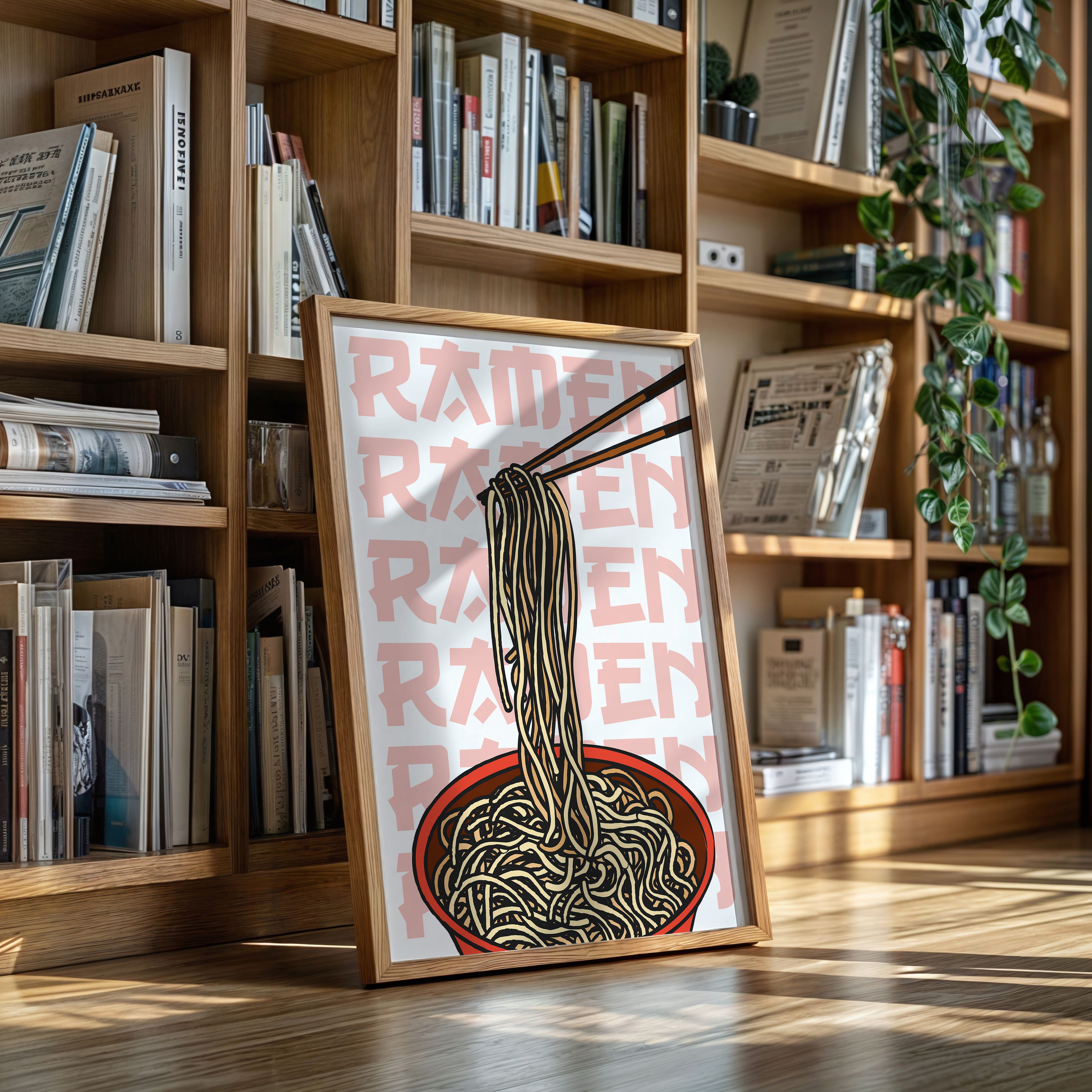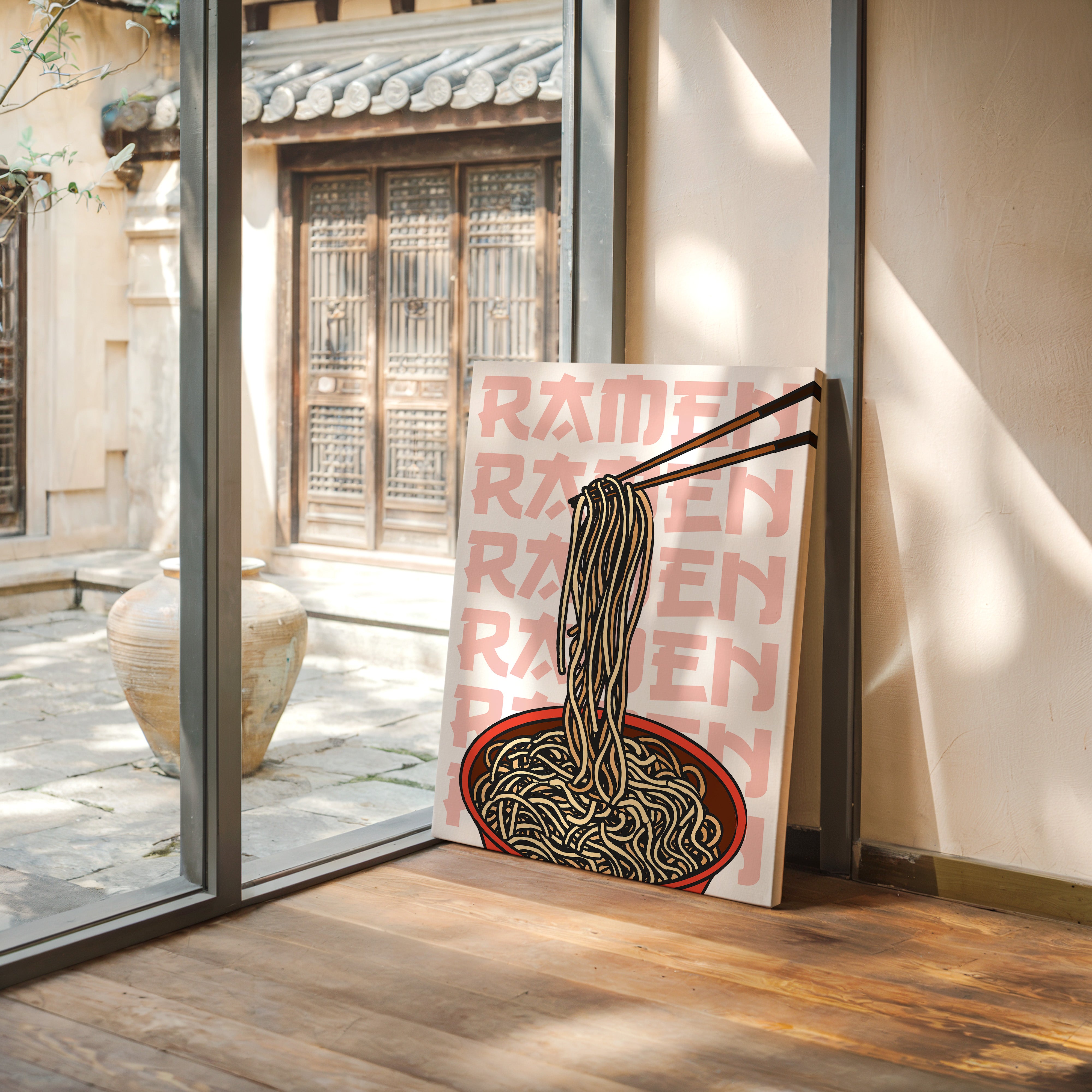 Steam rises like urban poetry from a bowl of perfectly twisted noodles, captured in a moment of suspended animation. This piece from our Contemporary collection merges pop art boldness with Japanese culinary culture. The repeated text creates a hypnotic backdrop in soft pink, while the dramatic lift of the noodles by chopsticks becomes a powerful focal point, celebrating the simple beauty of everyday cuisine. The minimalist composition transforms a casual meal into an artful meditation on modern dining culture. Perfect for adding a playful yet sophisticated touch to dining rooms, modern kitchens, or restaurant spaces.