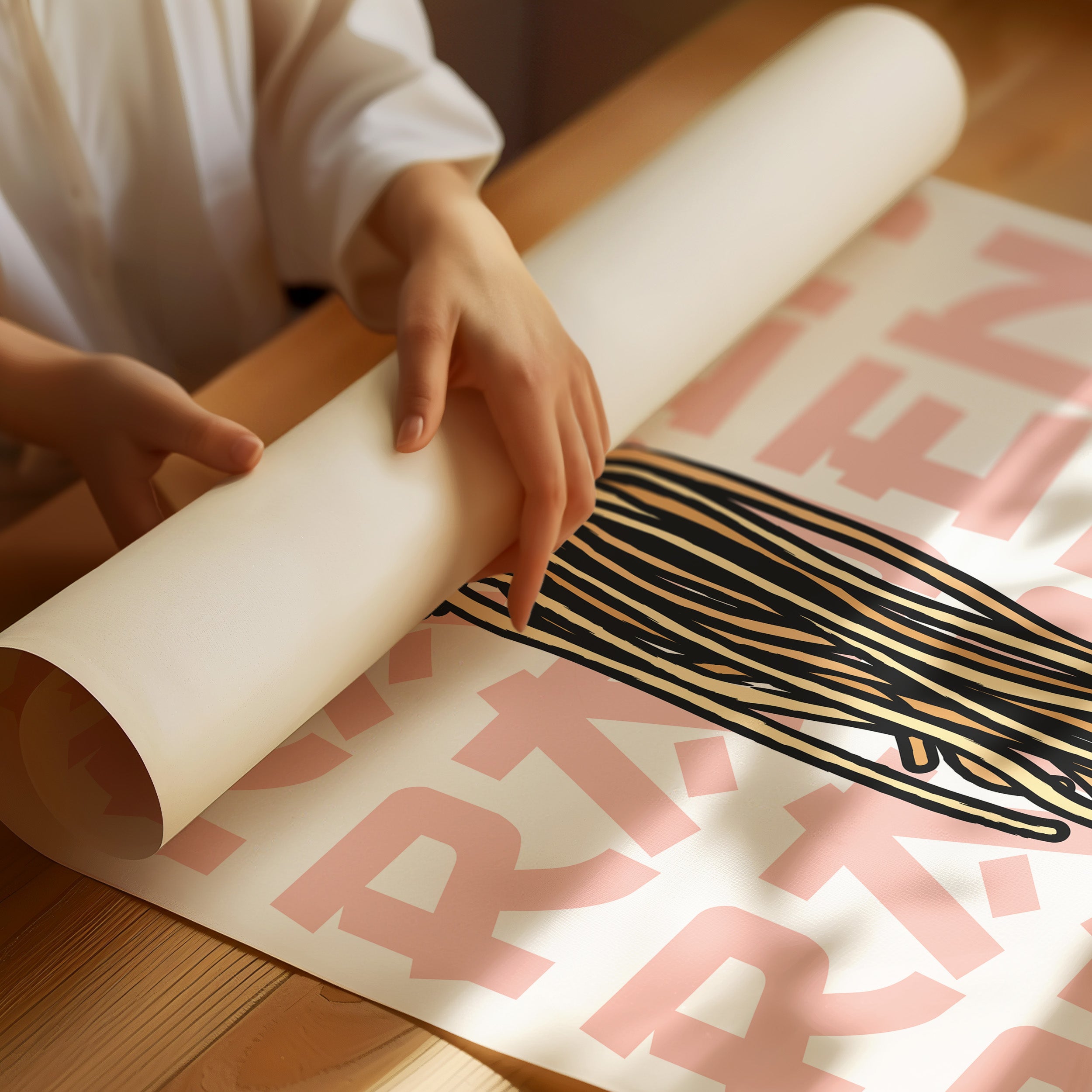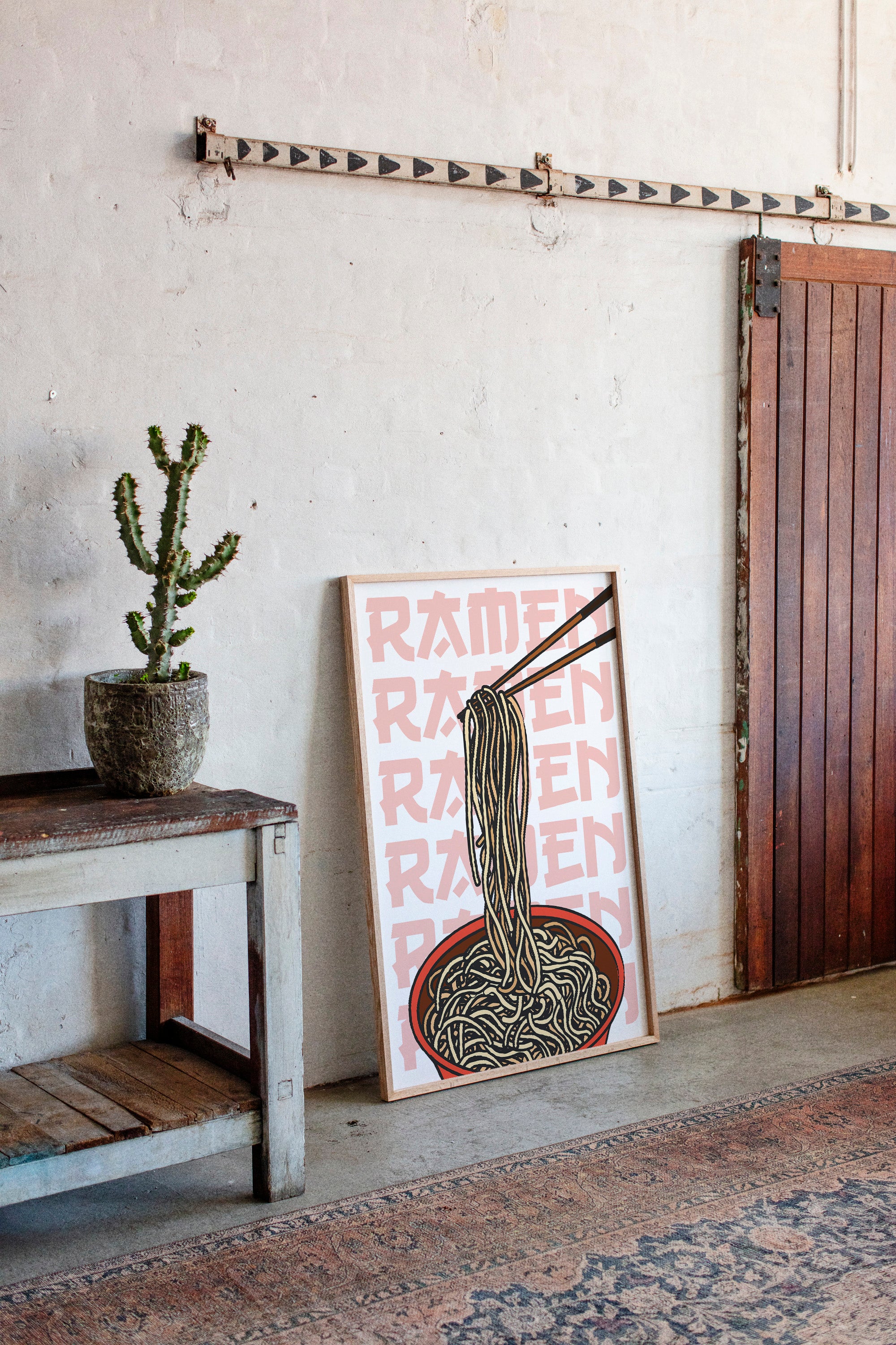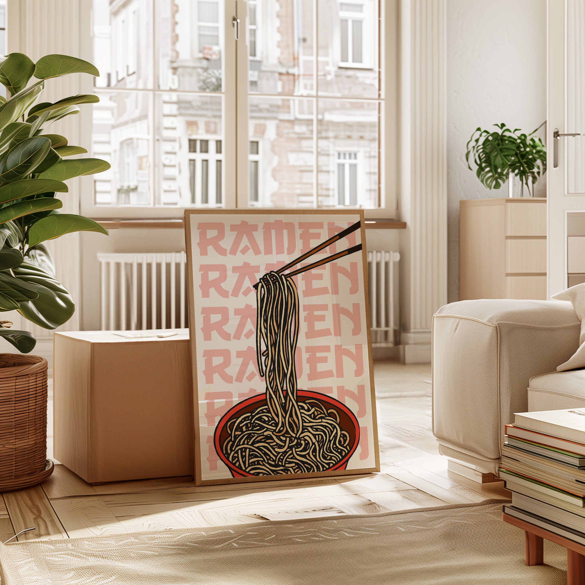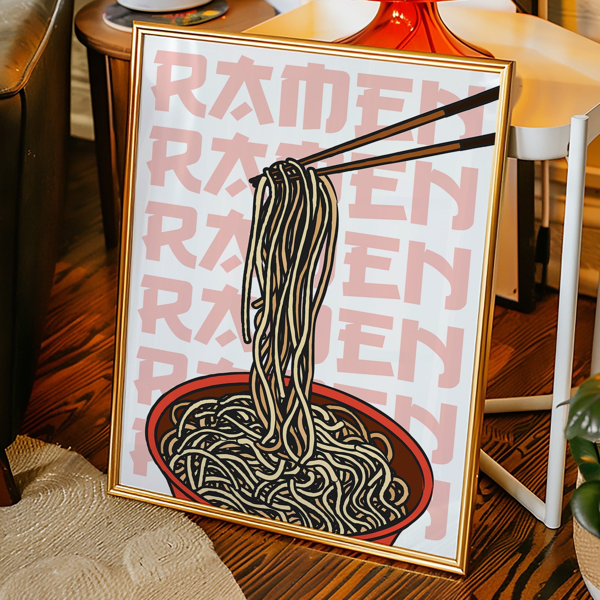 Steam rises like urban poetry from a bowl of perfectly twisted noodles, captured in a moment of suspended animation. This piece from our Contemporary collection merges pop art boldness with Japanese culinary culture. The repeated text creates a hypnotic backdrop in soft pink, while the dramatic lift of the noodles by chopsticks becomes a powerful focal point, celebrating the simple beauty of everyday cuisine. The minimalist composition transforms a casual meal into an artful meditation on modern dining culture. Perfect for adding a playful yet sophisticated touch to dining rooms, modern kitchens, or restaurant spaces.