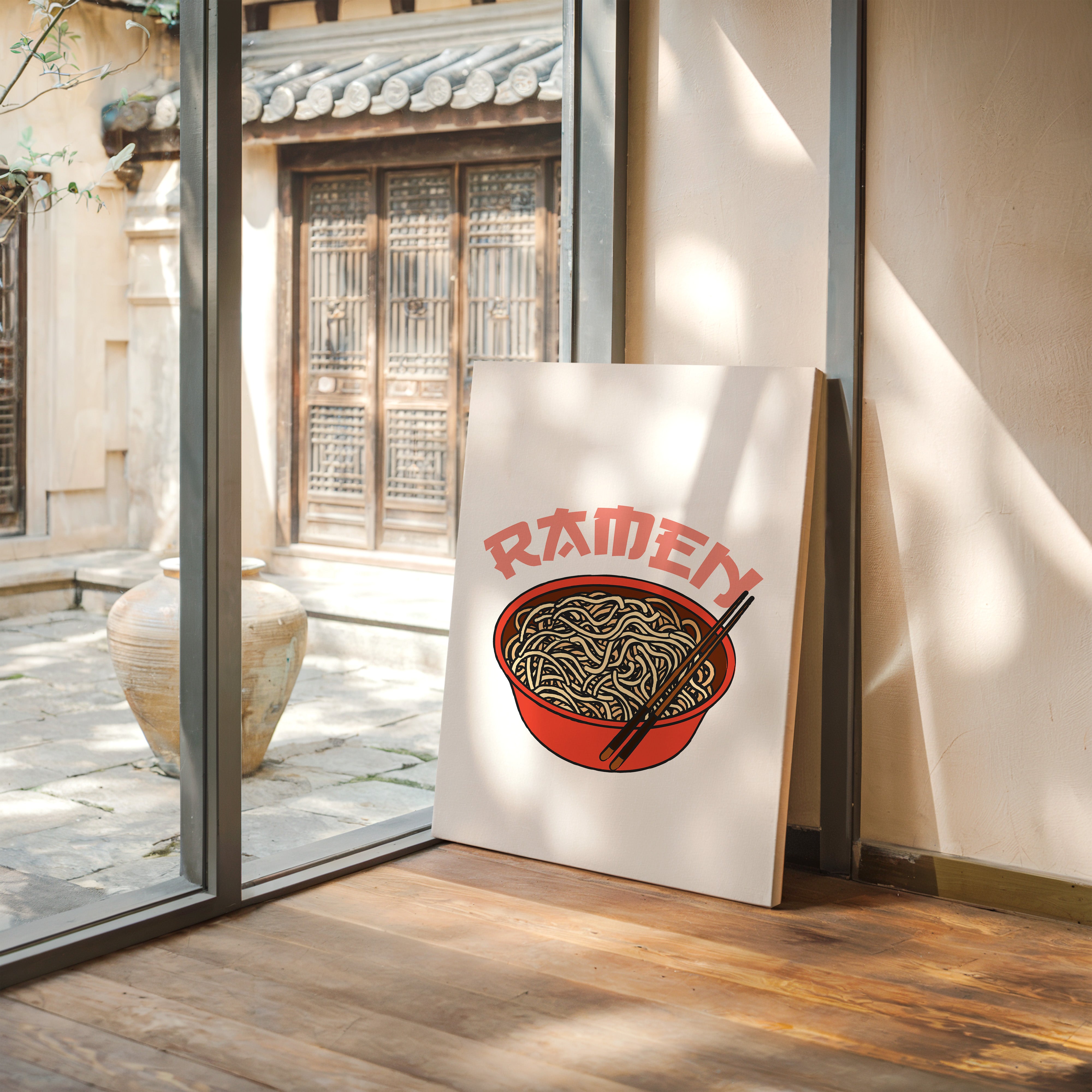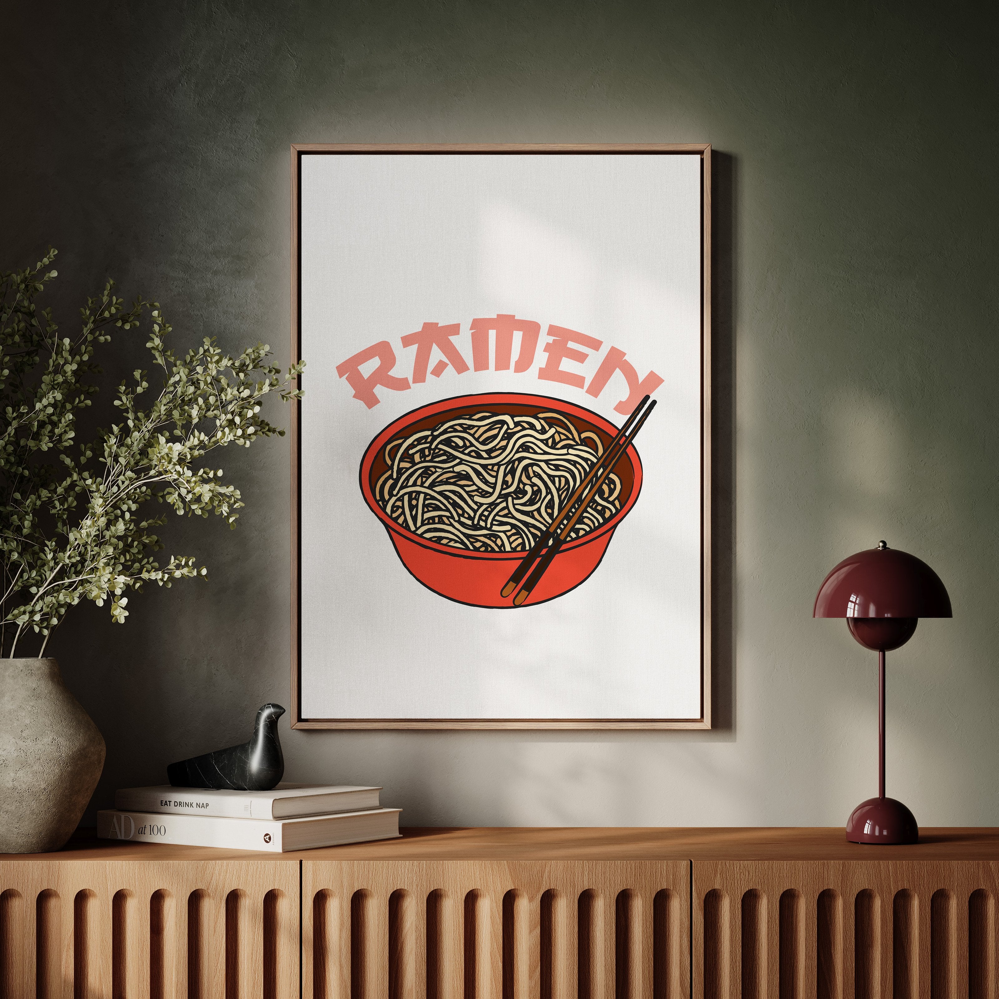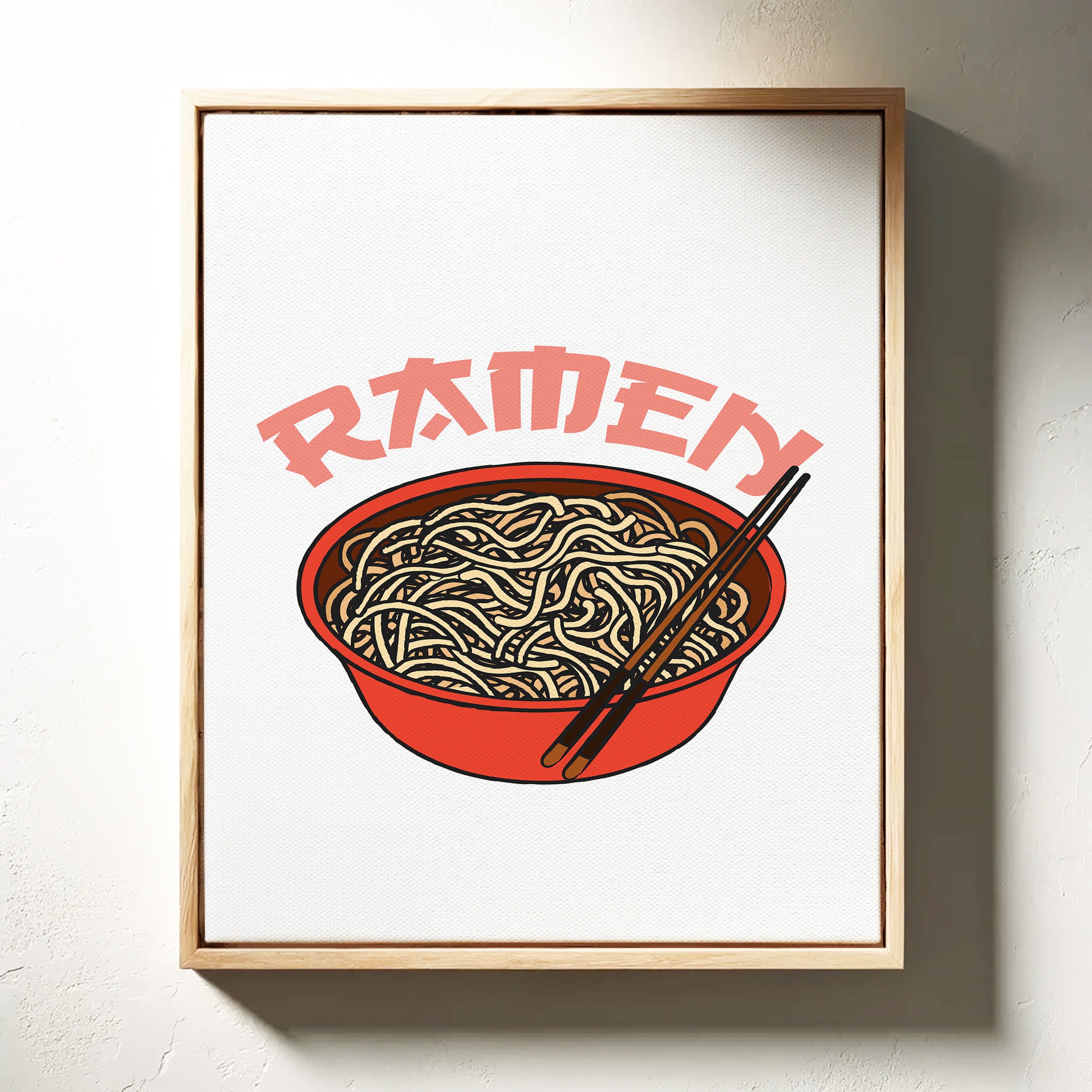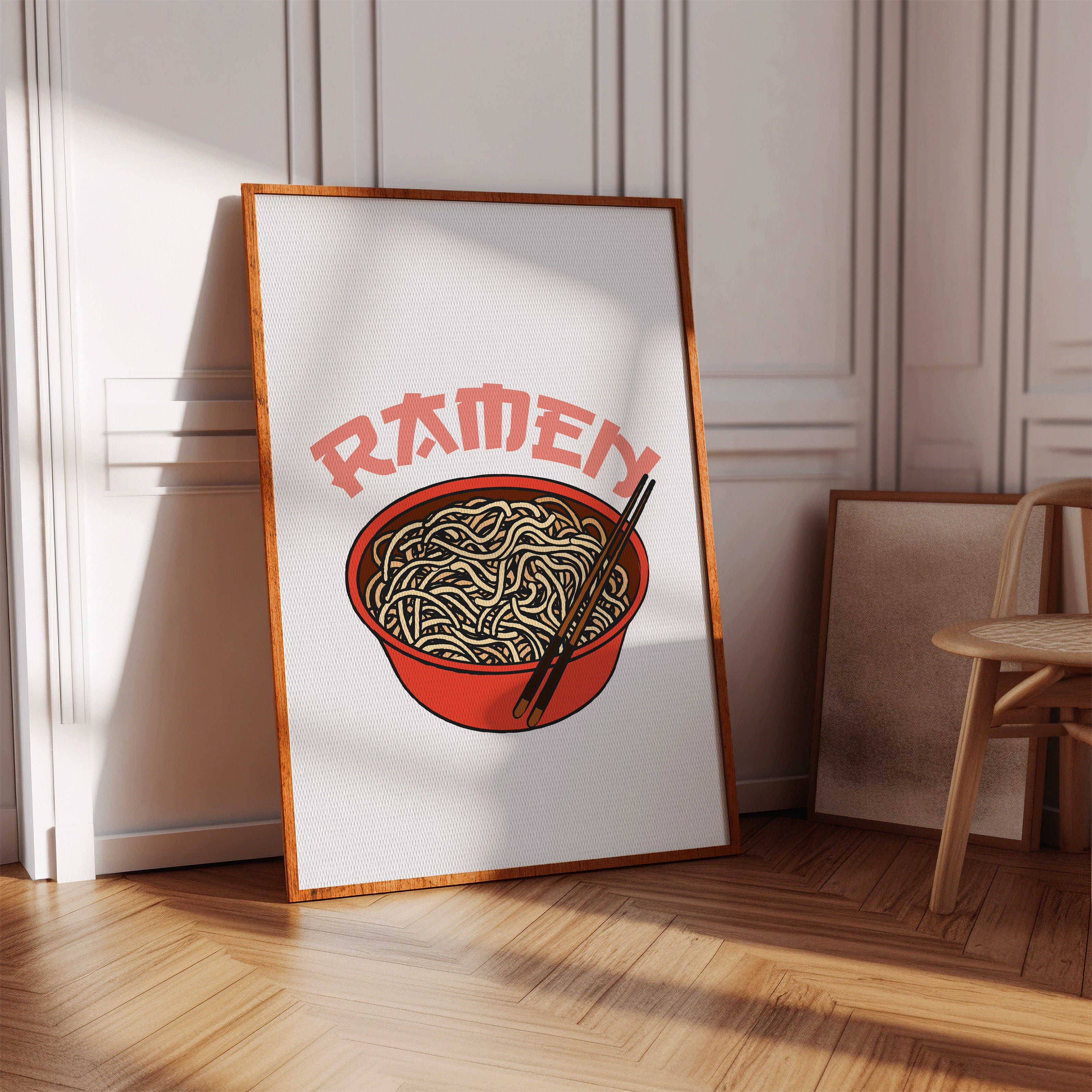Steam rises from a perfectly swirled bowl of ramen, each noodle catching the warm glow like city lights at dusk. This contemporary piece captures the essence of modern Asian cuisine culture with bold, minimalist strokes. The vibrant red bowl cradles golden strands of noodles in an artistic dance, while chopsticks rest expectantly against the rim, creating a composition that speaks to both tradition and modern design. The coral pink typography adds a playful urban edge, floating above the scene like a neon sign in a bustling street. Perfect for adding a pop of personality to a dining room or kitchen space, this piece brings the energy of a Japanese eatery into your home. Each viewing stirs memories of late-night food adventures and the comfort of a warm bowl shared with friends.