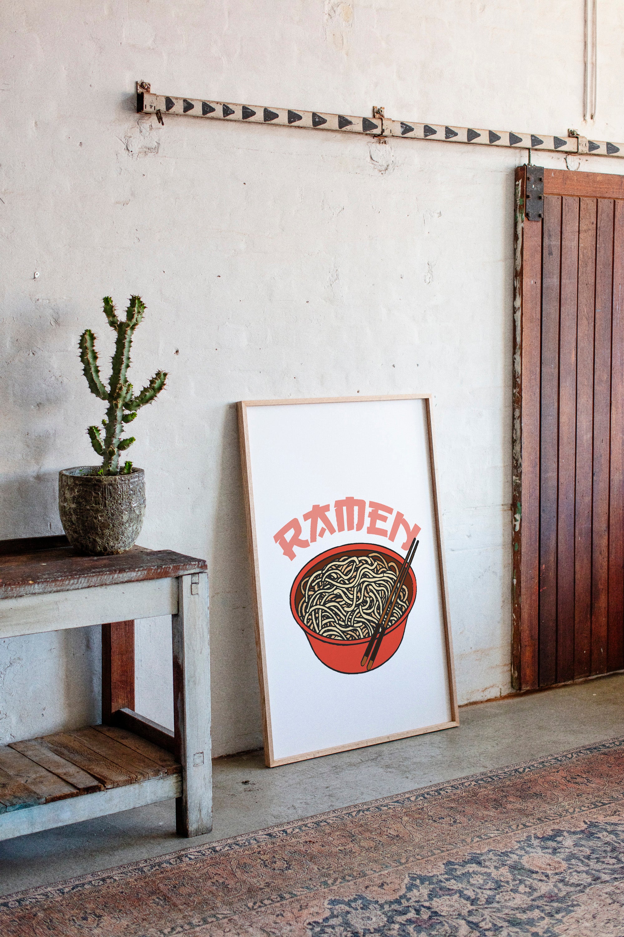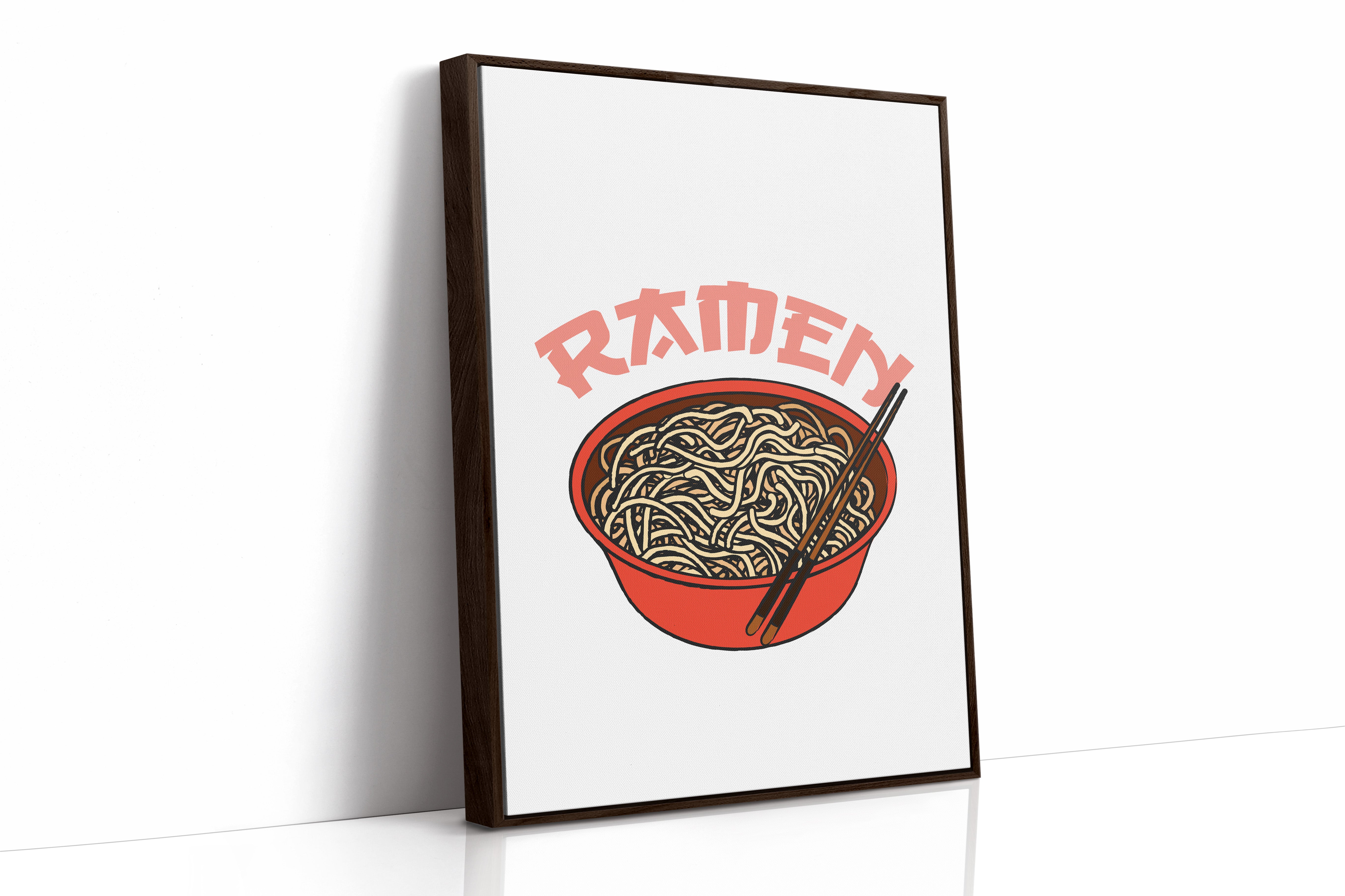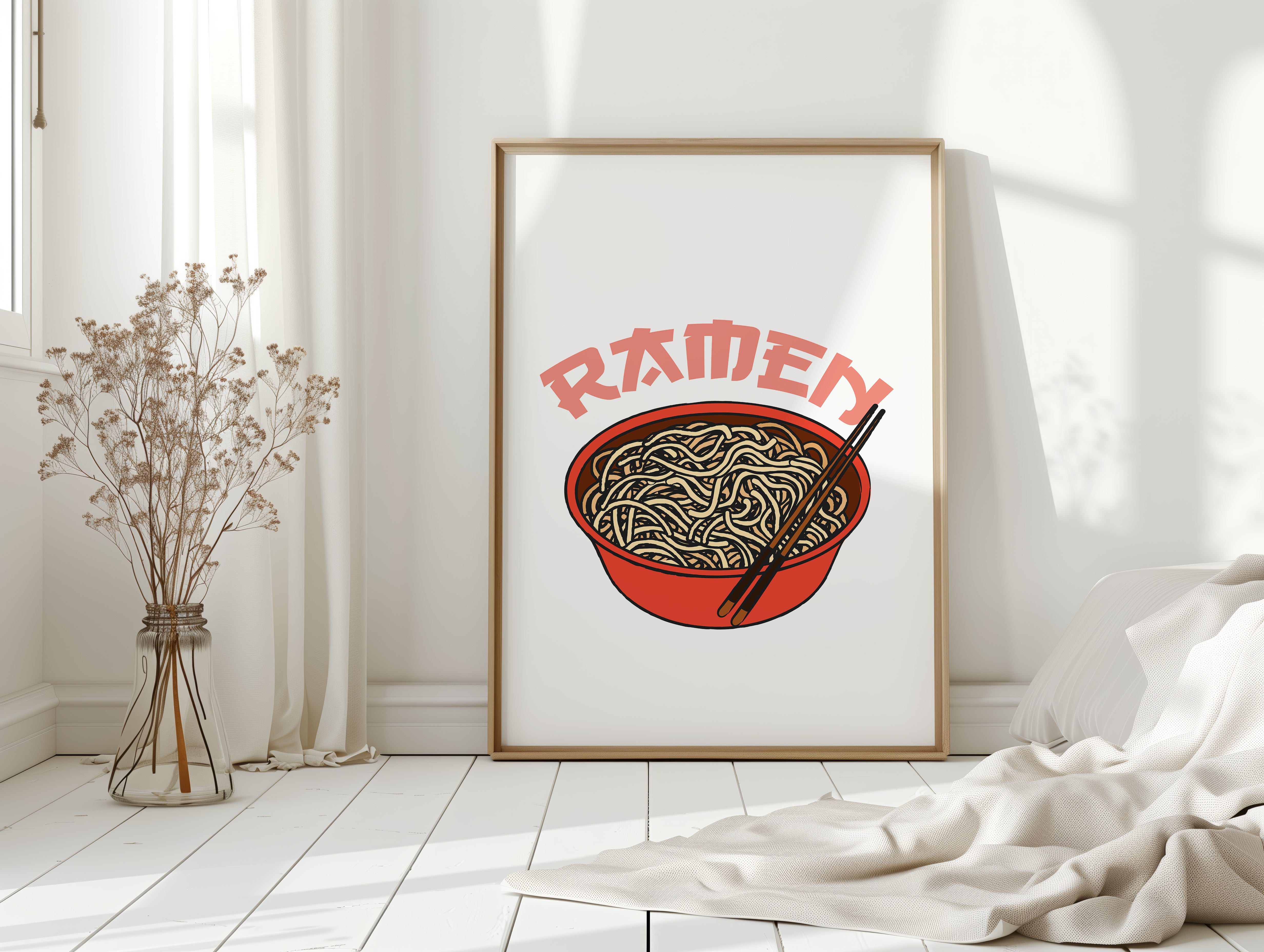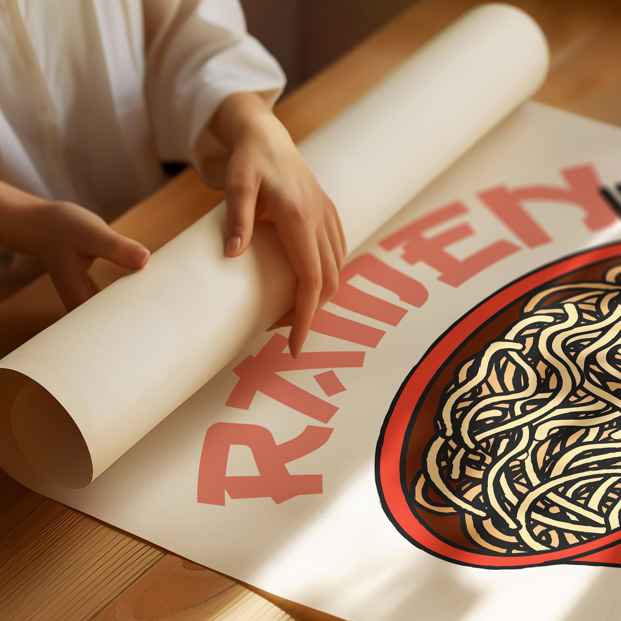 Steam rises from a perfectly swirled bowl of ramen, each noodle catching the warm glow like city lights at dusk. This contemporary piece captures the essence of modern Asian cuisine culture with bold, minimalist strokes. The vibrant red bowl cradles golden strands of noodles in an artistic dance, while chopsticks rest expectantly against the rim, creating a composition that speaks to both tradition and modern design. The coral pink typography adds a playful urban edge, floating above the scene like a neon sign in a bustling street. Perfect for adding a pop of personality to a dining room or kitchen space, this piece brings the energy of a Japanese eatery into your home. Each viewing stirs memories of late-night food adventures and the comfort of a warm bowl shared with friends.