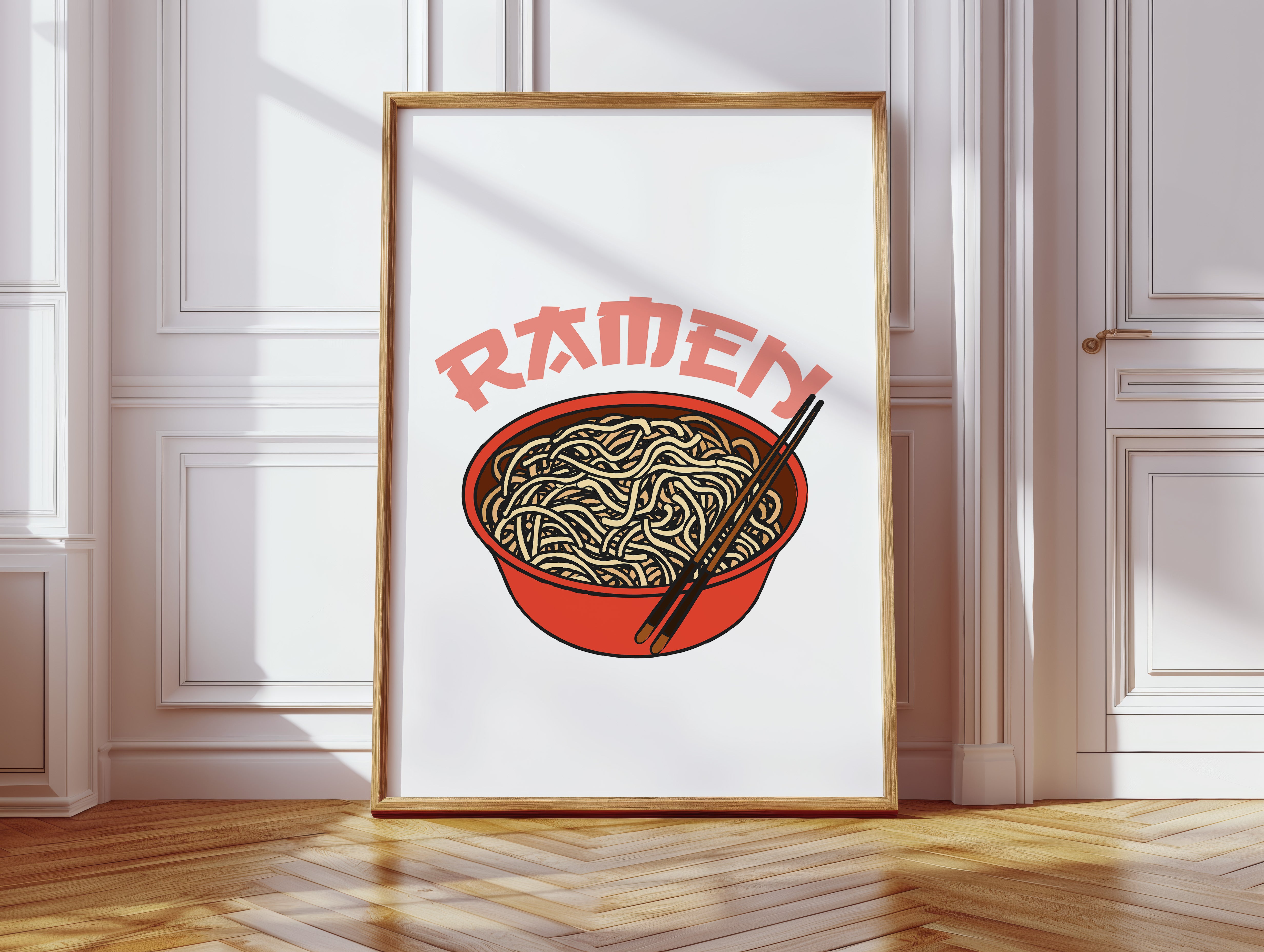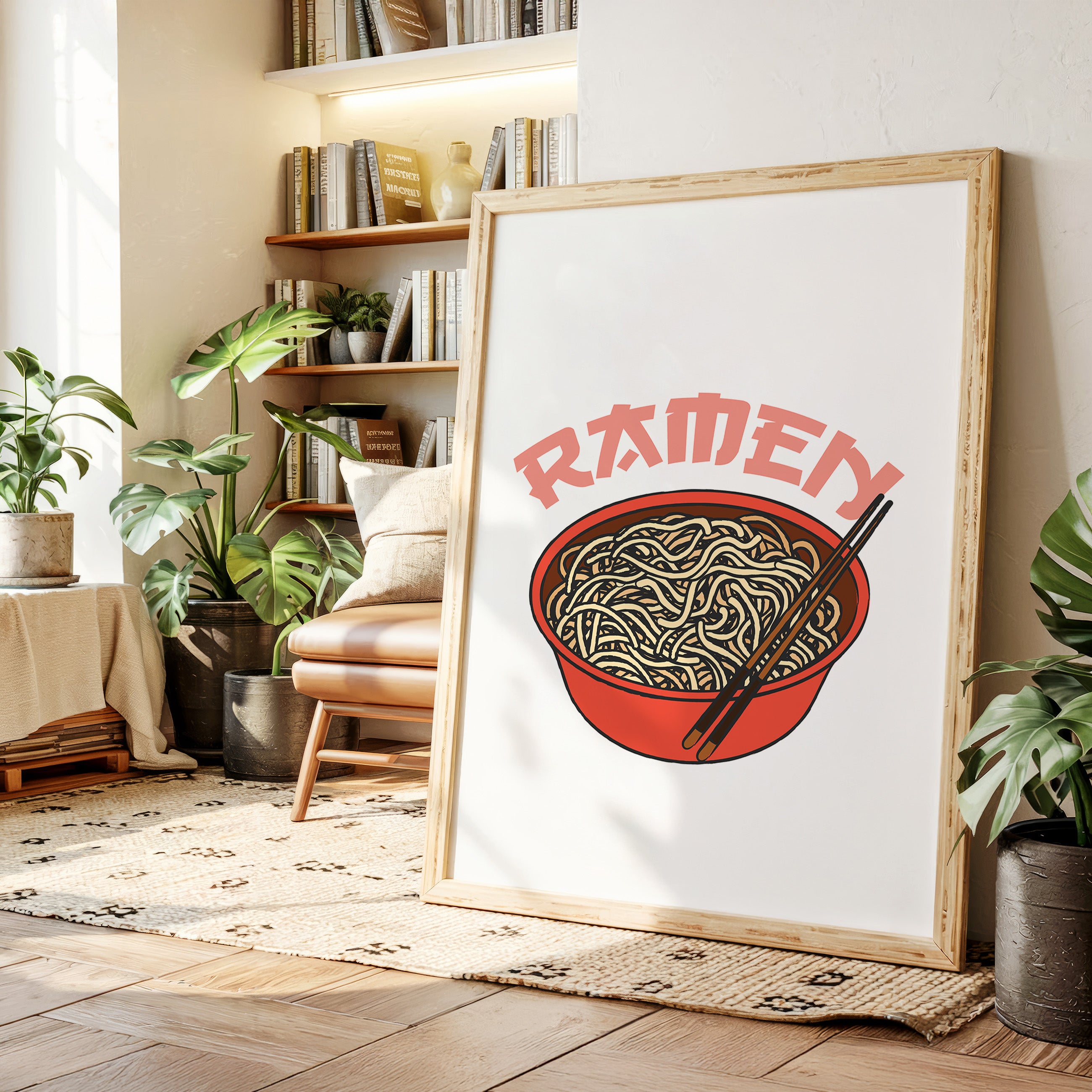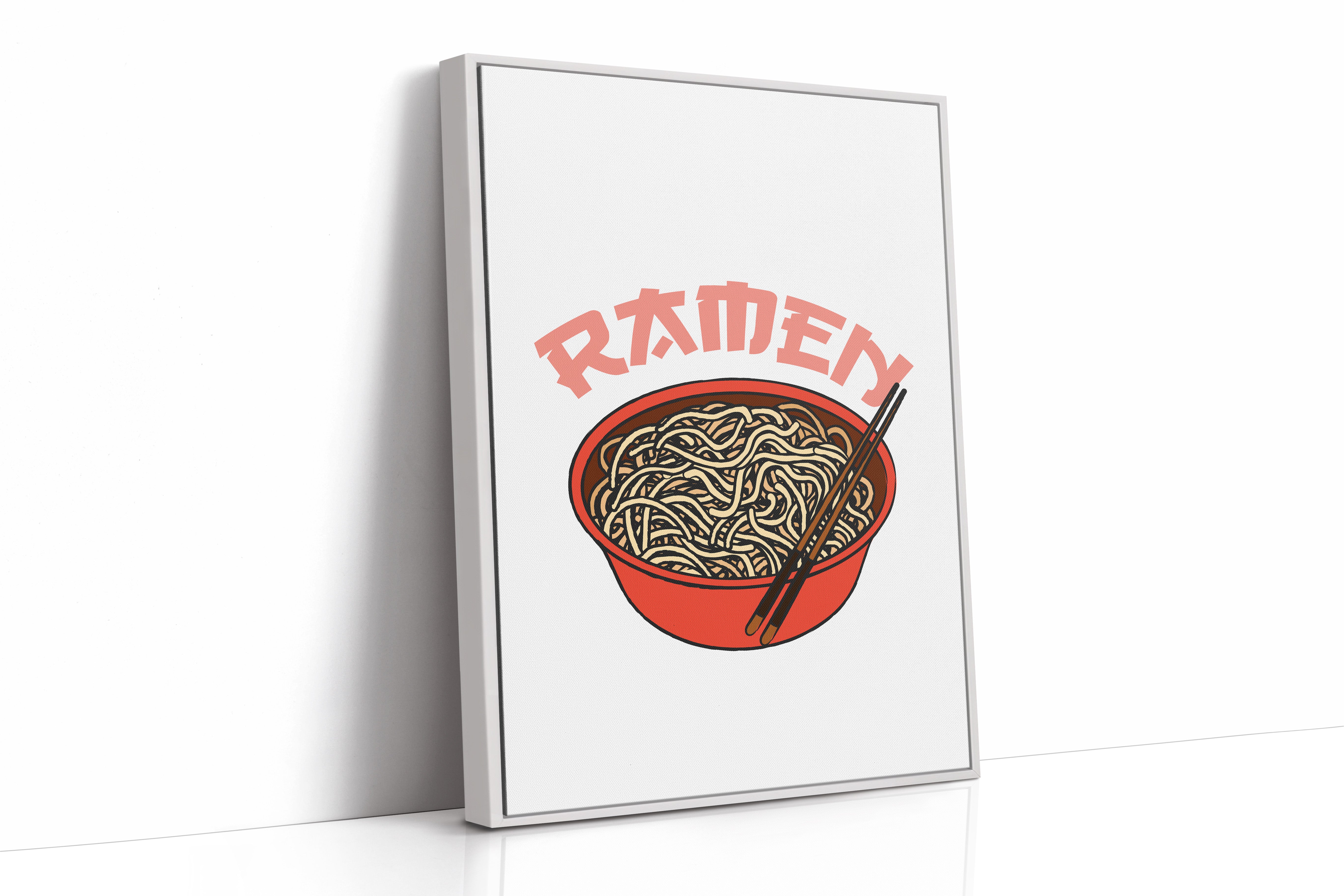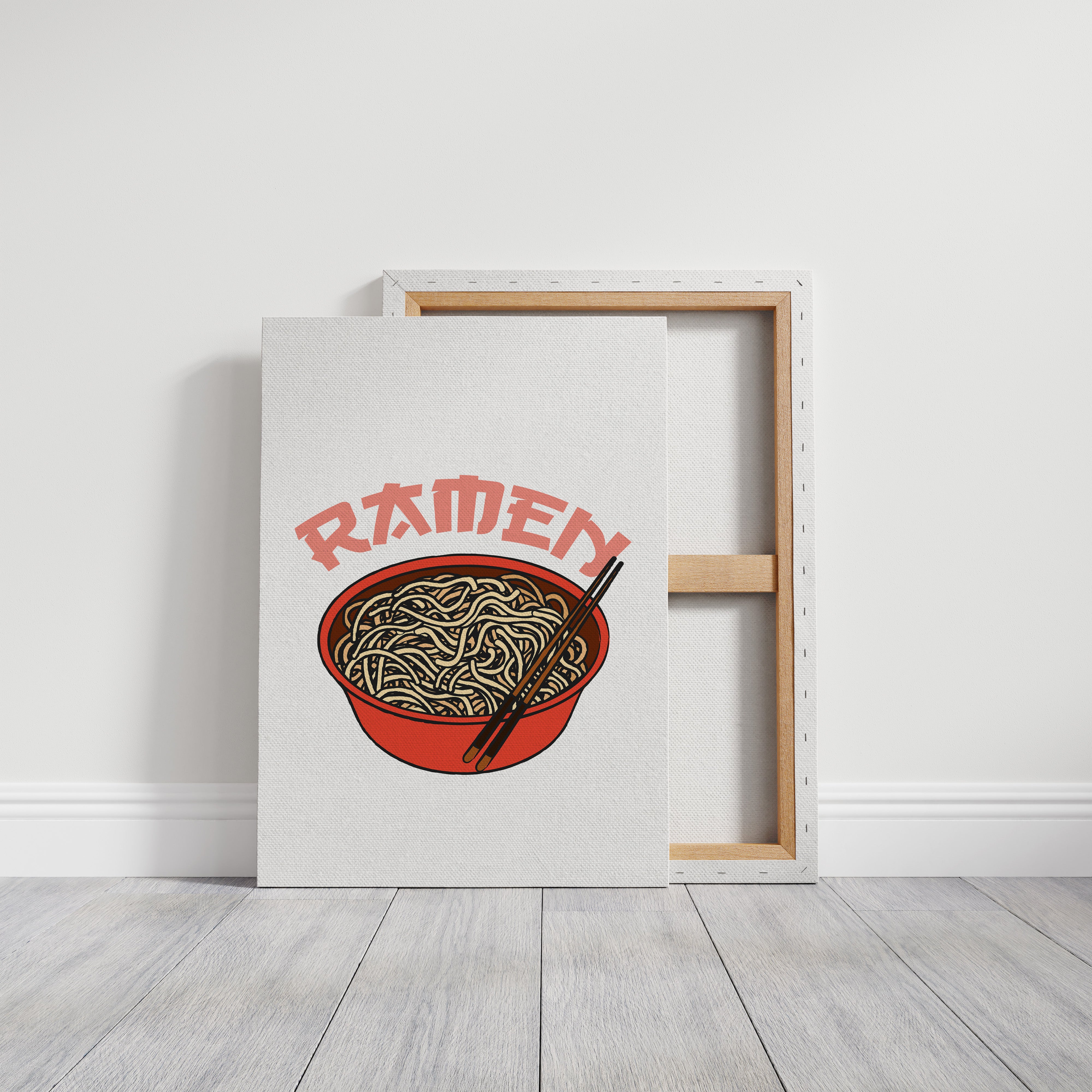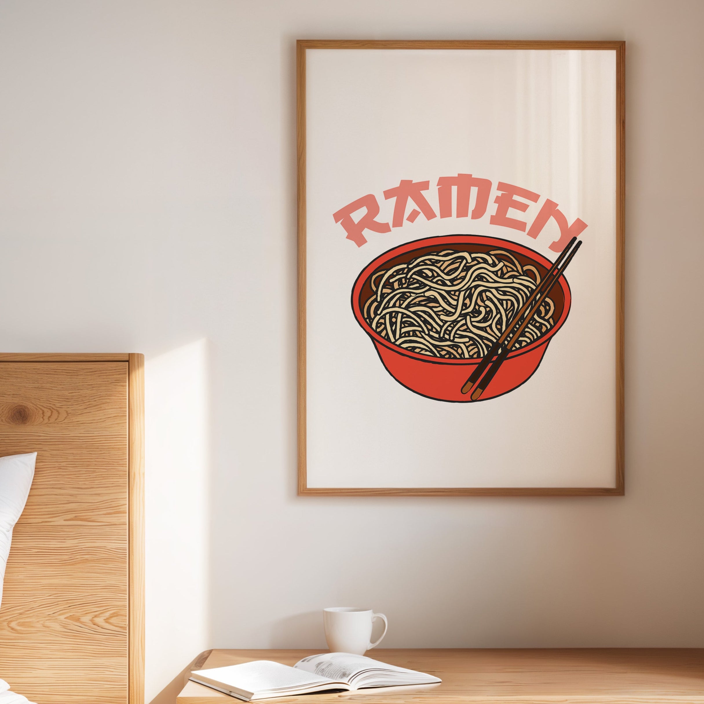 Steam rises from a perfectly swirled bowl of ramen, each noodle catching the warm glow like city lights at dusk. This contemporary piece captures the essence of modern Asian cuisine culture with bold, minimalist strokes. The vibrant red bowl cradles golden strands of noodles in an artistic dance, while chopsticks rest expectantly against the rim, creating a composition that speaks to both tradition and modern design. The coral pink typography adds a playful urban edge, floating above the scene like a neon sign in a bustling street. Perfect for adding a pop of personality to a dining room or kitchen space, this piece brings the energy of a Japanese eatery into your home. Each viewing stirs memories of late-night food adventures and the comfort of a warm bowl shared with friends.