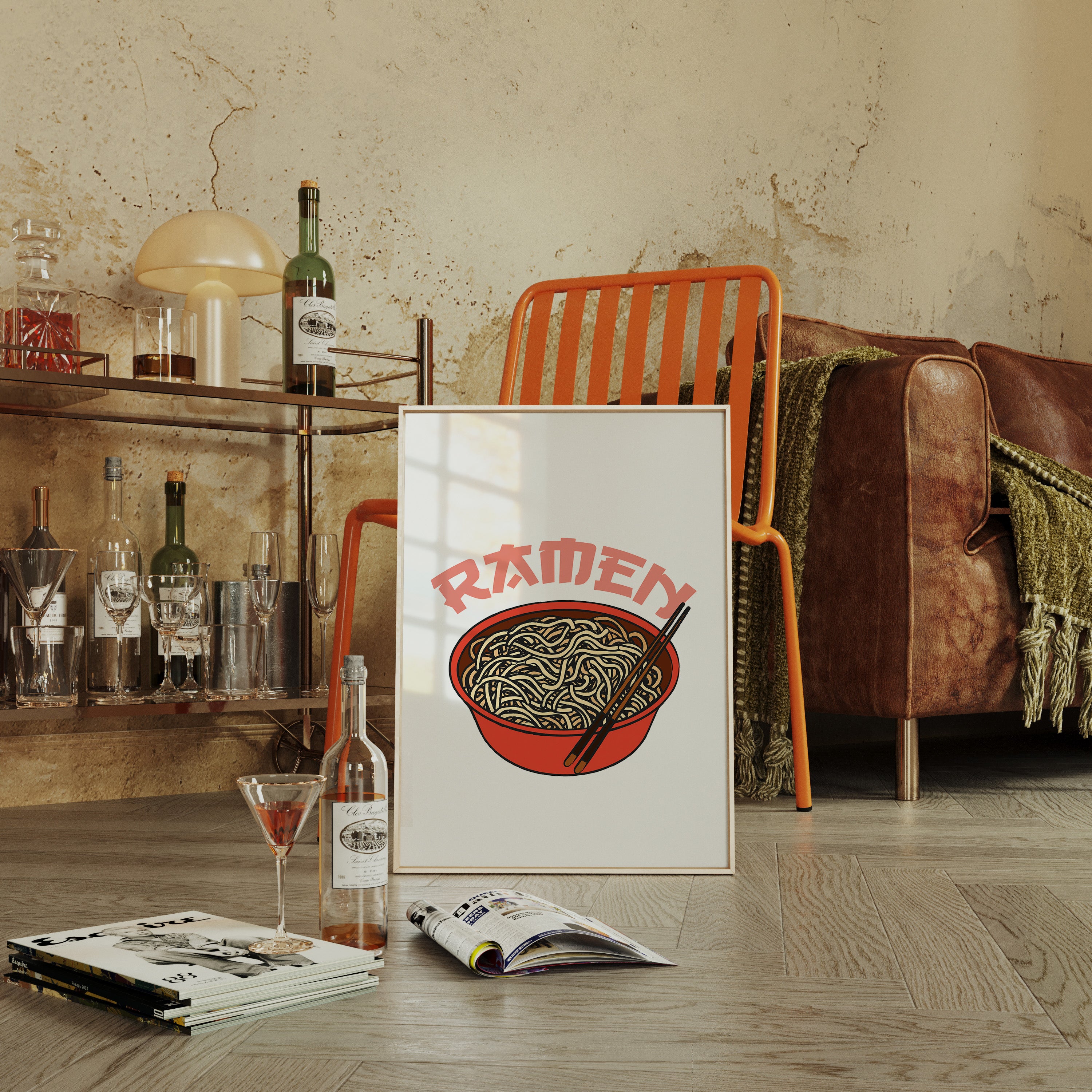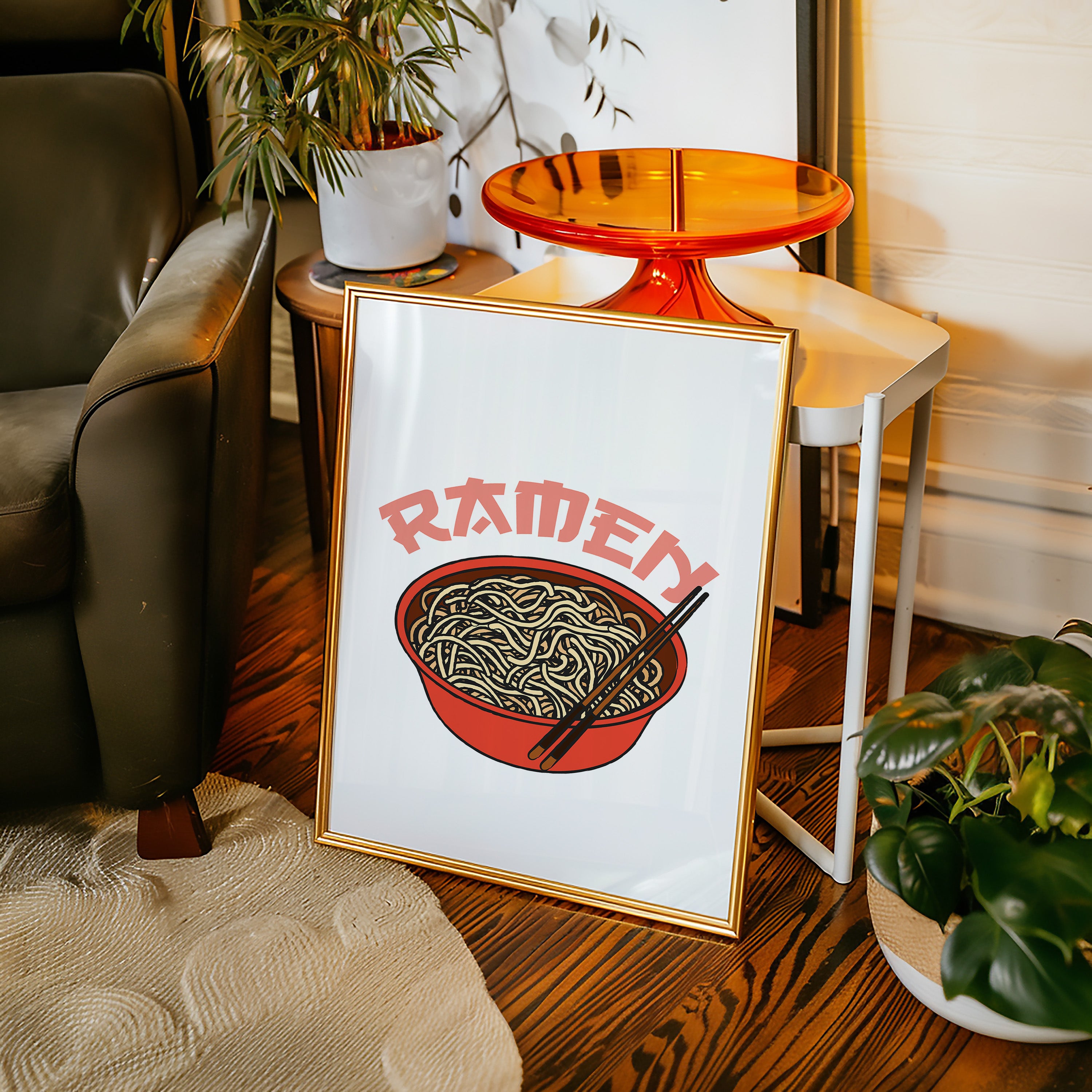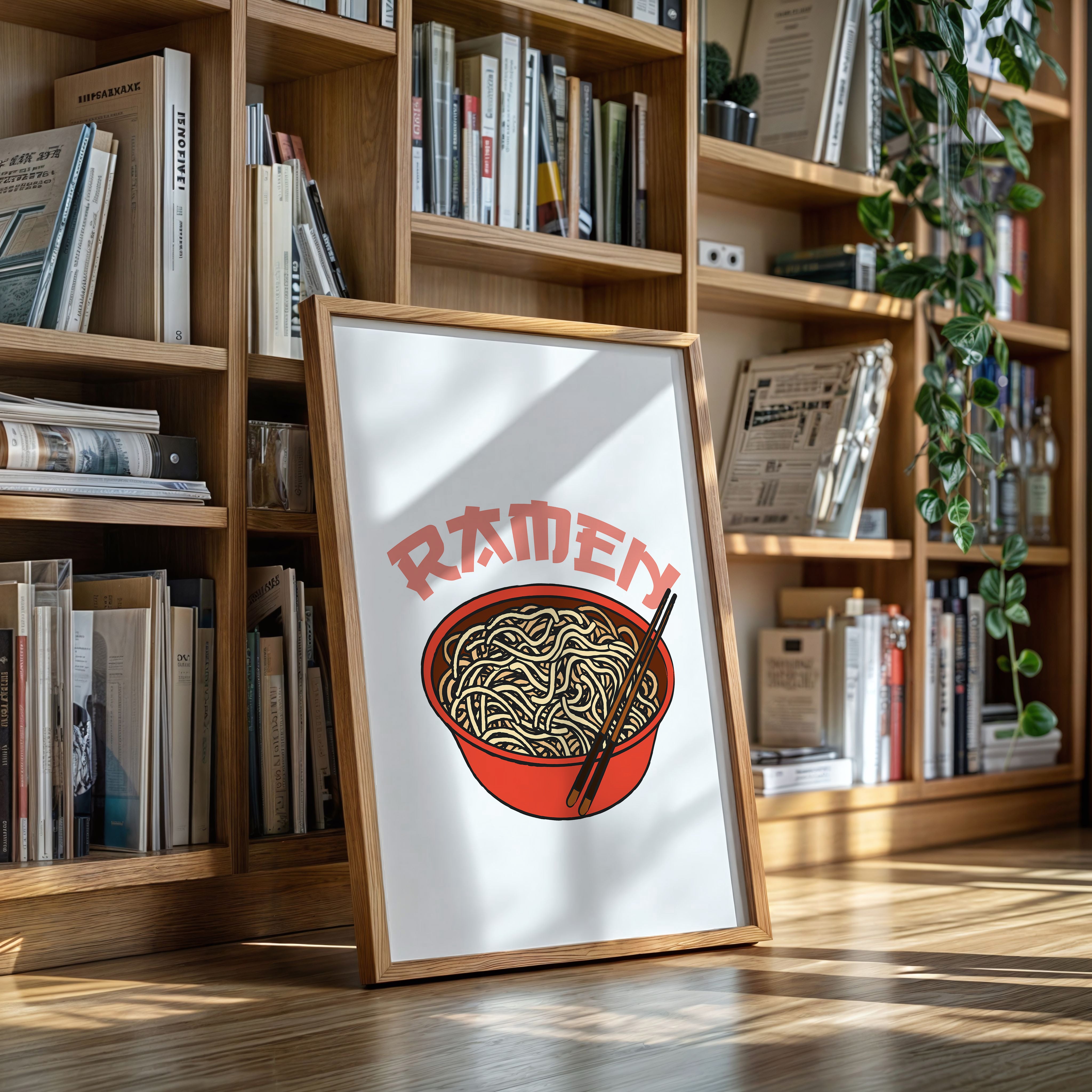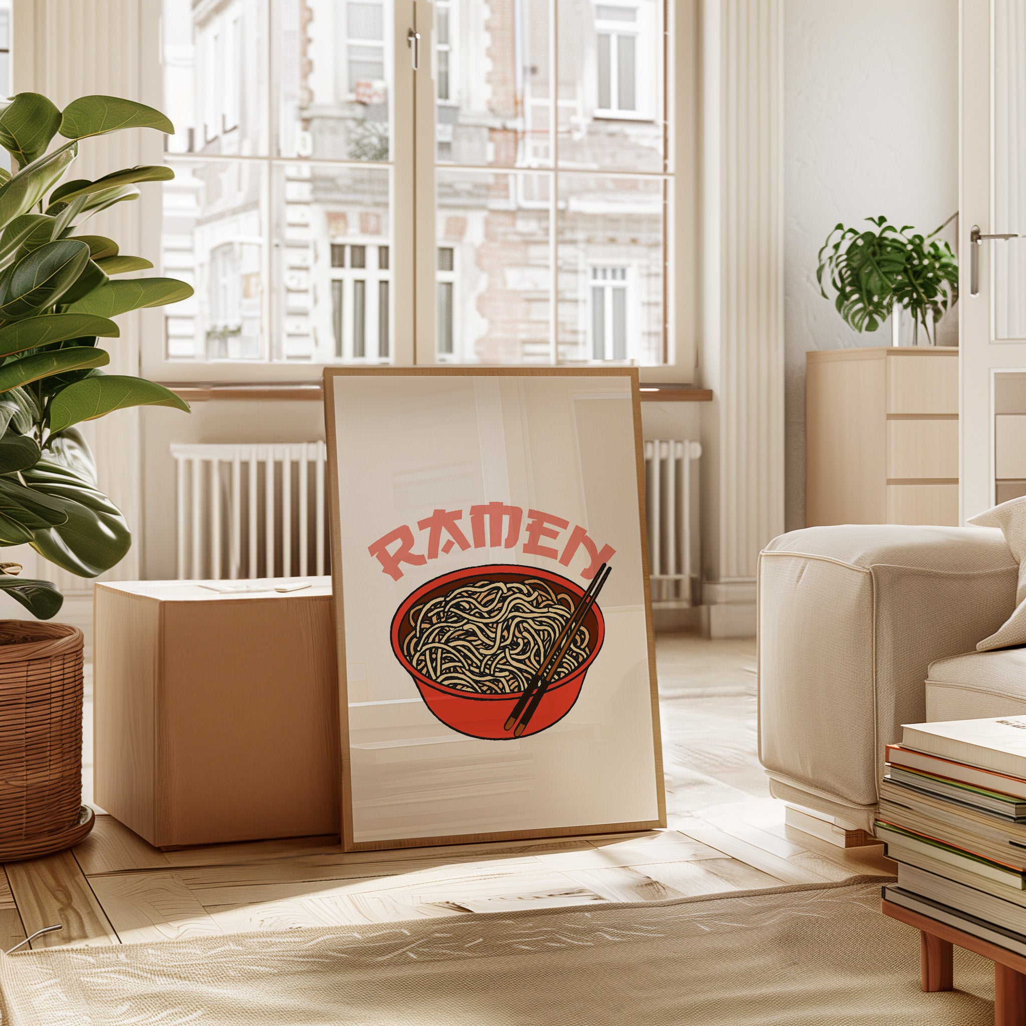 Steam rises from a perfectly swirled bowl of ramen, each noodle catching the warm glow like city lights at dusk. This contemporary piece captures the essence of modern Asian cuisine culture with bold, minimalist strokes. The vibrant red bowl cradles golden strands of noodles in an artistic dance, while chopsticks rest expectantly against the rim, creating a composition that speaks to both tradition and modern design. The coral pink typography adds a playful urban edge, floating above the scene like a neon sign in a bustling street. Perfect for adding a pop of personality to a dining room or kitchen space, this piece brings the energy of a Japanese eatery into your home. Each viewing stirs memories of late-night food adventures and the comfort of a warm bowl shared with friends.