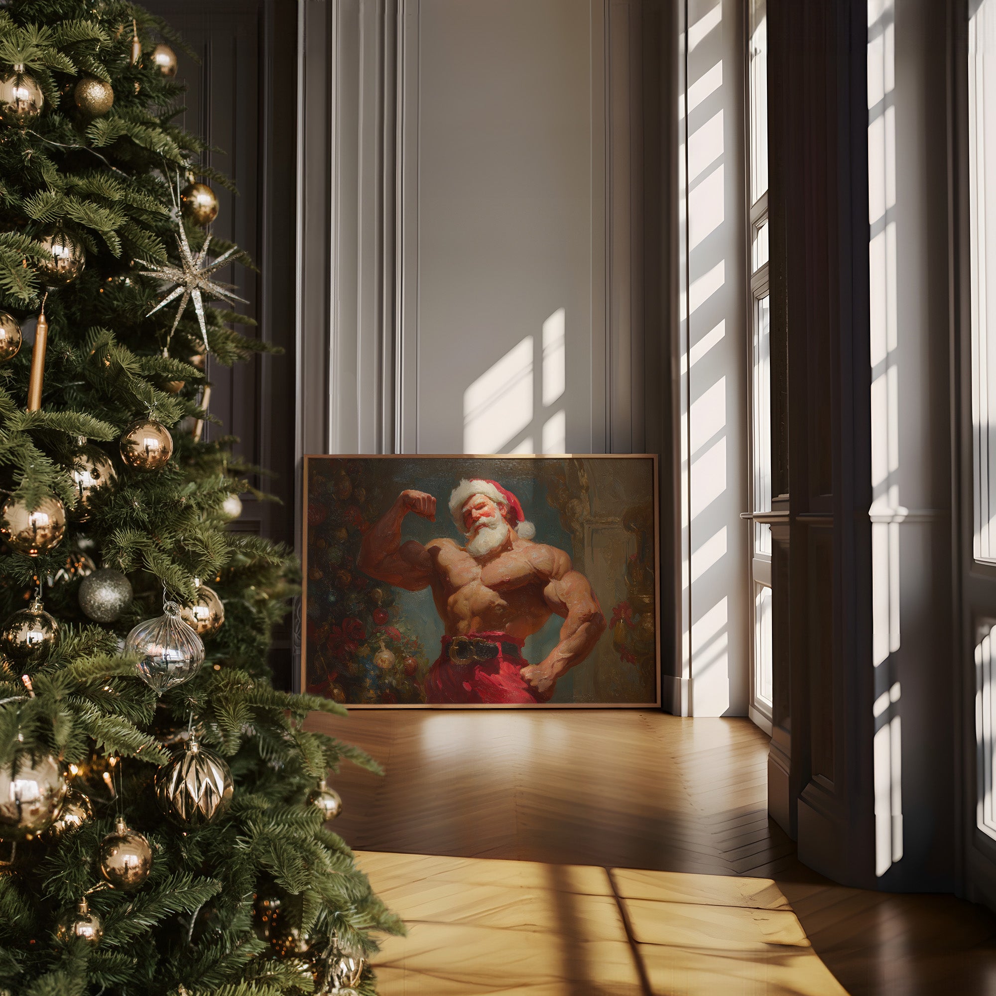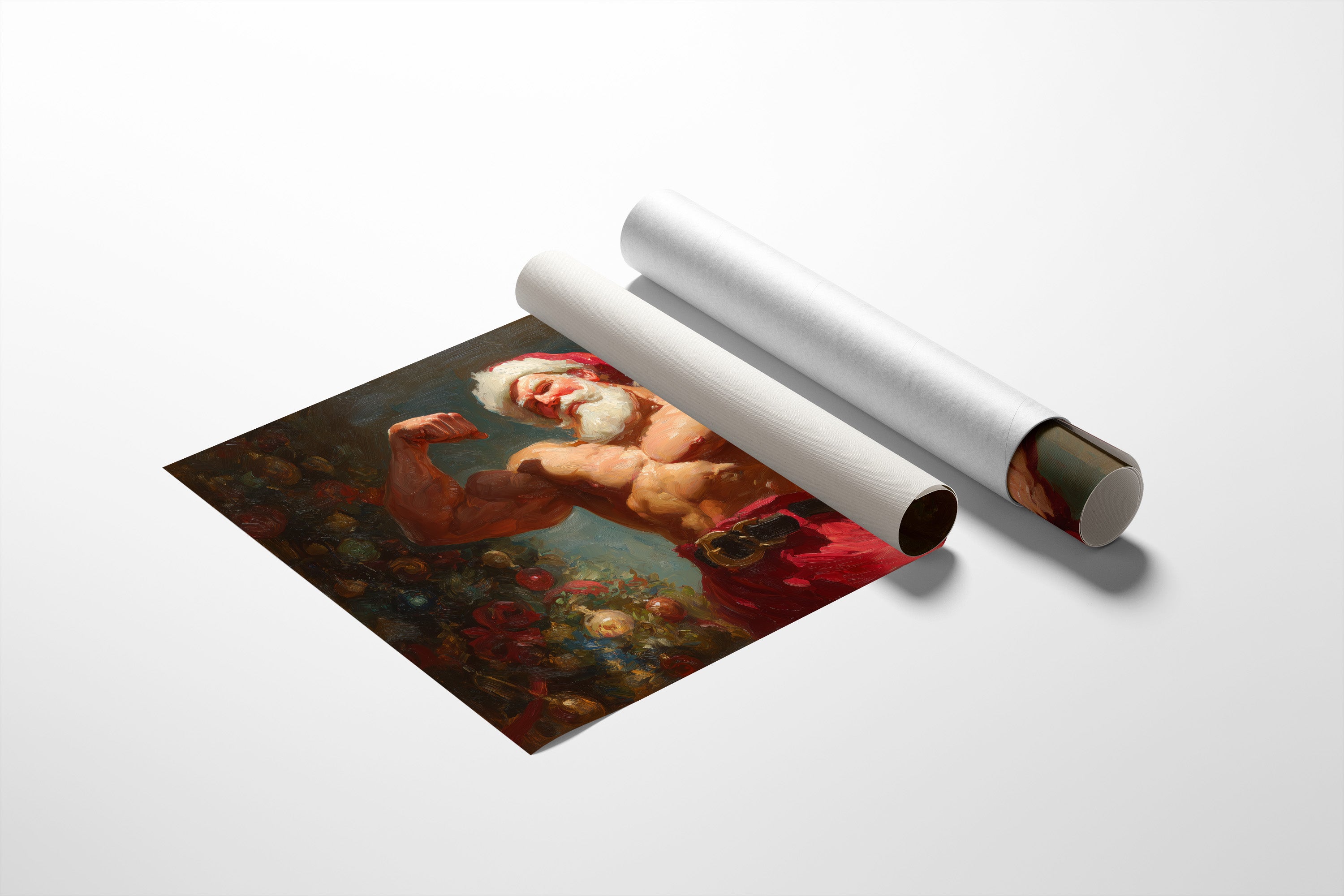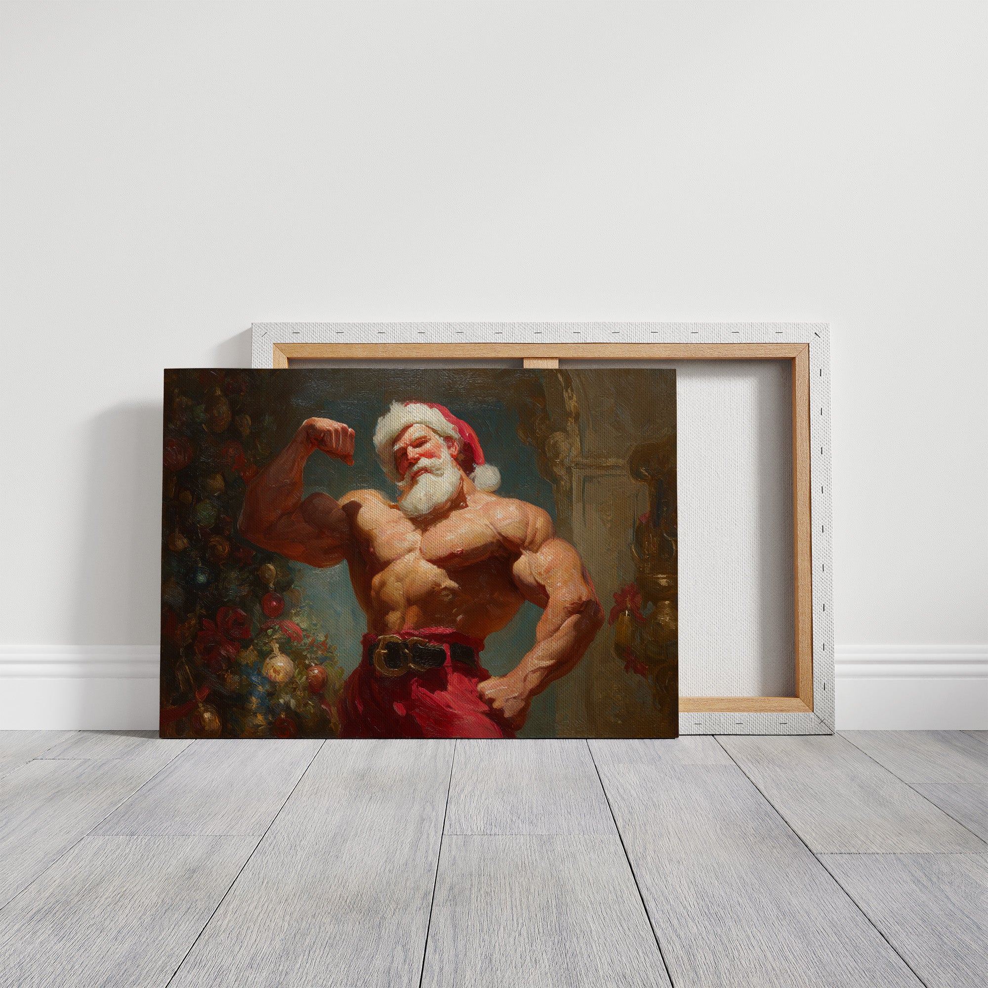 Strength meets whimsy in this unexpected holiday portrait, where traditional festive charm collides with raw power. Rich oils capture the interplay of warm flesh tones against deep emerald shadows, while crimson accents echo through both figure and background. The composition balances classical painting techniques with a contemporary twist, creating a playful yet masterful celebration of strength and seasonal spirit. This statement piece demands attention in a modern home office or adds an element of surprise to traditional holiday decor.