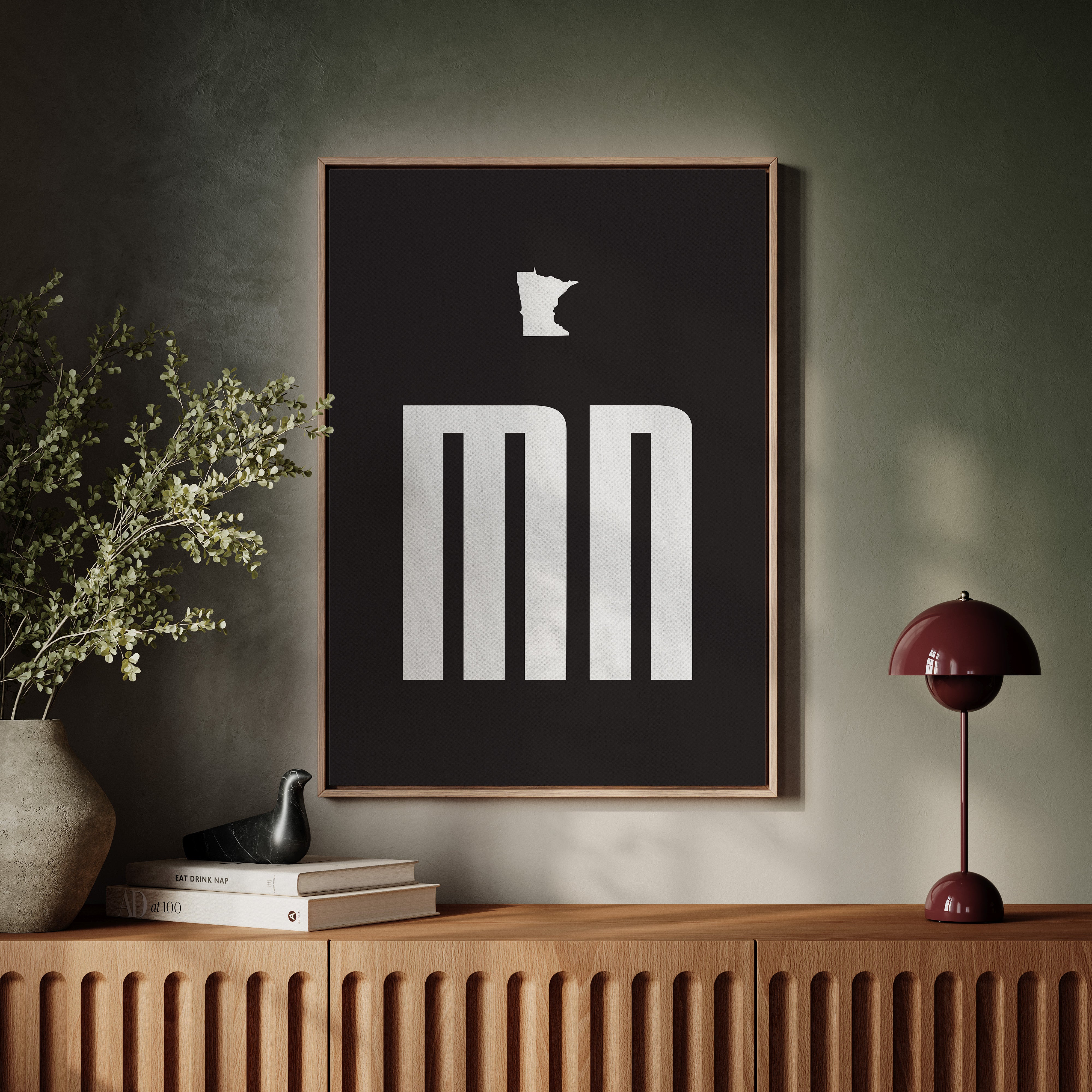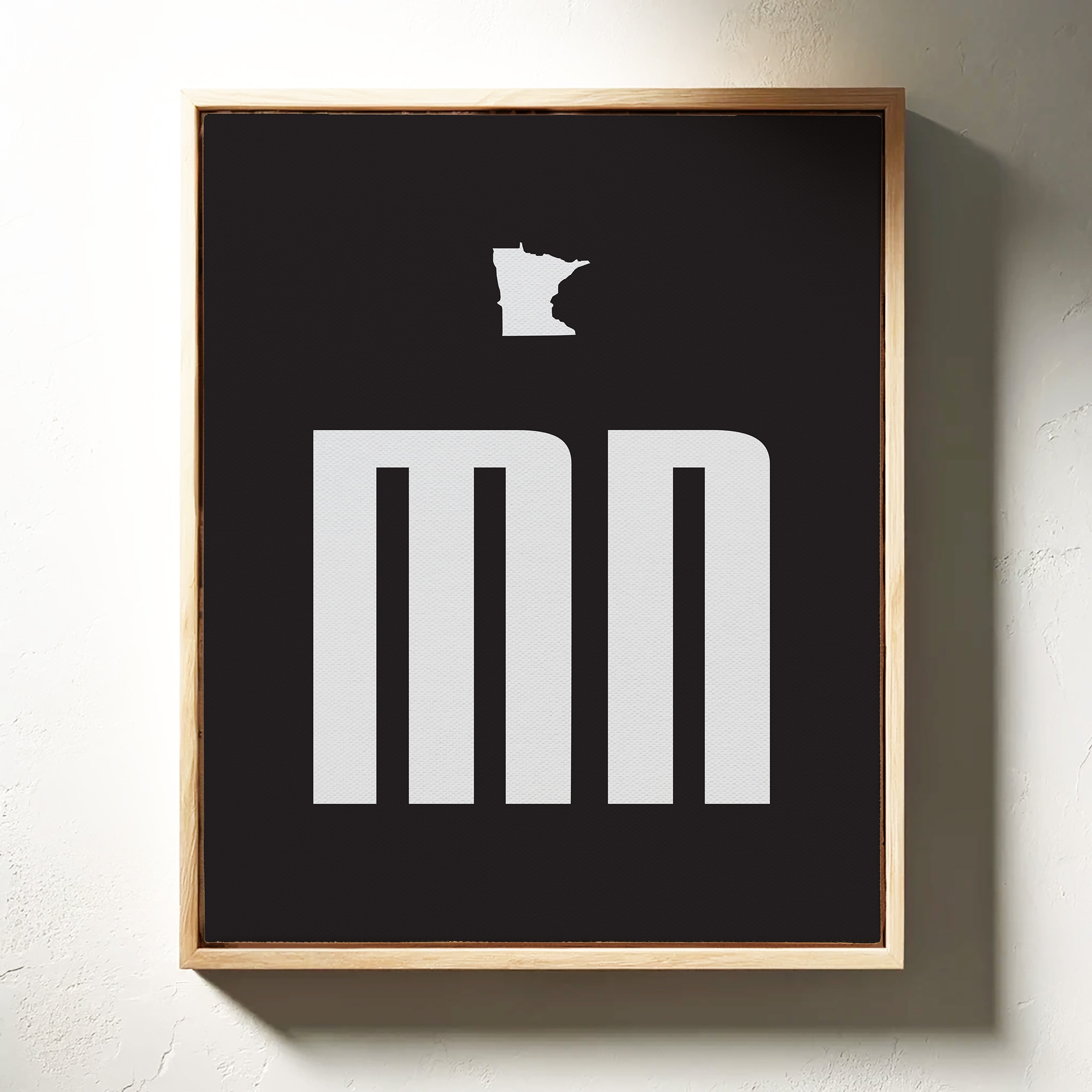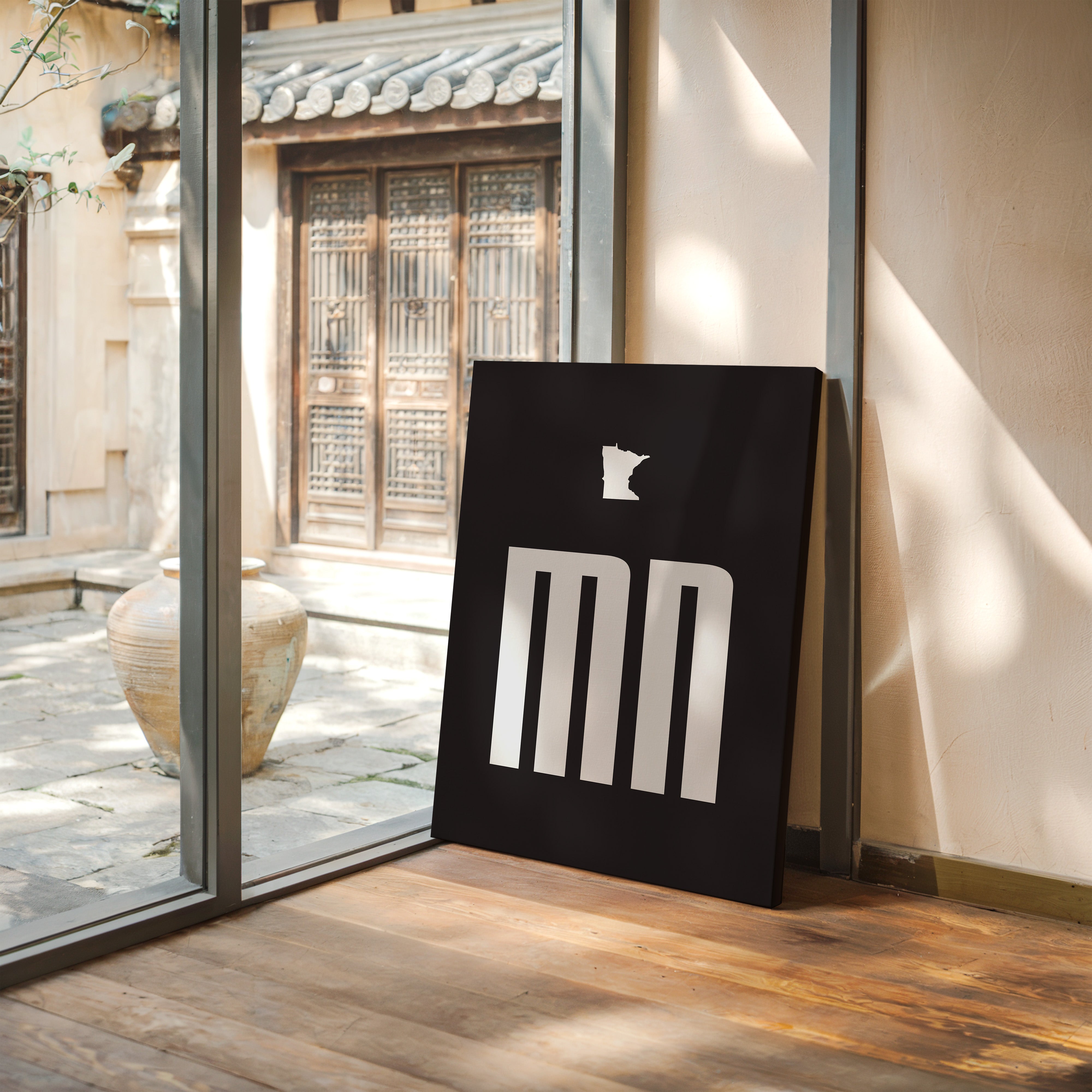 Stark white against midnight black, geometric letters command attention with architectural precision. The minimalist design speaks volumes through negative space, with Minnesota's silhouette floating above like a crown of belonging. Clean lines and bold contrasts create a contemporary statement that feels both modern and timeless. This striking composition would make a powerful focal point in a modern office space or creative studio, where its graphic simplicity can inspire clear thinking and bold decisions.