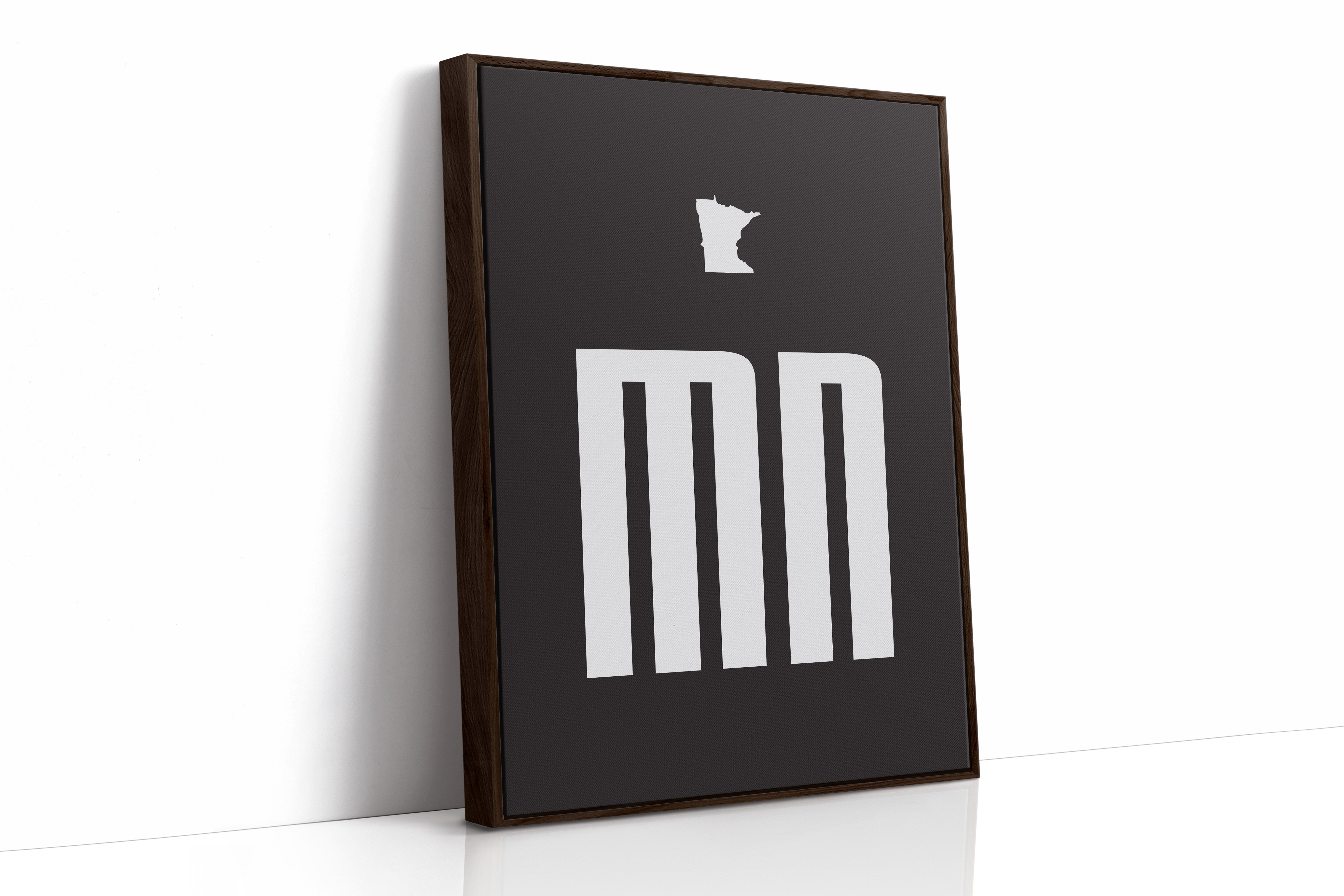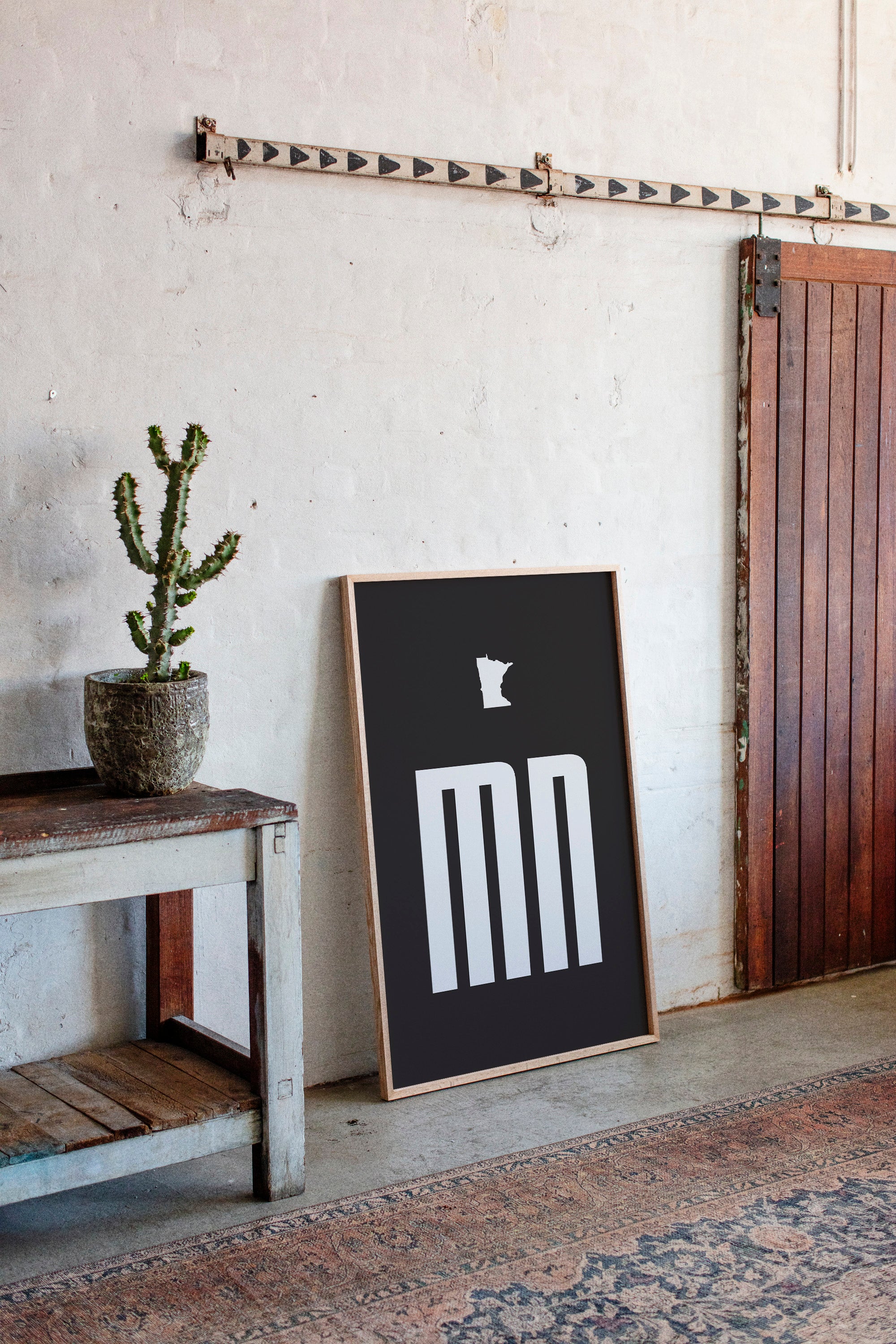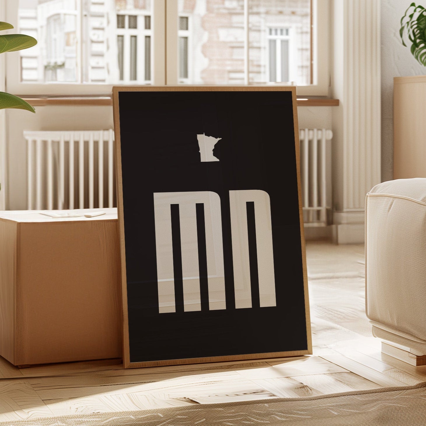 Stark white against midnight black, geometric letters command attention with architectural precision. The minimalist design speaks volumes through negative space, with Minnesota's silhouette floating above like a crown of belonging. Clean lines and bold contrasts create a contemporary statement that feels both modern and timeless. This striking composition would make a powerful focal point in a modern office space or creative studio, where its graphic simplicity can inspire clear thinking and bold decisions.