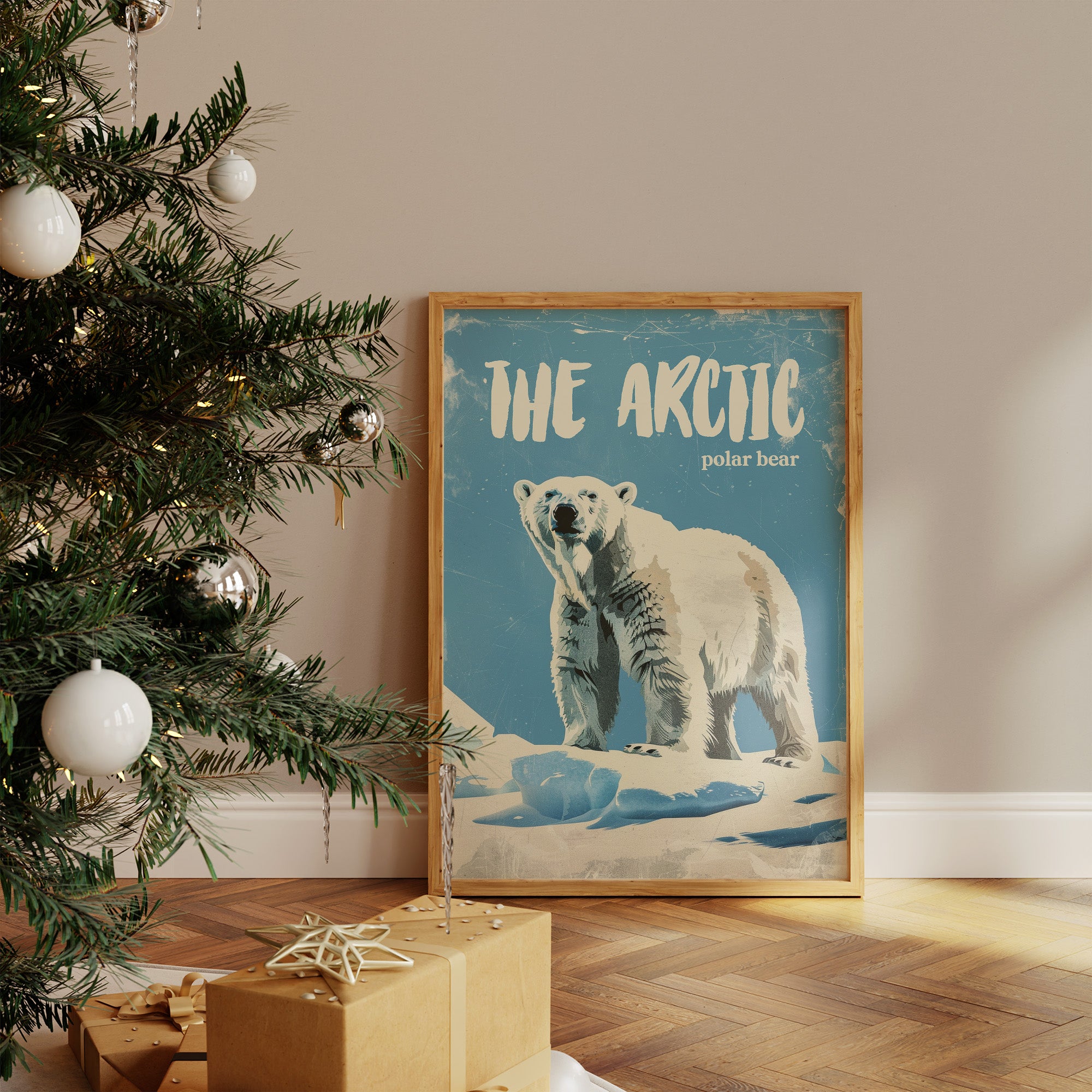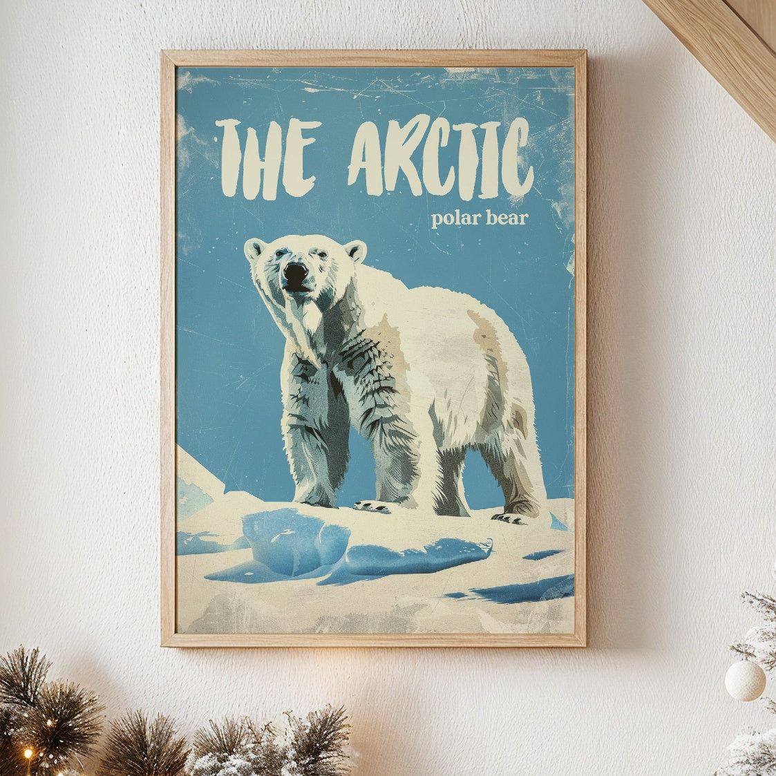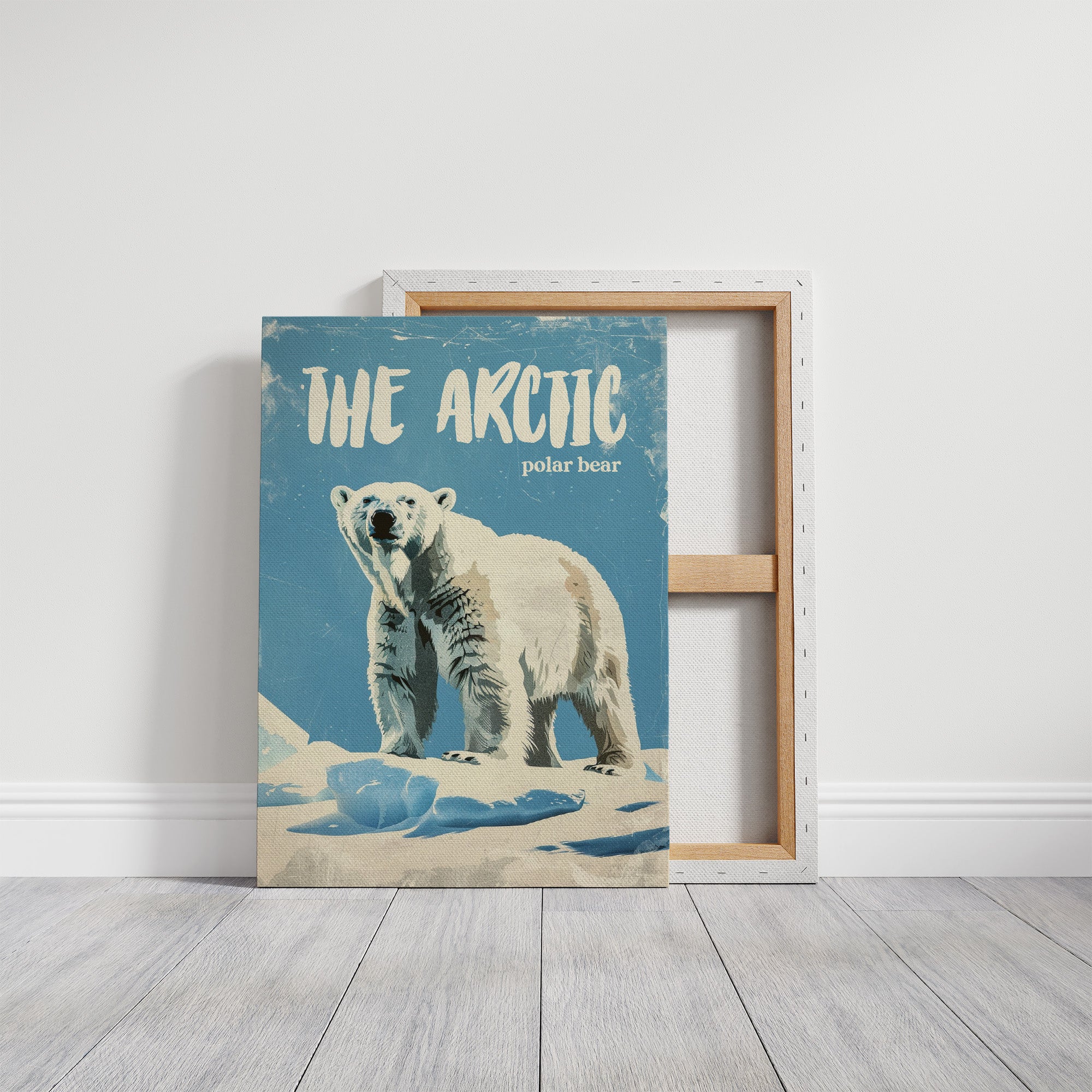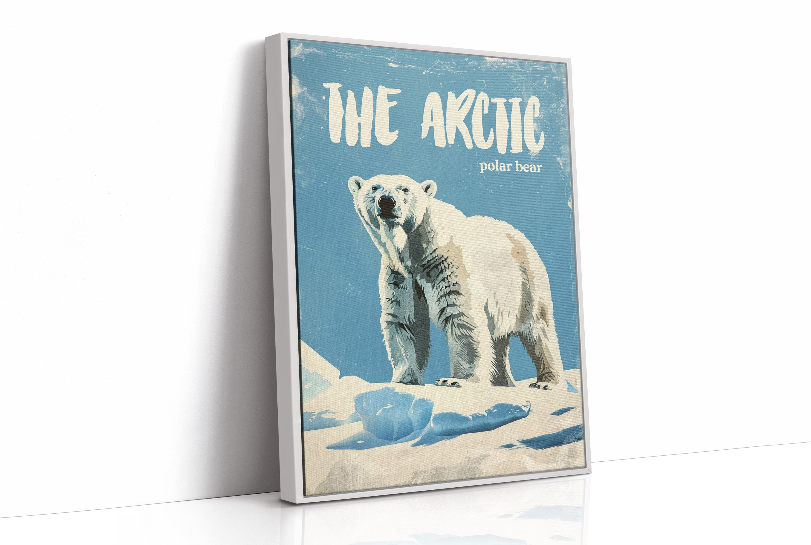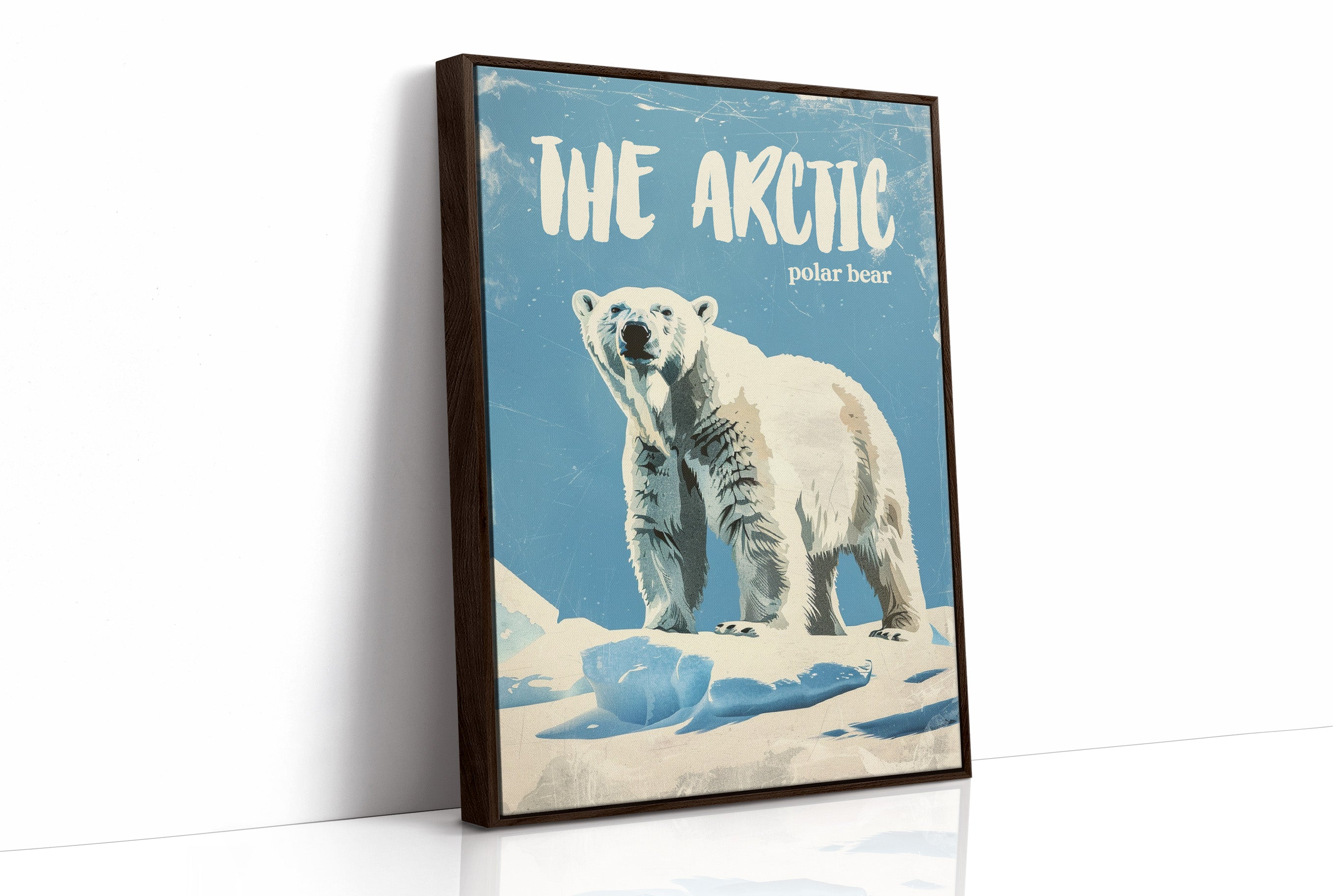 A majestic polar bear stands sentinel against a weathered azure backdrop, commanding respect with its powerful presence. The vintage-inspired illustration captures the textured fur and confident stance of this arctic sovereign, with deliberate scratches and wear giving the piece a nostalgic, timeworn quality. This contemporary interpretation of classic nature illustration brings wilderness wonder into modern spaces.