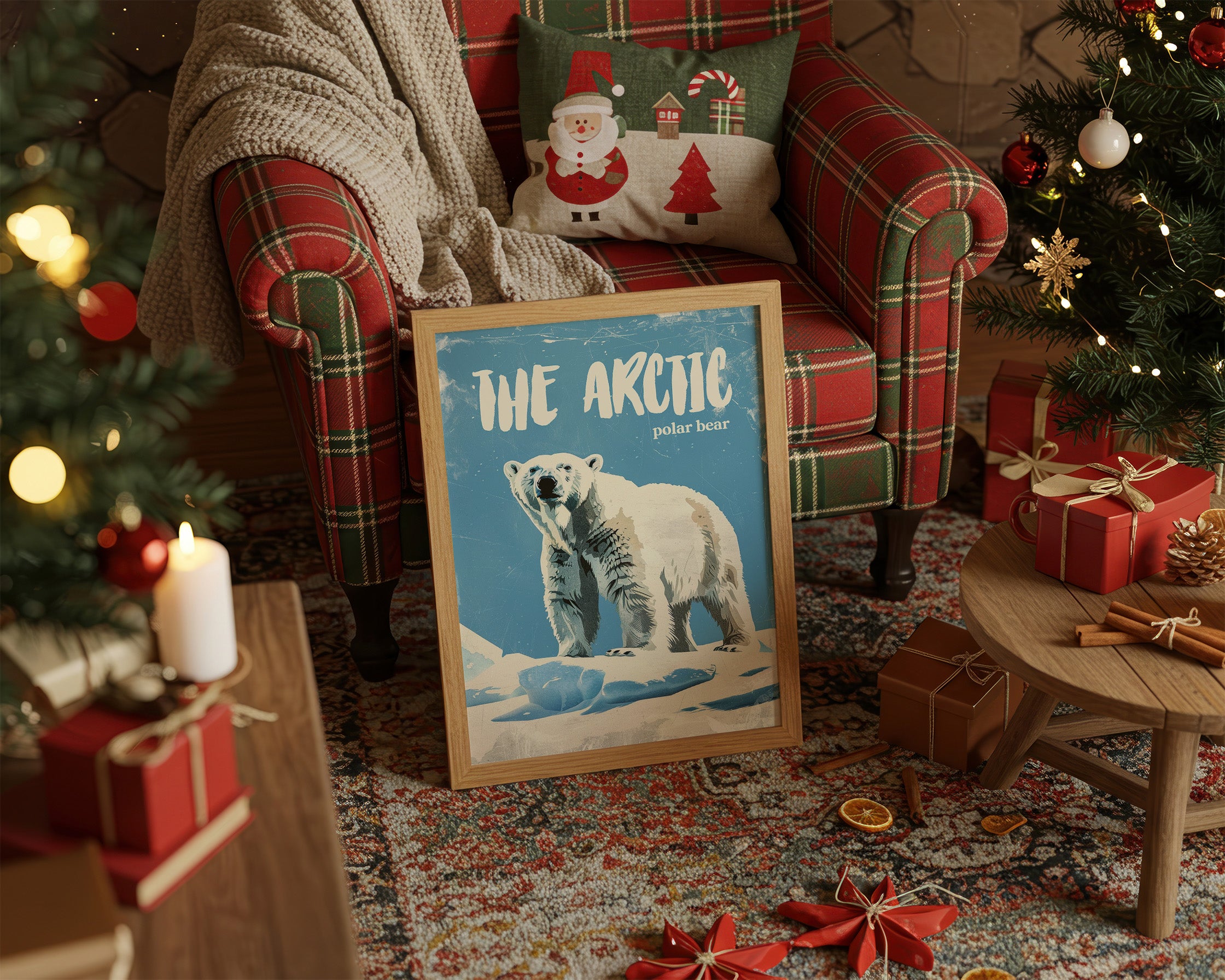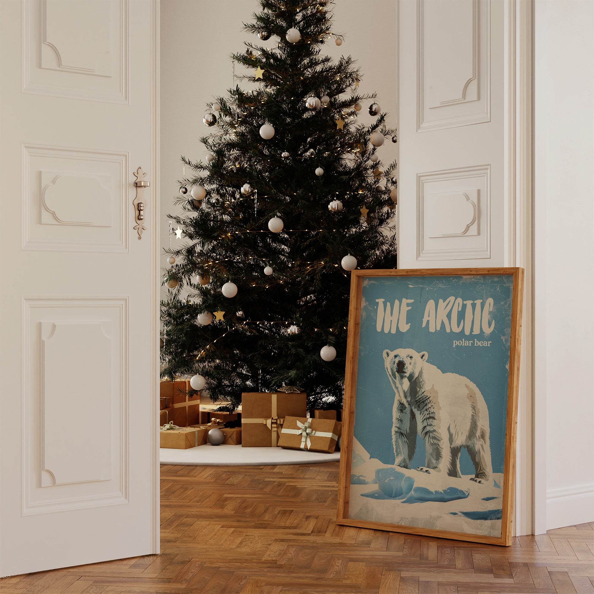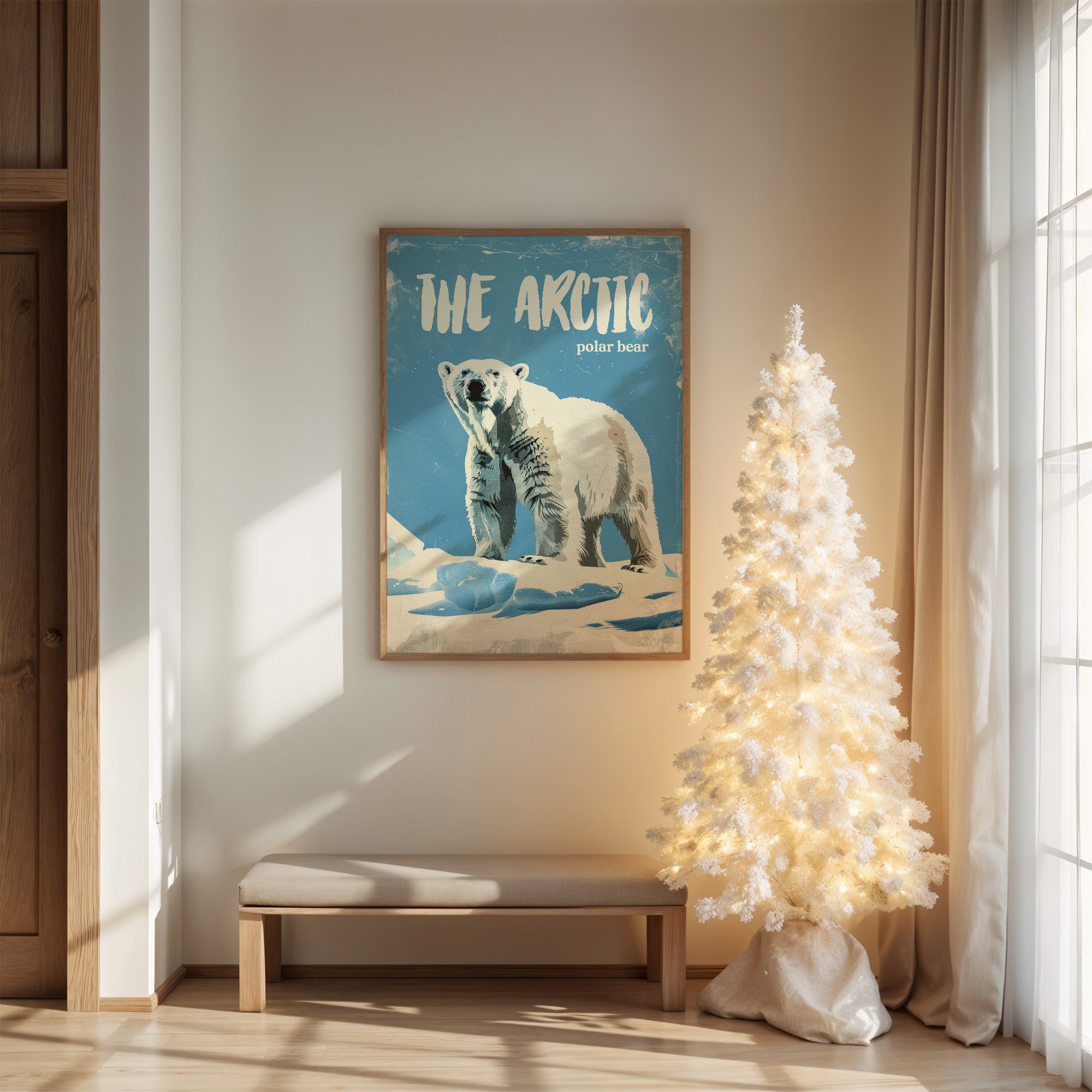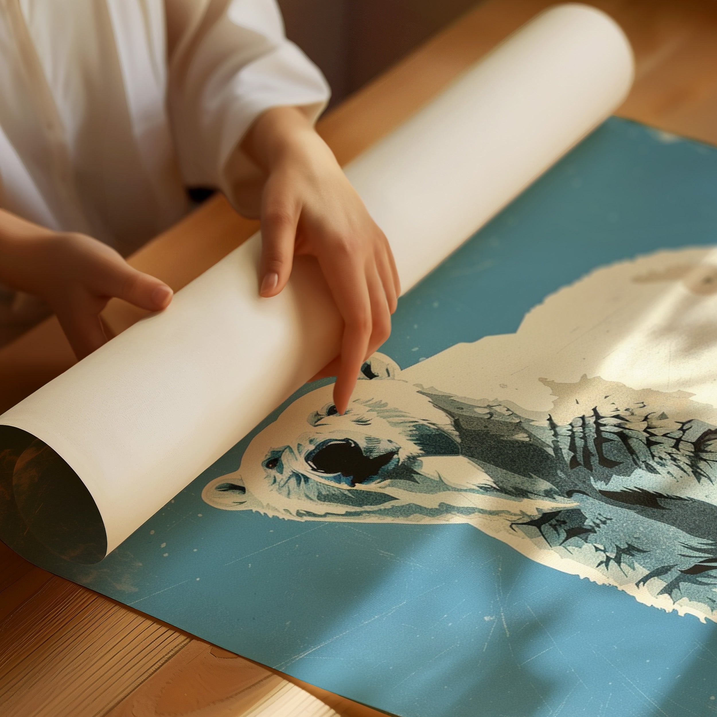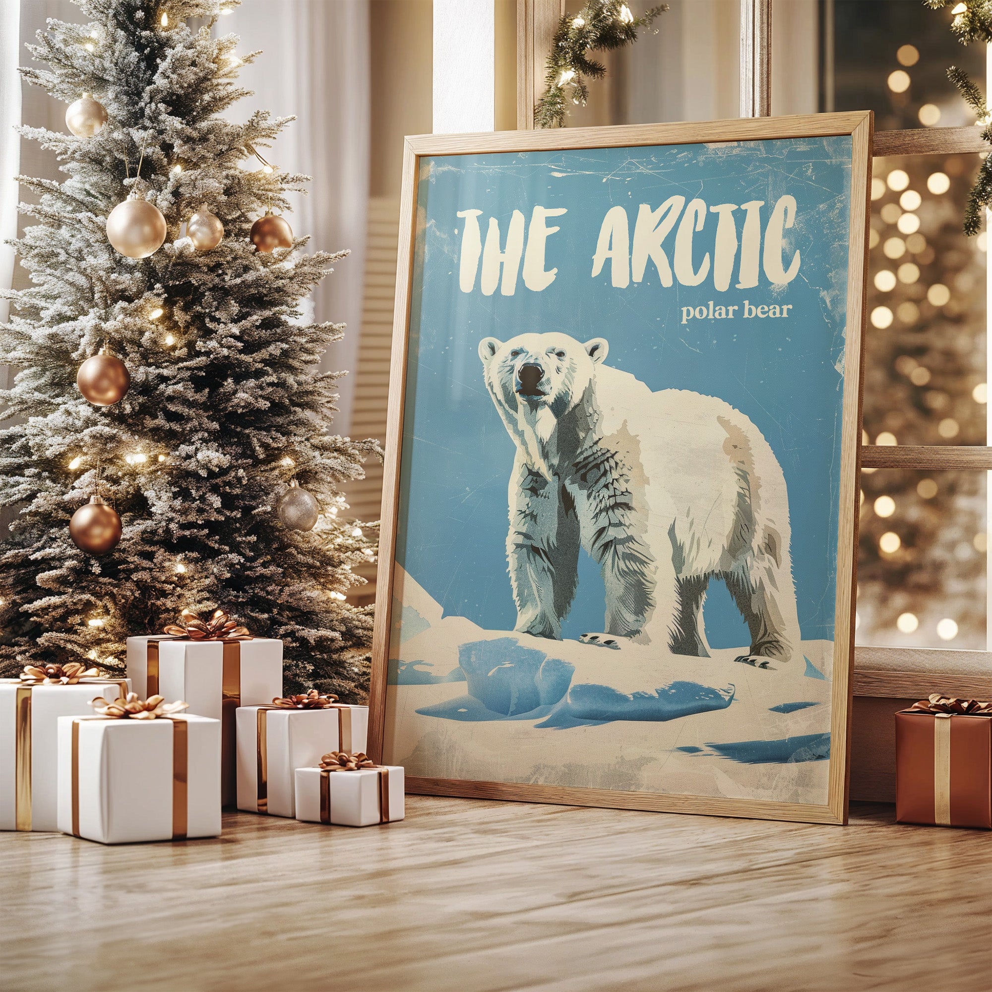 A majestic polar bear stands sentinel against a weathered azure backdrop, commanding respect with its powerful presence. The vintage-inspired illustration captures the textured fur and confident stance of this arctic sovereign, with deliberate scratches and wear giving the piece a nostalgic, timeworn quality. This contemporary interpretation of classic nature illustration brings wilderness wonder into modern spaces.