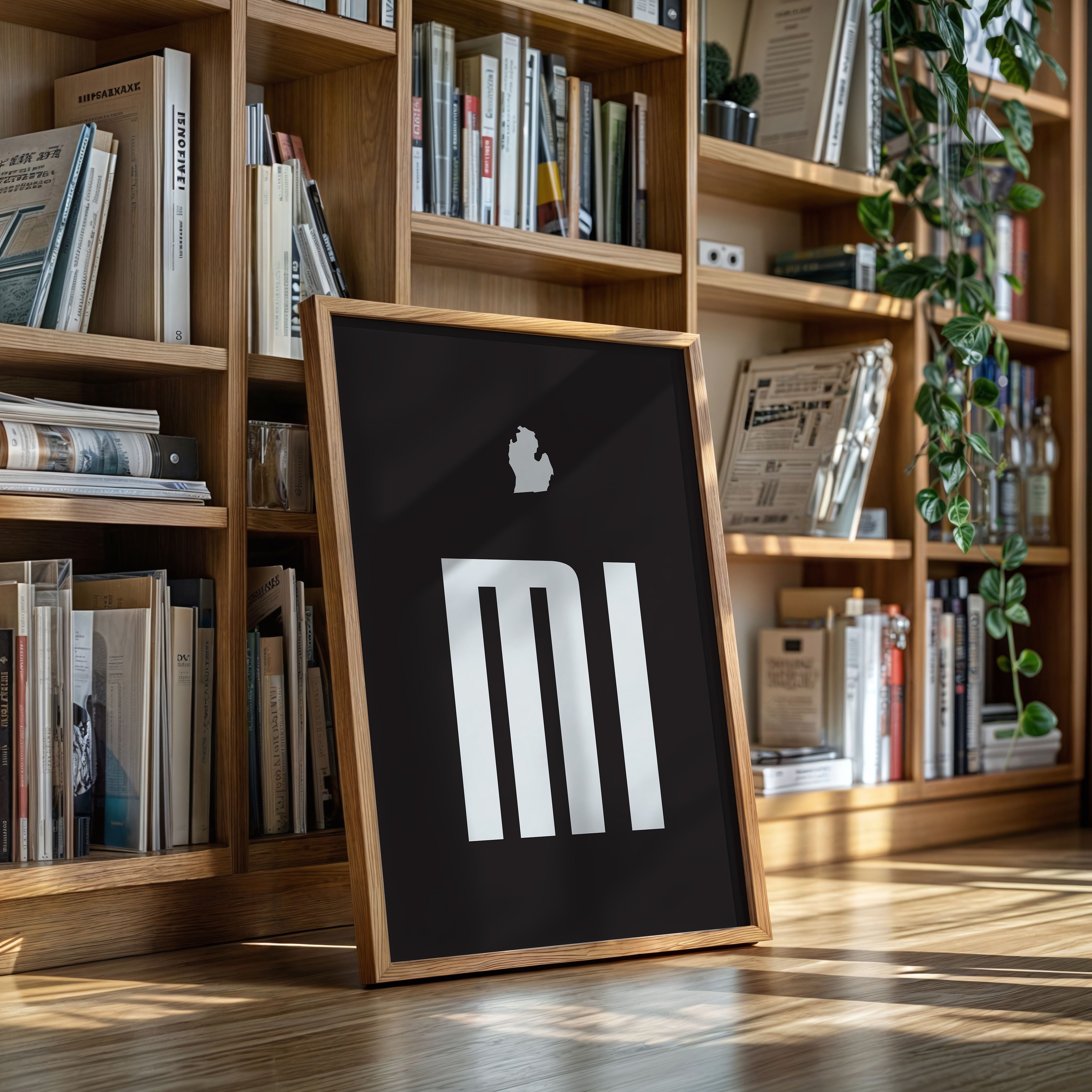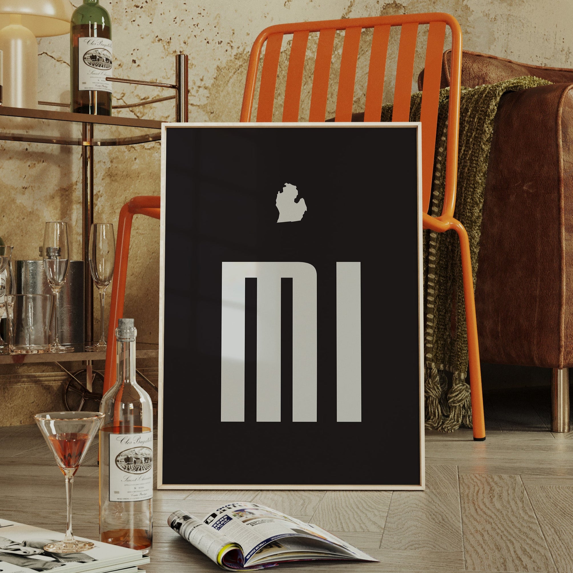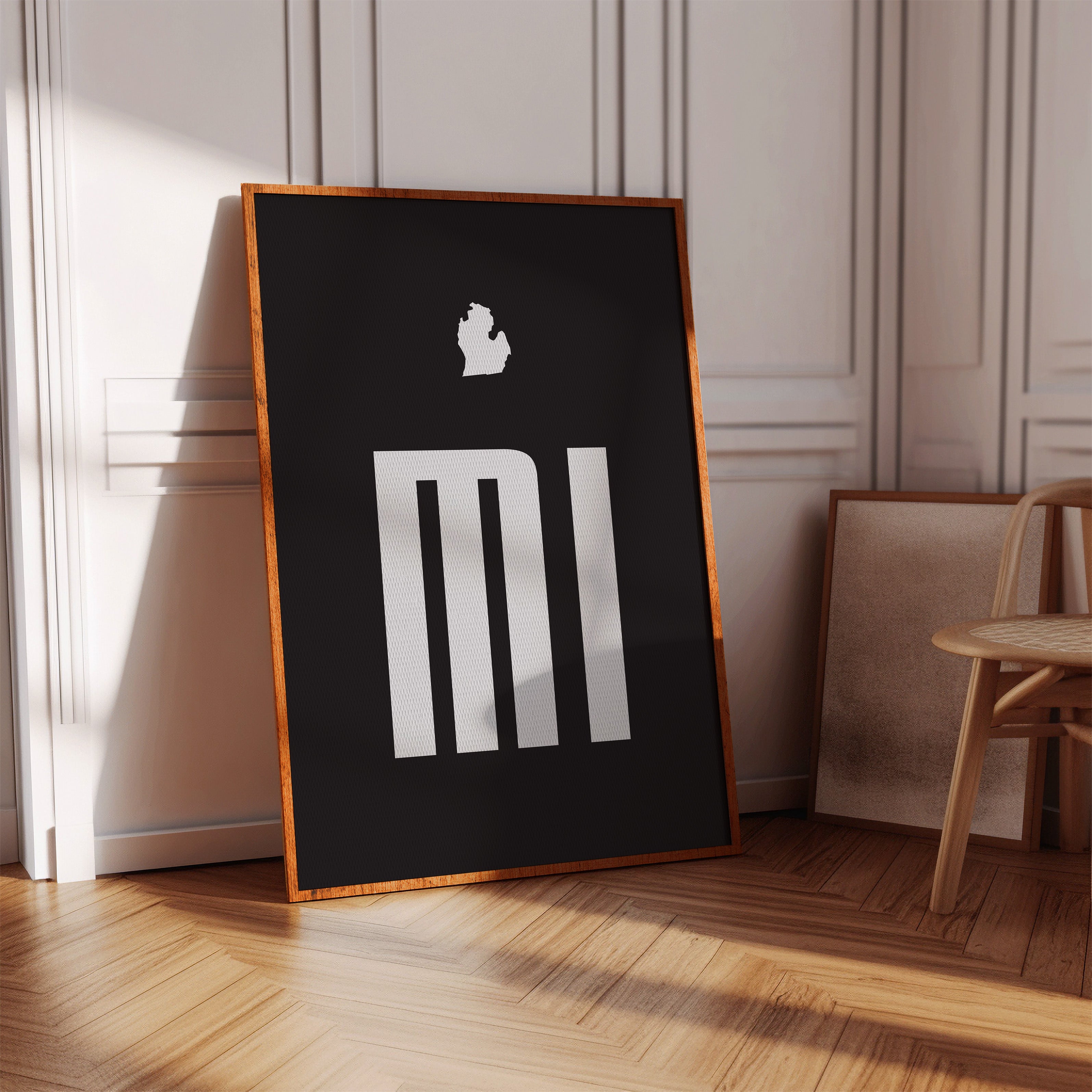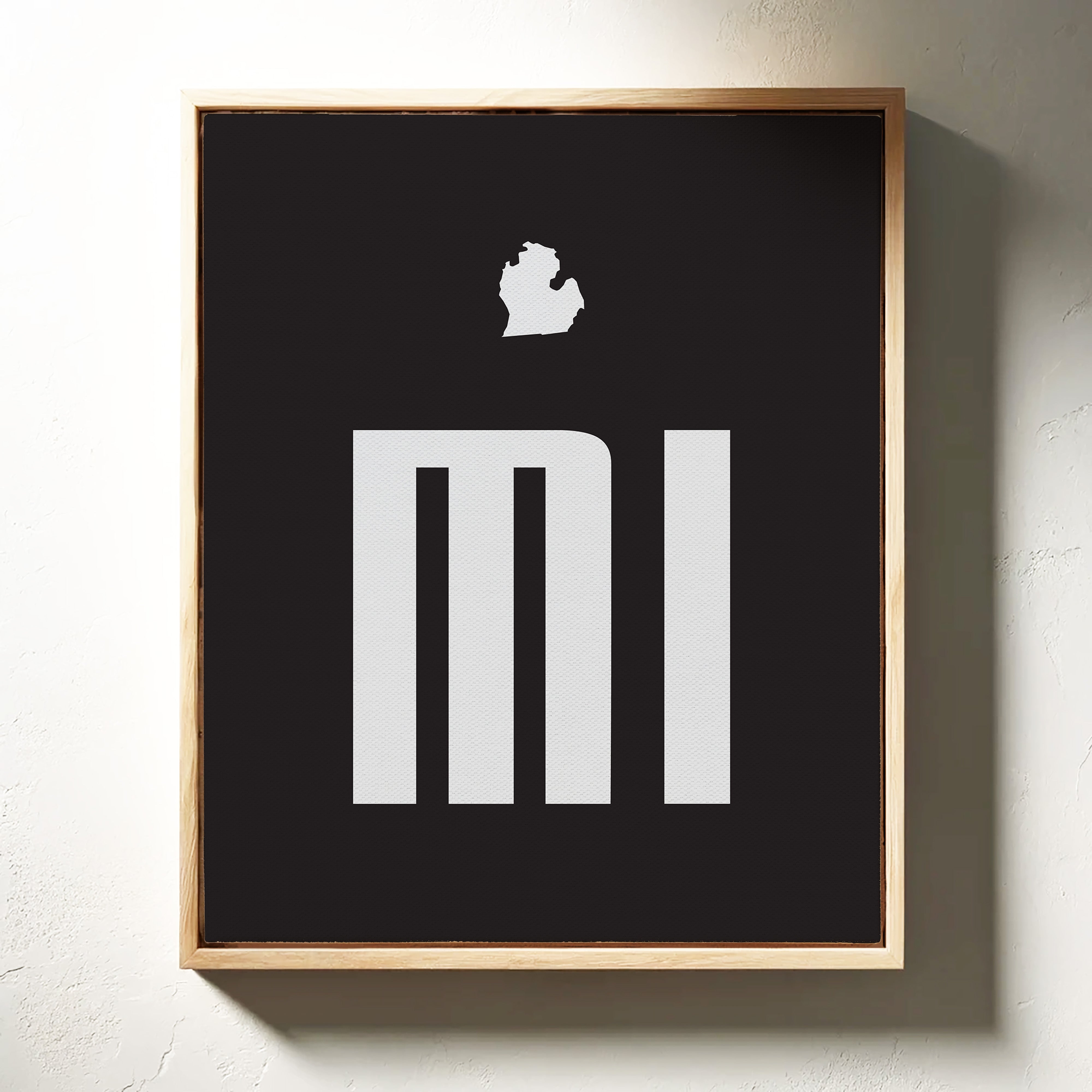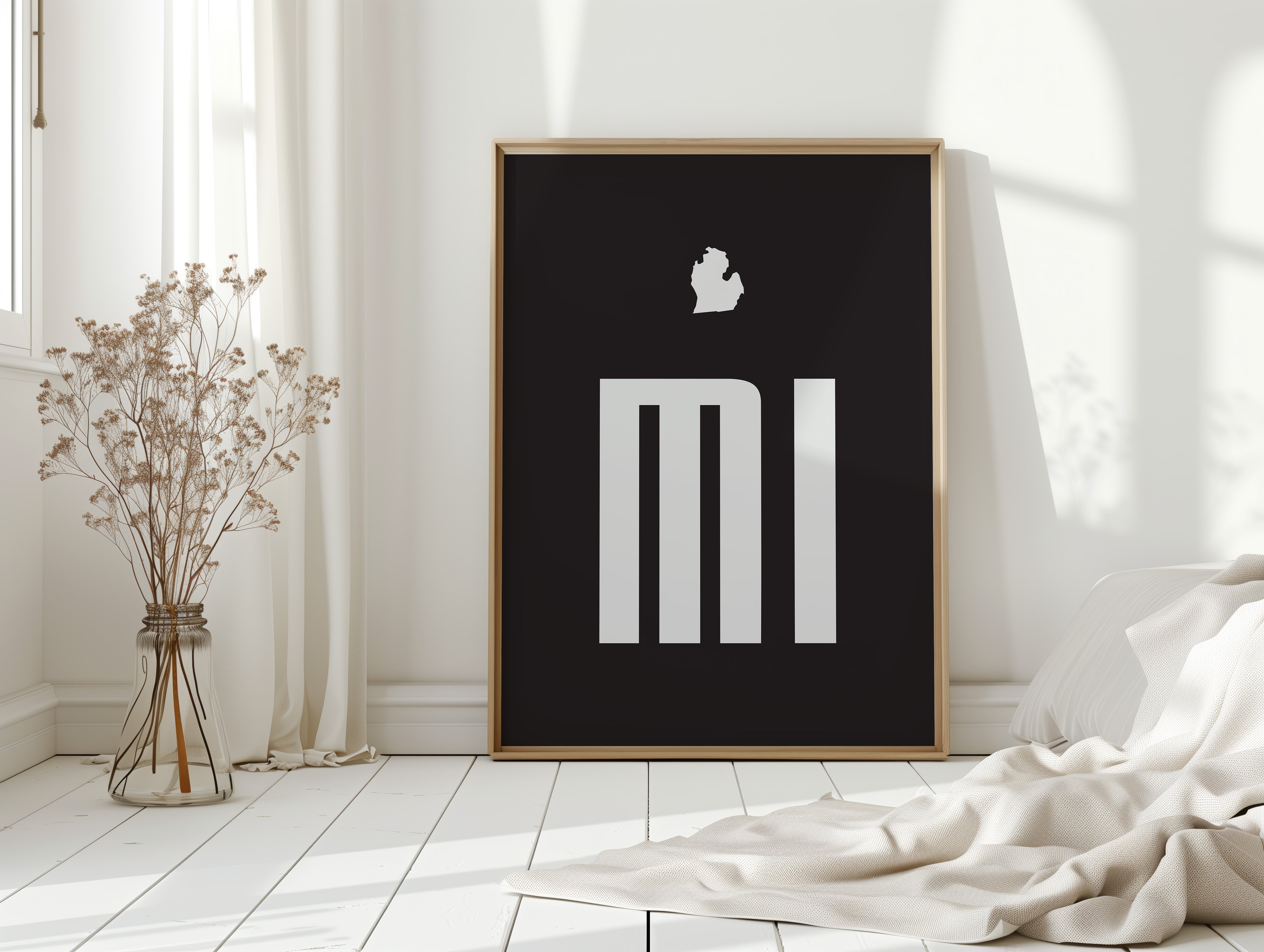 Clean lines carve through darkness, creating a bold statement of geographic identity. The minimalist design pairs Michigan's distinctive silhouette with contemporary typography, speaking volumes through elegant negative space. The stark contrast between pure white forms and deep black background creates a powerful visual rhythm that commands attention while maintaining sophistication. This piece would bring striking graphic presence to a modern office space or add architectural interest to a minimalist living room.