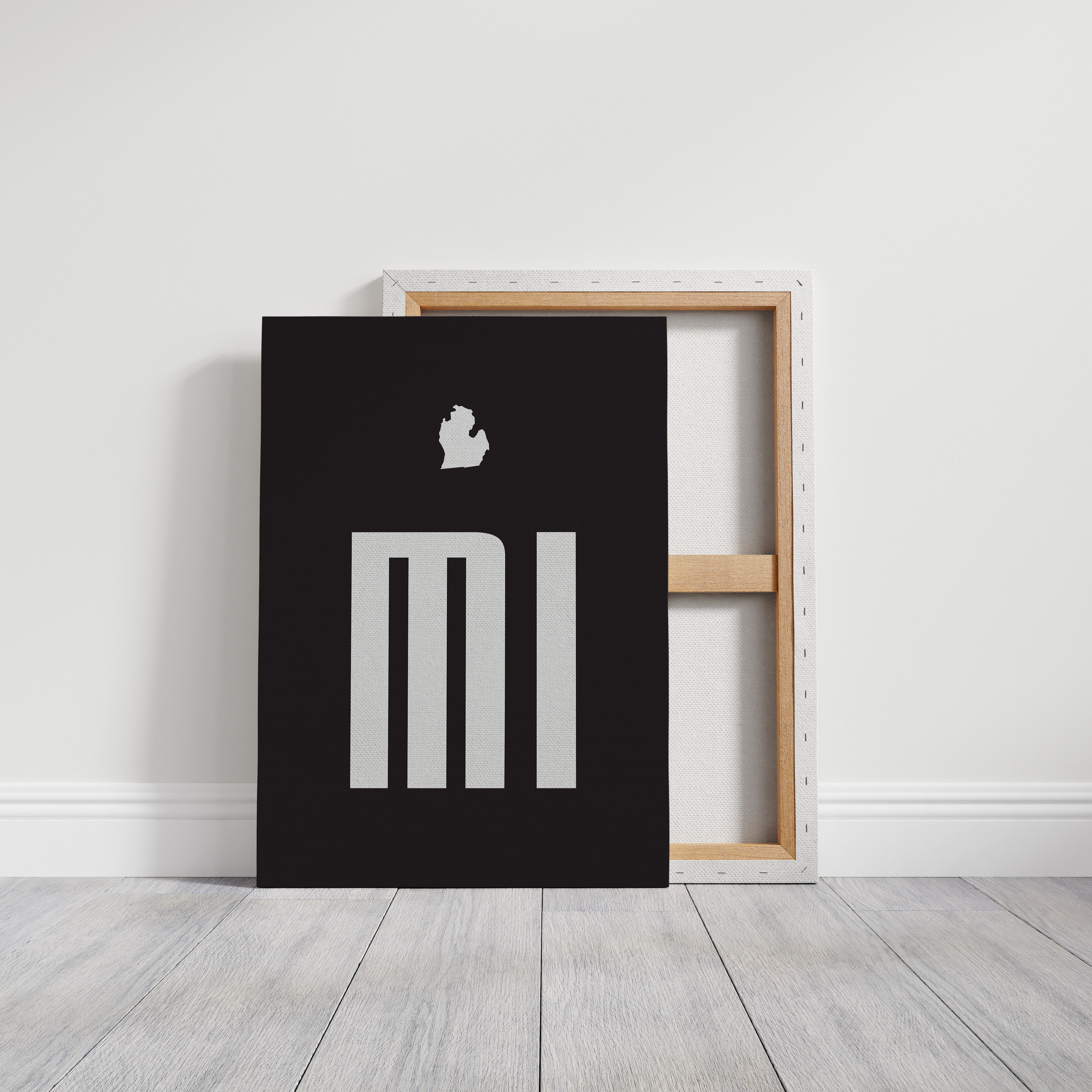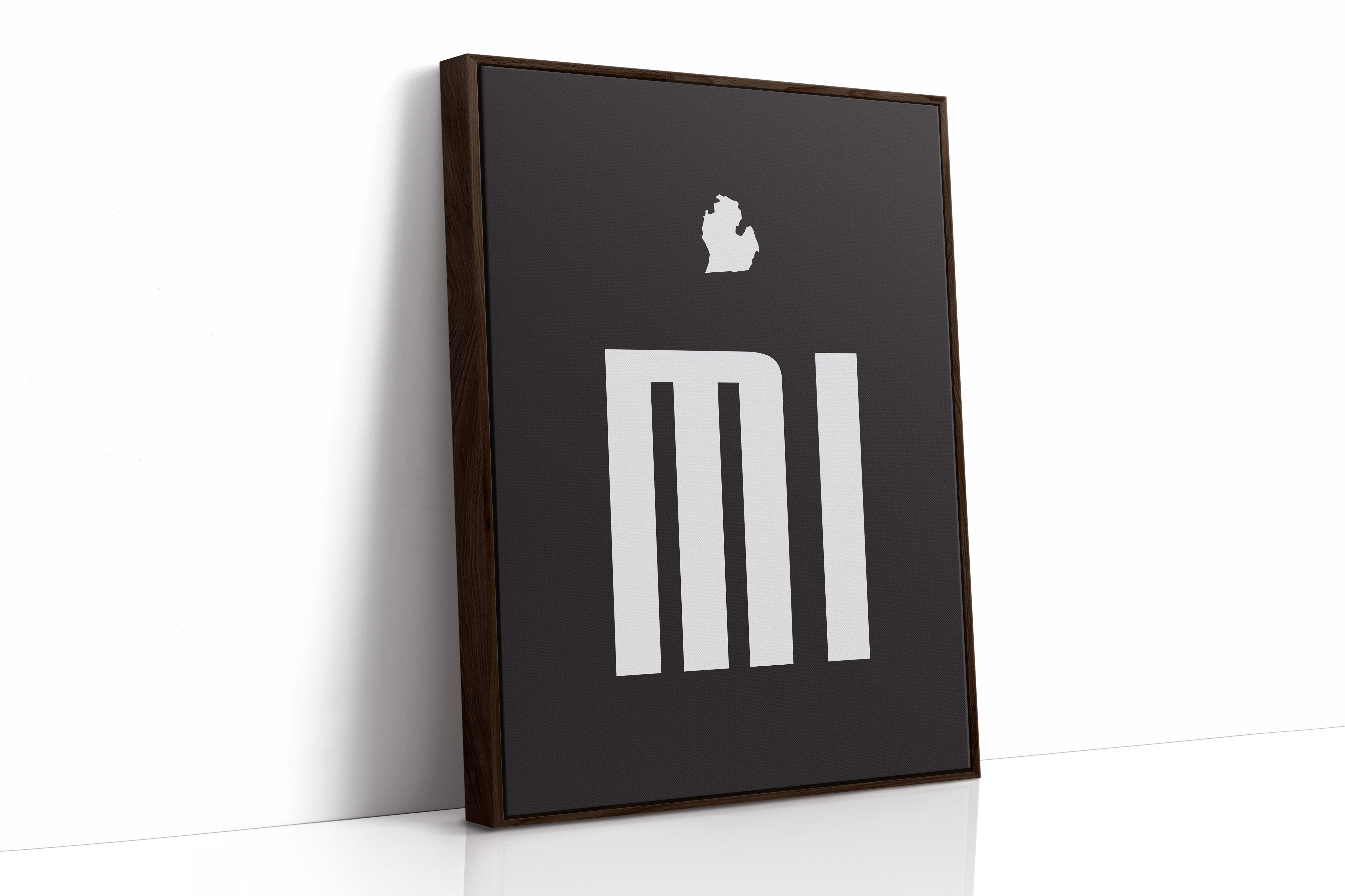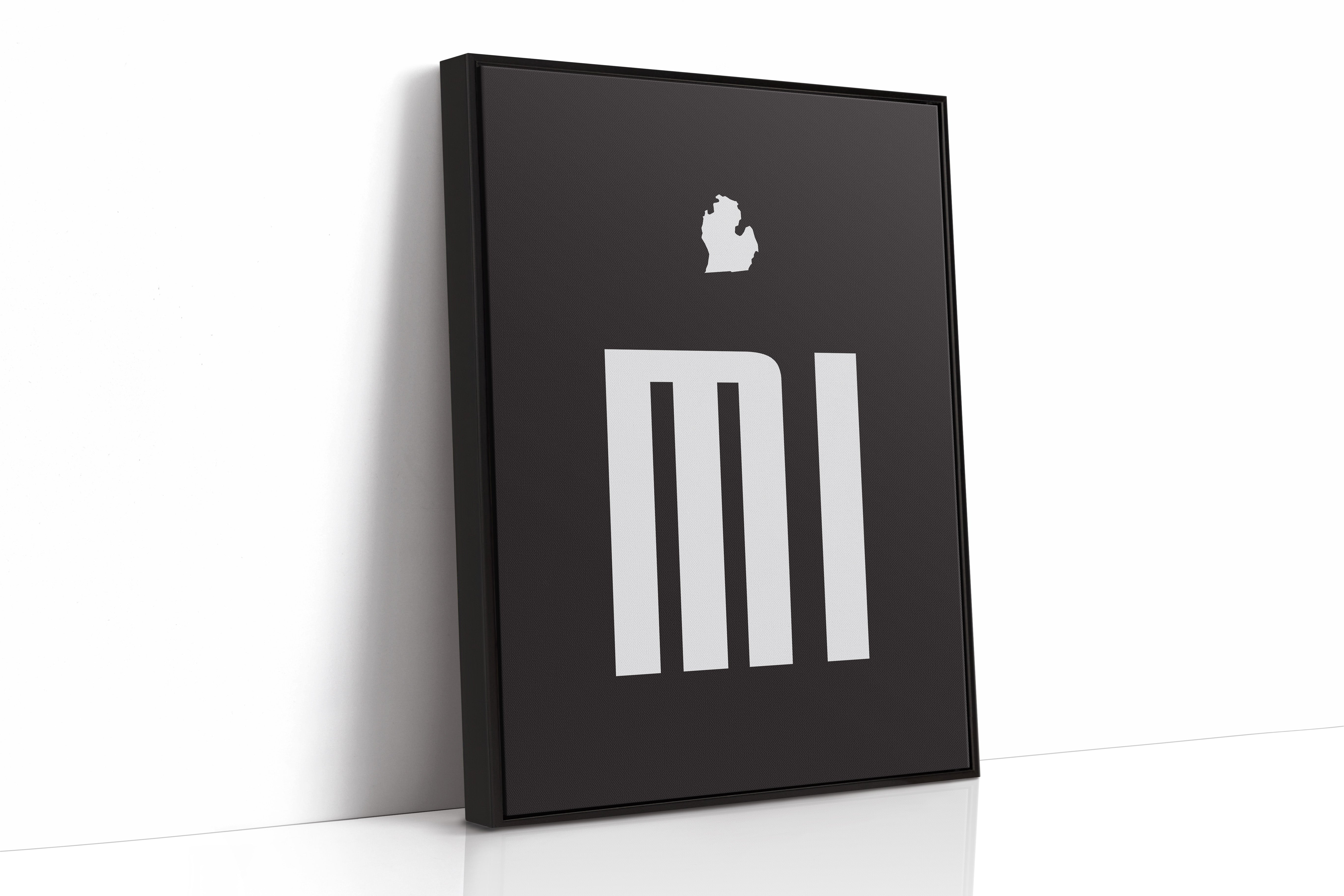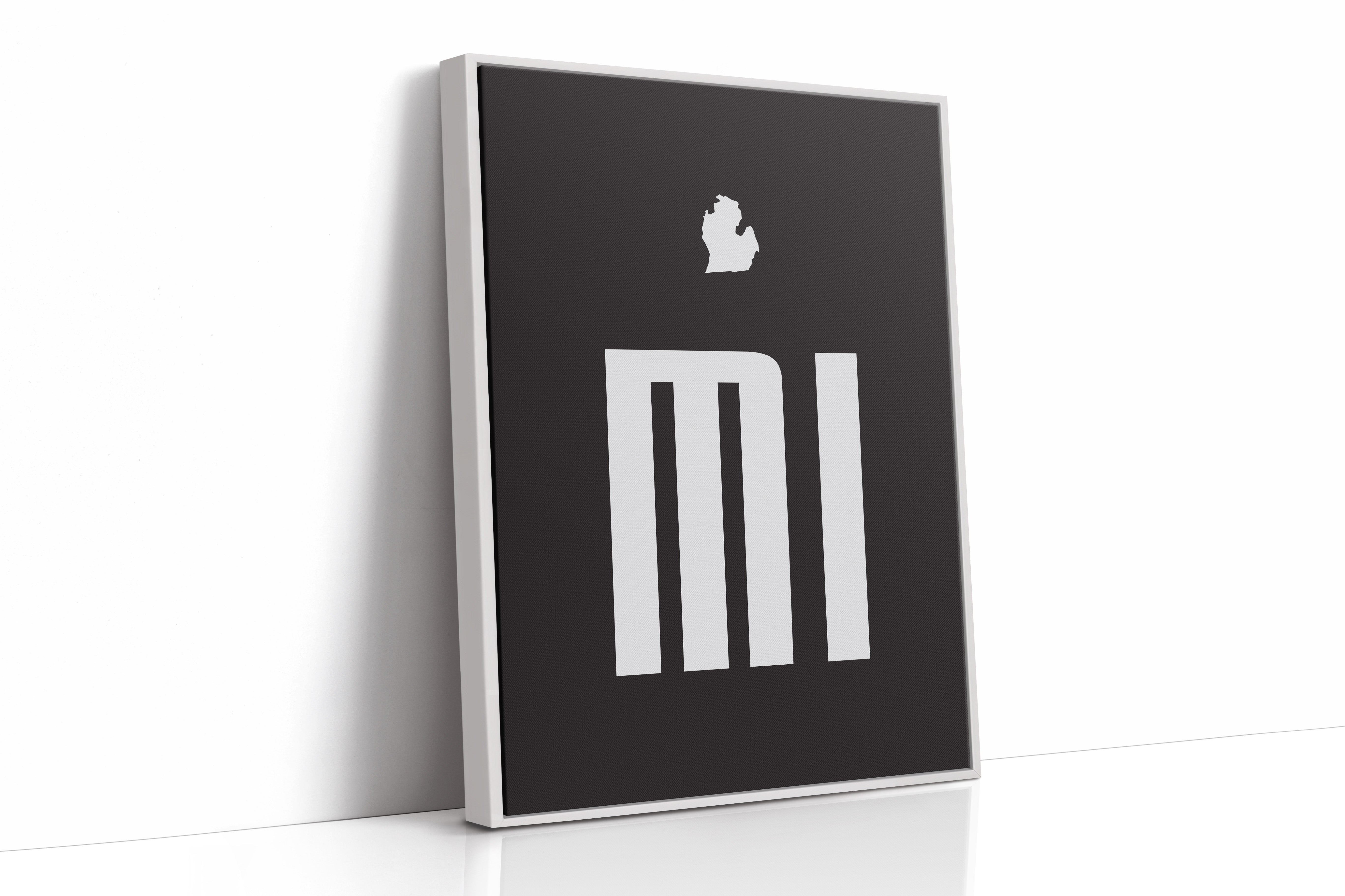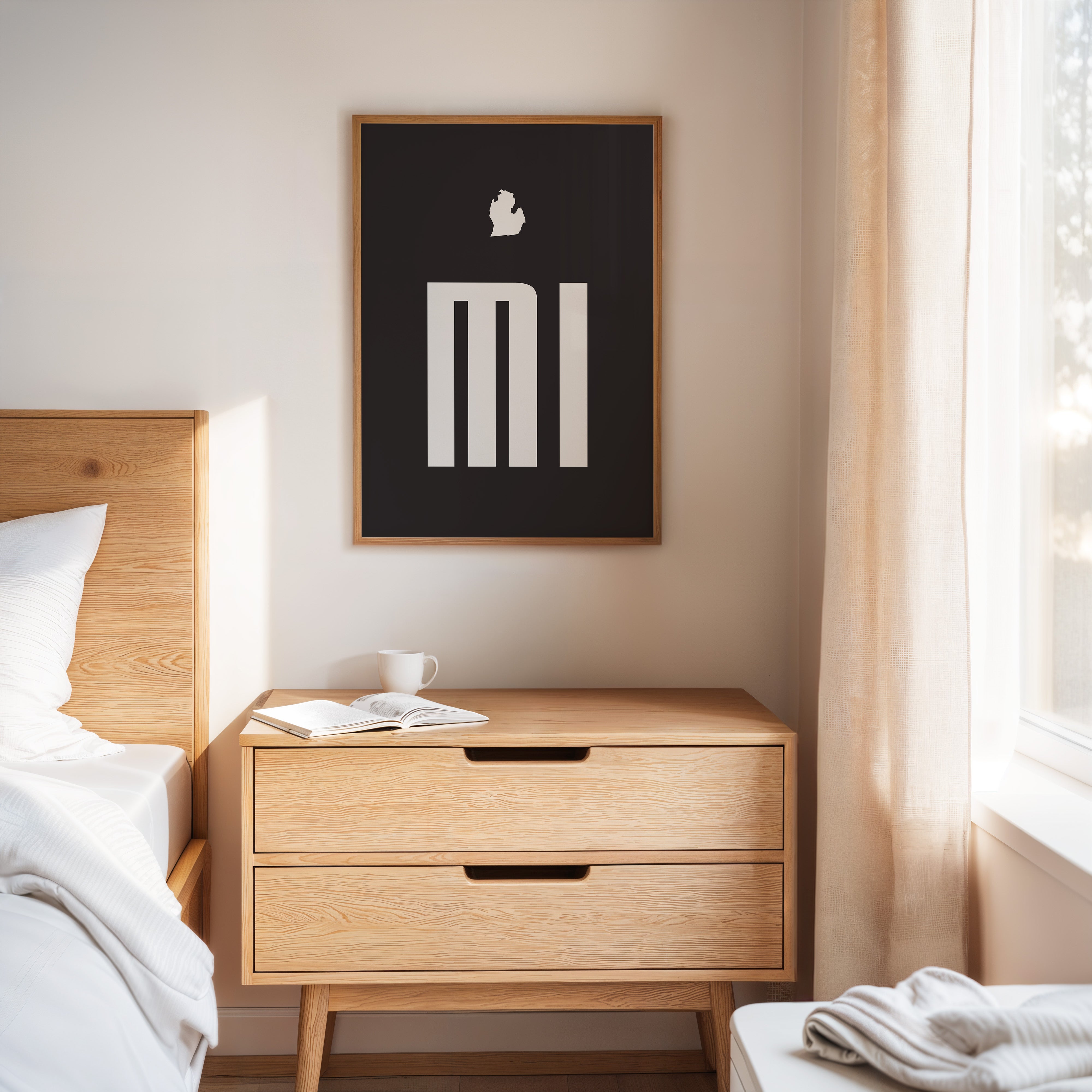 Clean lines carve through darkness, creating a bold statement of geographic identity. The minimalist design pairs Michigan's distinctive silhouette with contemporary typography, speaking volumes through elegant negative space. The stark contrast between pure white forms and deep black background creates a powerful visual rhythm that commands attention while maintaining sophistication. This piece would bring striking graphic presence to a modern office space or add architectural interest to a minimalist living room.
