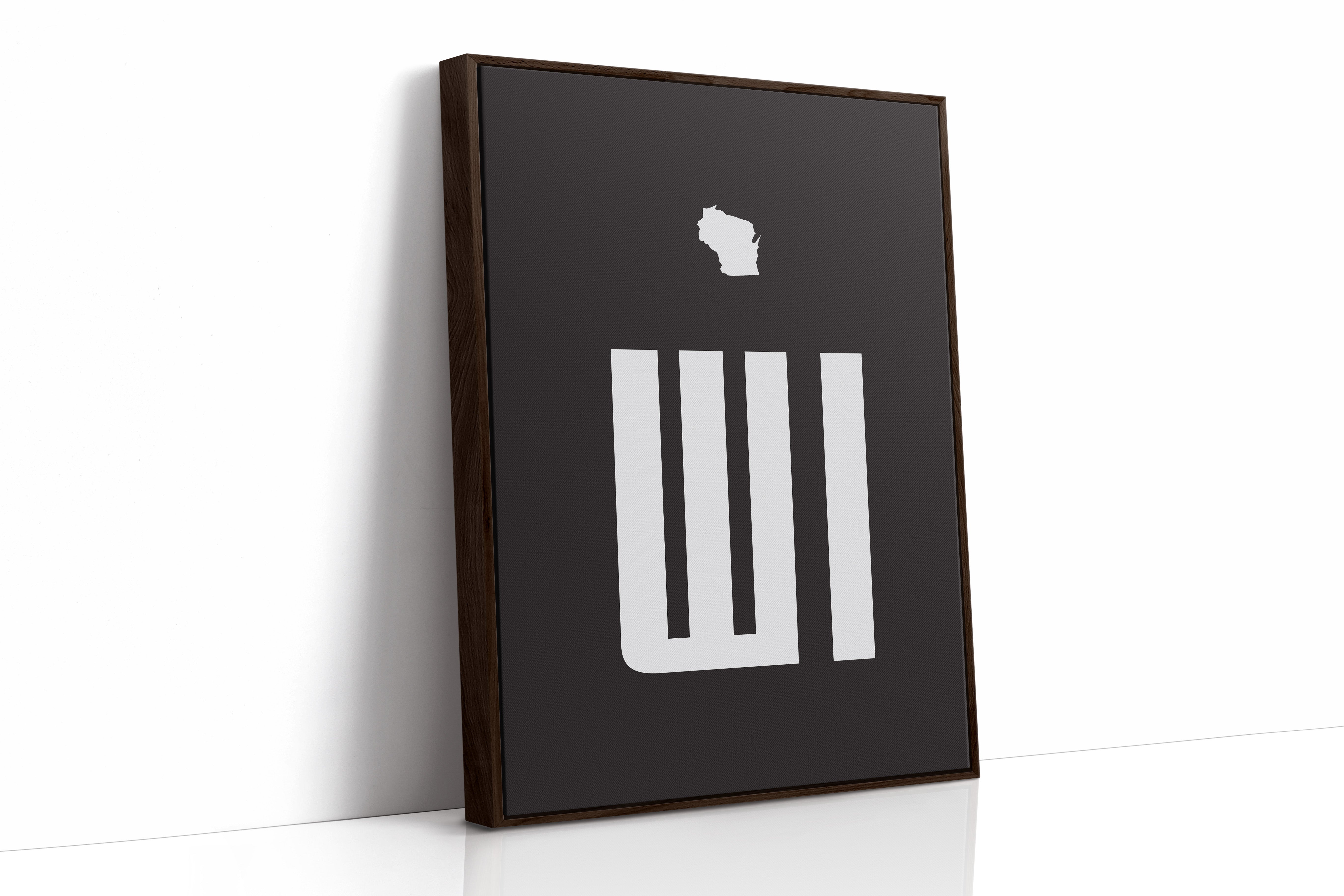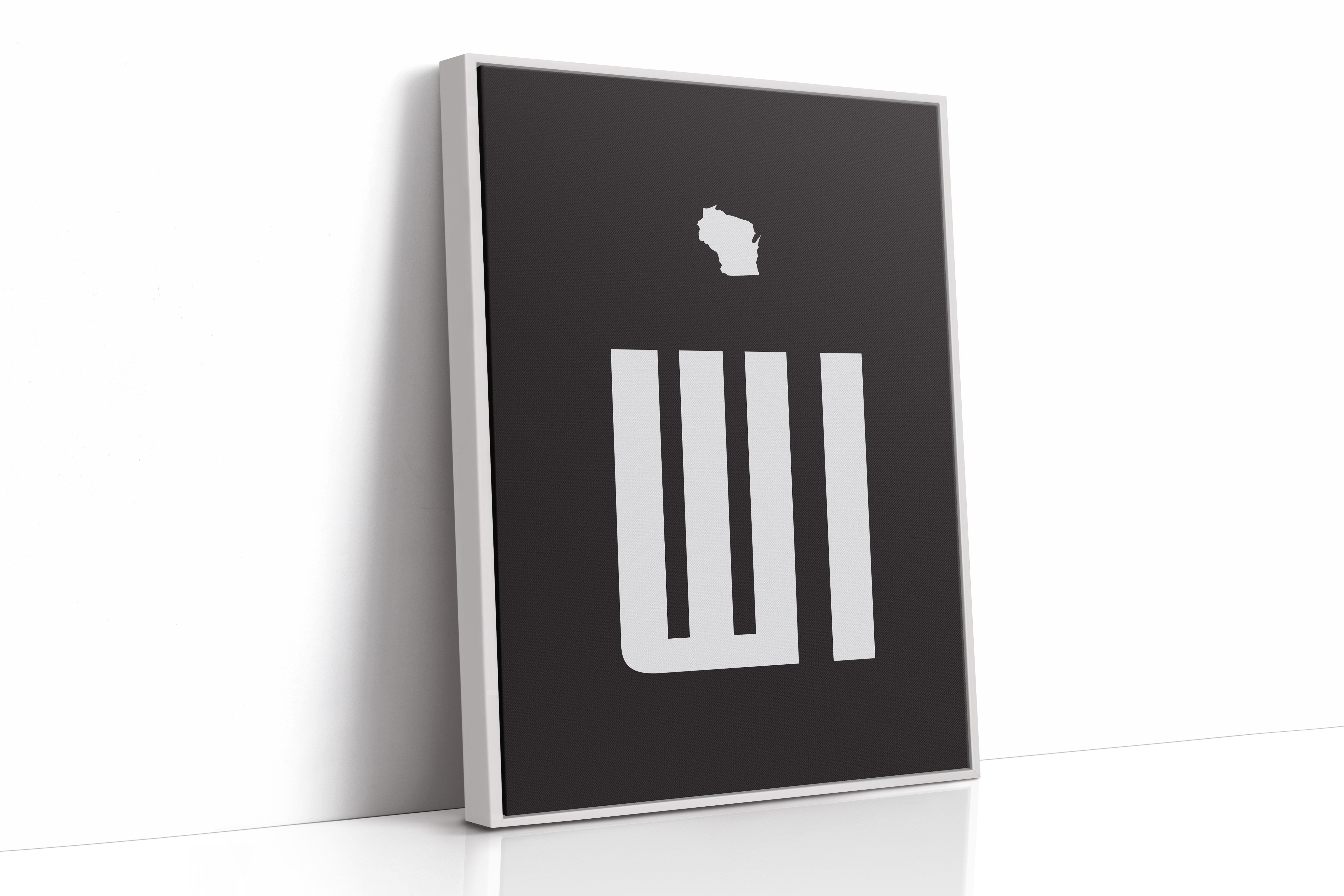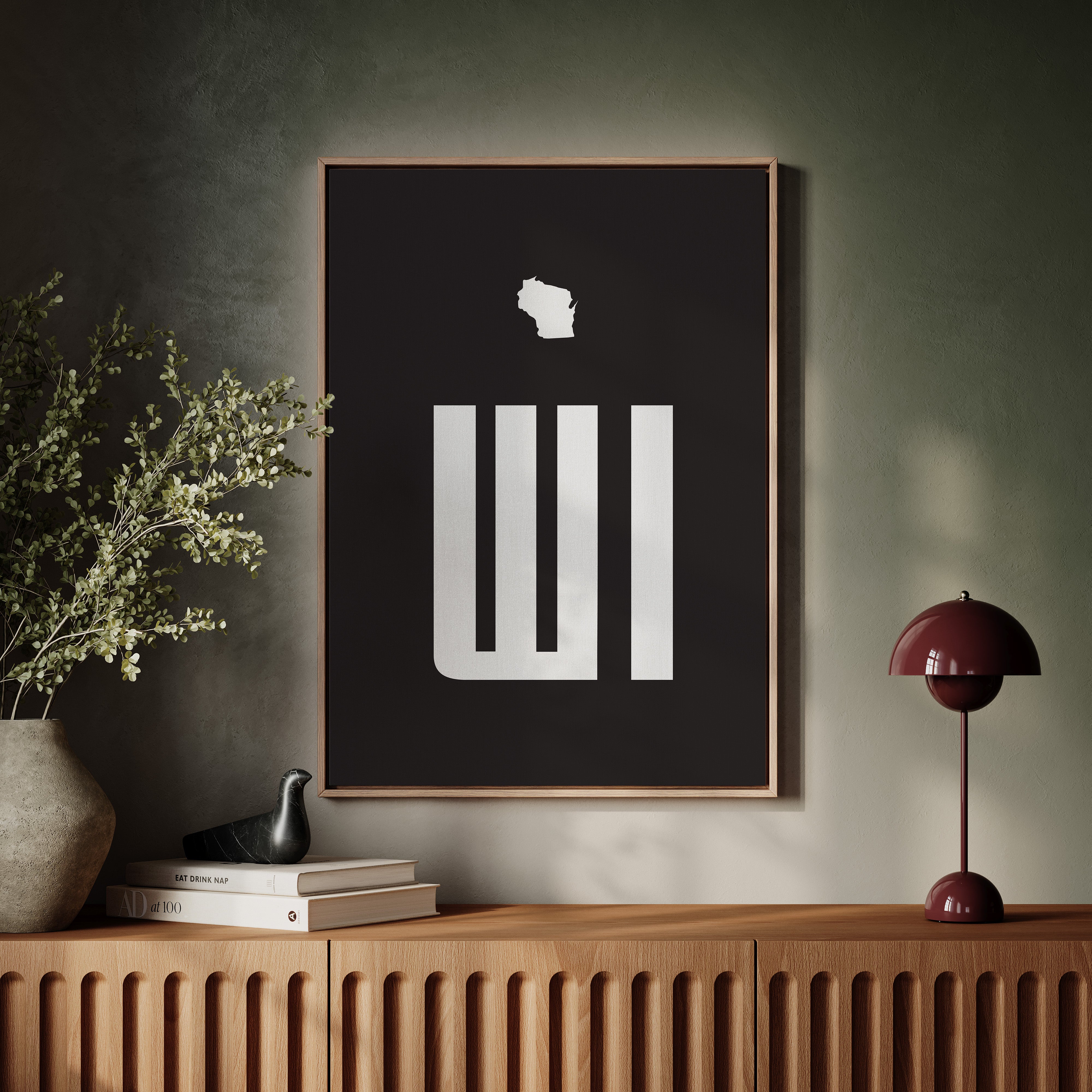 Clean white forms float against deep darkness, creating a striking visual dialogue between presence and absence. The geometric precision of the ""WI"" letterforms anchors the composition, while Wisconsin's distinctive silhouette hovers above like a crown. The minimalist design speaks volumes through negative space, suggesting both belonging and independence. This piece marries typography and geography in a bold contemporary statement. The stark contrast between black and white creates a powerful visual tension, while the simplified shapes invite contemplation of place and identity. This sophisticated graphic piece would command attention in a modern office, creative studio, or any space celebrating regional pride with contemporary design sensibility.