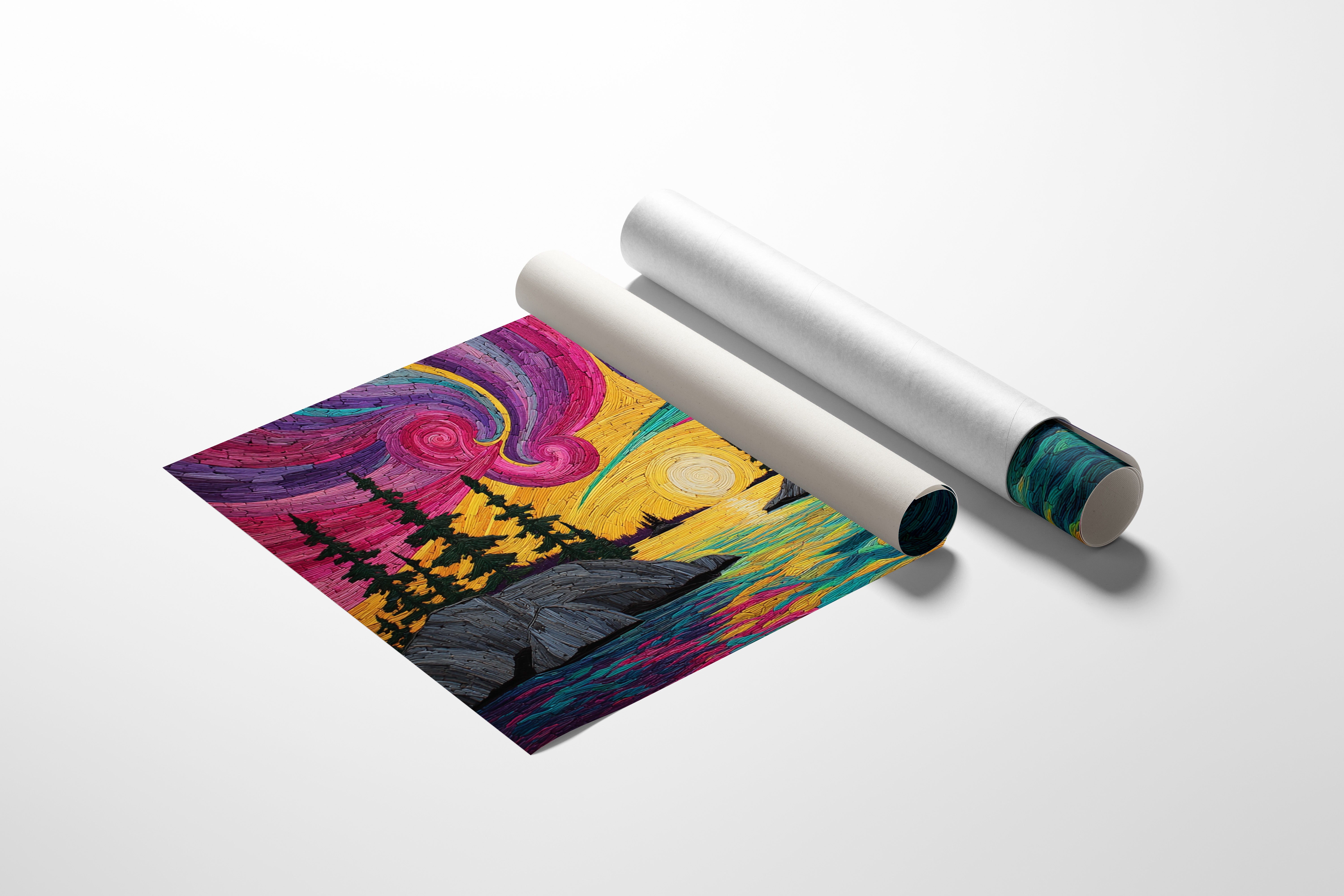 The sky erupts in a vibrant dance of color, where magenta and turquoise auroras spiral above a serene coastal scene. Like threads woven through the heavens, each stroke creates a tapestry of movement and light. The steadfast evergreens stand sentinel along rocky shores, their dark silhouettes grounding the ethereal display as a golden sun melts into the horizon, casting its warm reflection across rippling waters. This piece captures the magic of those rare moments when nature unleashes its full spectrum of wonder. Perfect for creating a stunning focal point in a modern living room or adding an enchanting touch to a meditation space.