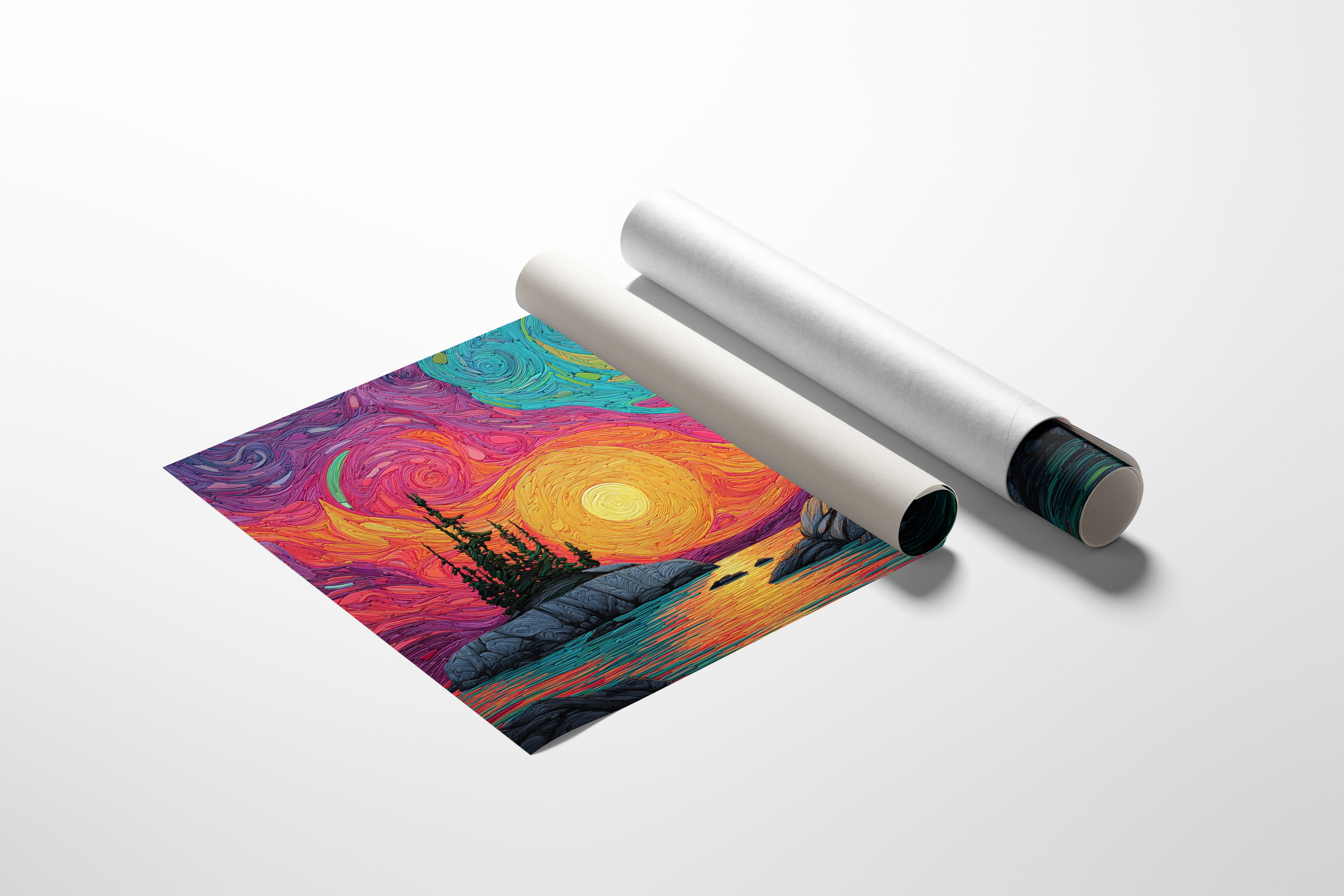 A mesmerizing dance of color sweeps across the sky, where swirling brushstrokes create a symphony of turquoise, magenta, and gold. Evergreen sentinels stand tall on rocky shores, their silhouettes sharp against a sky alive with movement and energy. The textured technique brings depth to every element - from the rippling waters reflecting the brilliant sunset to the layered stone formations anchoring the scene in earthen stability. This vibrant interpretation of a northern landscape captures both the wild spirit and serene beauty of pristine wilderness.