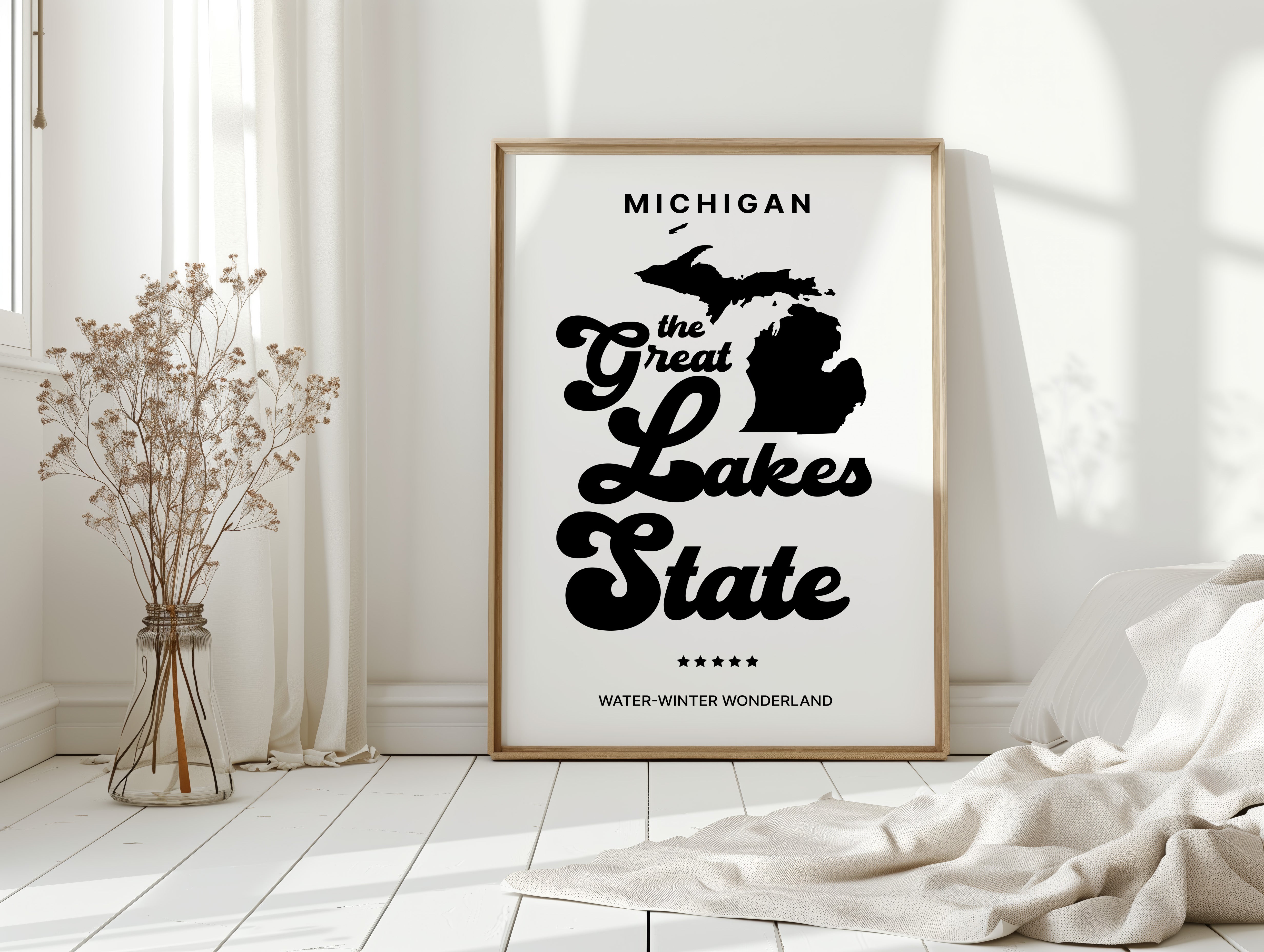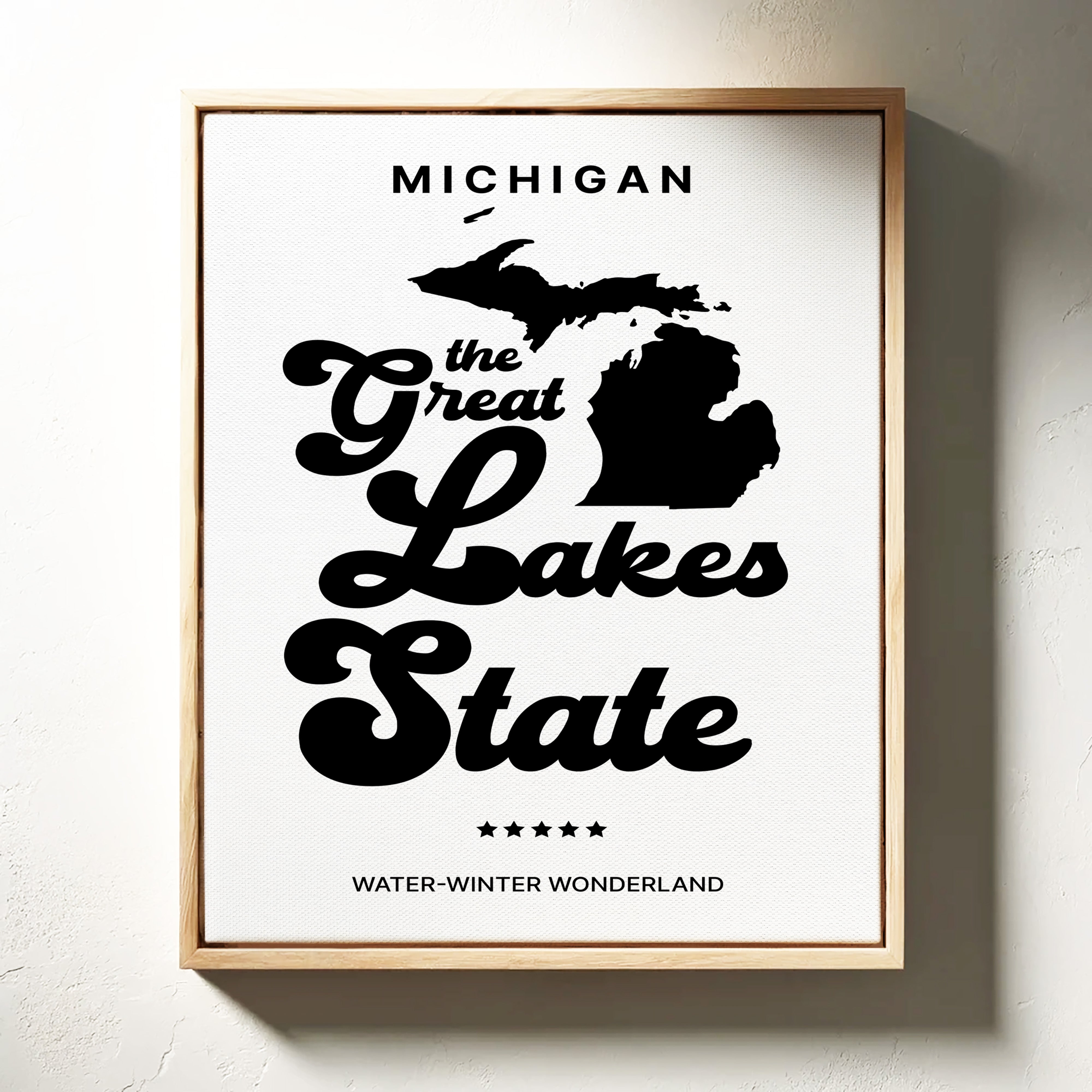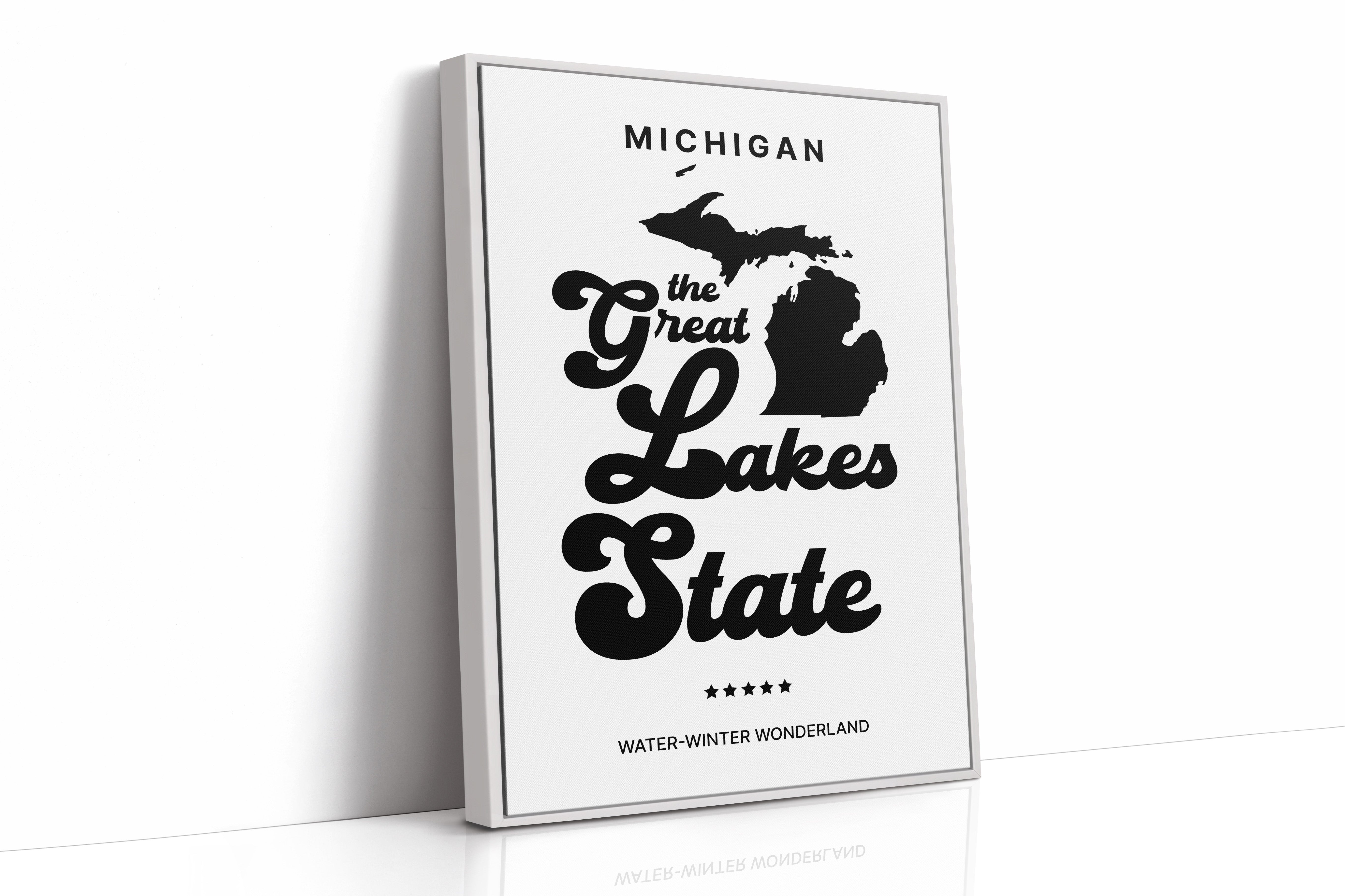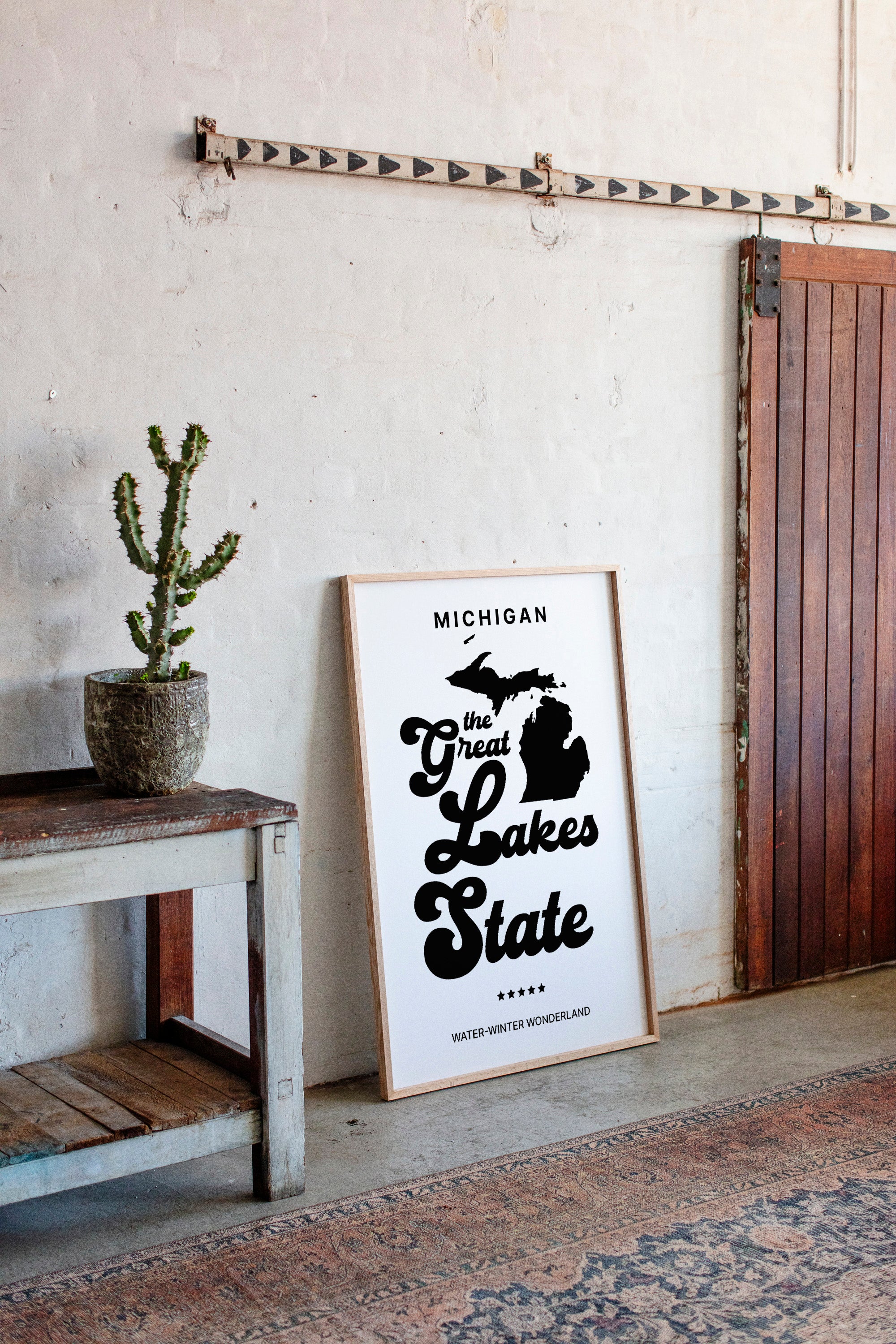Bold typography dances with the iconic silhouette of Michigan, creating a powerful statement of state pride and natural beauty. This contemporary typographic design captures the essence of the Great Lakes State with its striking black and white contrast. The piece speaks to the majesty of freshwater shores and the spirit of Midwestern charm, where every curve of the coastline tells tales of maritime heritage. The bold, retro-inspired lettering flows like waves against the clean negative space, embodying both modern design sensibilities and timeless regional character. Perfect for adding a sophisticated geographical accent to home offices, lake houses, or any space celebrating local identity.