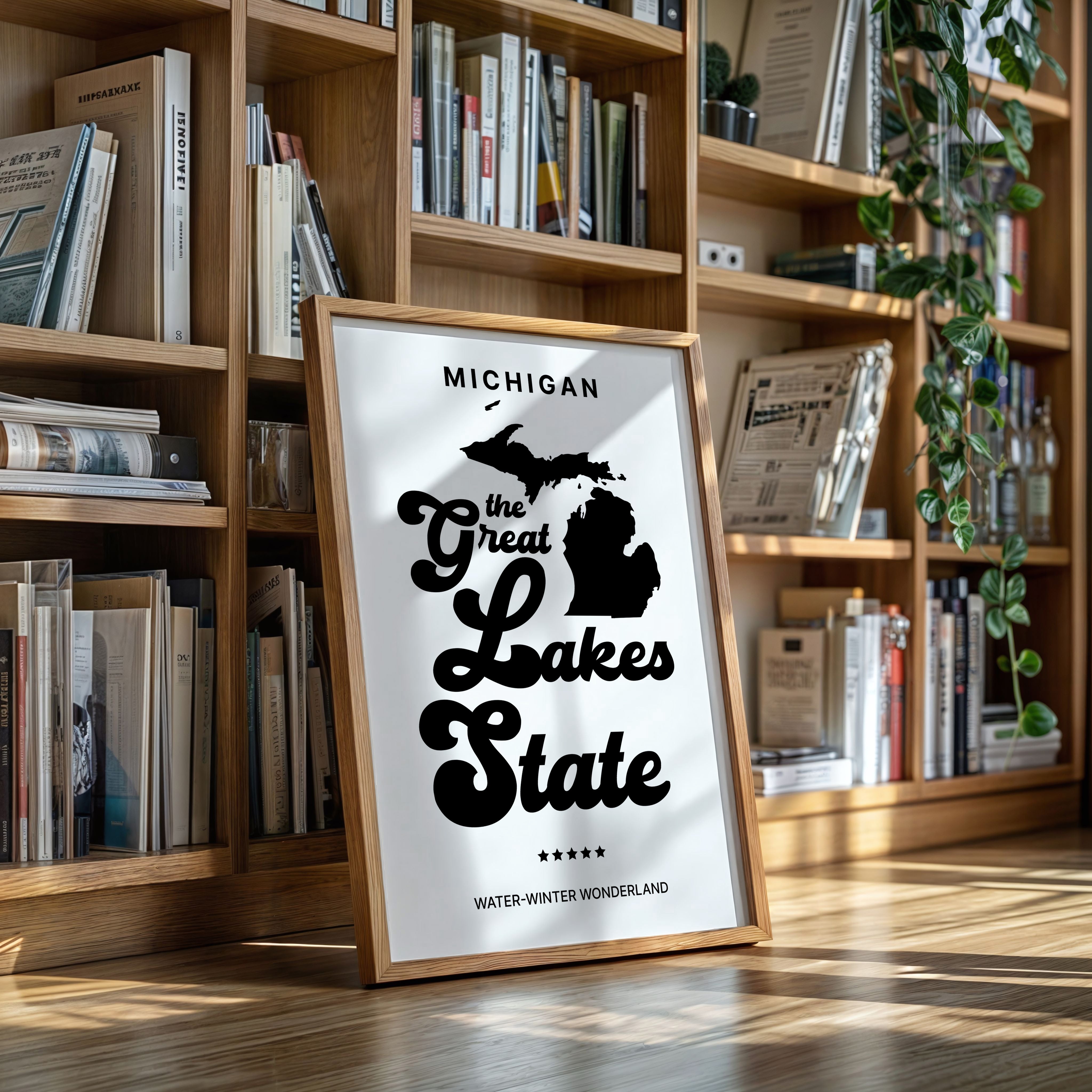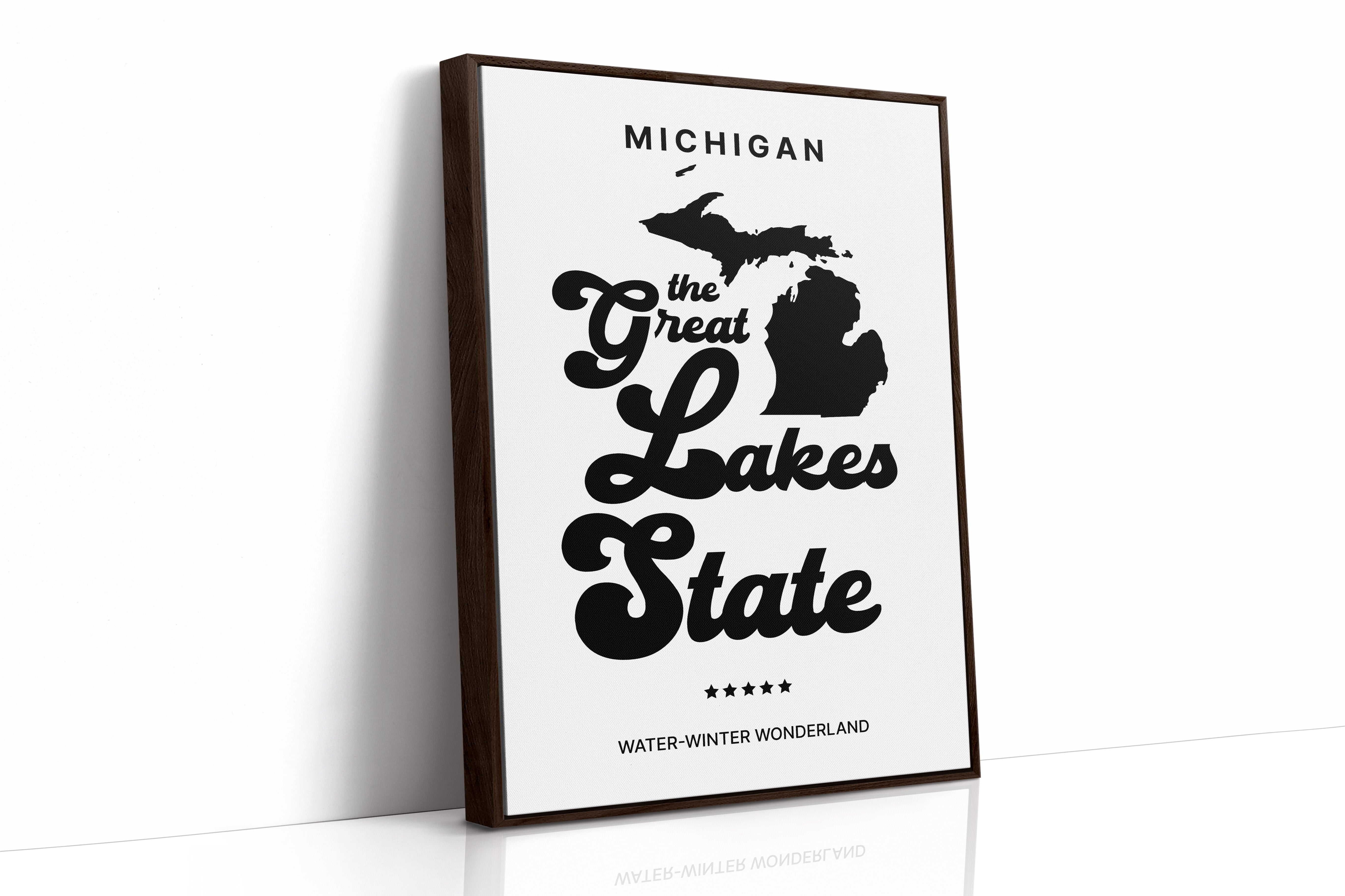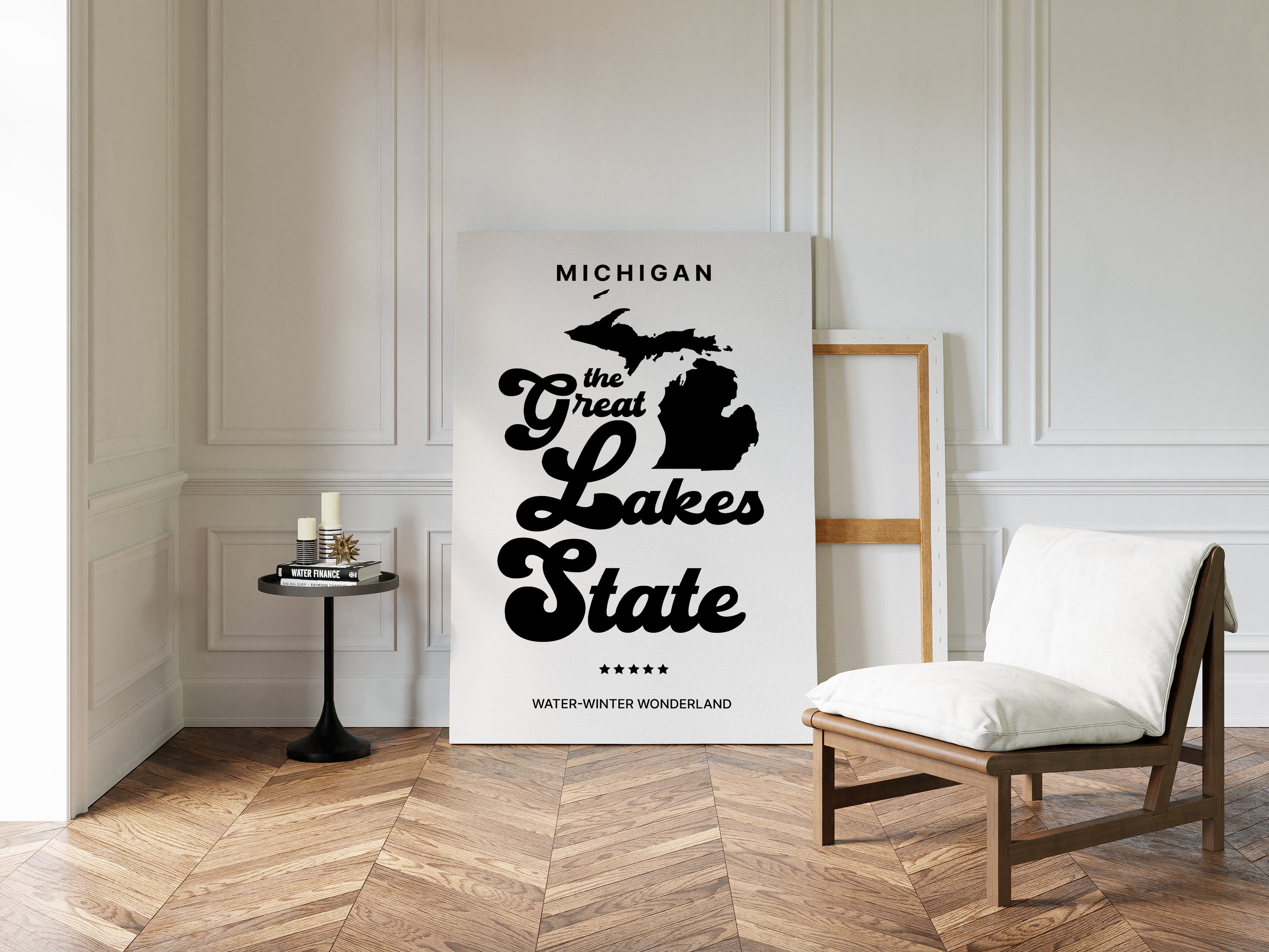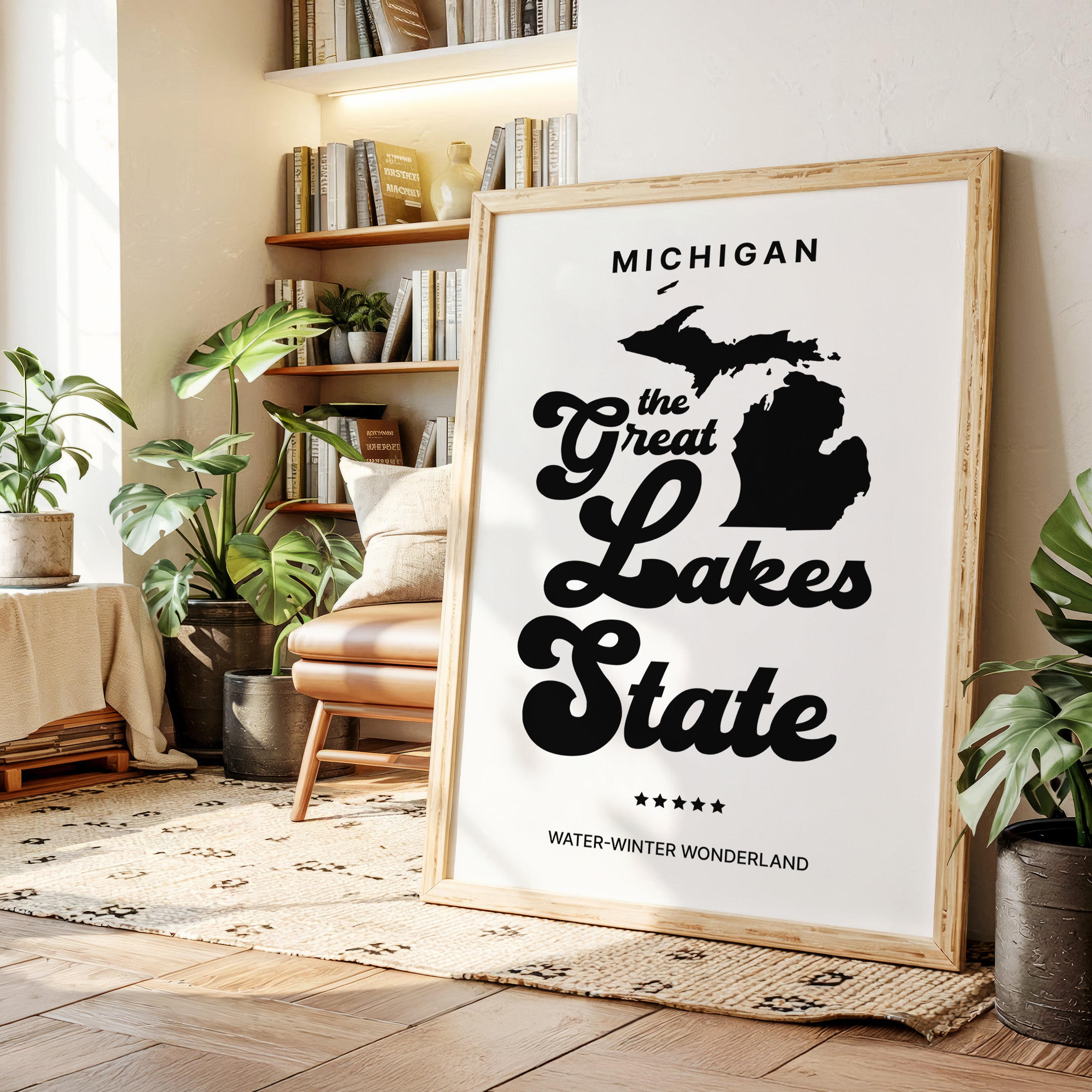 Bold typography dances with the iconic silhouette of Michigan, creating a powerful statement of state pride and natural beauty. This contemporary typographic design captures the essence of the Great Lakes State with its striking black and white contrast. The piece speaks to the majesty of freshwater shores and the spirit of Midwestern charm, where every curve of the coastline tells tales of maritime heritage. The bold, retro-inspired lettering flows like waves against the clean negative space, embodying both modern design sensibilities and timeless regional character. Perfect for adding a sophisticated geographical accent to home offices, lake houses, or any space celebrating local identity.
