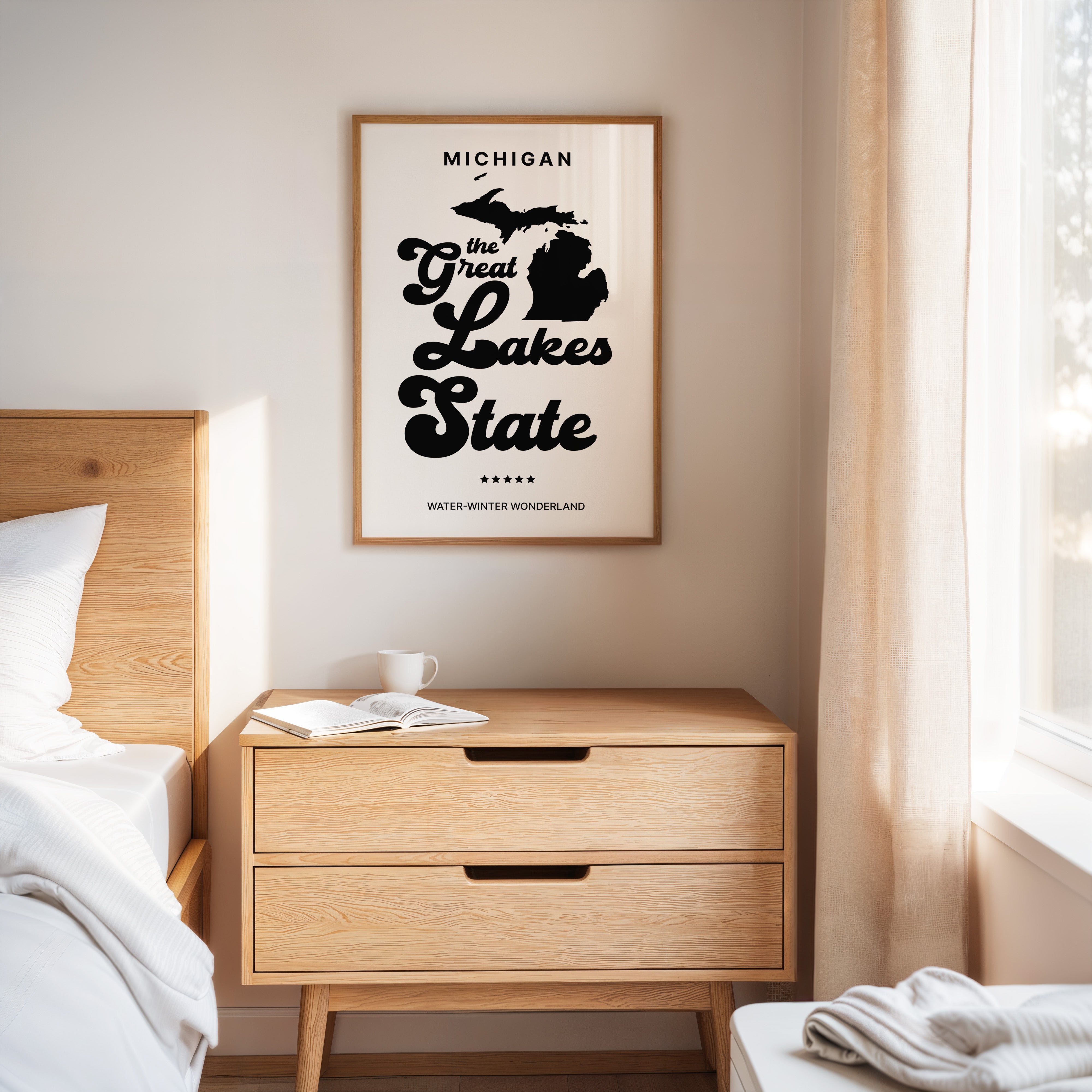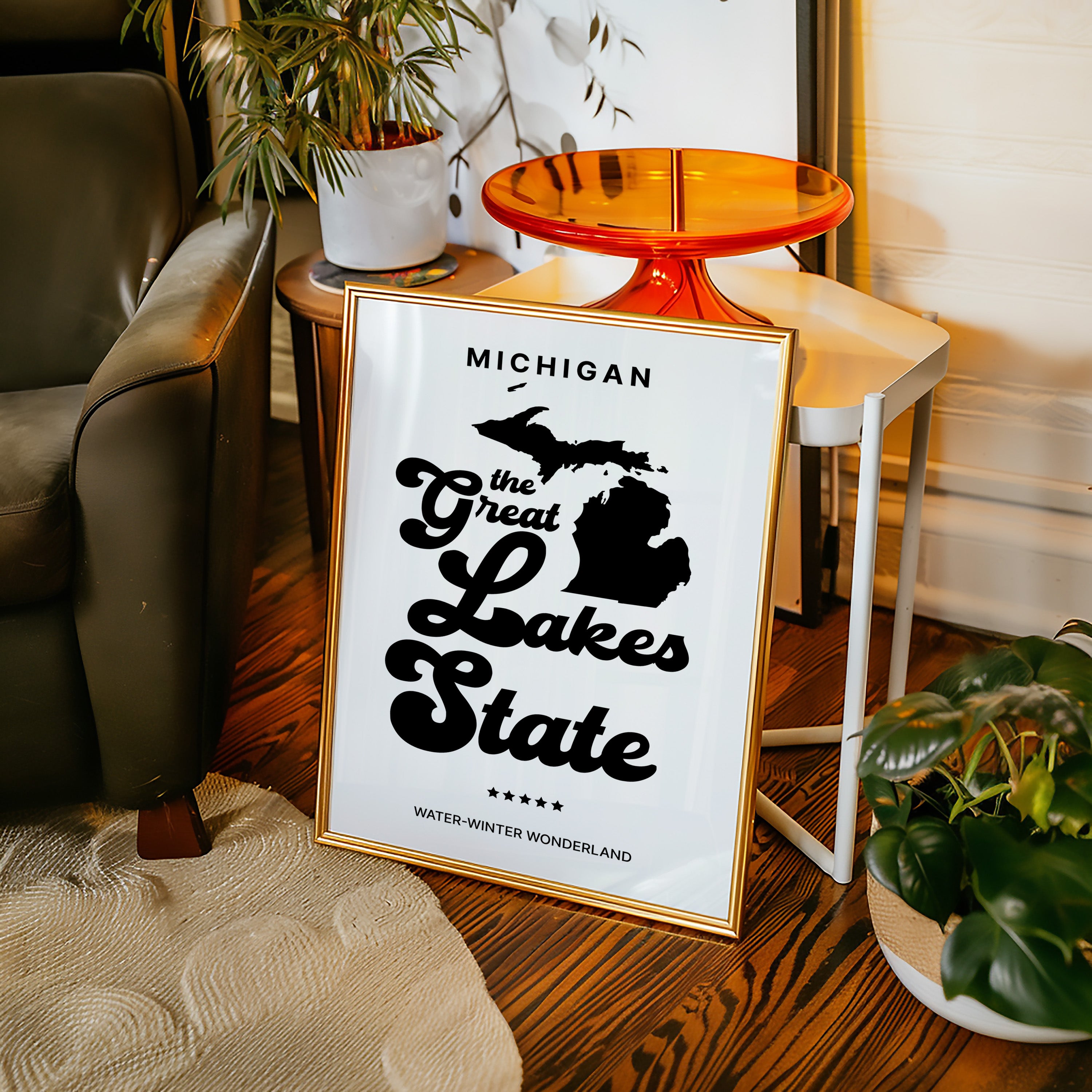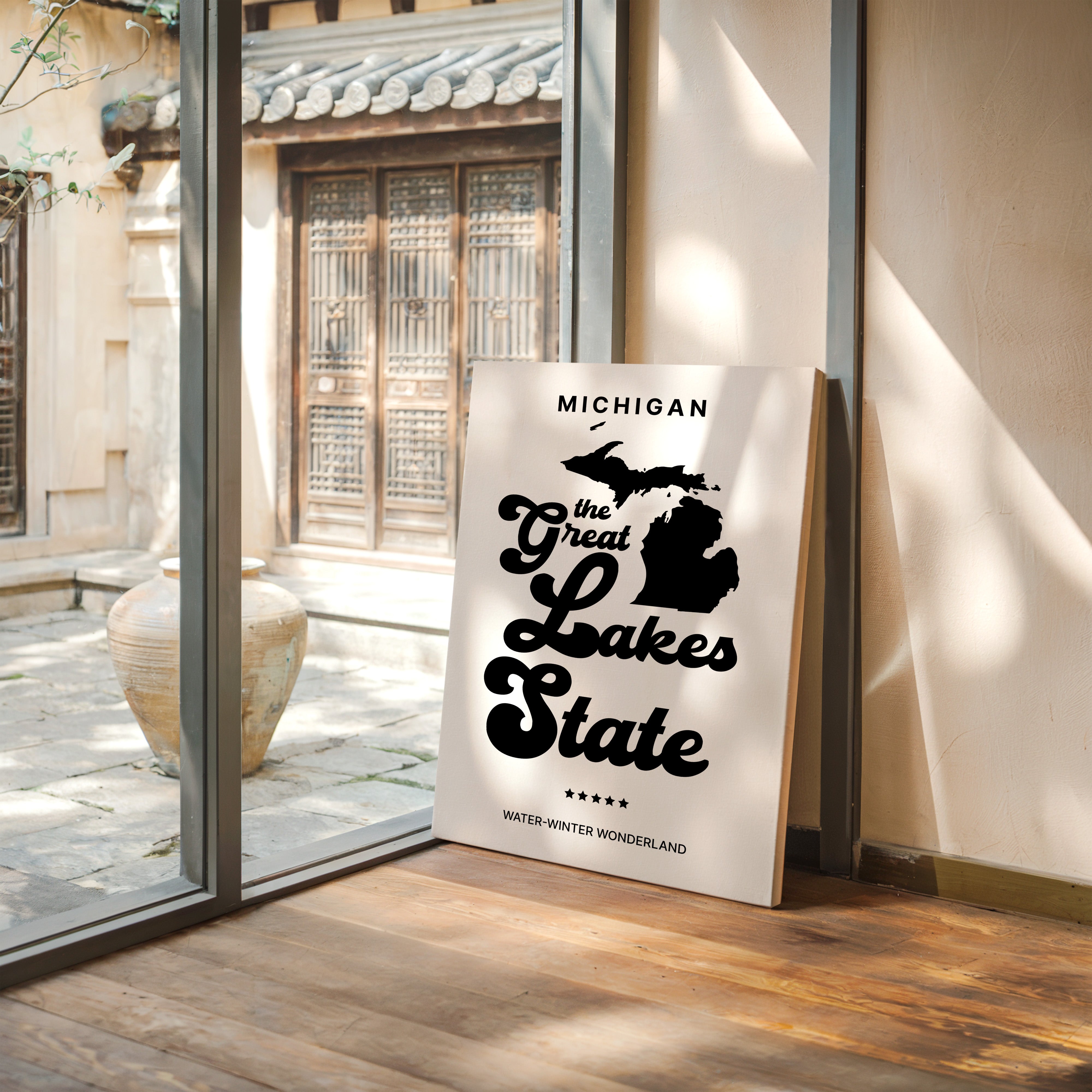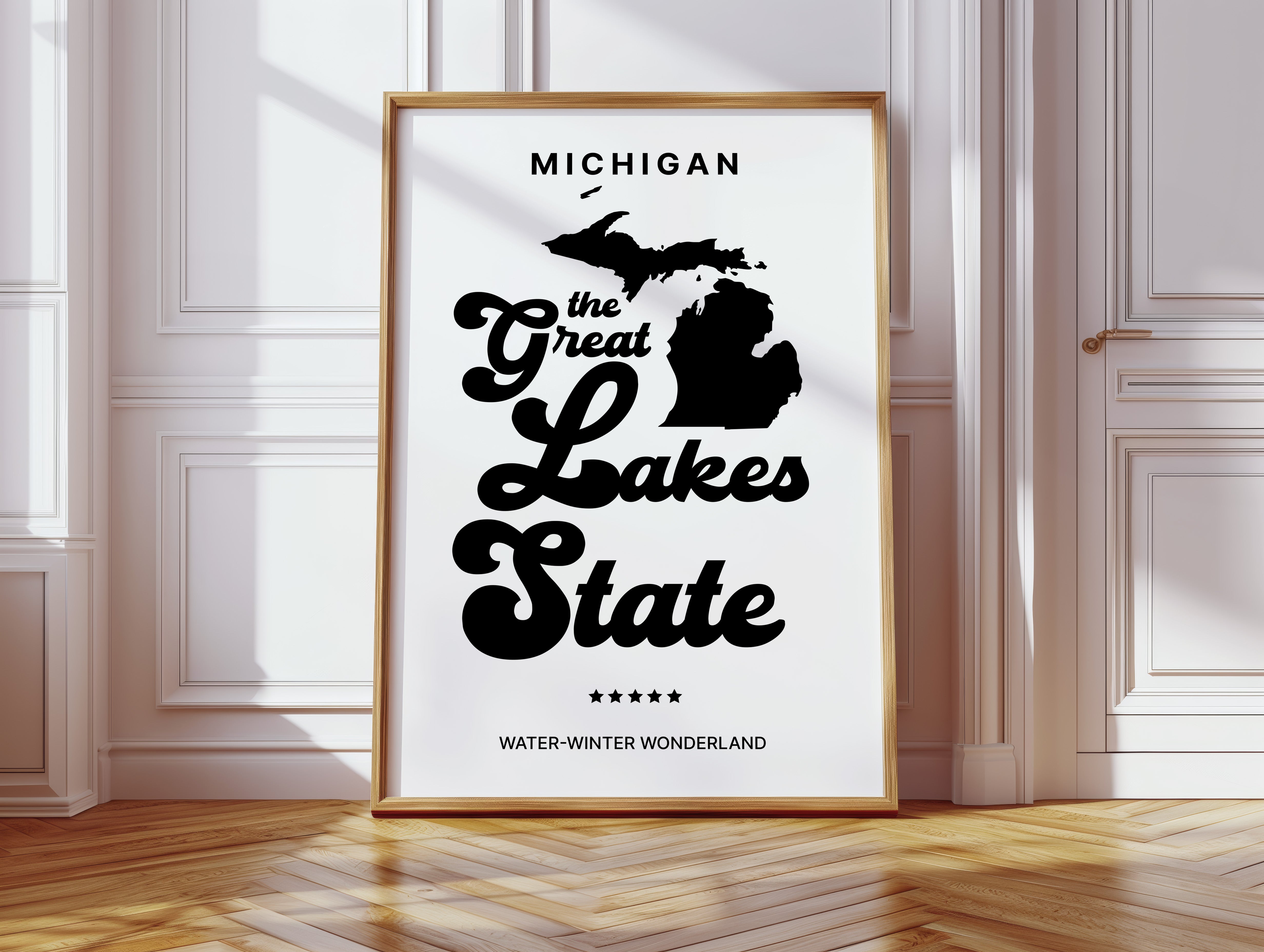 Bold typography dances with the iconic silhouette of Michigan, creating a powerful statement of state pride and natural beauty. This contemporary typographic design captures the essence of the Great Lakes State with its striking black and white contrast. The piece speaks to the majesty of freshwater shores and the spirit of Midwestern charm, where every curve of the coastline tells tales of maritime heritage. The bold, retro-inspired lettering flows like waves against the clean negative space, embodying both modern design sensibilities and timeless regional character. Perfect for adding a sophisticated geographical accent to home offices, lake houses, or any space celebrating local identity.