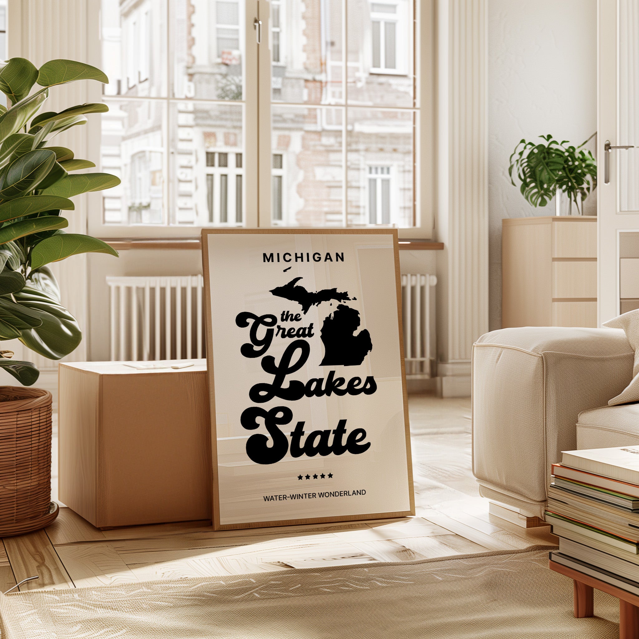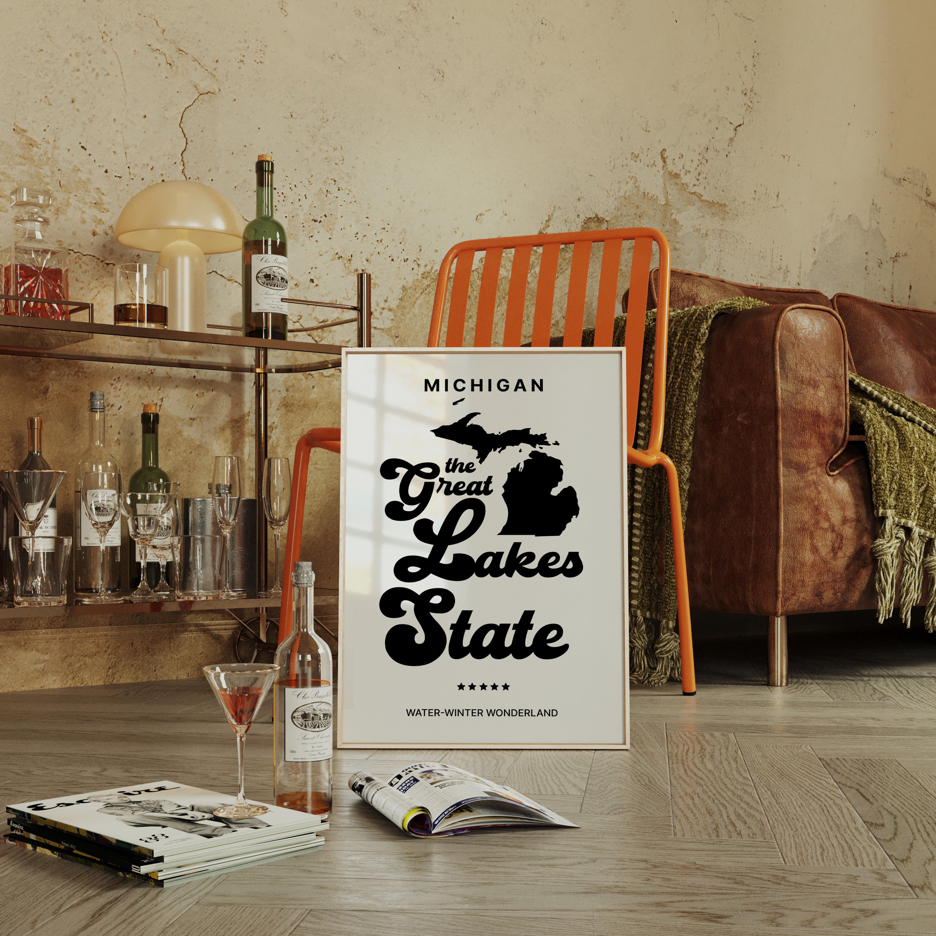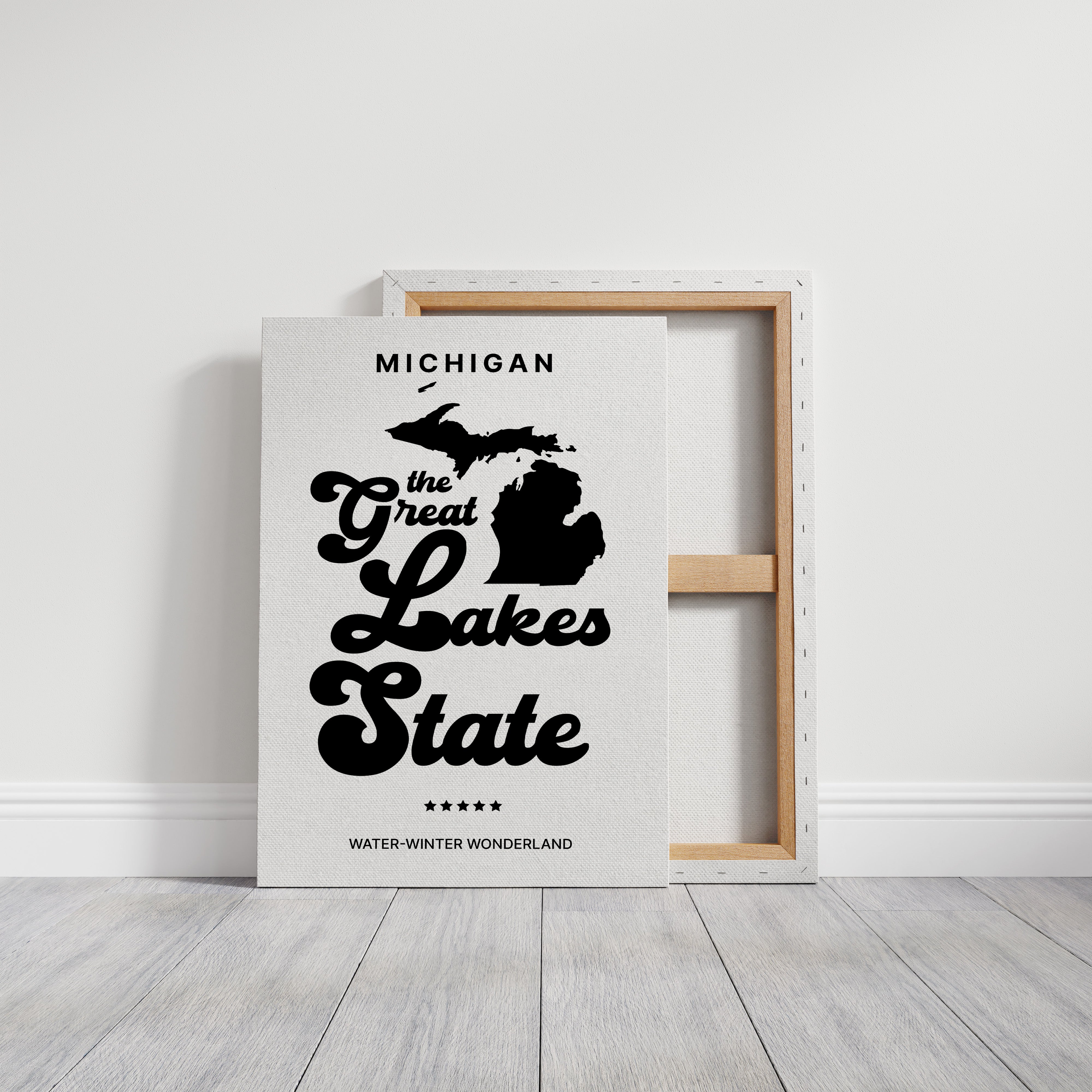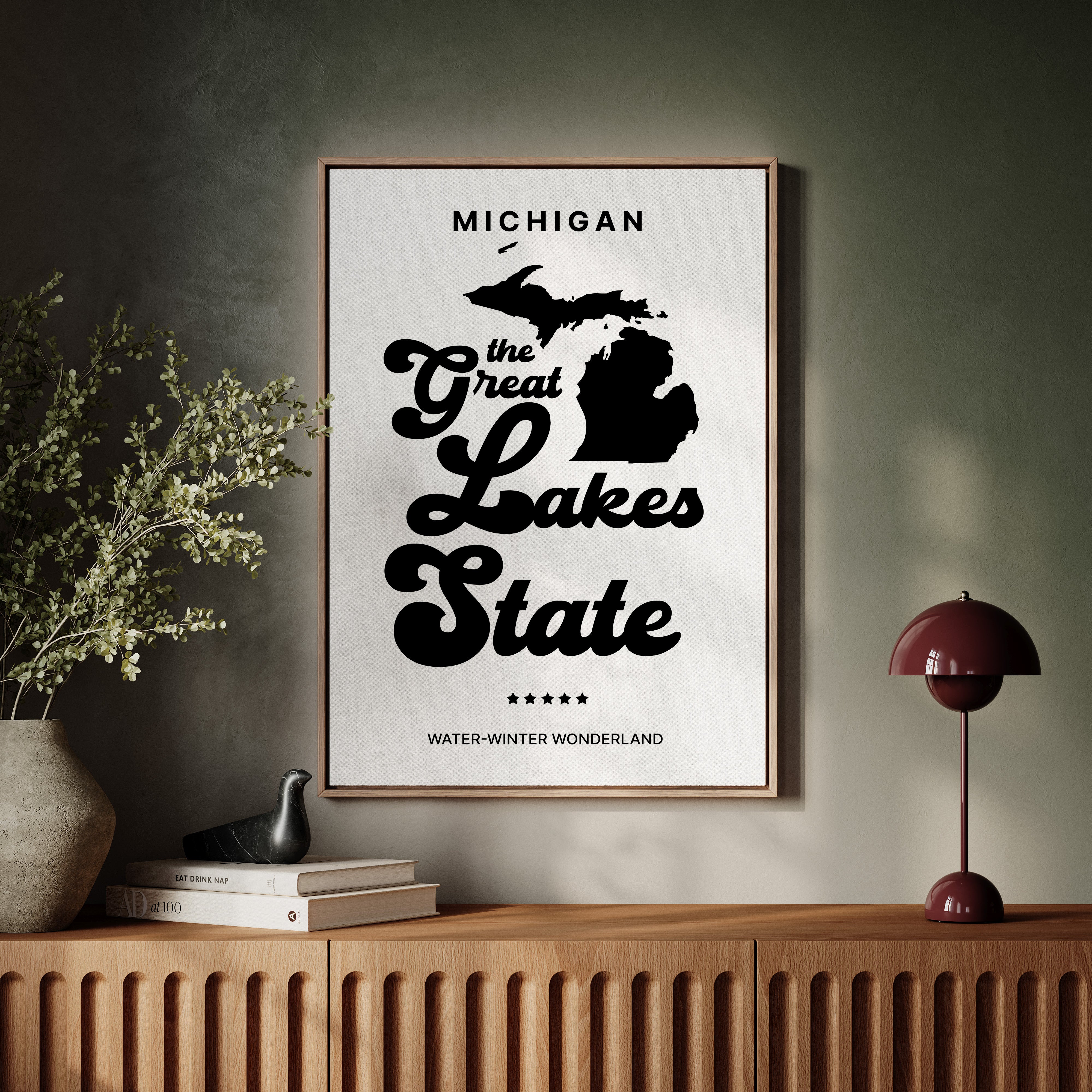 Bold typography dances with the iconic silhouette of Michigan, creating a powerful statement of state pride and natural beauty. This contemporary typographic design captures the essence of the Great Lakes State with its striking black and white contrast. The piece speaks to the majesty of freshwater shores and the spirit of Midwestern charm, where every curve of the coastline tells tales of maritime heritage. The bold, retro-inspired lettering flows like waves against the clean negative space, embodying both modern design sensibilities and timeless regional character. Perfect for adding a sophisticated geographical accent to home offices, lake houses, or any space celebrating local identity.