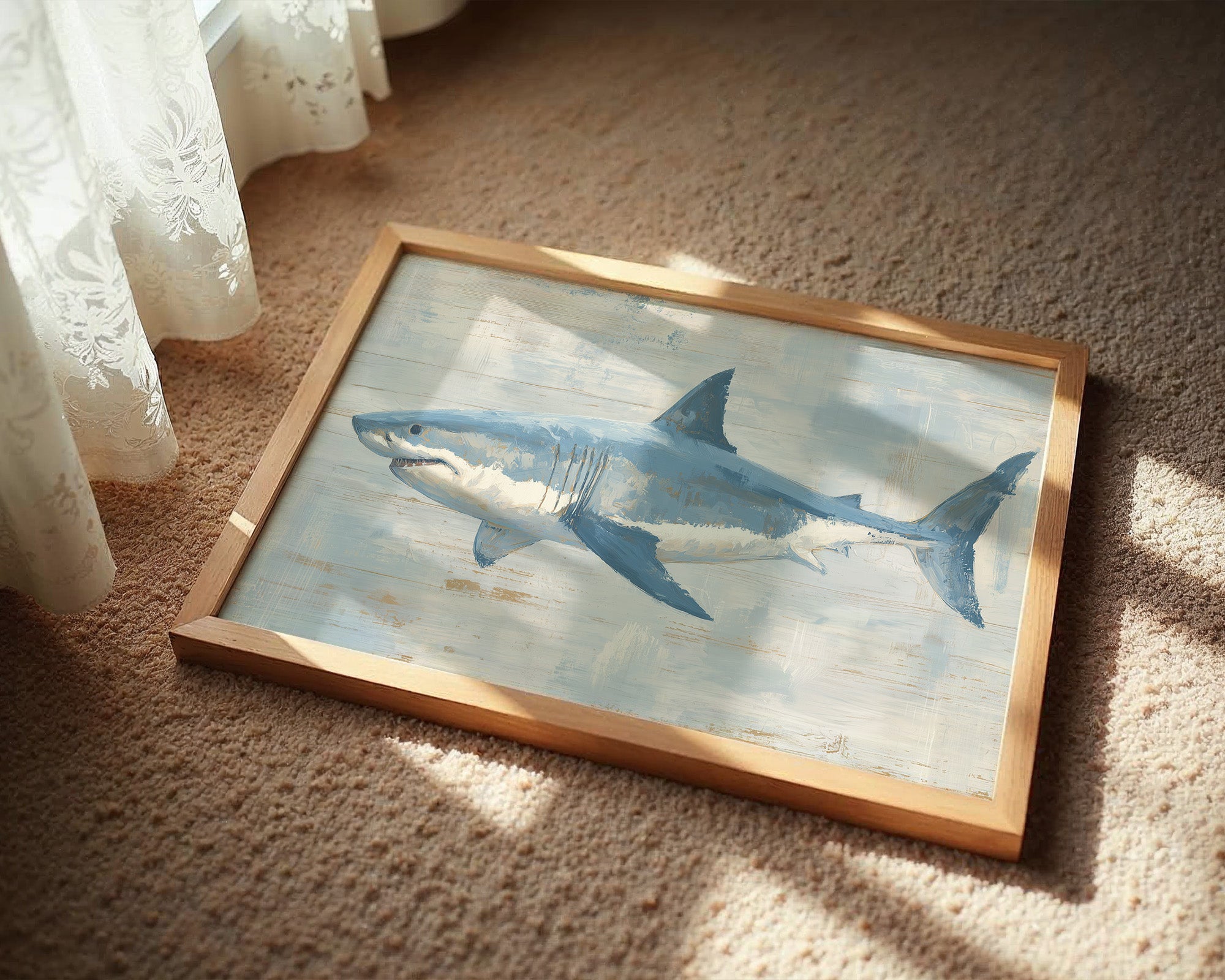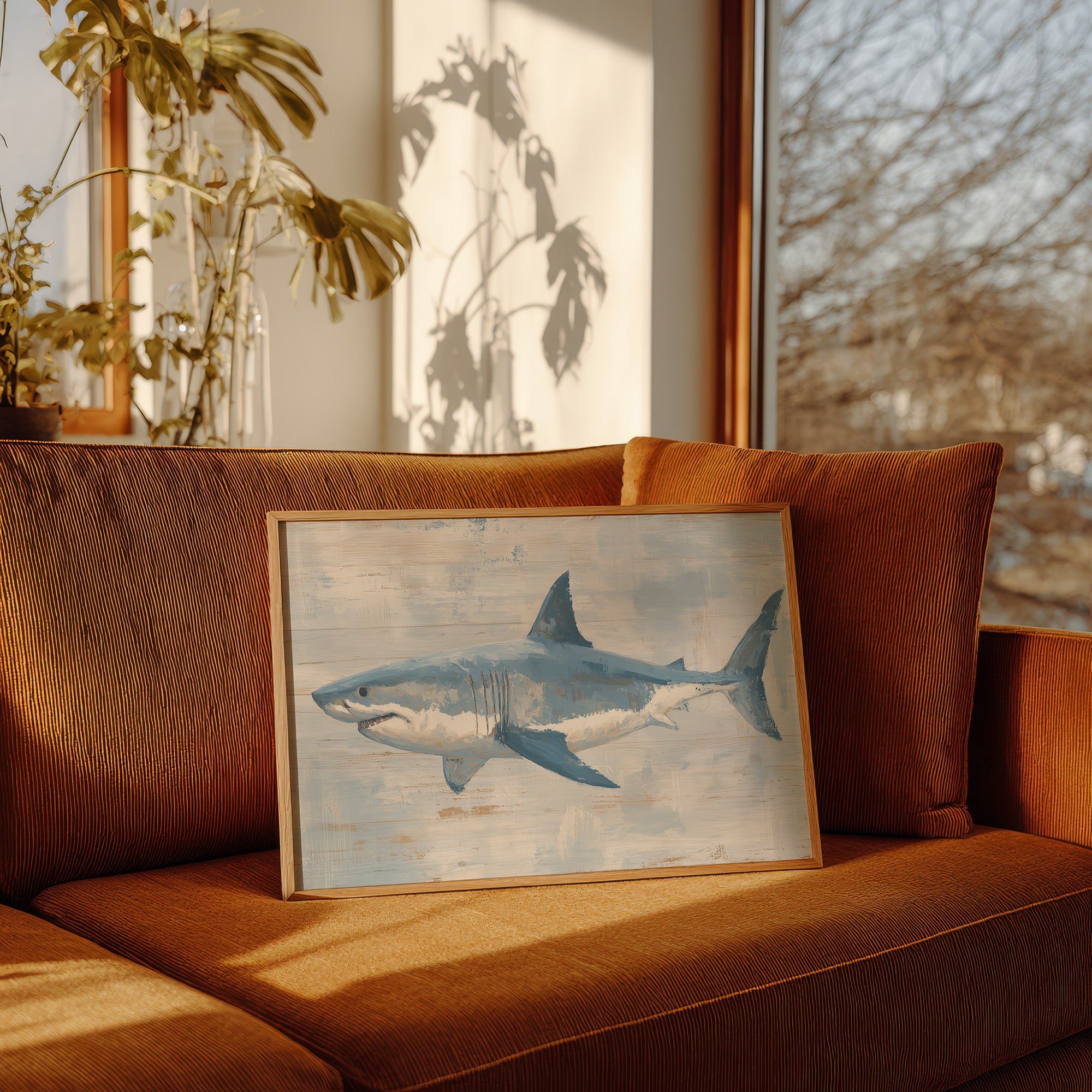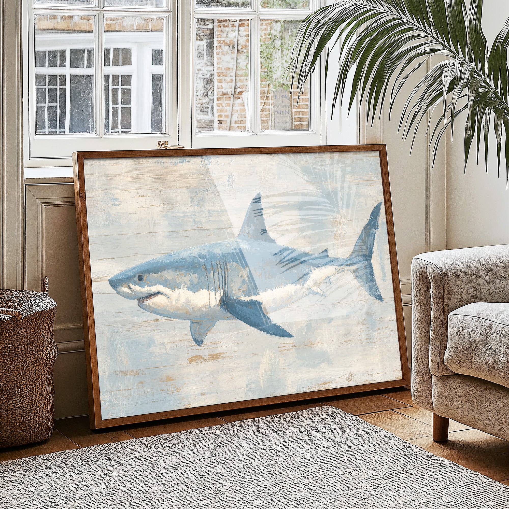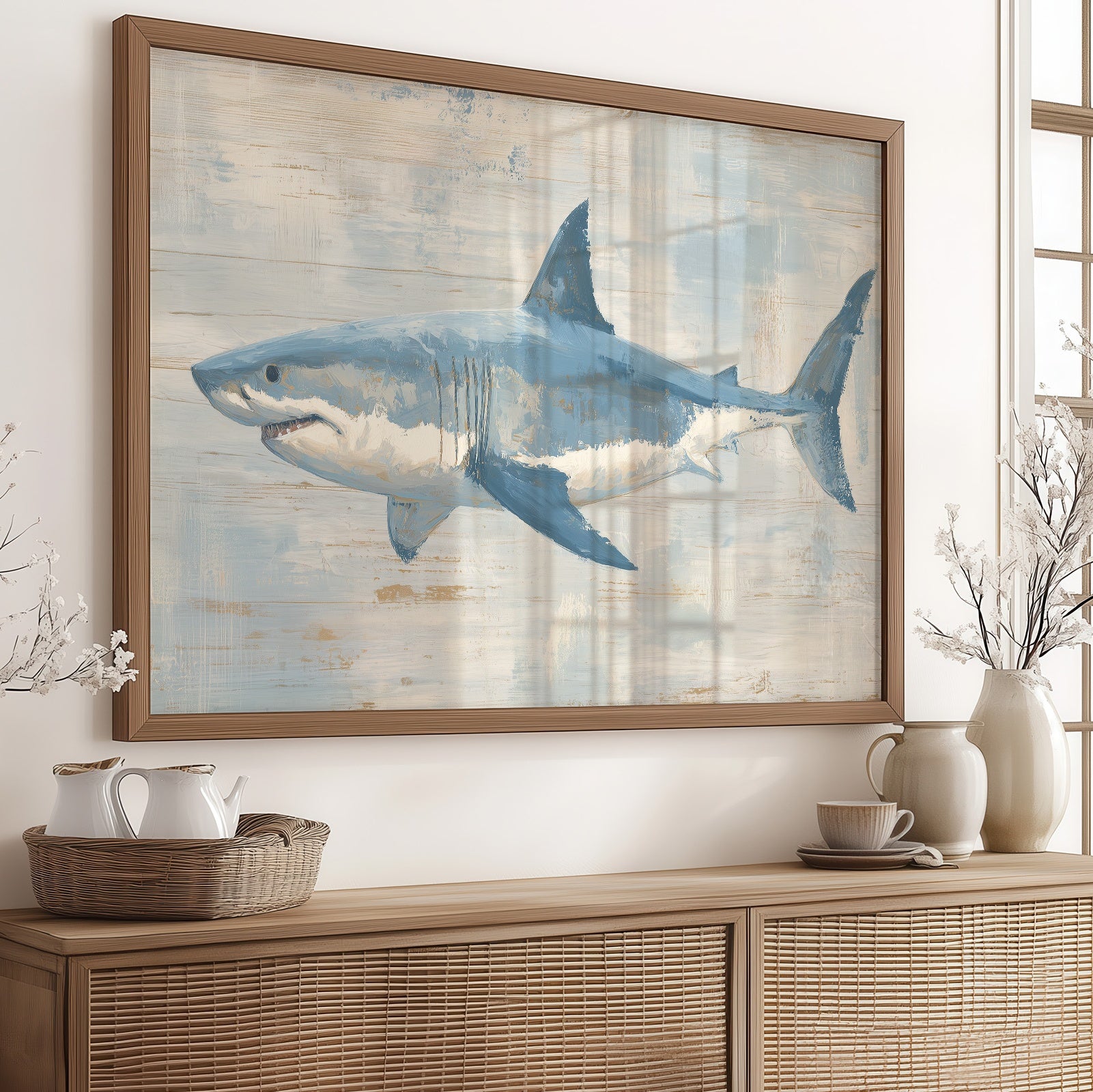 A powerful great white shark glides through misty blue waters, commanding attention with its sleek form and primal grace. The brushstrokes create a weathered, almost nostalgic texture, with subtle cream and azure tones blending into a dreamy seascape backdrop. This striking marine portrait balances raw power with artistic restraint, creating a sophisticated statement piece. This artwork brings coastal elegance to any contemporary space, perfect for a light-filled living area where its calming blue palette can anchor a neutral room design.