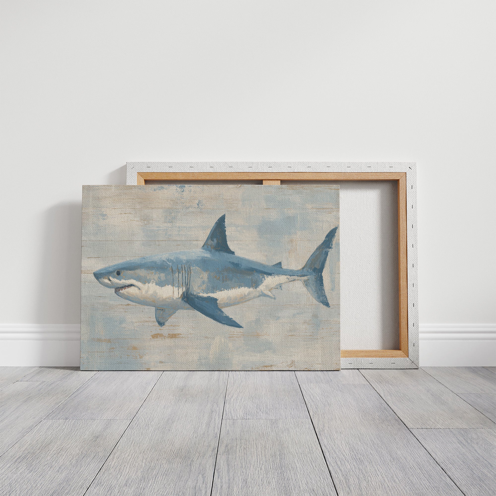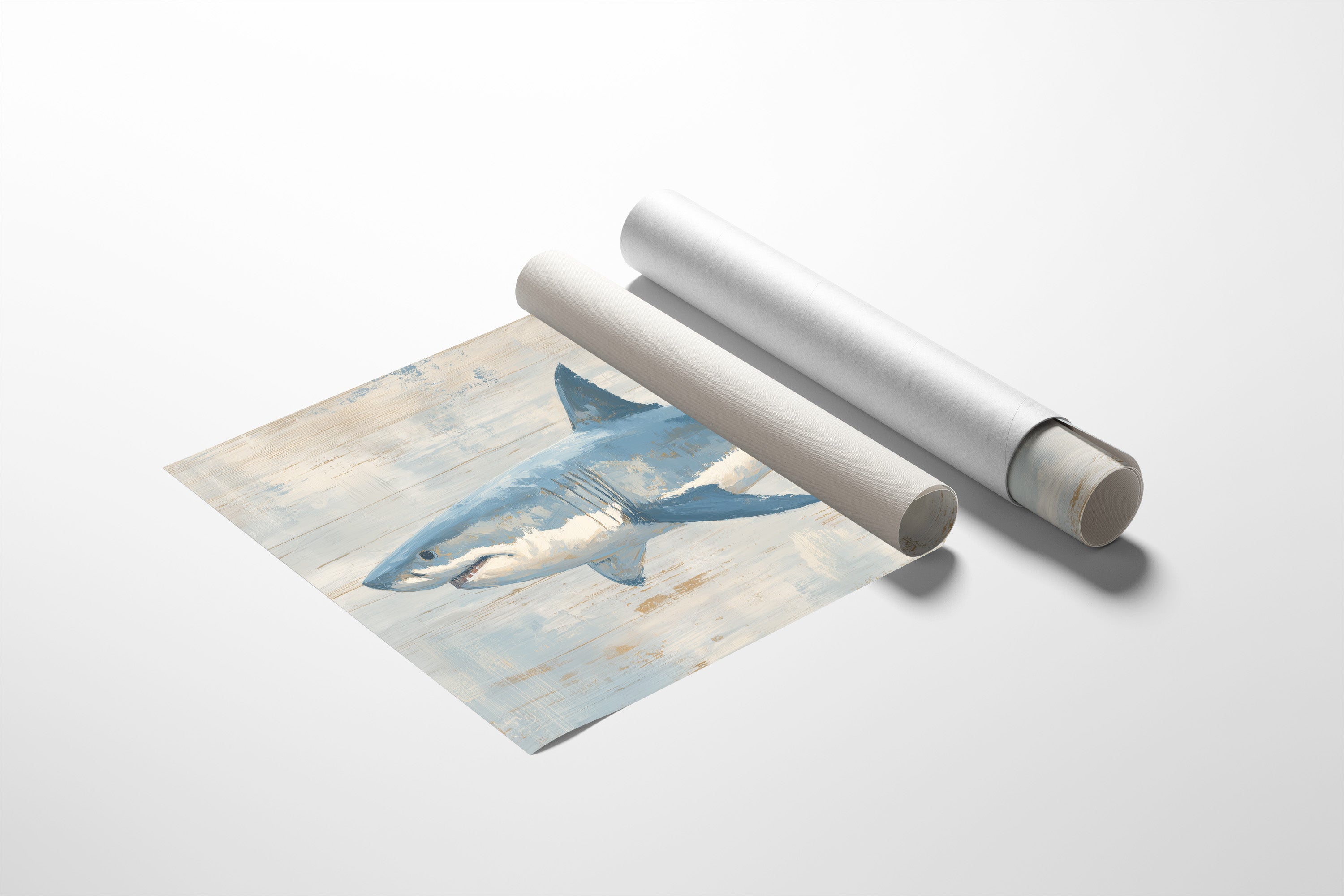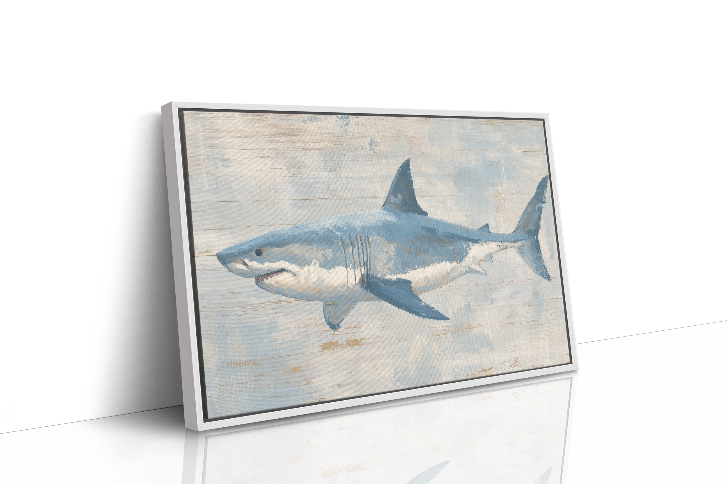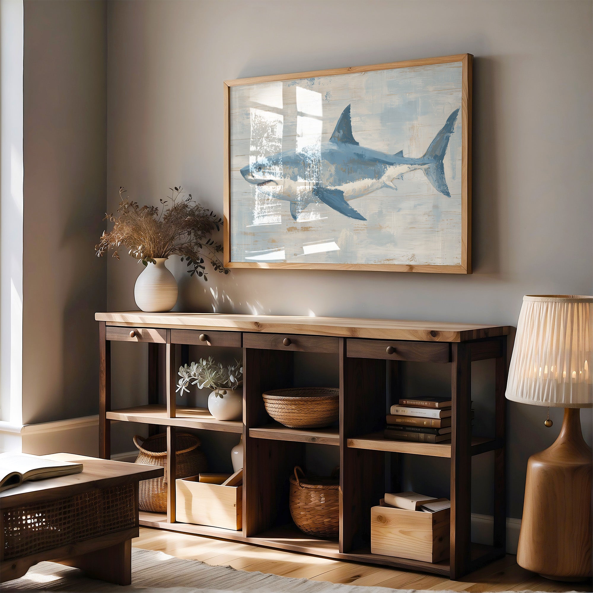 A powerful great white shark glides through misty blue waters, commanding attention with its sleek form and primal grace. The brushstrokes create a weathered, almost nostalgic texture, with subtle cream and azure tones blending into a dreamy seascape backdrop. This striking marine portrait balances raw power with artistic restraint, creating a sophisticated statement piece. This artwork brings coastal elegance to any contemporary space, perfect for a light-filled living area where its calming blue palette can anchor a neutral room design.