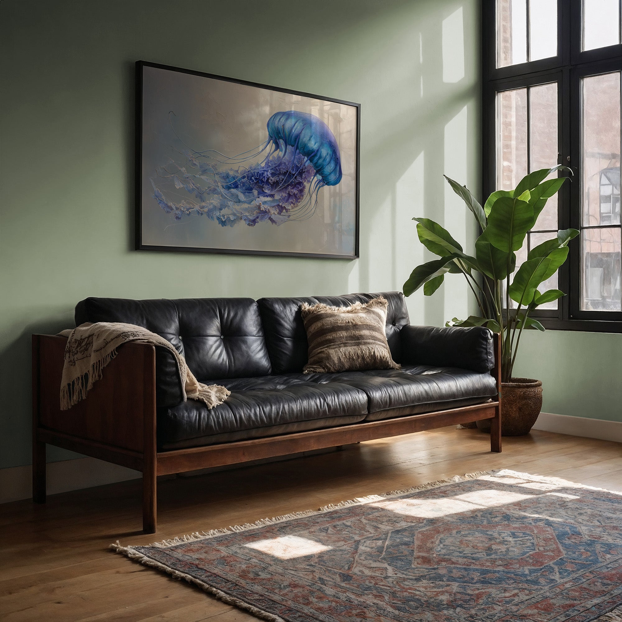 Your artwork should take up 60-75% of wall space above furniture. For standard sofas, choose 24"x36" or larger. When in doubt, go slightly bigger.