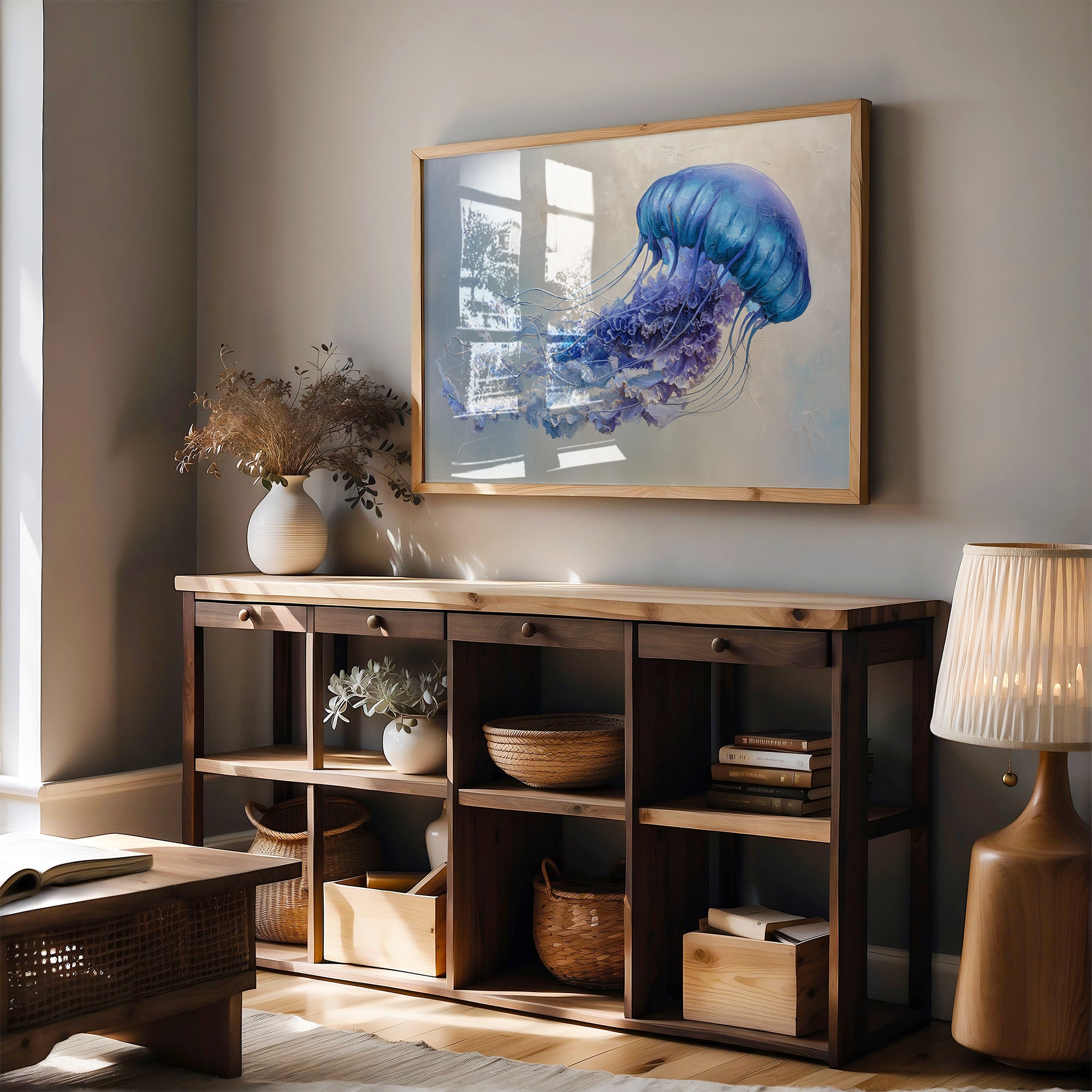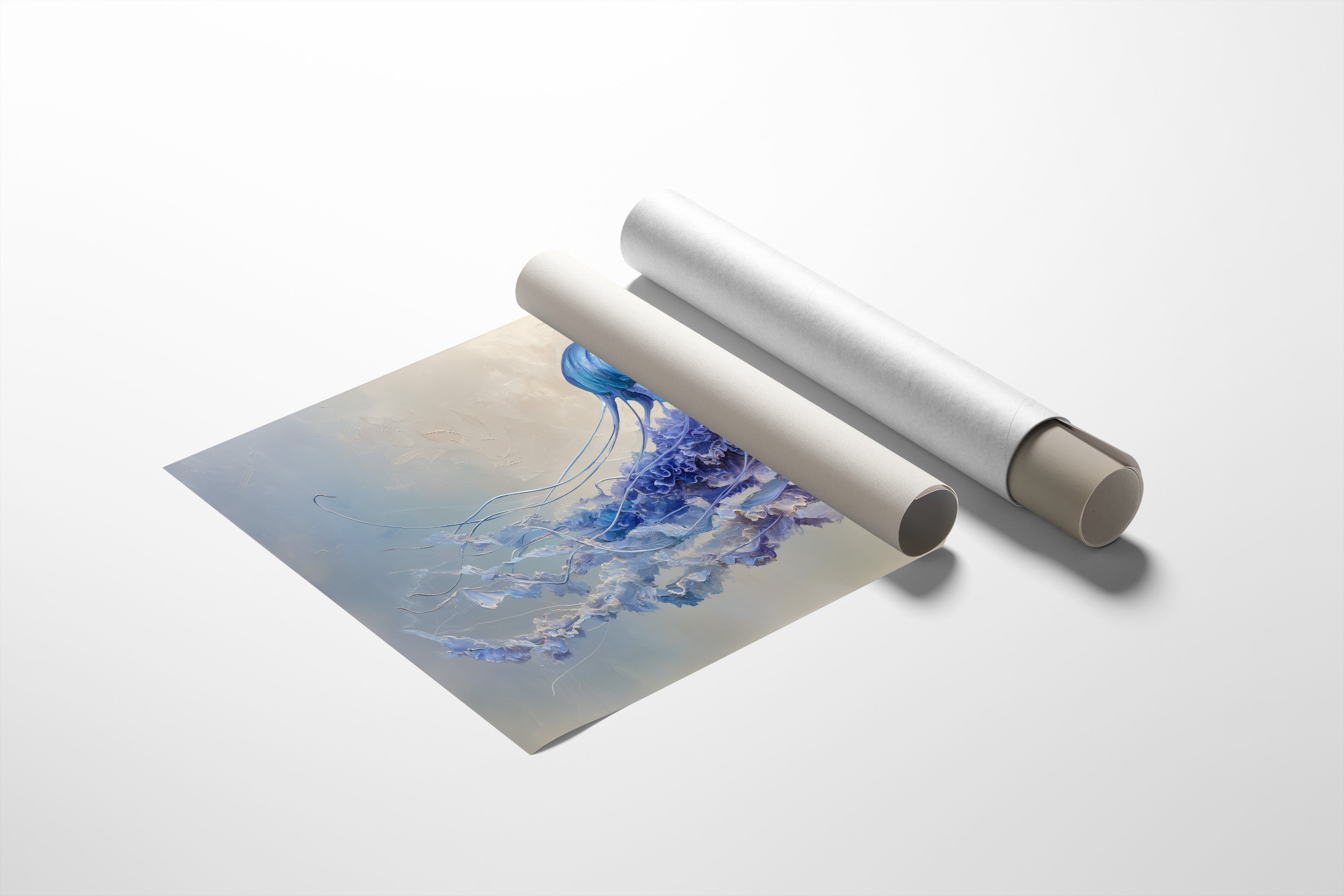 A luminous jellyfish drifts through misty waters, its translucent blue dome catching light like an underwater sapphire. Delicate tendrils trail behind in graceful ribbons of violet and periwinkle, creating an ethereal dance against the soft, dreamlike background. The painting captures that perfect balance between strength and fragility, the creature's form both commanding and delicate in its aquatic choreography. This serene marine portrait brings tranquility to contemporary spaces, offering a moment of underwater meditation for living rooms or bedrooms seeking a touch of oceanic calm.