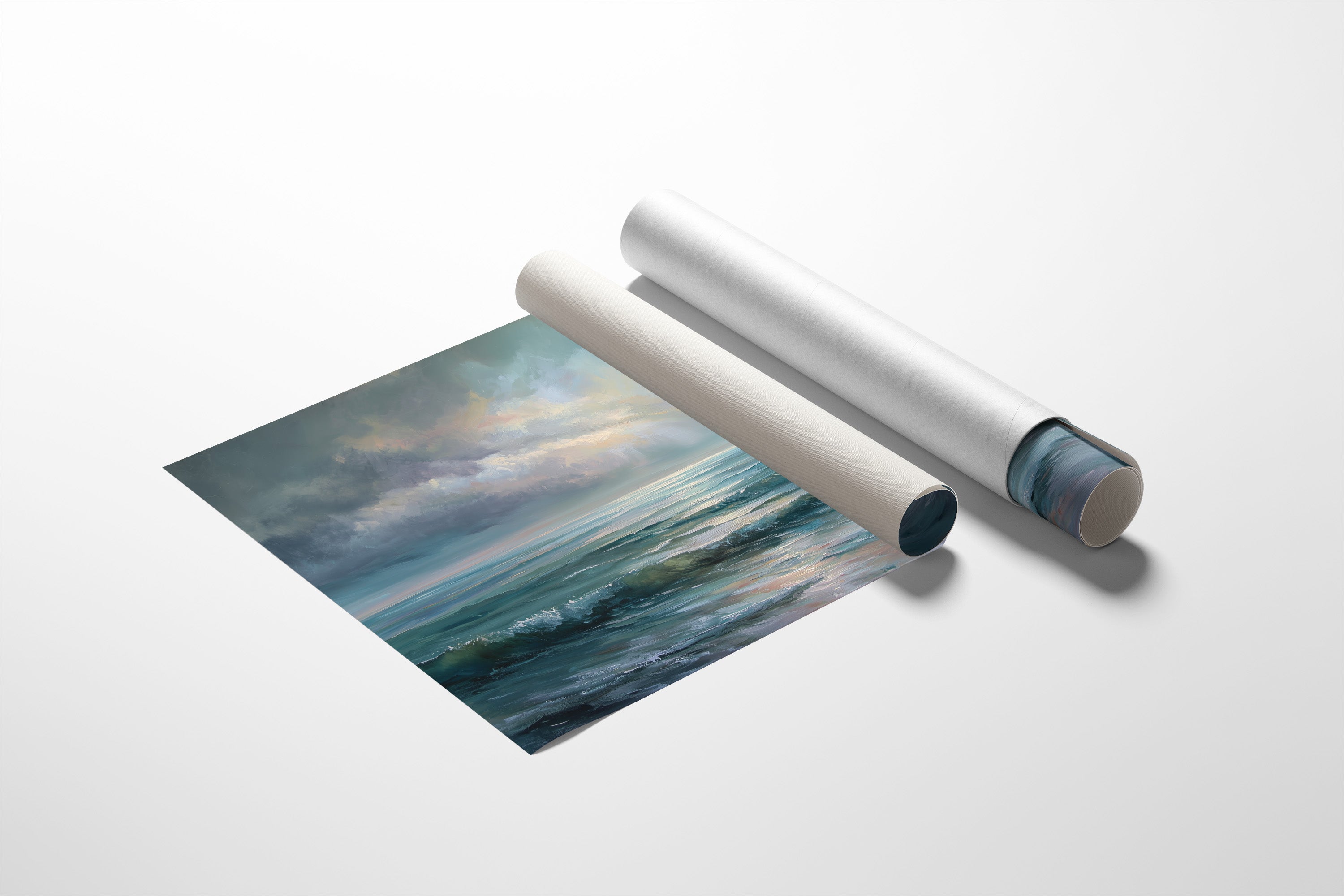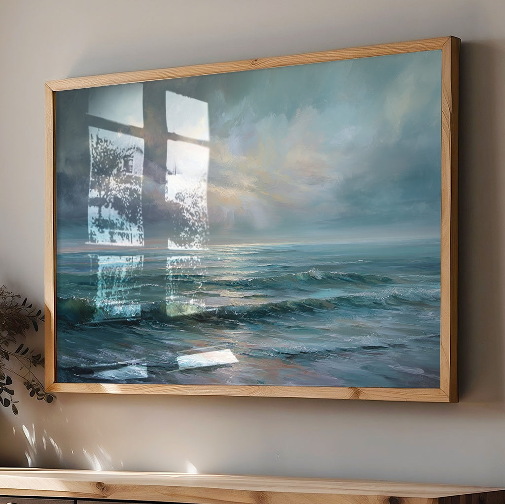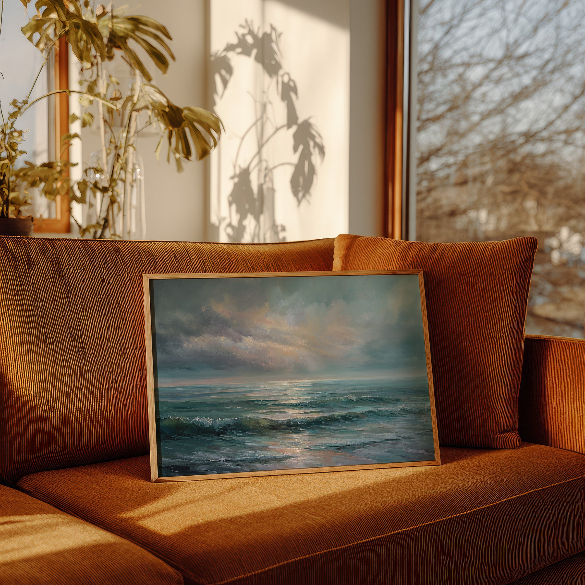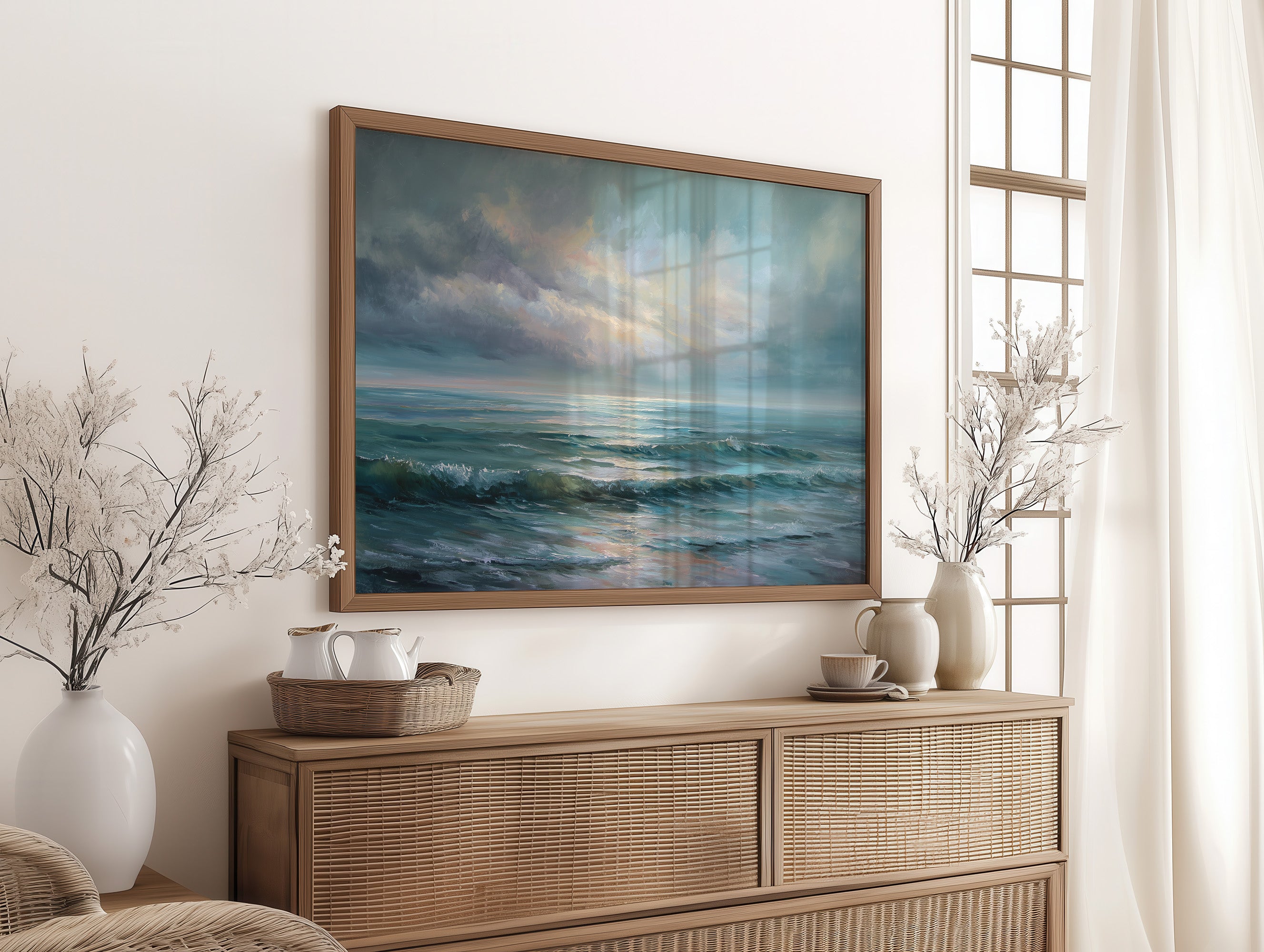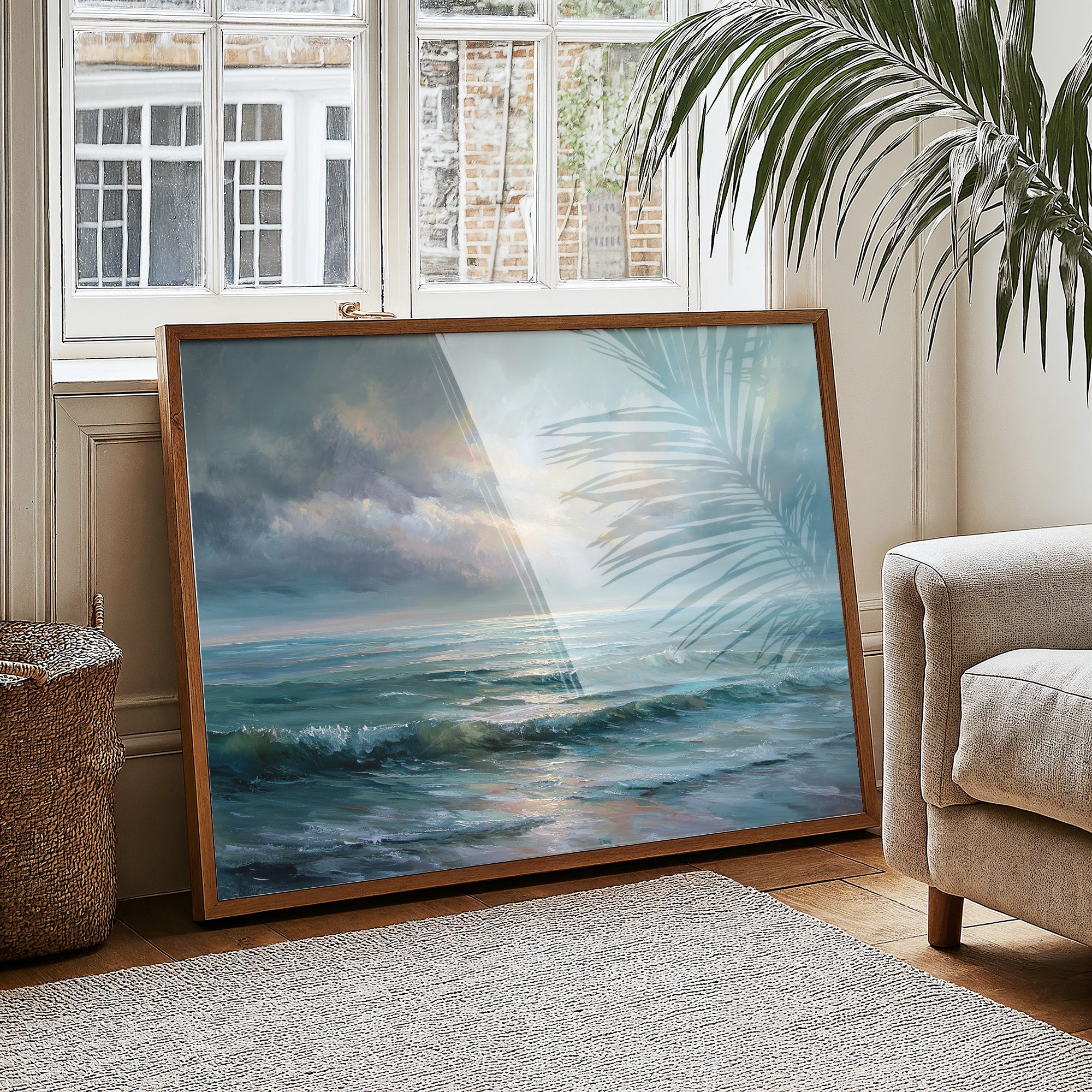 Light breaks through a gathering storm, casting gentle illumination across restless waves. The sea undulates in shades of teal and azure, while the sky above tells a story of tension and release through billowing clouds tinged with soft coral and lavender hues. The painting captures that fleeting moment when nature holds both turbulence and tranquility, the surface of the water reflecting the drama playing out in the heavens above. This piece would transform a bedroom or living space into a meditative retreat, bringing the soothing rhythm of the ocean and the expansive feeling of standing at the shore into your everyday environment.