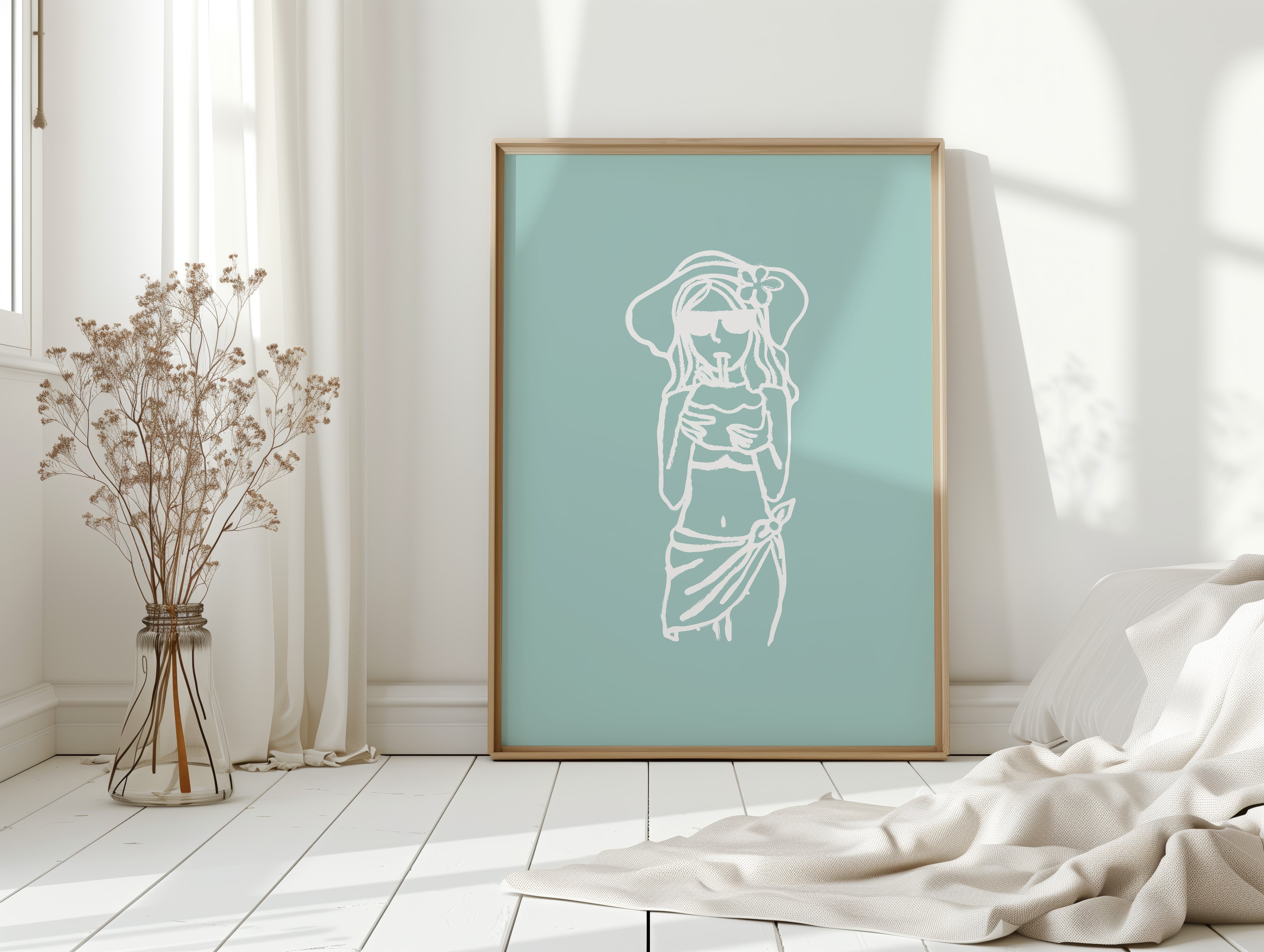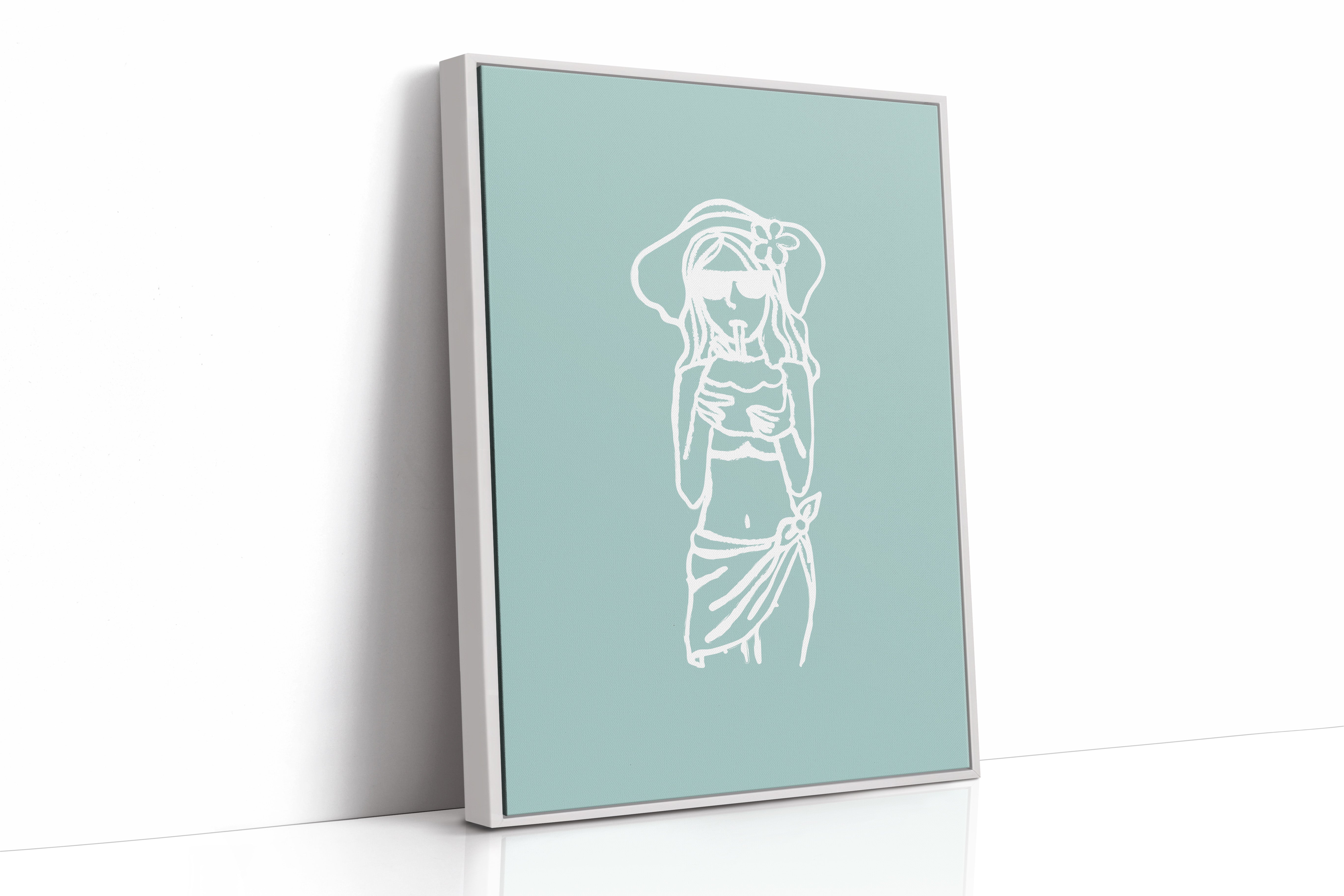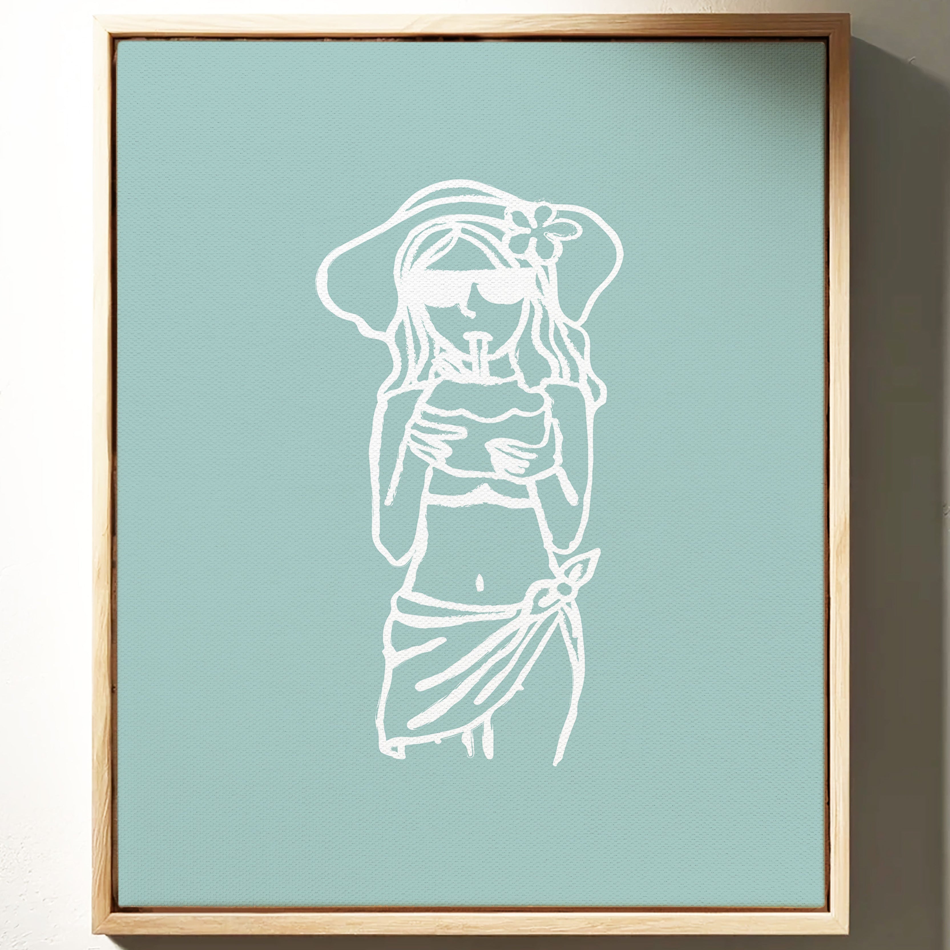 A gentle figure emerges in minimalist white strokes against a serene seafoam background, capturing the essence of carefree coastal living. This piece belongs to our Contemporary collection, where simple lines tell profound stories. The flowing sarong and sun hat create a graceful silhouette, while delicate floral accents add a touch of whimsy to the composition. The mint-toned backdrop evokes memories of lazy beach days and salt-kissed afternoons. Perfect for bringing a breath of fresh air to a bedroom or bathroom space, this piece creates an instant coastal retreat atmosphere. The clean lines and peaceful palette invite moments of tranquility into any room.
