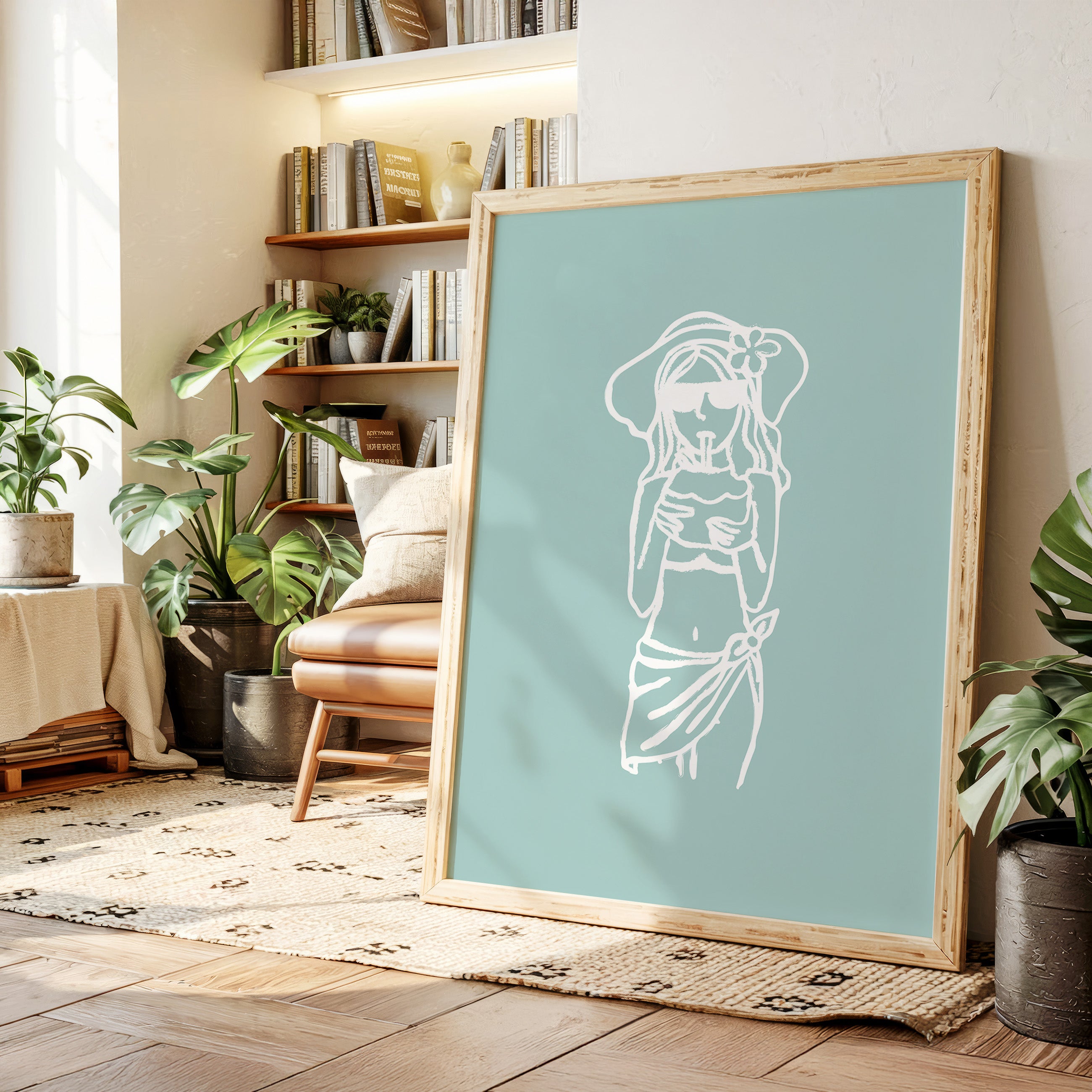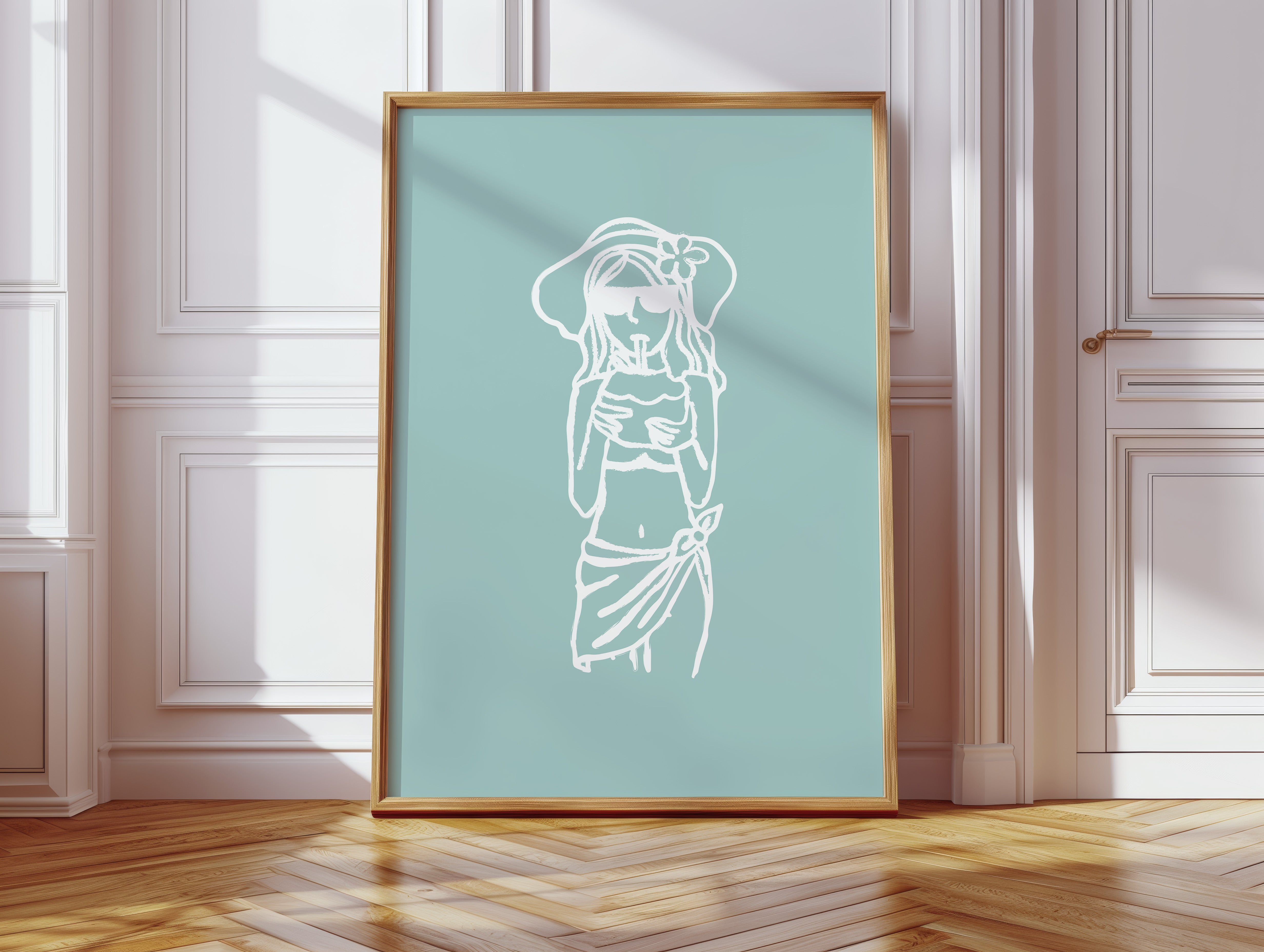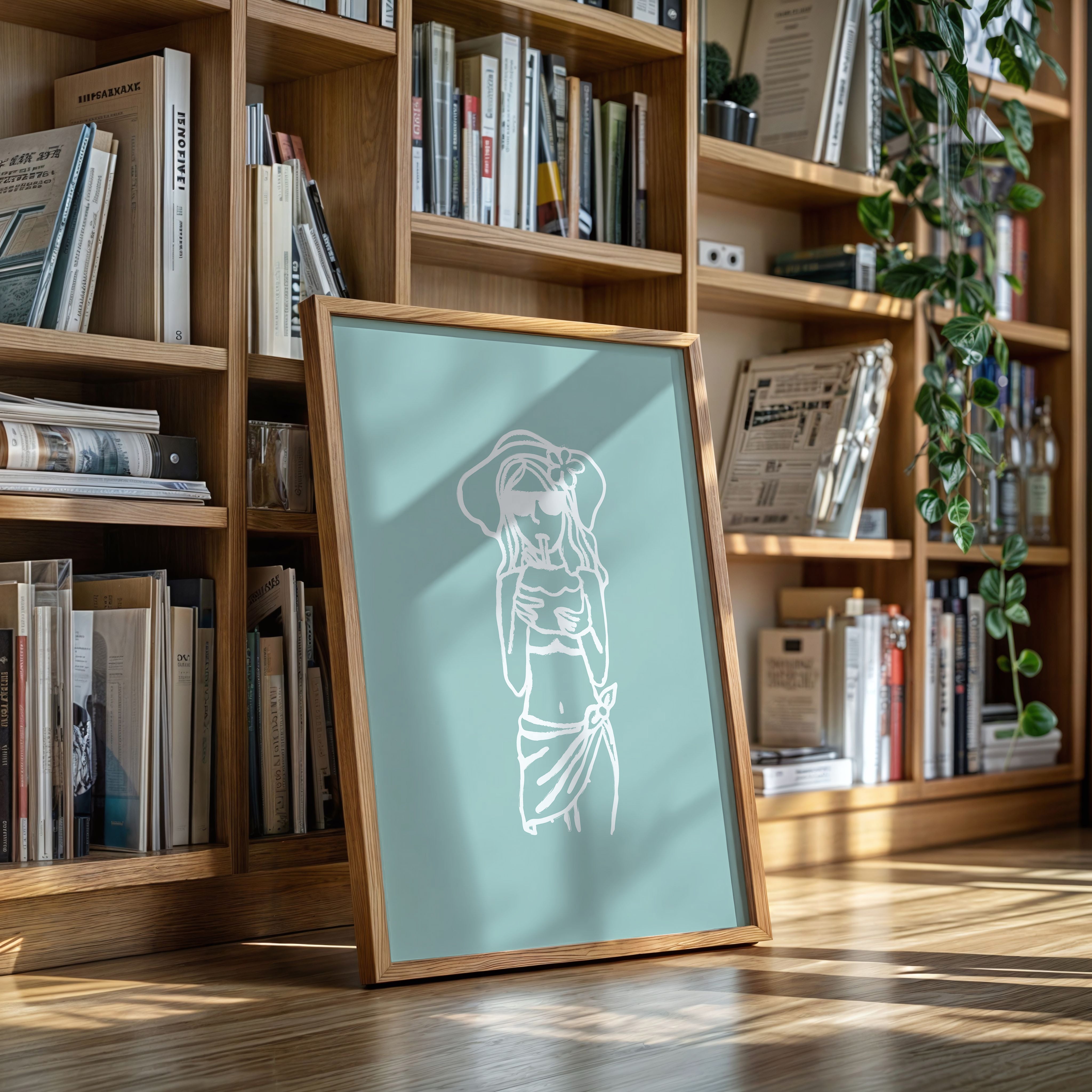A gentle figure emerges in minimalist white strokes against a serene seafoam background, capturing the essence of carefree coastal living. This piece belongs to our Contemporary collection, where simple lines tell profound stories. The flowing sarong and sun hat create a graceful silhouette, while delicate floral accents add a touch of whimsy to the composition. The mint-toned backdrop evokes memories of lazy beach days and salt-kissed afternoons. Perfect for bringing a breath of fresh air to a bedroom or bathroom space, this piece creates an instant coastal retreat atmosphere. The clean lines and peaceful palette invite moments of tranquility into any room.