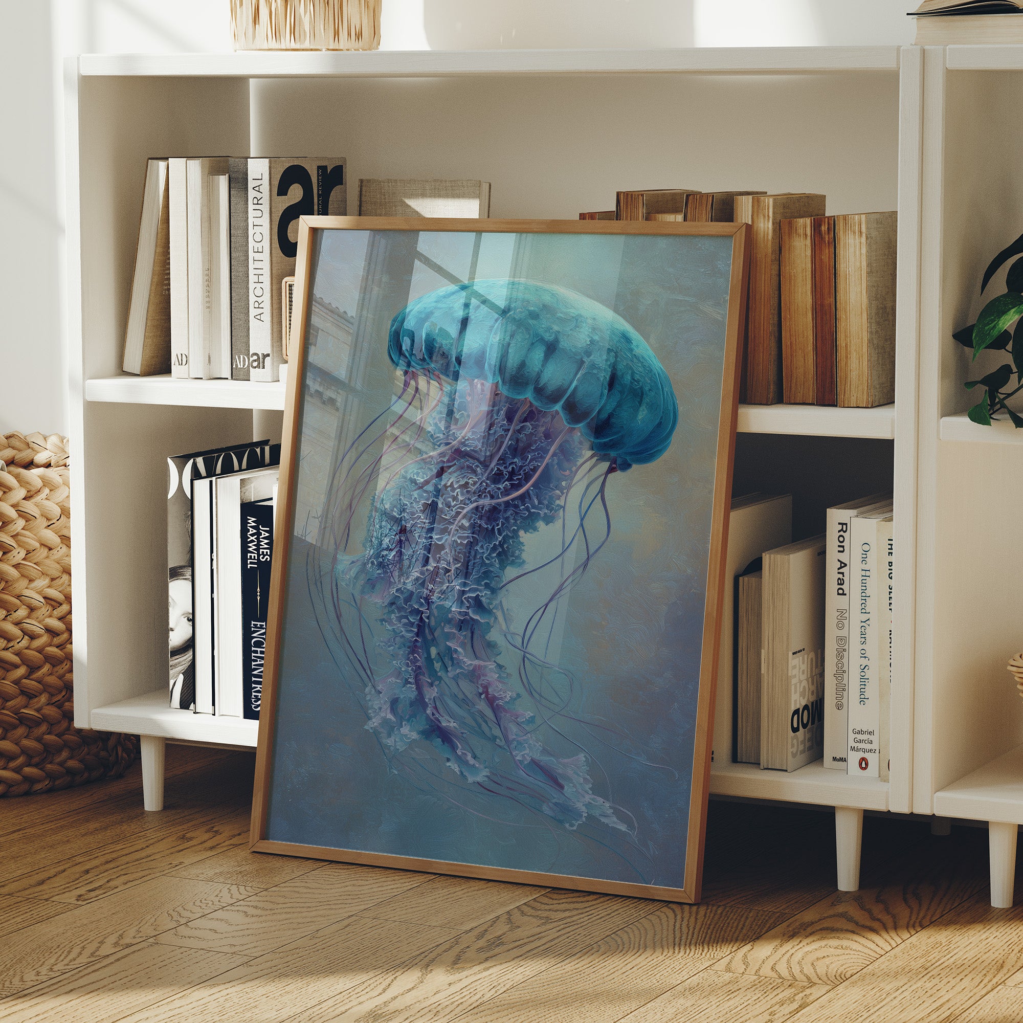 Sunlight filters through this ethereal portrait of marine elegance, capturing a moment of serene movement frozen in time. The jellyfish's translucent body glows with an otherworldly blend of turquoise and lavender hues, its delicate tendrils trailing like ribbons in an underwater ballet. The wooden frame enhances the organic beauty of this oceanic creature, creating a perfect balance between nature's artistry and contemporary design.
