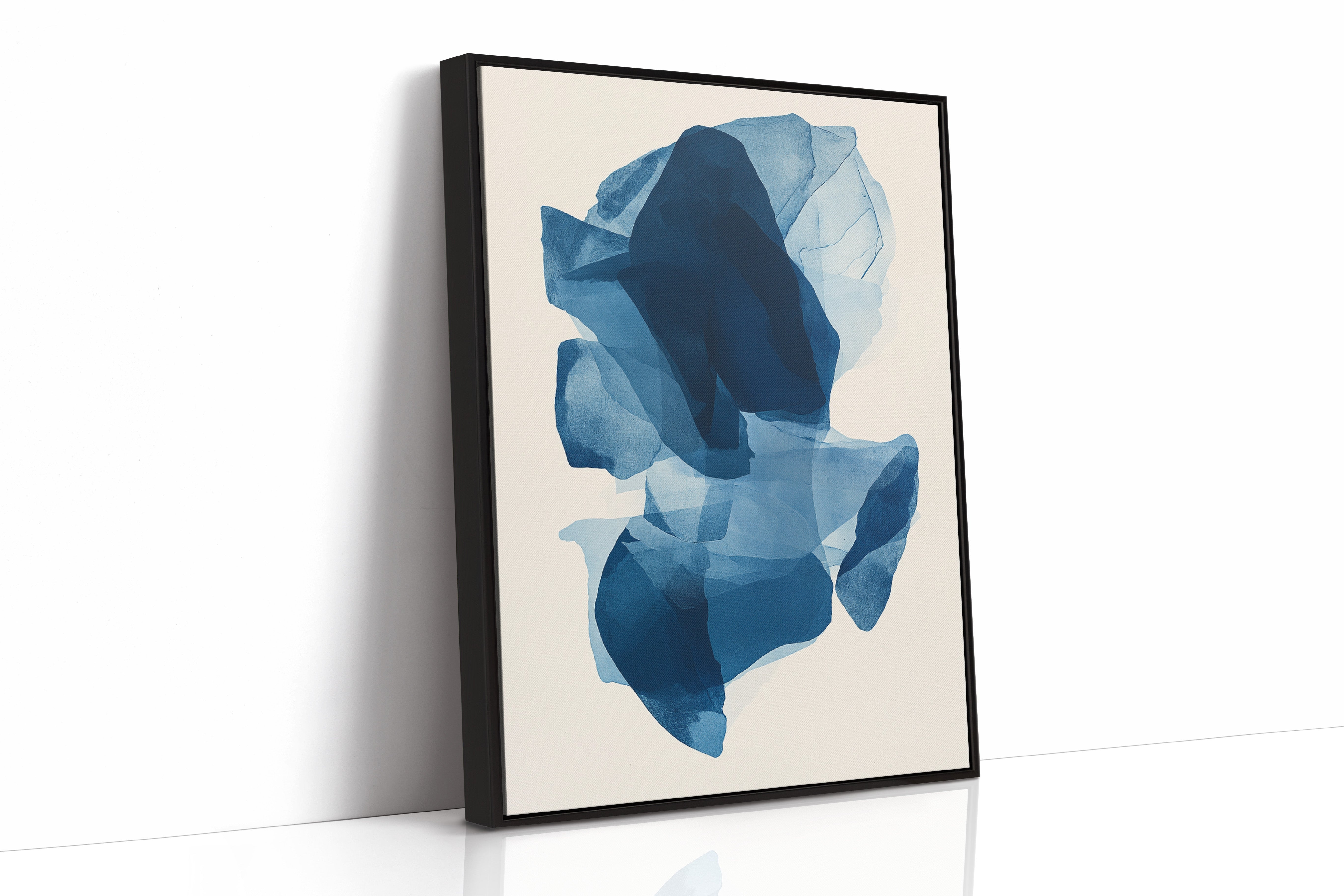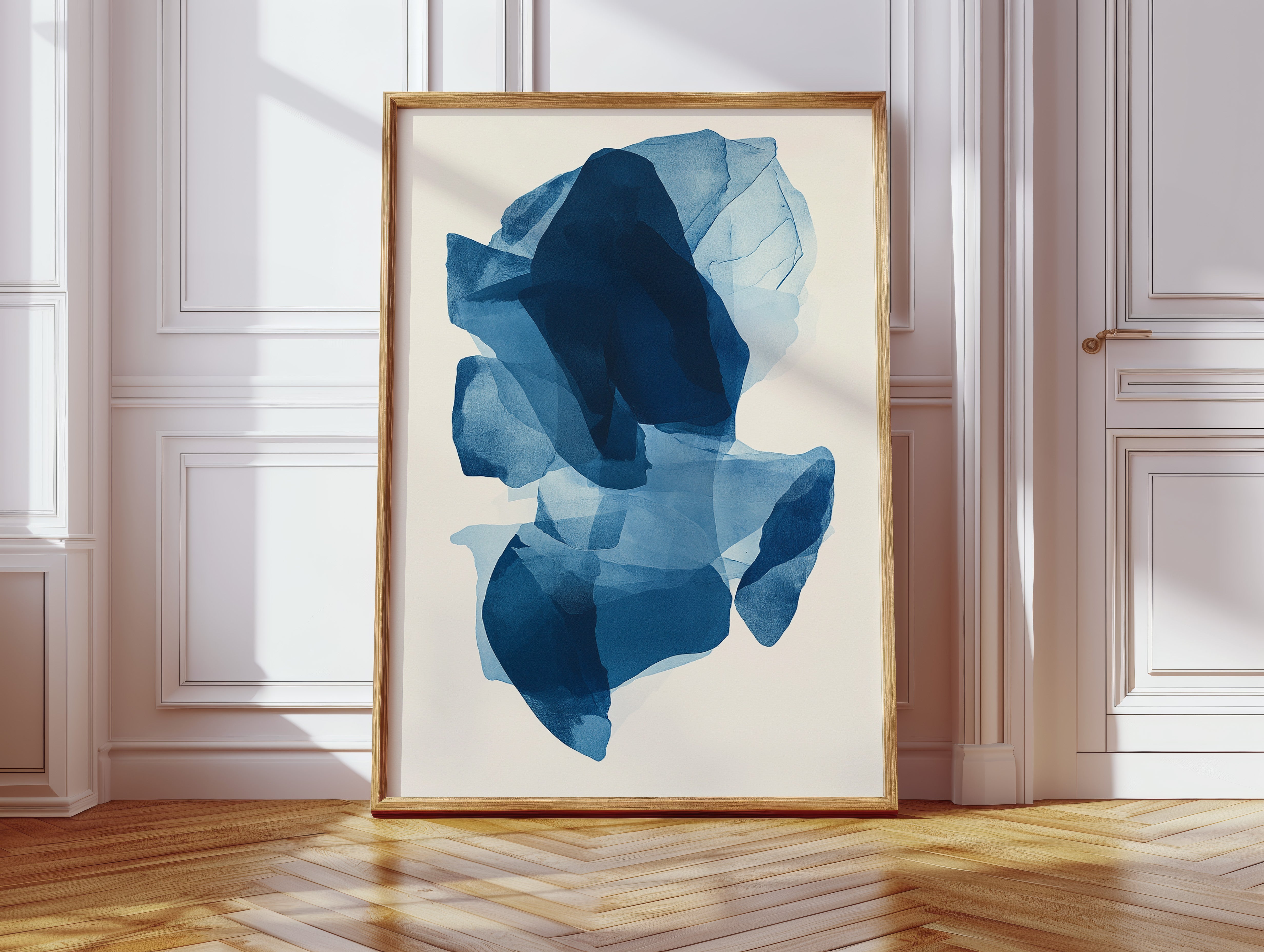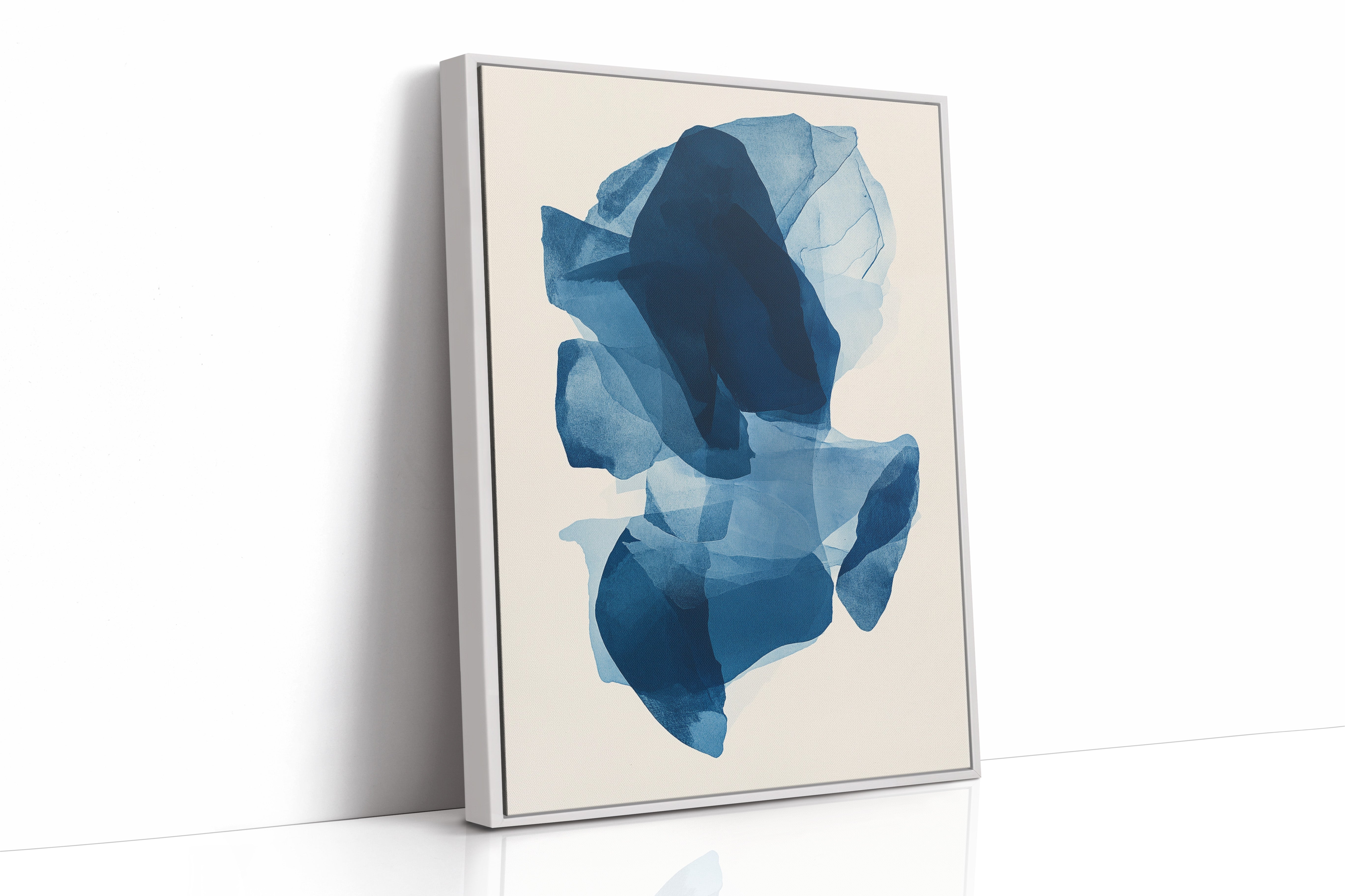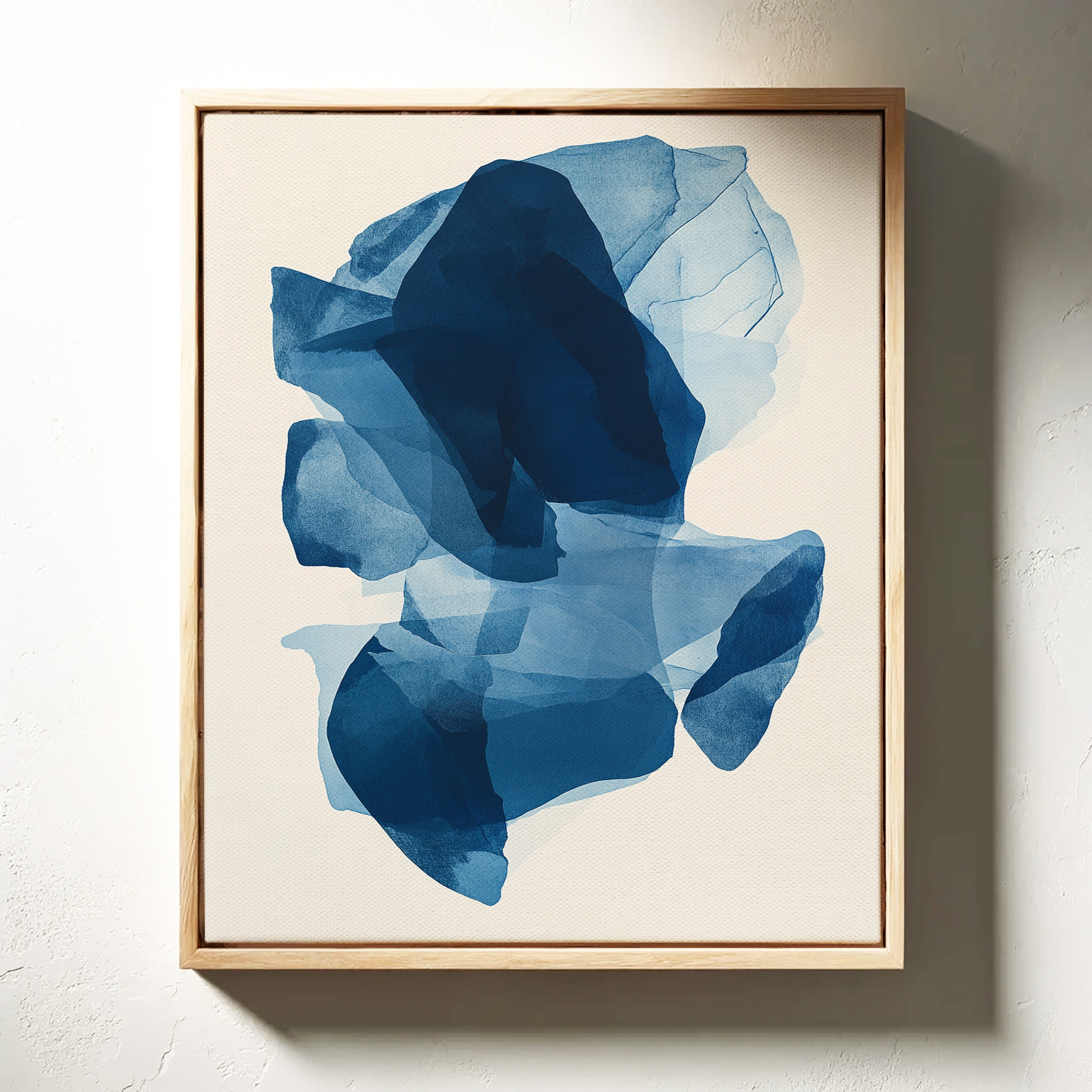 Like fragments of sea ice drifting in arctic waters, translucent layers of blue merge and separate in an ethereal dance. Deep navy shadows cascade through lighter azure veils, creating a sense of depth that pulls the eye into its cool, crystalline world. The organic shapes float weightlessly against the pristine background, their edges softly blending like watercolor bleeding across damp paper. Perfect for modern spaces seeking tranquility, this piece brings sophisticated serenity to master bedrooms or meditation areas where its fluid movement can inspire peaceful contemplation.