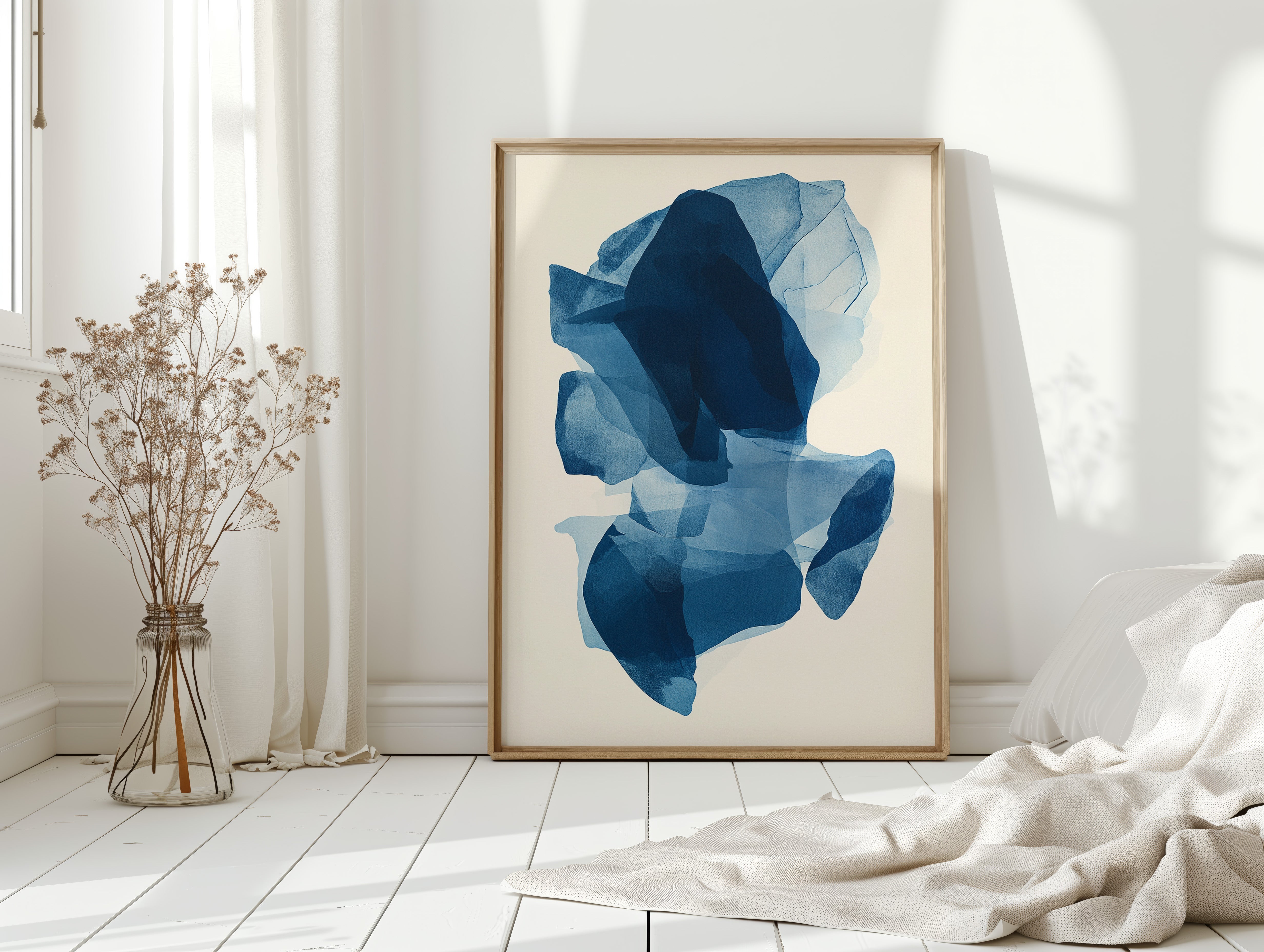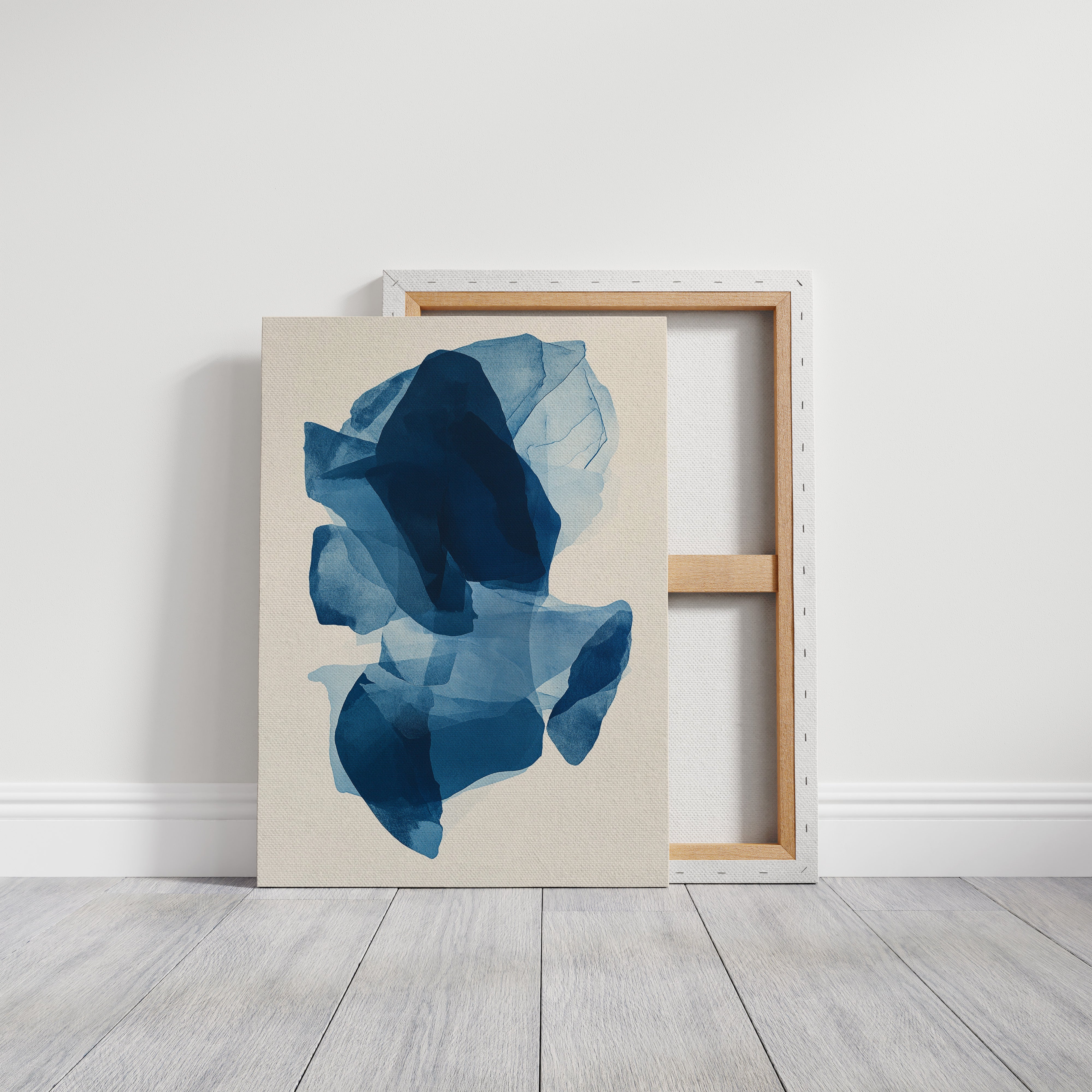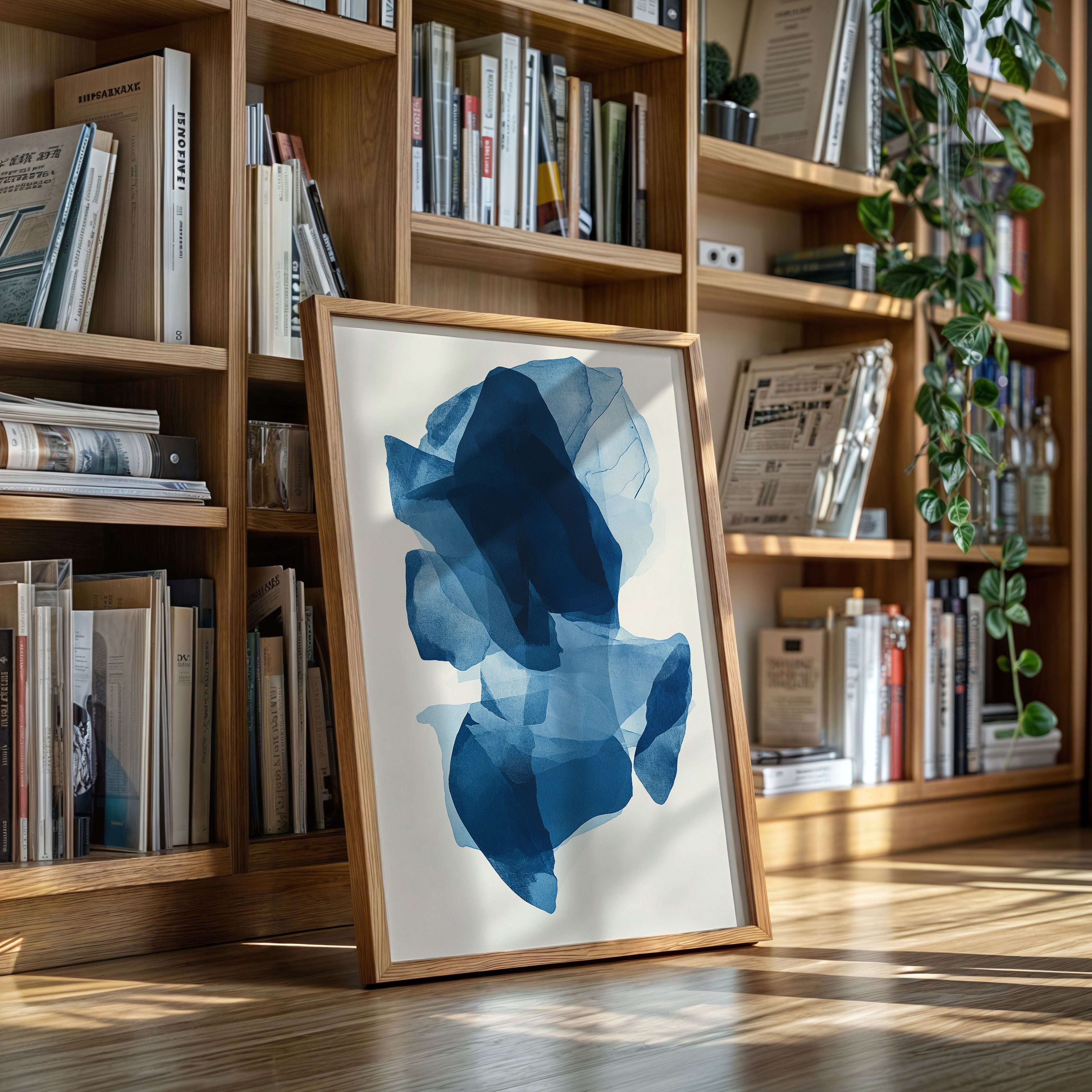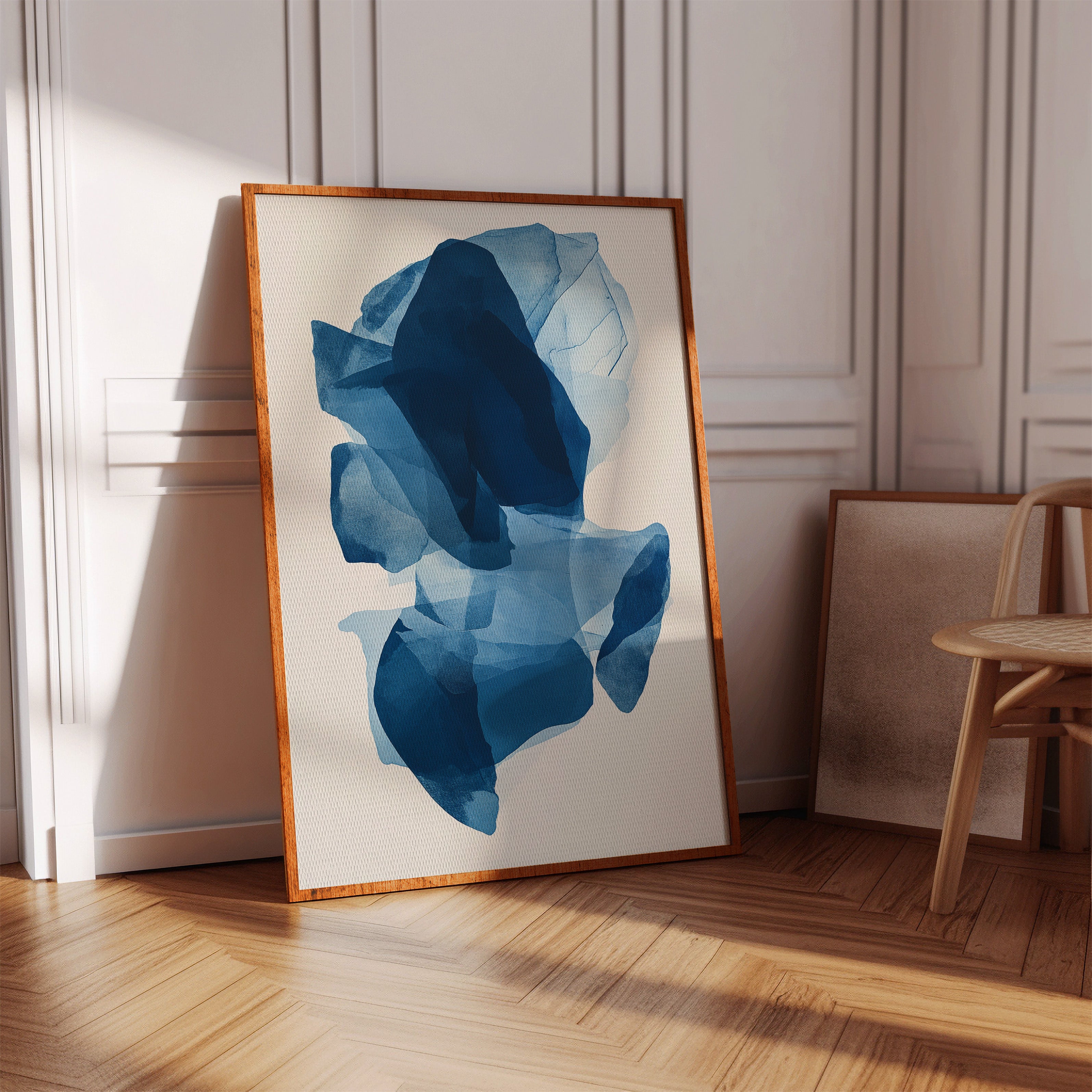 Like fragments of sea ice drifting in arctic waters, translucent layers of blue merge and separate in an ethereal dance. Deep navy shadows cascade through lighter azure veils, creating a sense of depth that pulls the eye into its cool, crystalline world. The organic shapes float weightlessly against the pristine background, their edges softly blending like watercolor bleeding across damp paper. Perfect for modern spaces seeking tranquility, this piece brings sophisticated serenity to master bedrooms or meditation areas where its fluid movement can inspire peaceful contemplation.