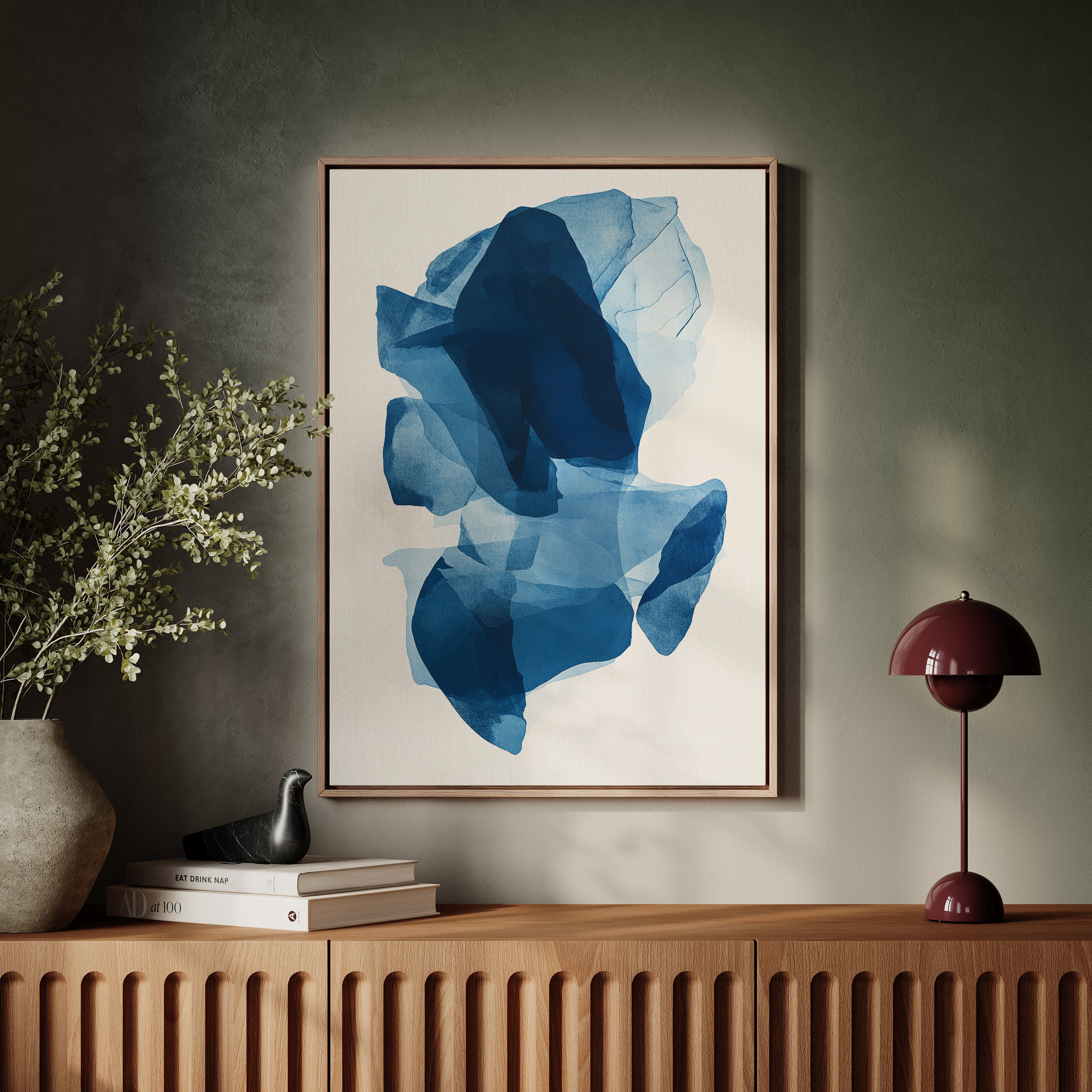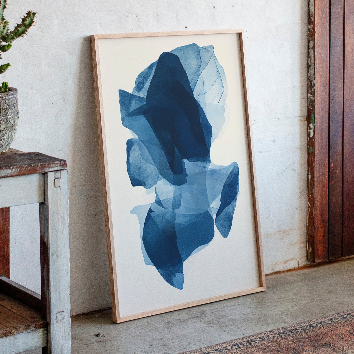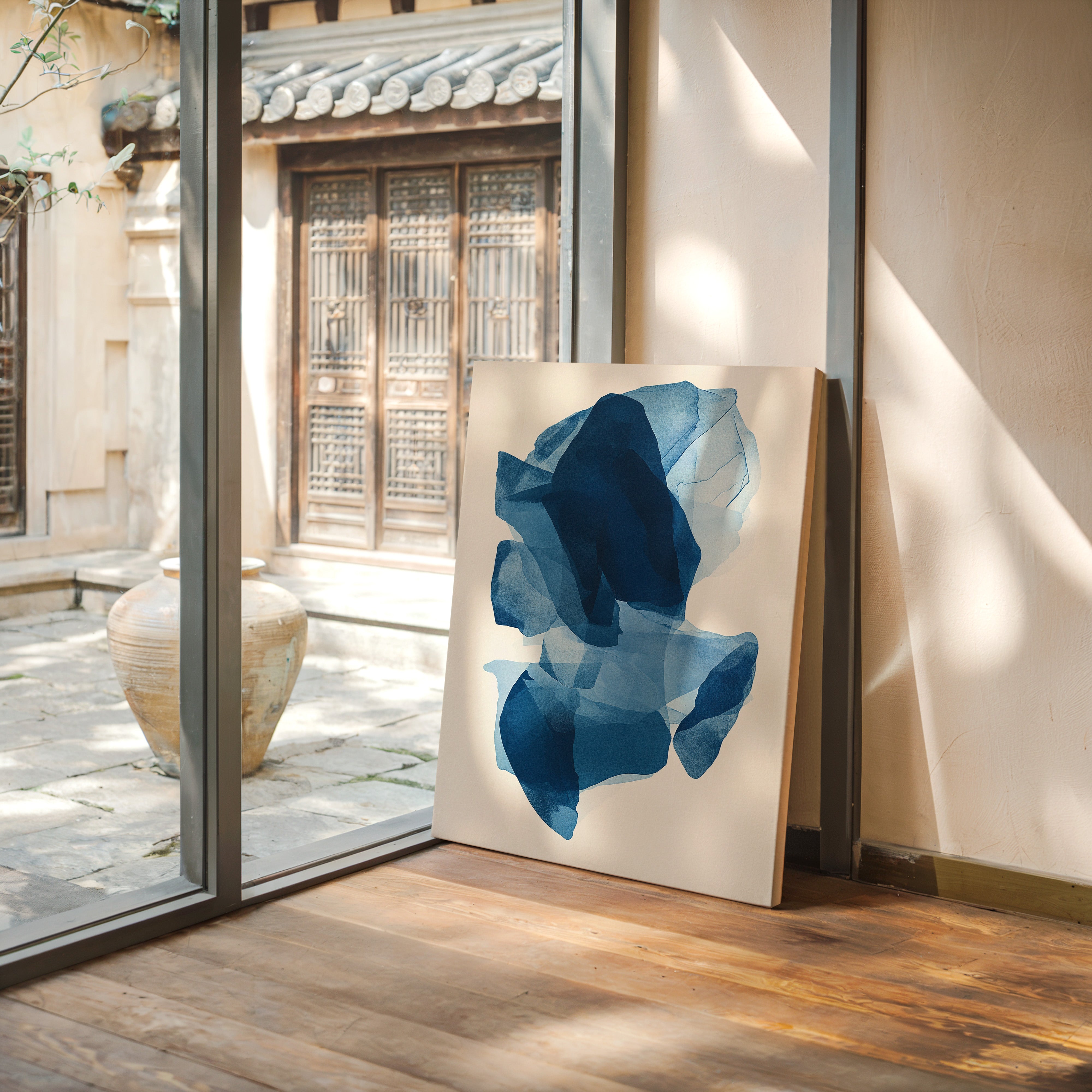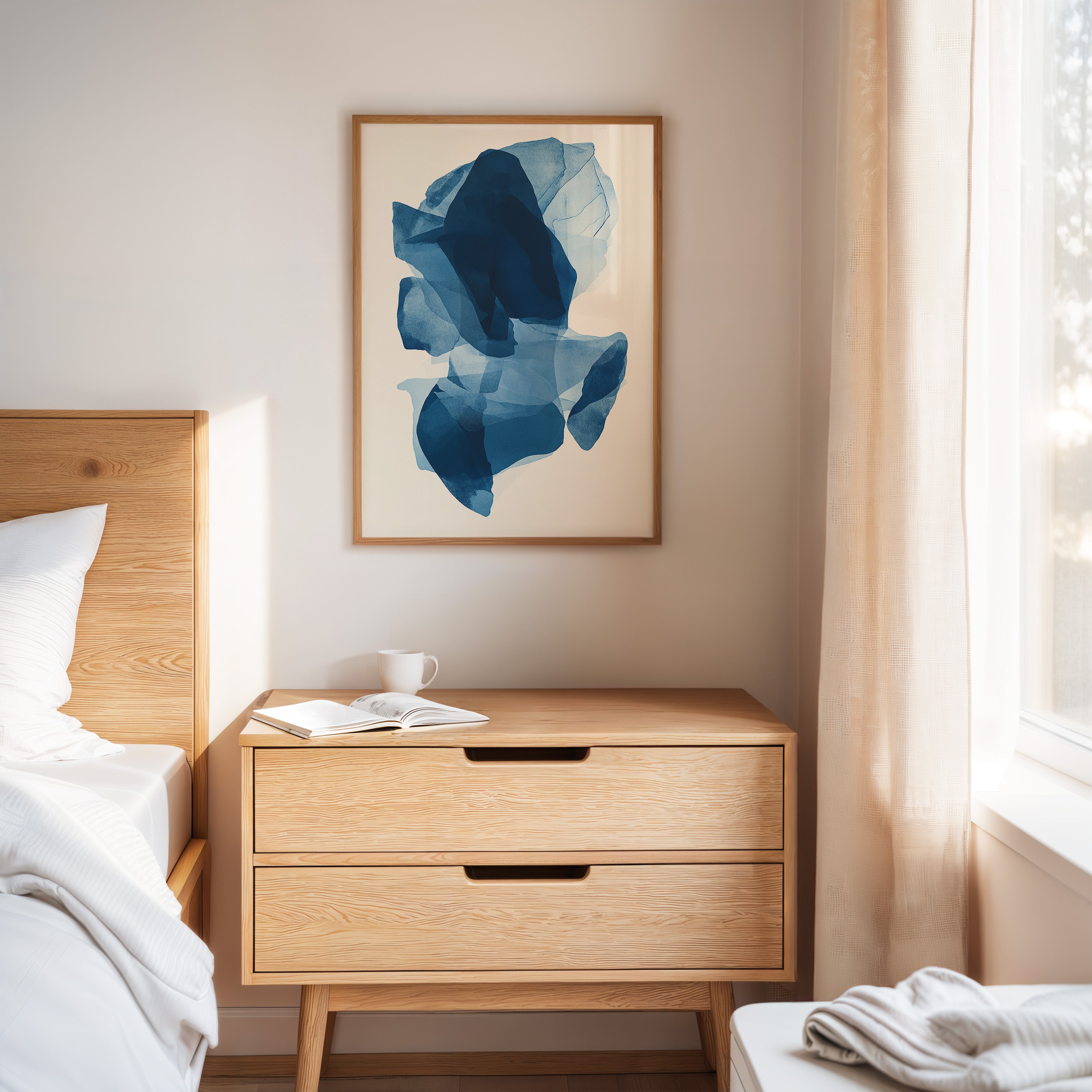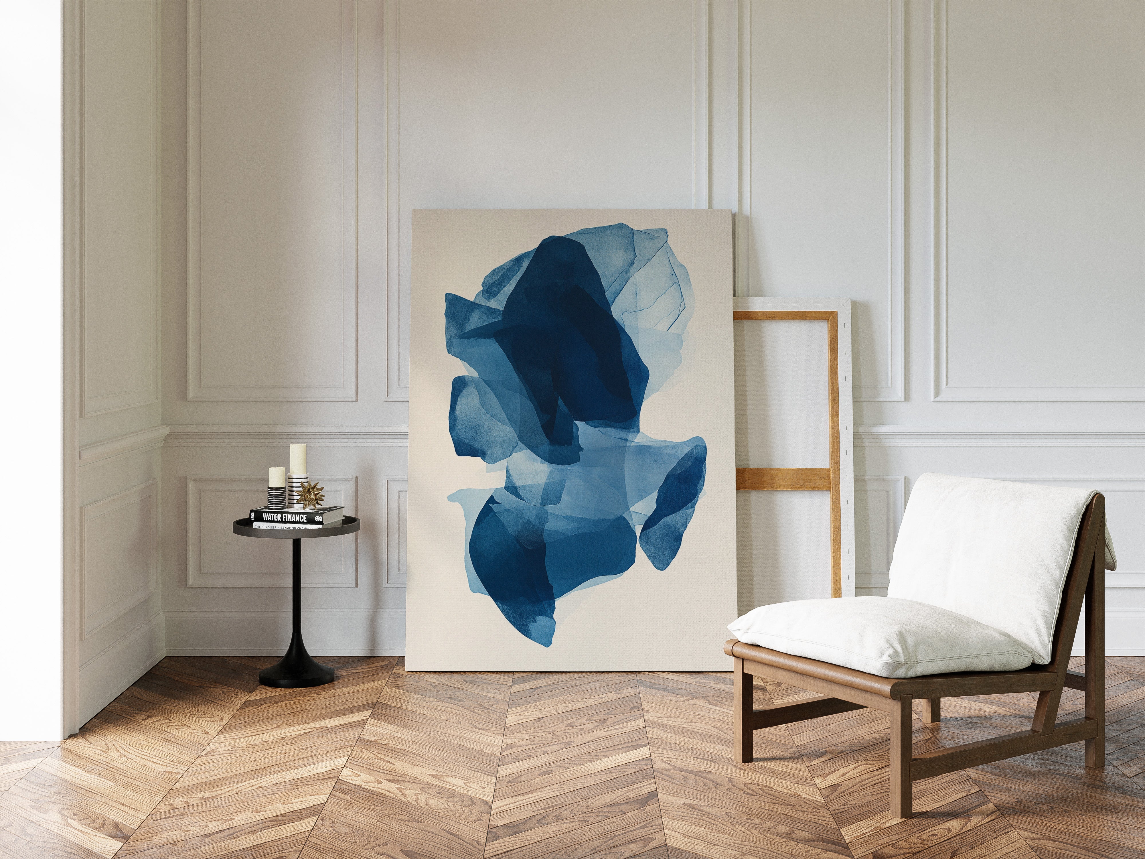 Like fragments of sea ice drifting in arctic waters, translucent layers of blue merge and separate in an ethereal dance. Deep navy shadows cascade through lighter azure veils, creating a sense of depth that pulls the eye into its cool, crystalline world. The organic shapes float weightlessly against the pristine background, their edges softly blending like watercolor bleeding across damp paper. Perfect for modern spaces seeking tranquility, this piece brings sophisticated serenity to master bedrooms or meditation areas where its fluid movement can inspire peaceful contemplation.