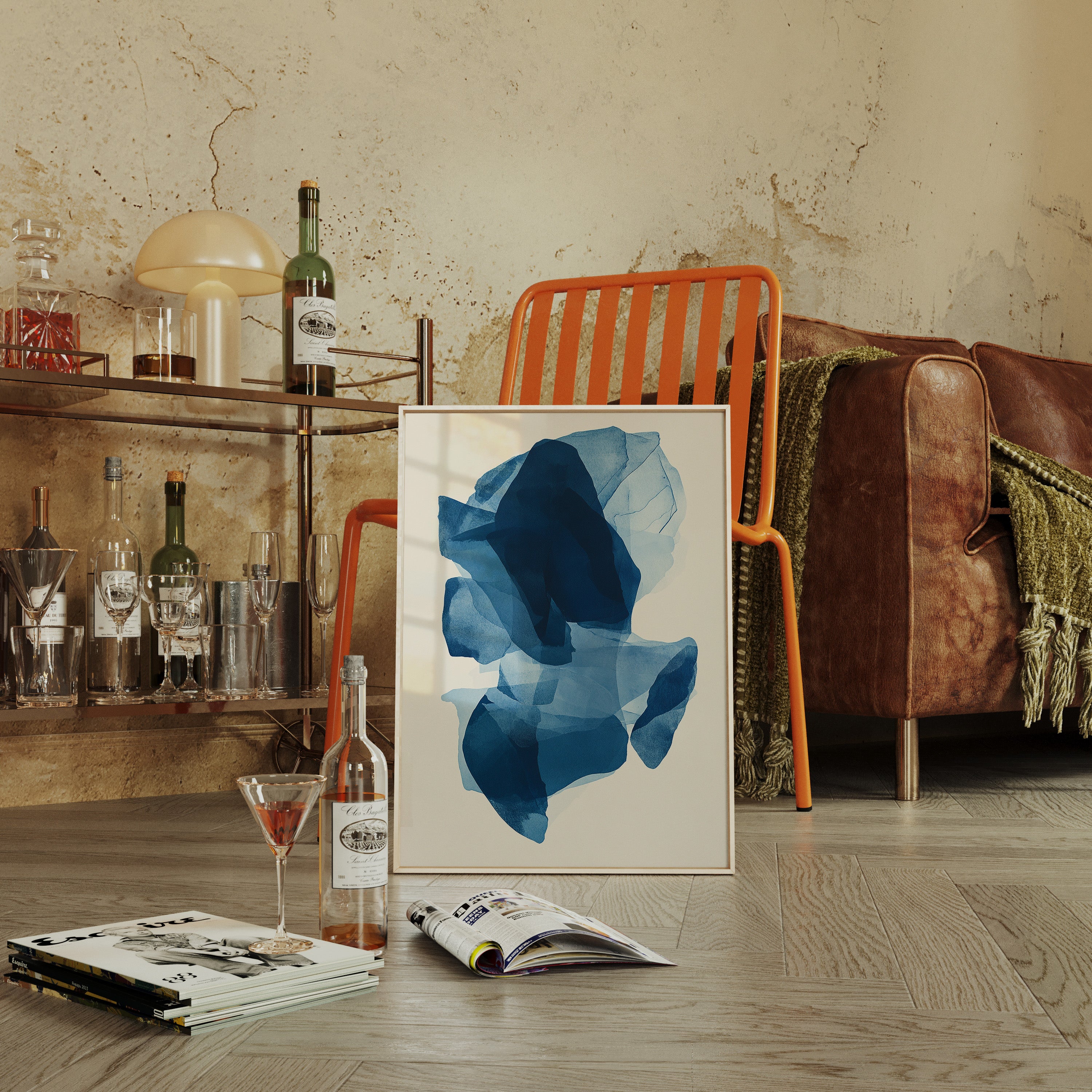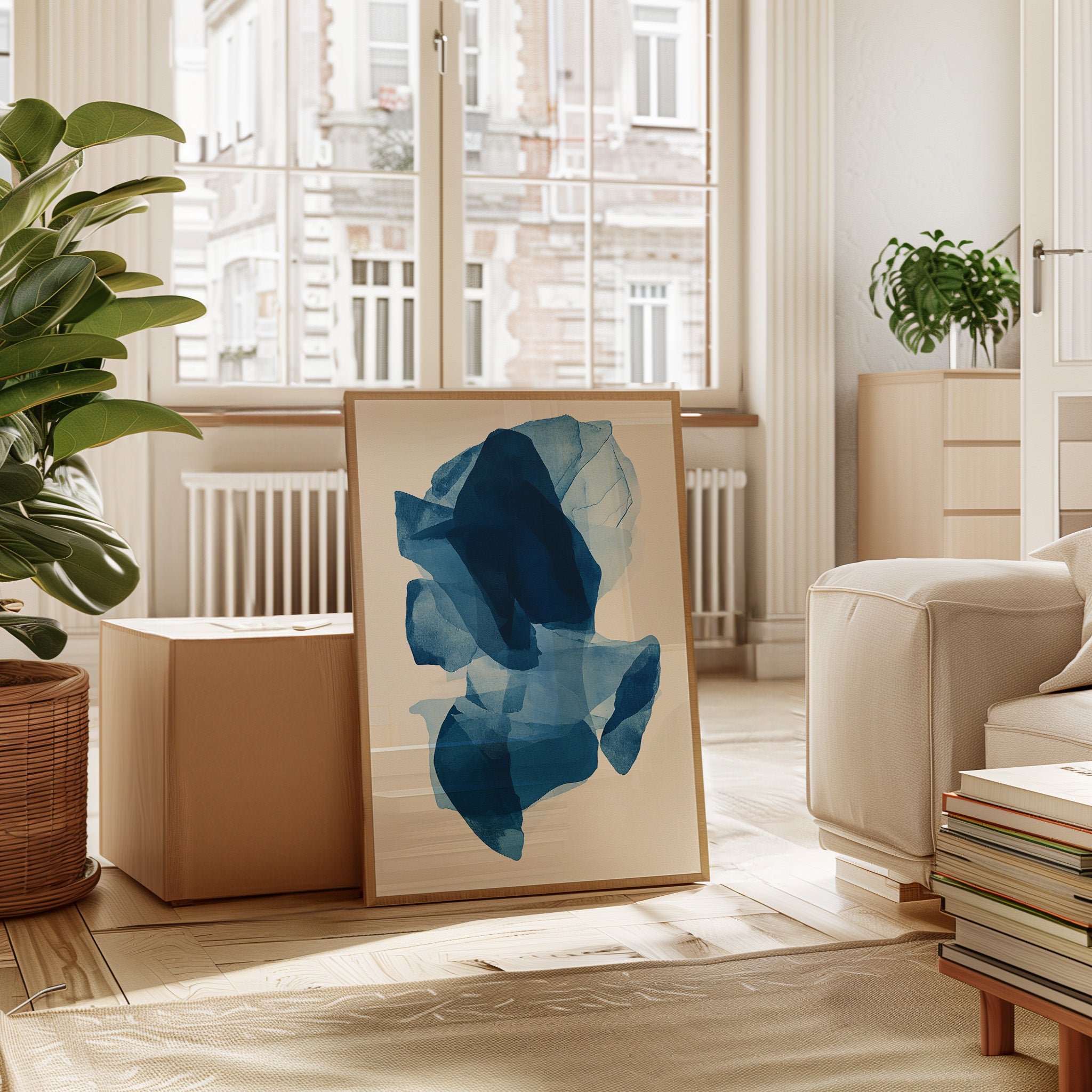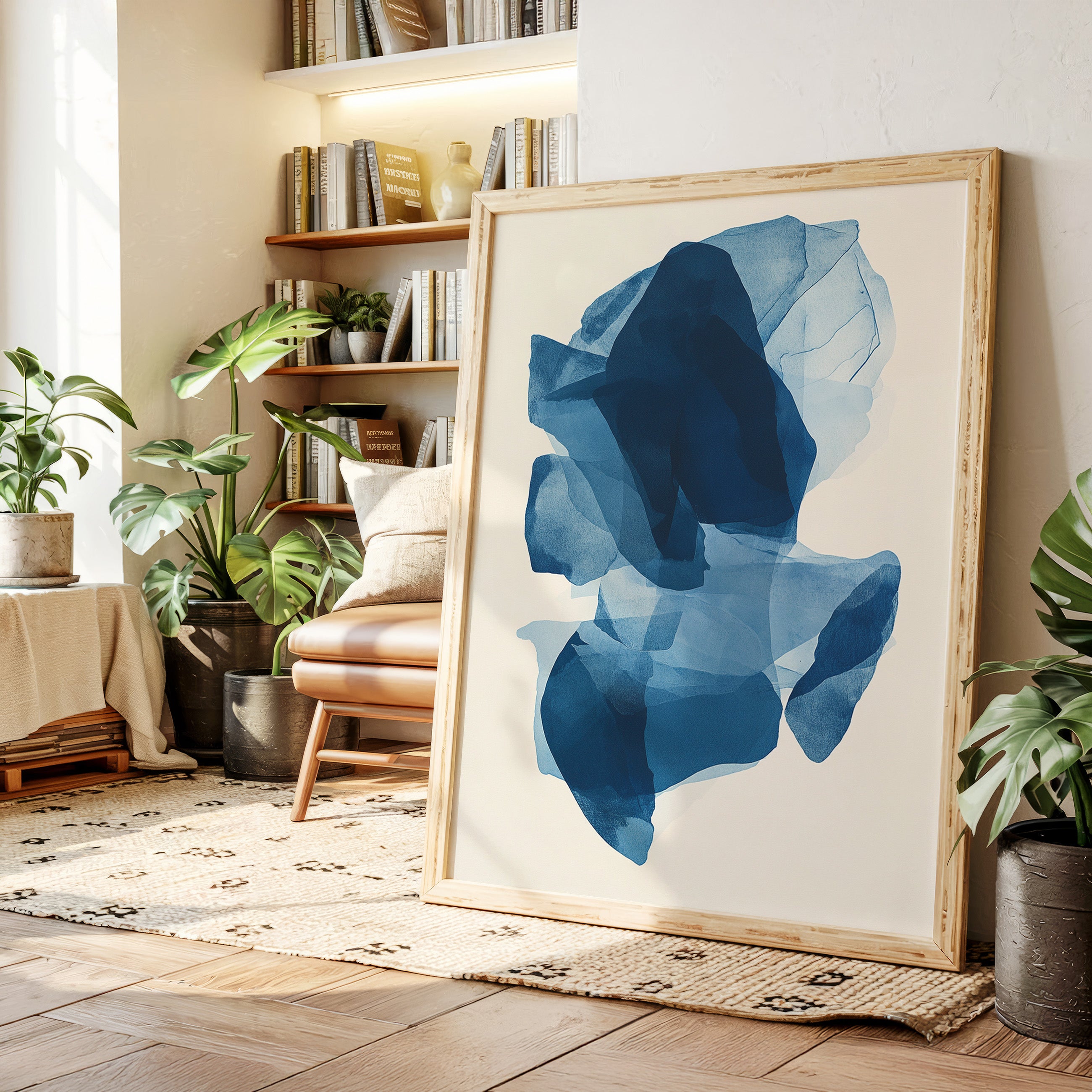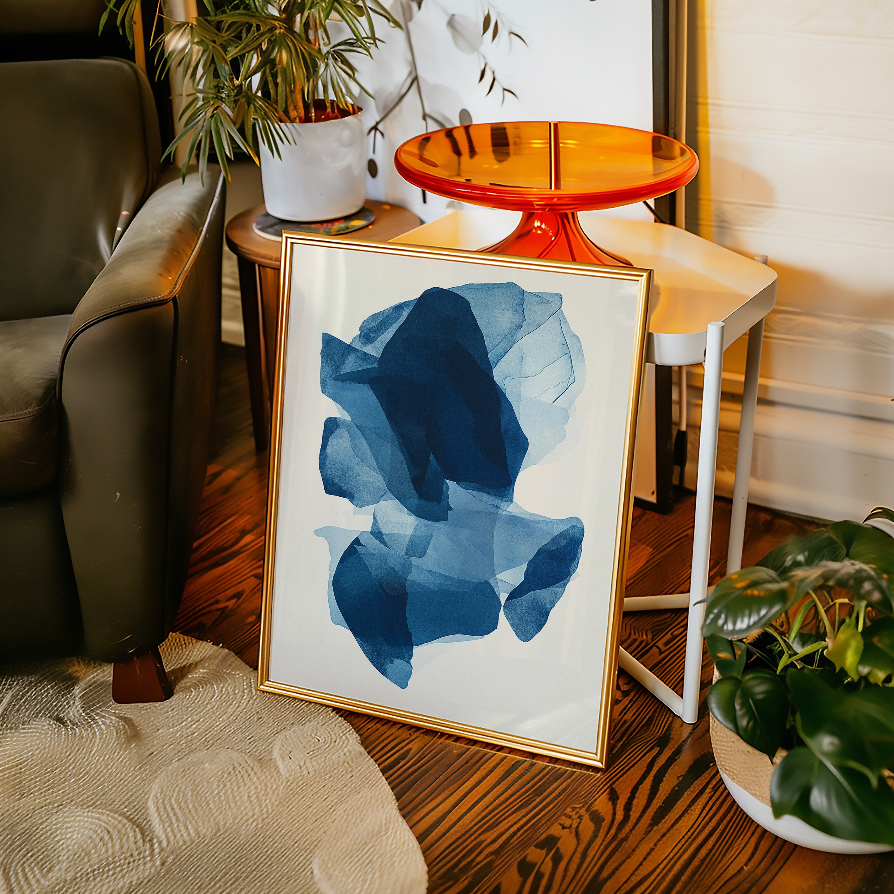 Like fragments of sea ice drifting in arctic waters, translucent layers of blue merge and separate in an ethereal dance. Deep navy shadows cascade through lighter azure veils, creating a sense of depth that pulls the eye into its cool, crystalline world. The organic shapes float weightlessly against the pristine background, their edges softly blending like watercolor bleeding across damp paper. Perfect for modern spaces seeking tranquility, this piece brings sophisticated serenity to master bedrooms or meditation areas where its fluid movement can inspire peaceful contemplation.