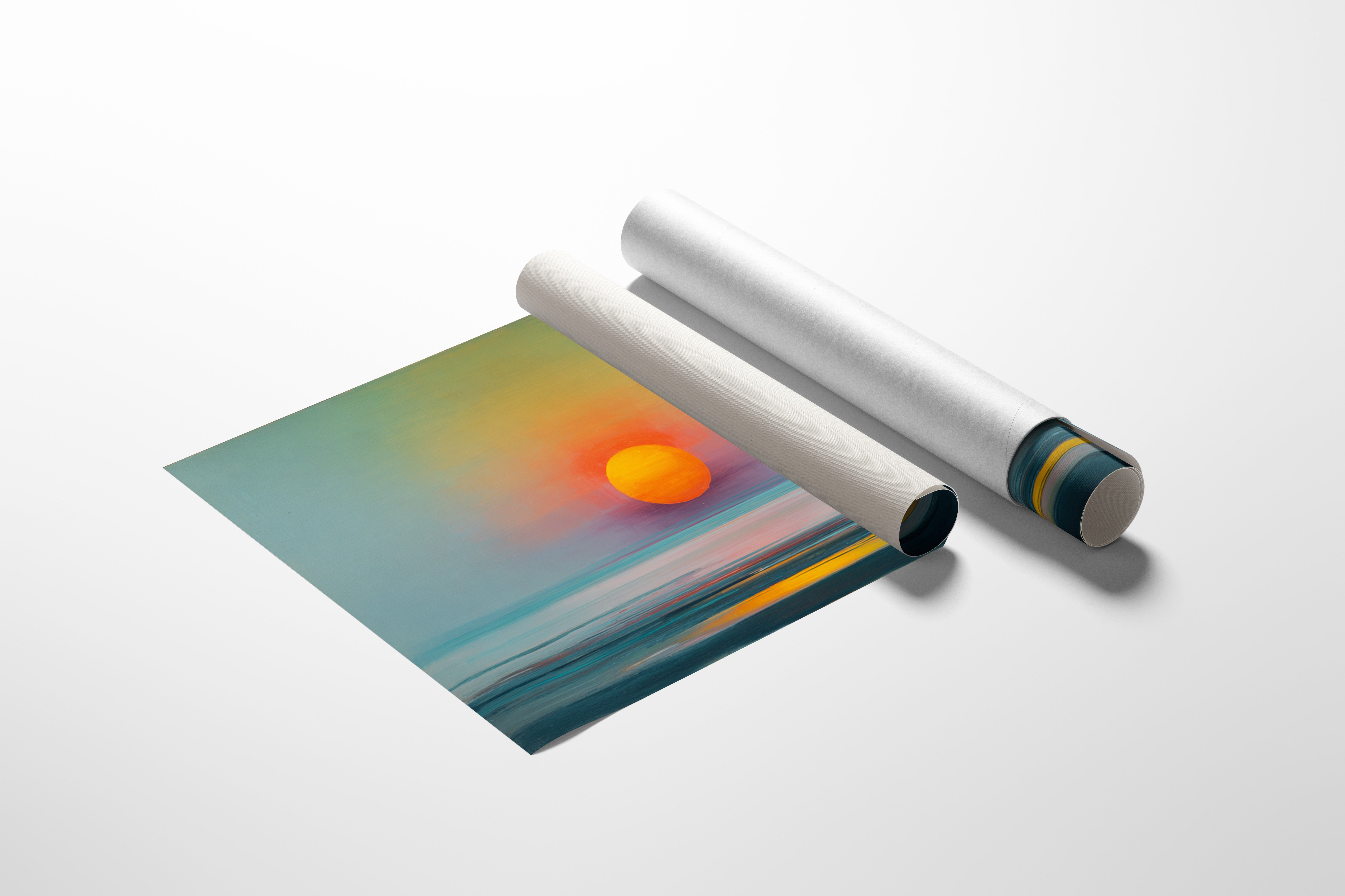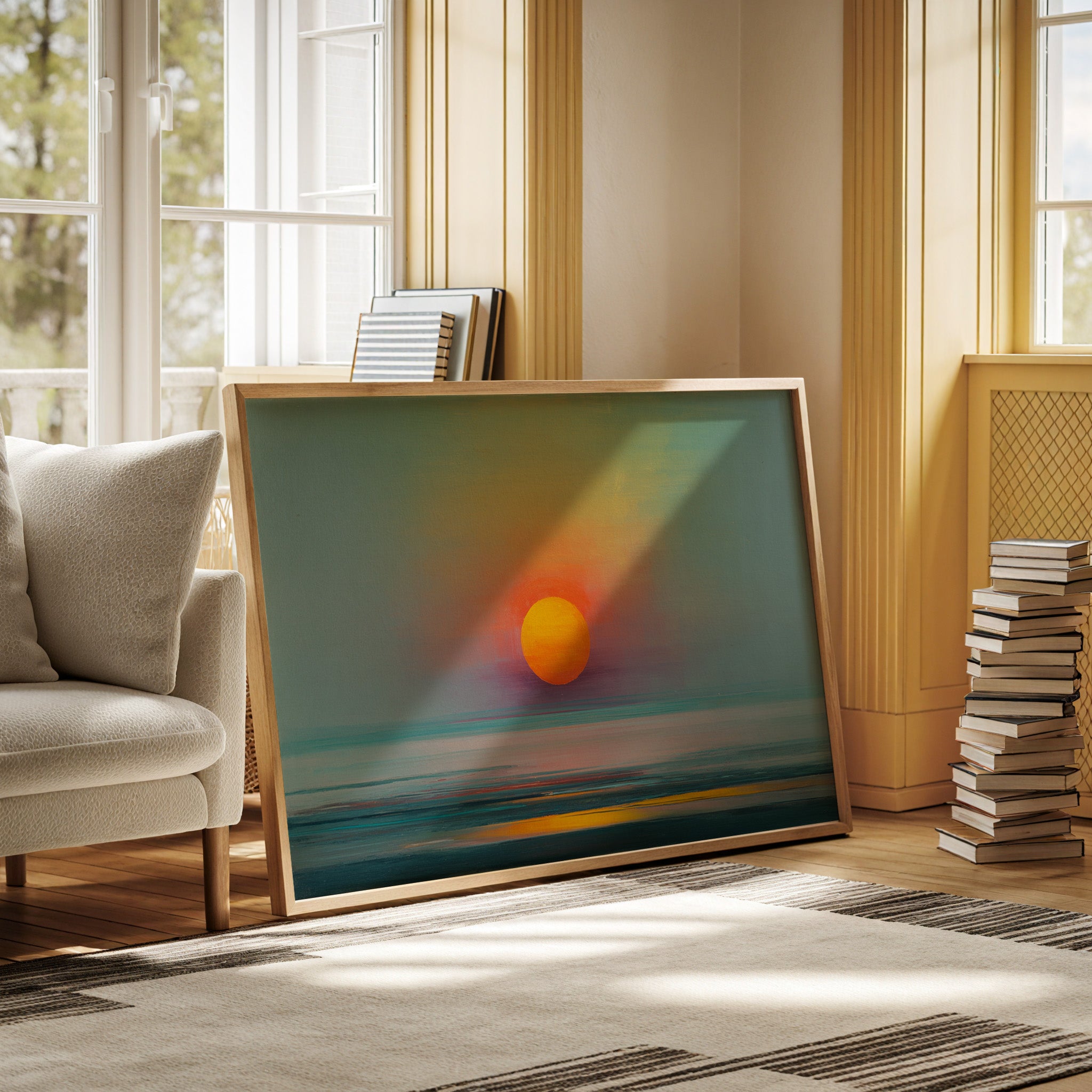 A brilliant tangerine sun commands attention against a soft turquoise sky, its warm glow casting a spell of tranquility over the scene. The horizon melts into layers of teal, pink, and golden reflections, creating a dreamlike seascape where reality and imagination merge. The composition speaks to the eternal dance between sea and sky, with gentle brushstrokes suggesting the peaceful rhythm of waves at dusk. This meditative piece would bring a sense of calm and coastal serenity to a bedroom or living space, perfect for creating a peaceful retreat within your home.