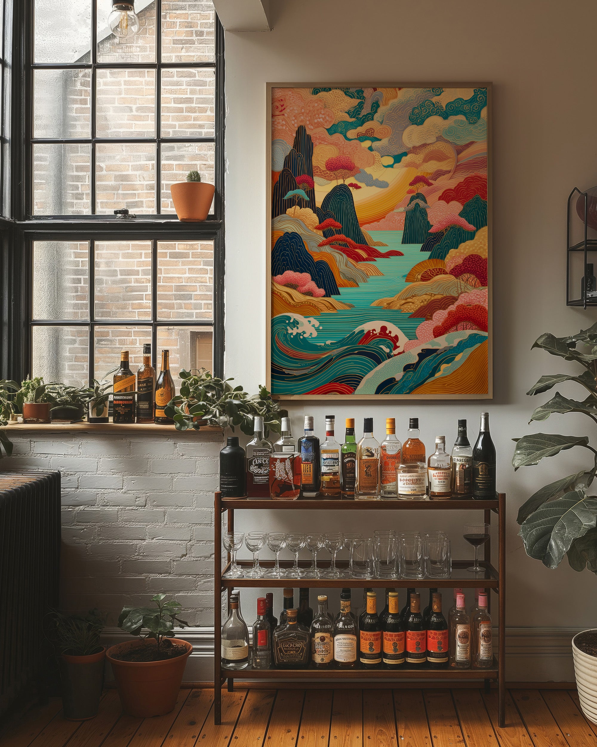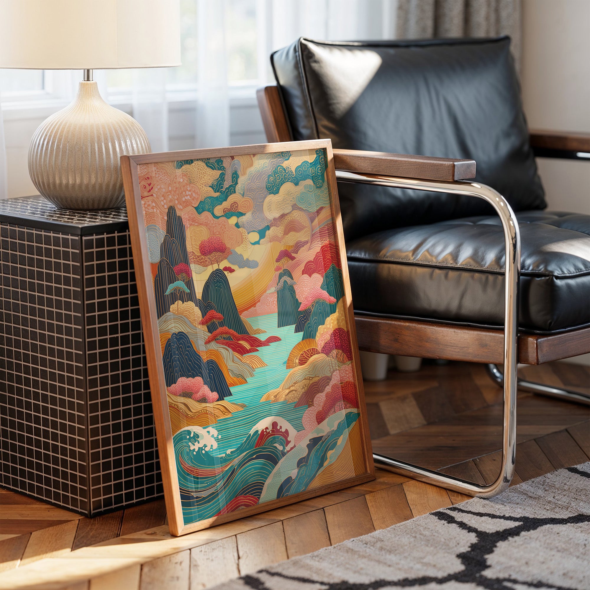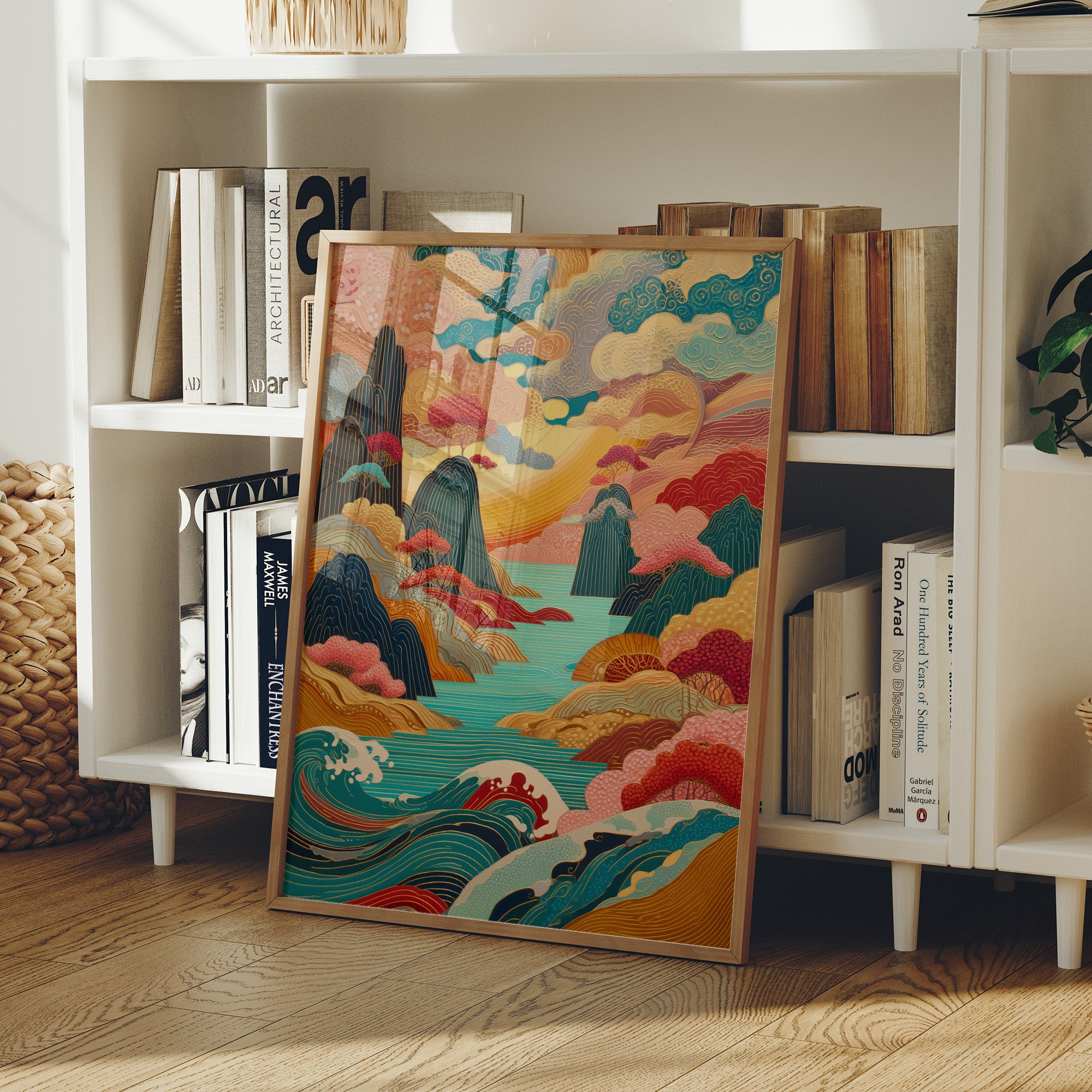 Turquoise waves dance beneath coral-tinted clouds, creating a dreamlike landscape where sea meets sky. Mountains rise like ancient guardians, their forms rendered in deep blues and rich earth tones, while swirling patterns echo traditional Asian artistry throughout the composition. This contemporary piece merges organic shapes with bold color choices, creating a harmonious balance between nature's raw power and artistic interpretation. This statement piece brings serenity and artistic sophistication to modern living spaces, perfect for a reading nook or meditation room where its soothing yet dynamic energy can be fully appreciated.