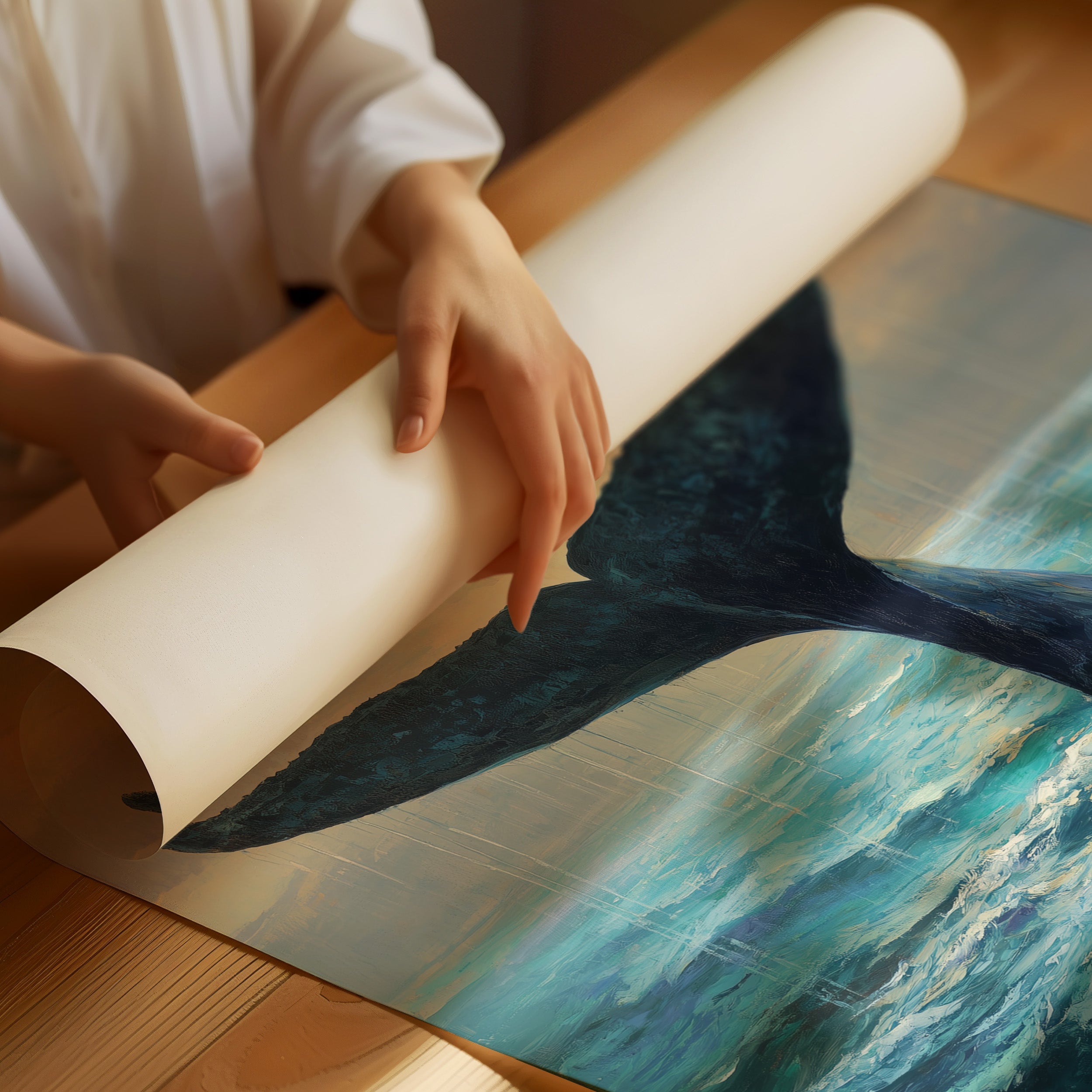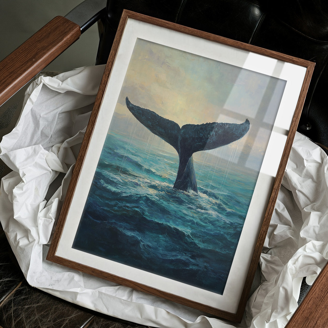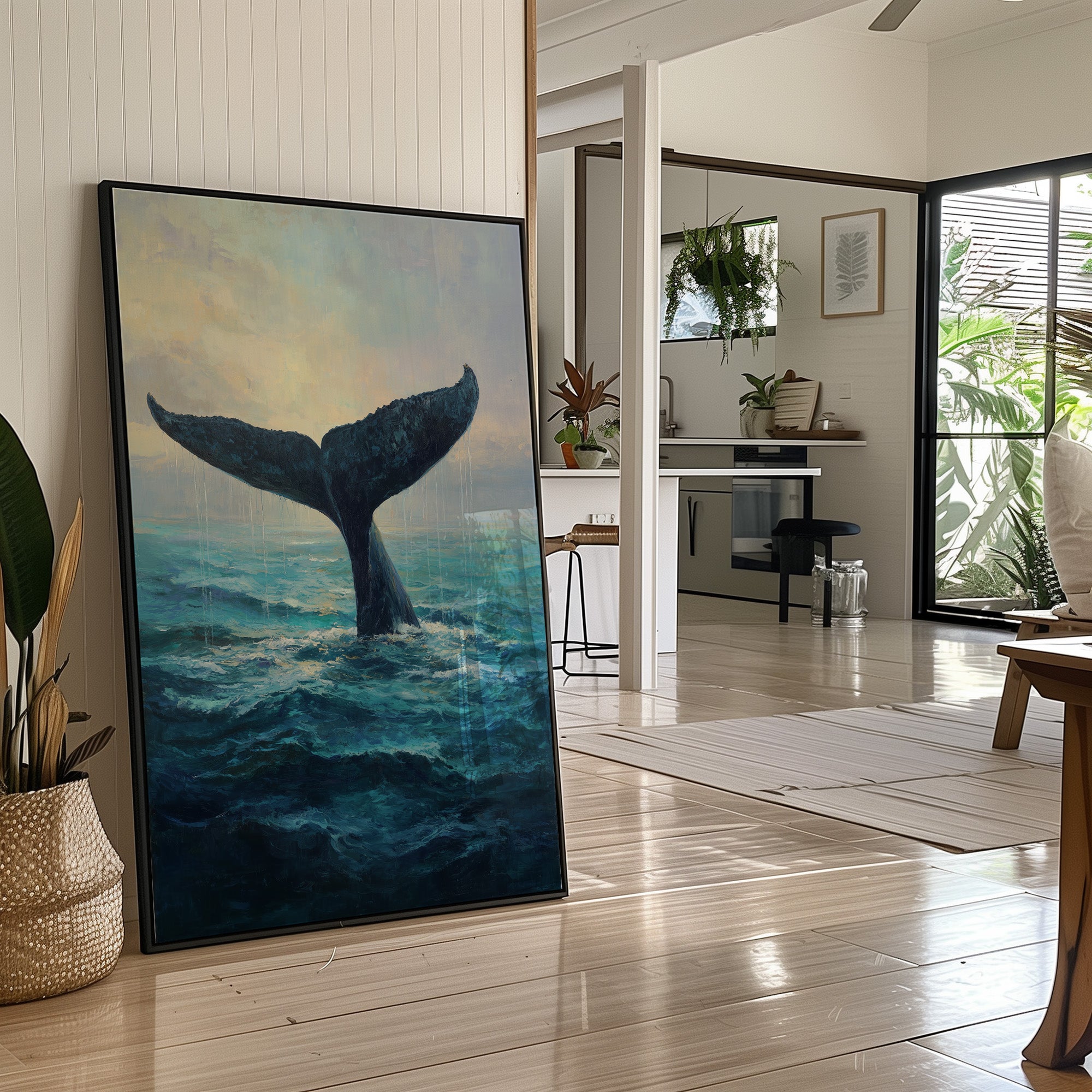 Sunlight catches the spray as a majestic whale tail breaks through turquoise waters, suspended in a moment of perfect freedom. The painting captures the raw power and serene grace of marine life, with deep blues contrasting against a soft golden horizon that hints at daybreak. This contemplative piece brings coastal tranquility into sophisticated living spaces, perfect for creating a thoughtful focal point in a study or living room with modern furnishings.