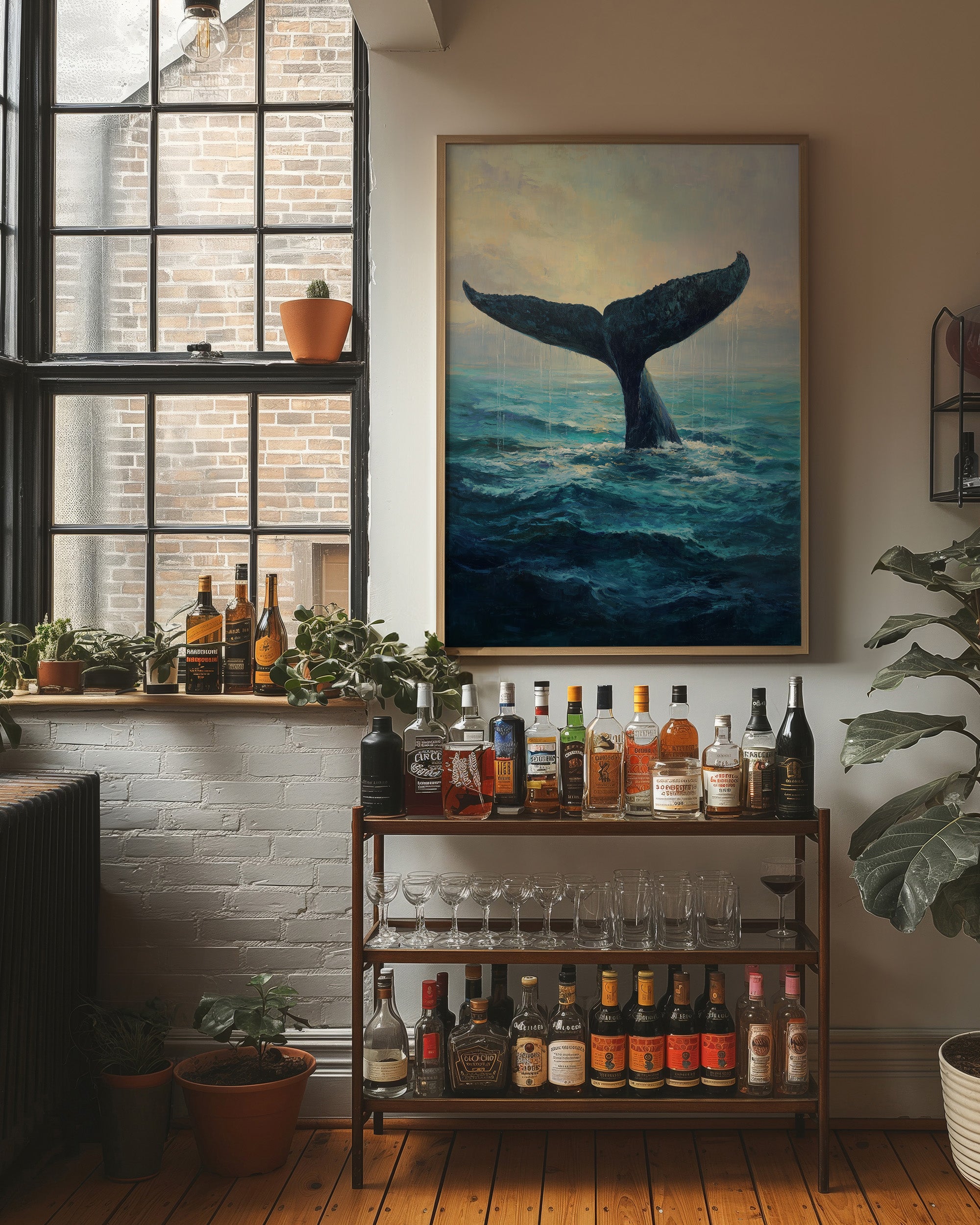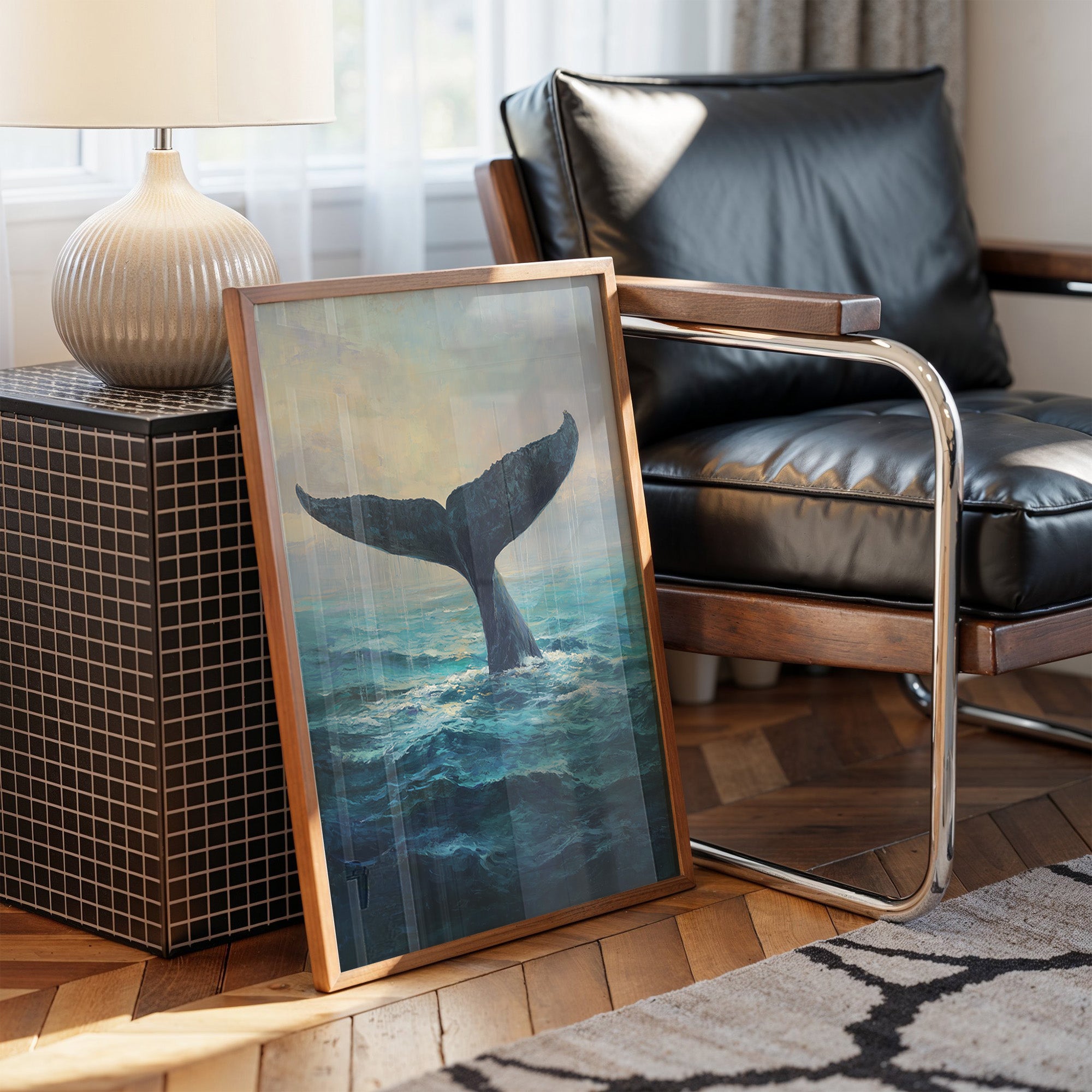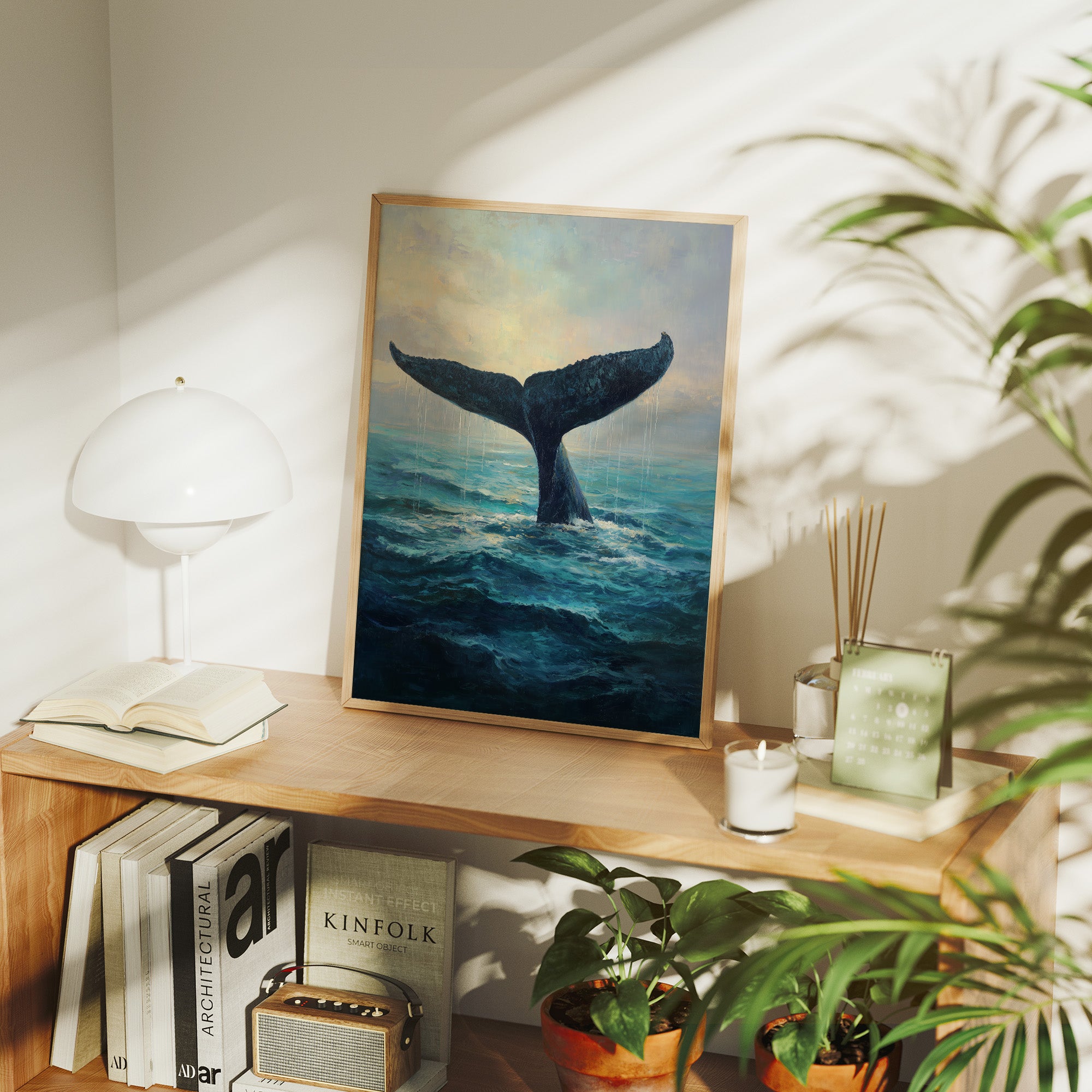 Sunlight catches the spray as a majestic whale tail breaks through turquoise waters, suspended in a moment of perfect freedom. The painting captures the raw power and serene grace of marine life, with deep blues contrasting against a soft golden horizon that hints at daybreak. This contemplative piece brings coastal tranquility into sophisticated living spaces, perfect for creating a thoughtful focal point in a study or living room with modern furnishings.