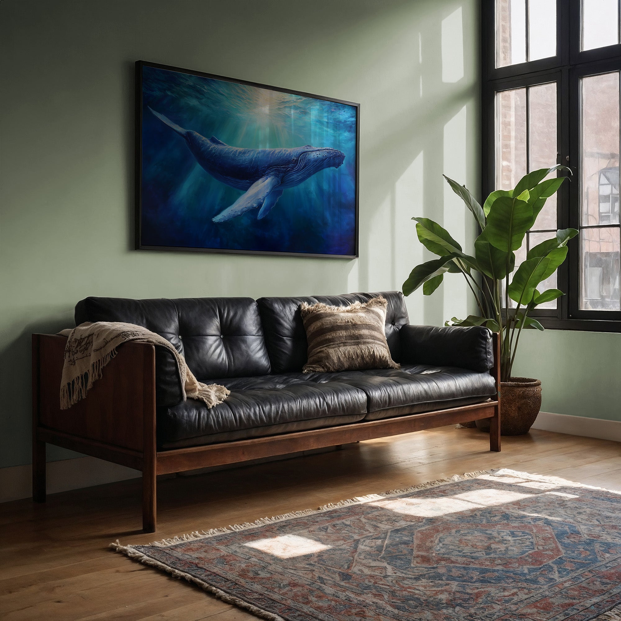 Your artwork should take up 60-75% of wall space above furniture. For standard sofas, choose 24"x36" or larger. When in doubt, go slightly bigger.