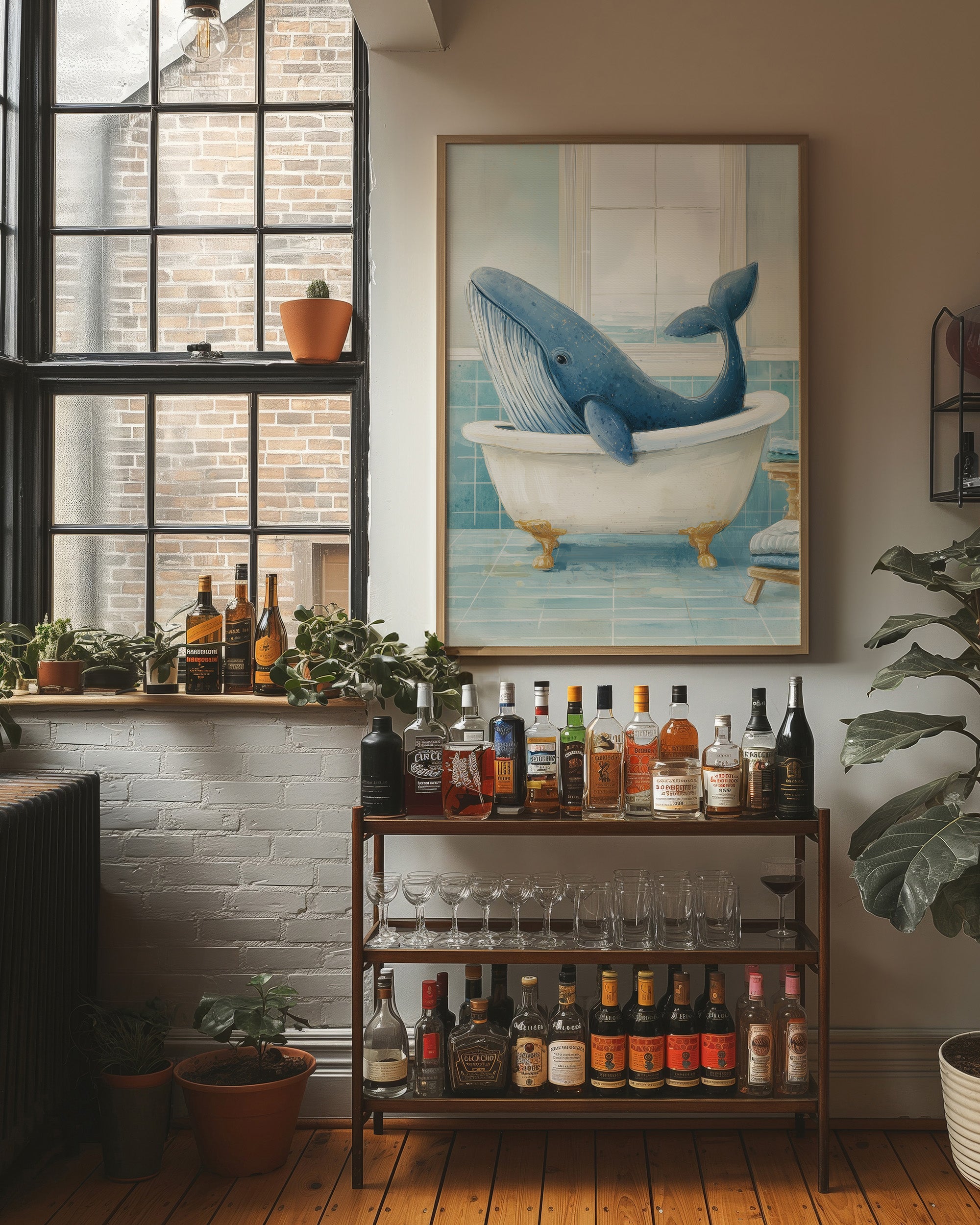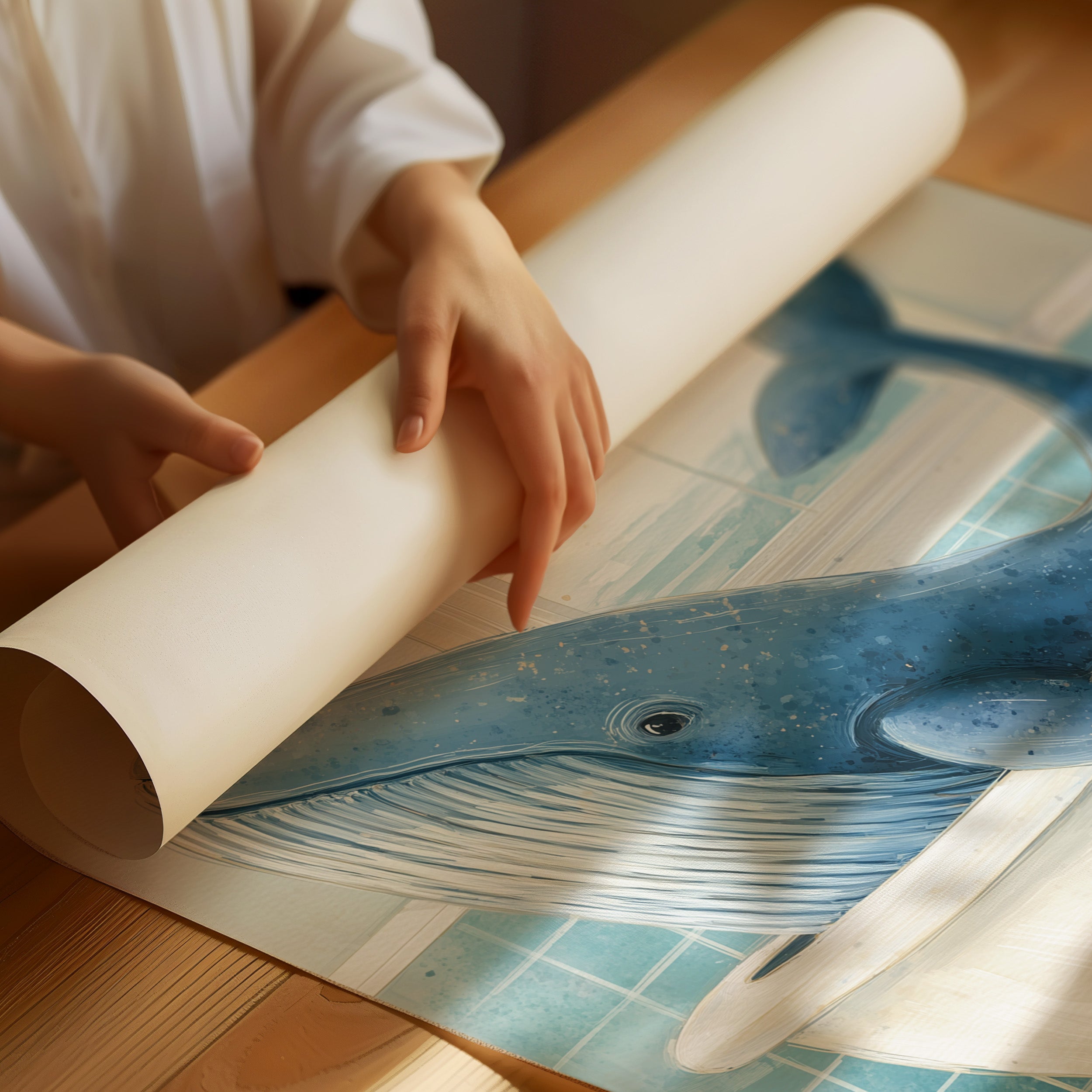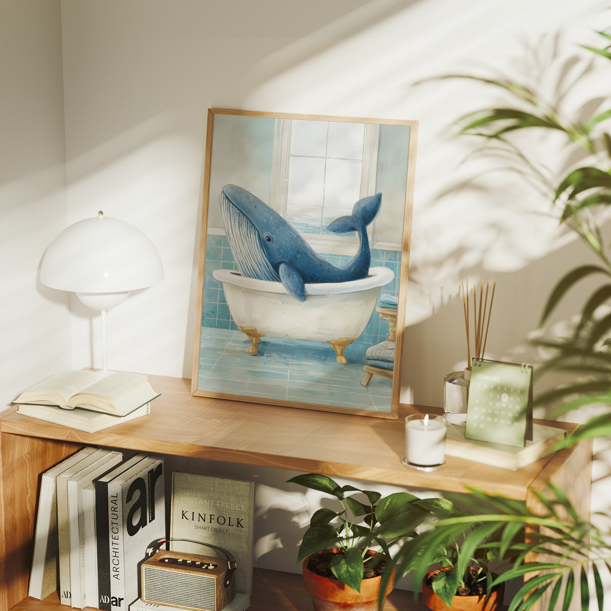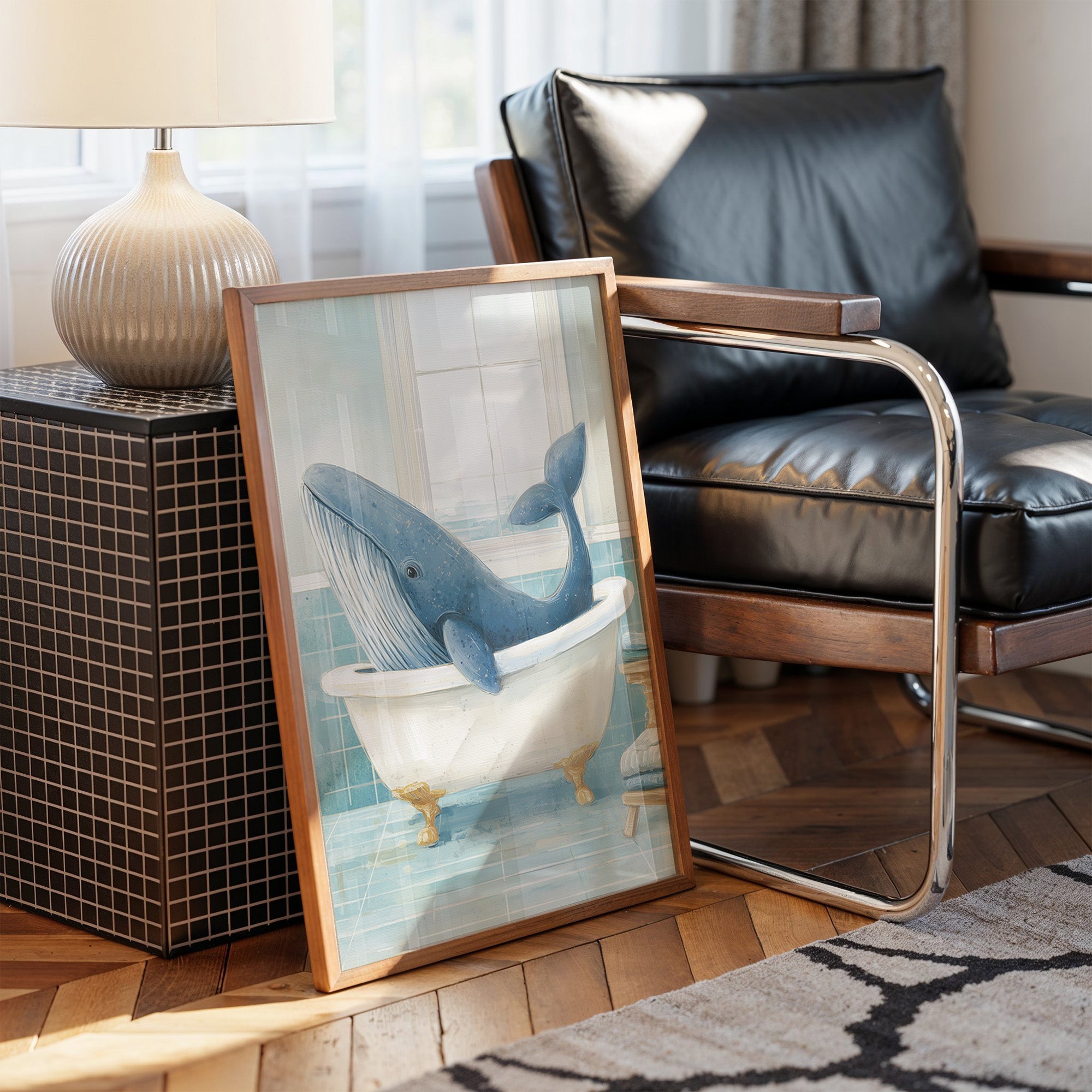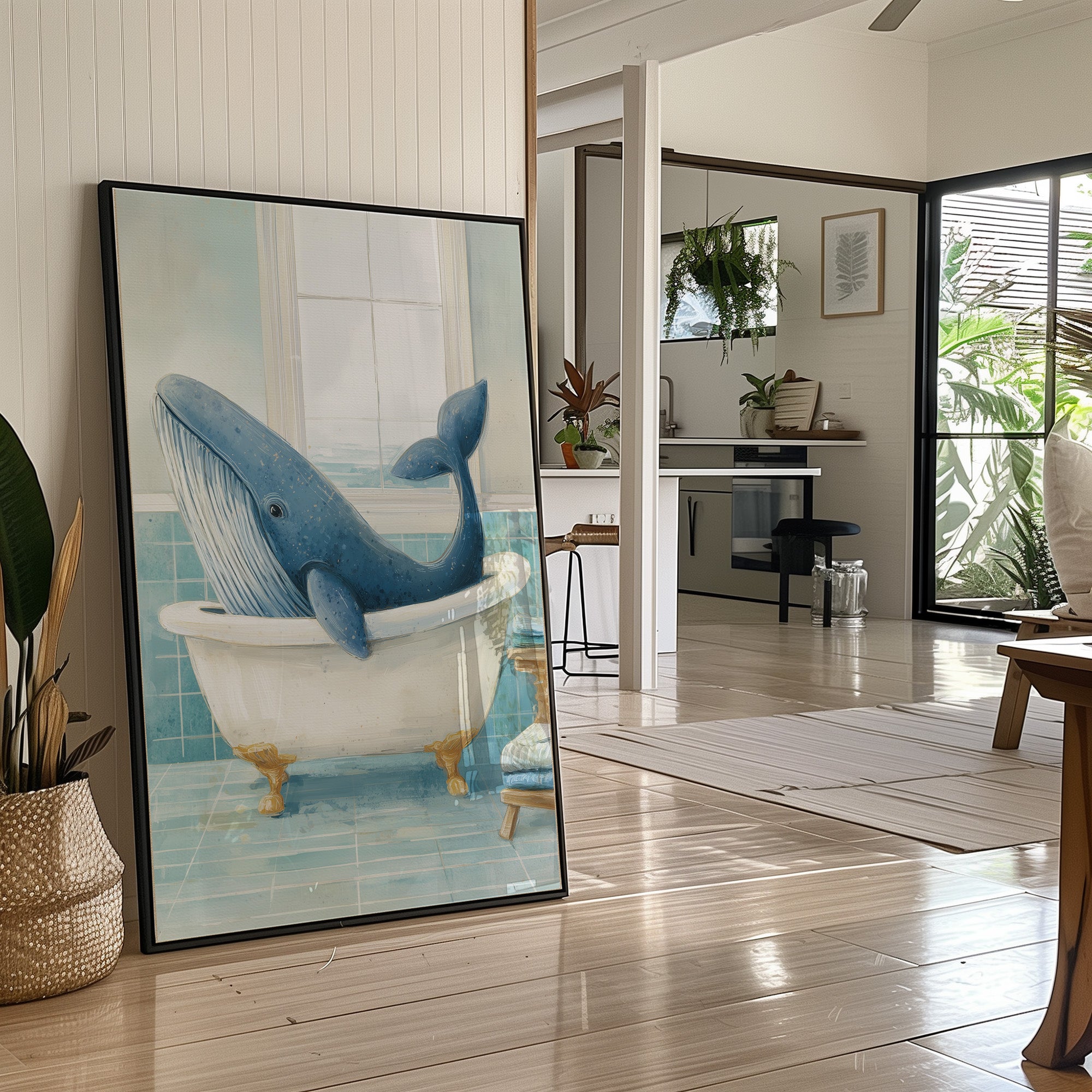 Morning light dances across a whimsical scene where a magnificent blue whale lounges in a vintage clawfoot tub. The playful illustration blends childlike wonder with sophisticated humor, rendering the enormous sea creature in soft blue hues against a backdrop of aqua-tiled bathroom walls. This charming juxtaposition of scale creates a gentle narrative about finding comfort in unexpected places. Perfect for adding a touch of clever whimsy to a powder room, child's bedroom, or any space where imagination and subtle humor are welcomed.