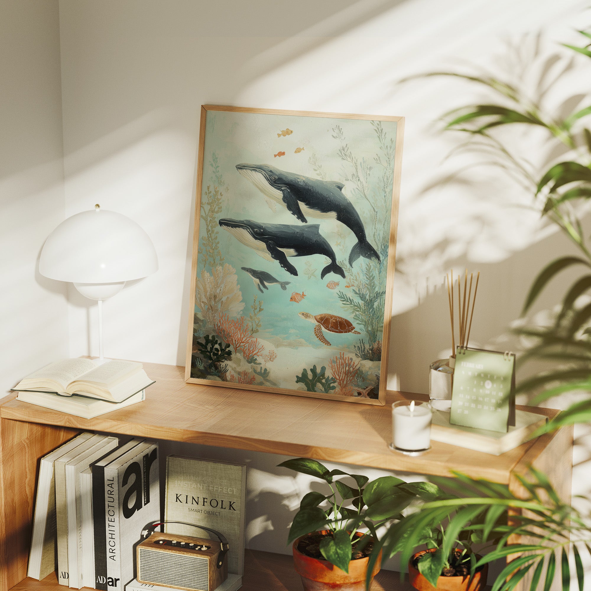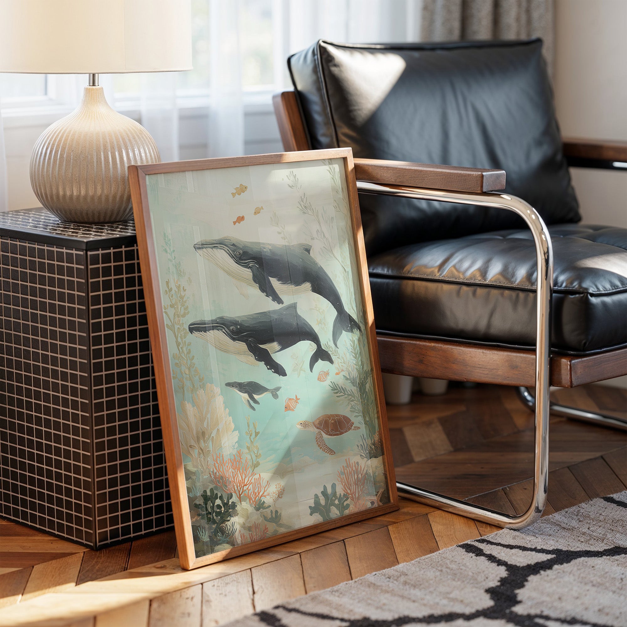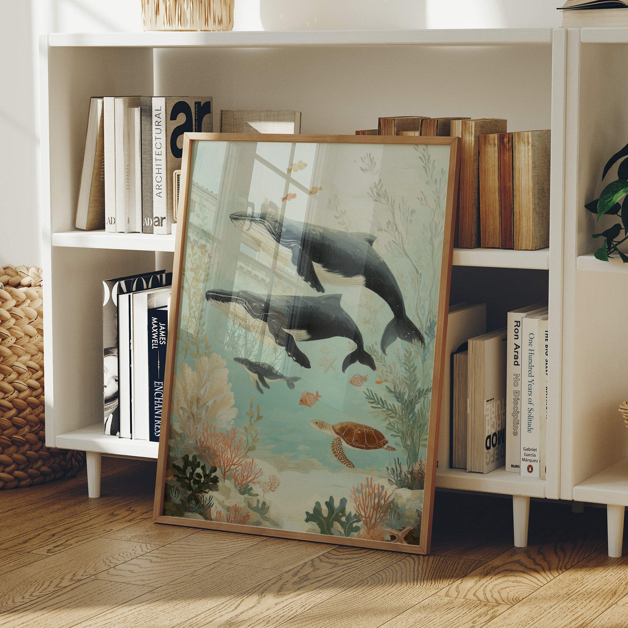 Sunlight filters through an underwater world where majestic whales glide with effortless grace. The mint-green waters create a dreamlike sanctuary where a family of humpbacks swims alongside curious sea turtles and vibrant fish, each creature rendered in delicate illustration. Coral formations in soft peach and sage green anchor the scene, creating a harmonious underwater ballet of marine life.