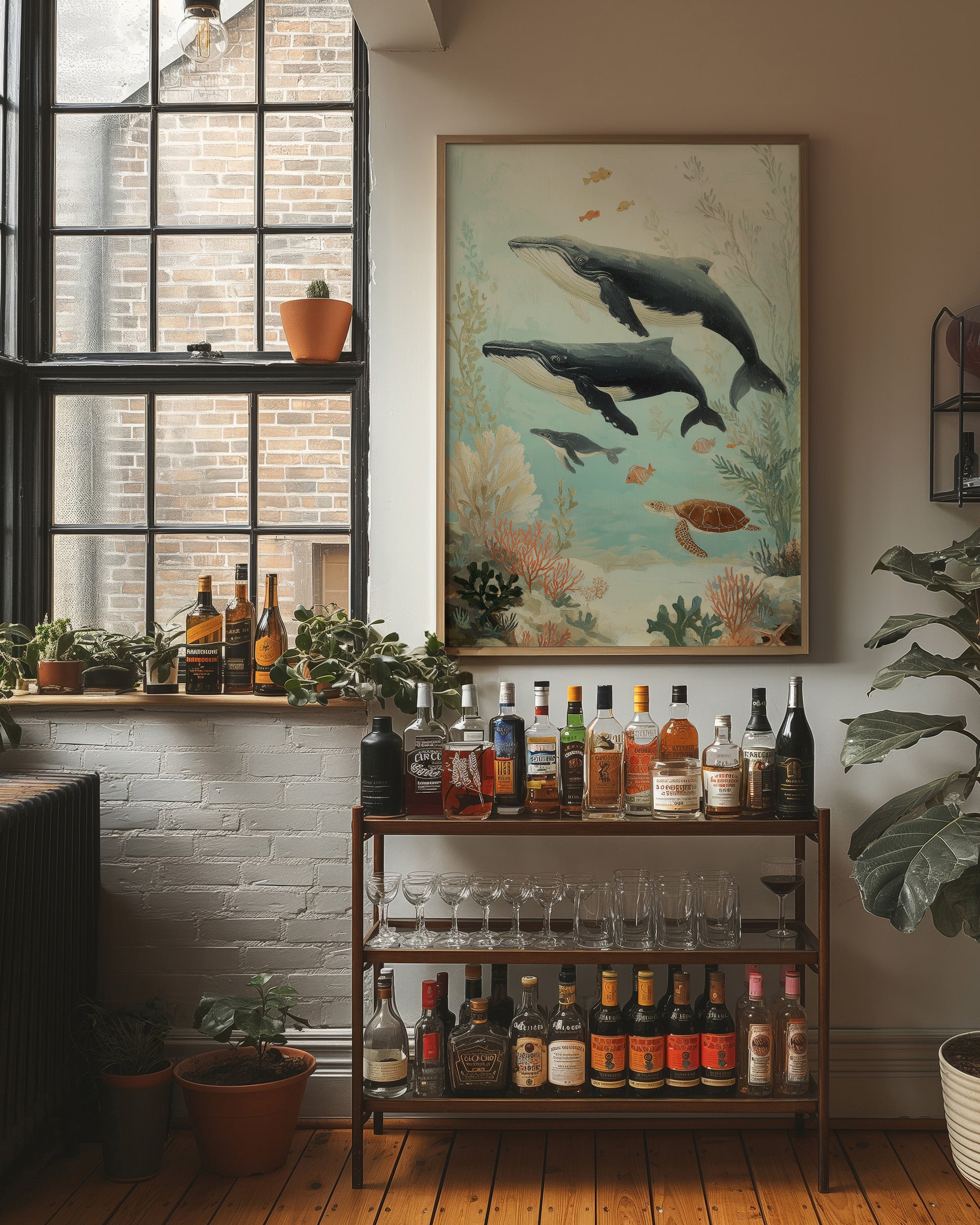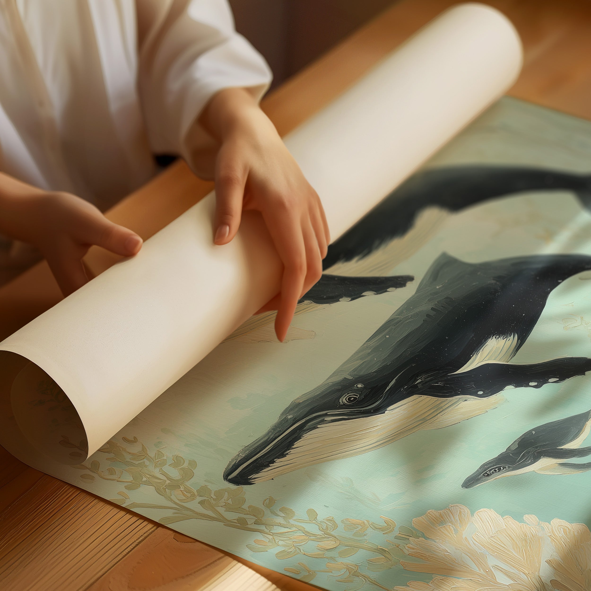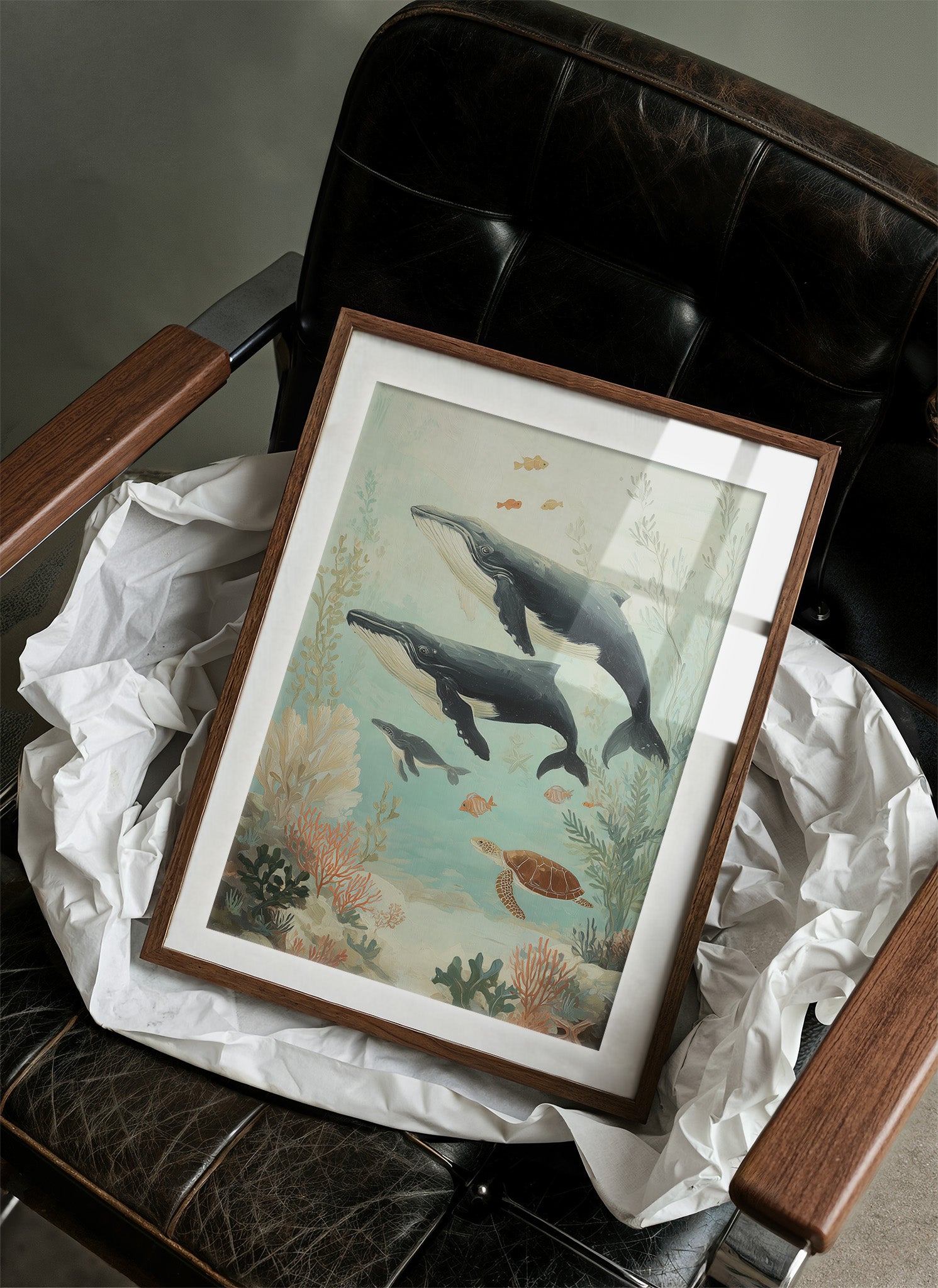 Sunlight filters through an underwater world where majestic whales glide with effortless grace. The mint-green waters create a dreamlike sanctuary where a family of humpbacks swims alongside curious sea turtles and vibrant fish, each creature rendered in delicate illustration. Coral formations in soft peach and sage green anchor the scene, creating a harmonious underwater ballet of marine life.