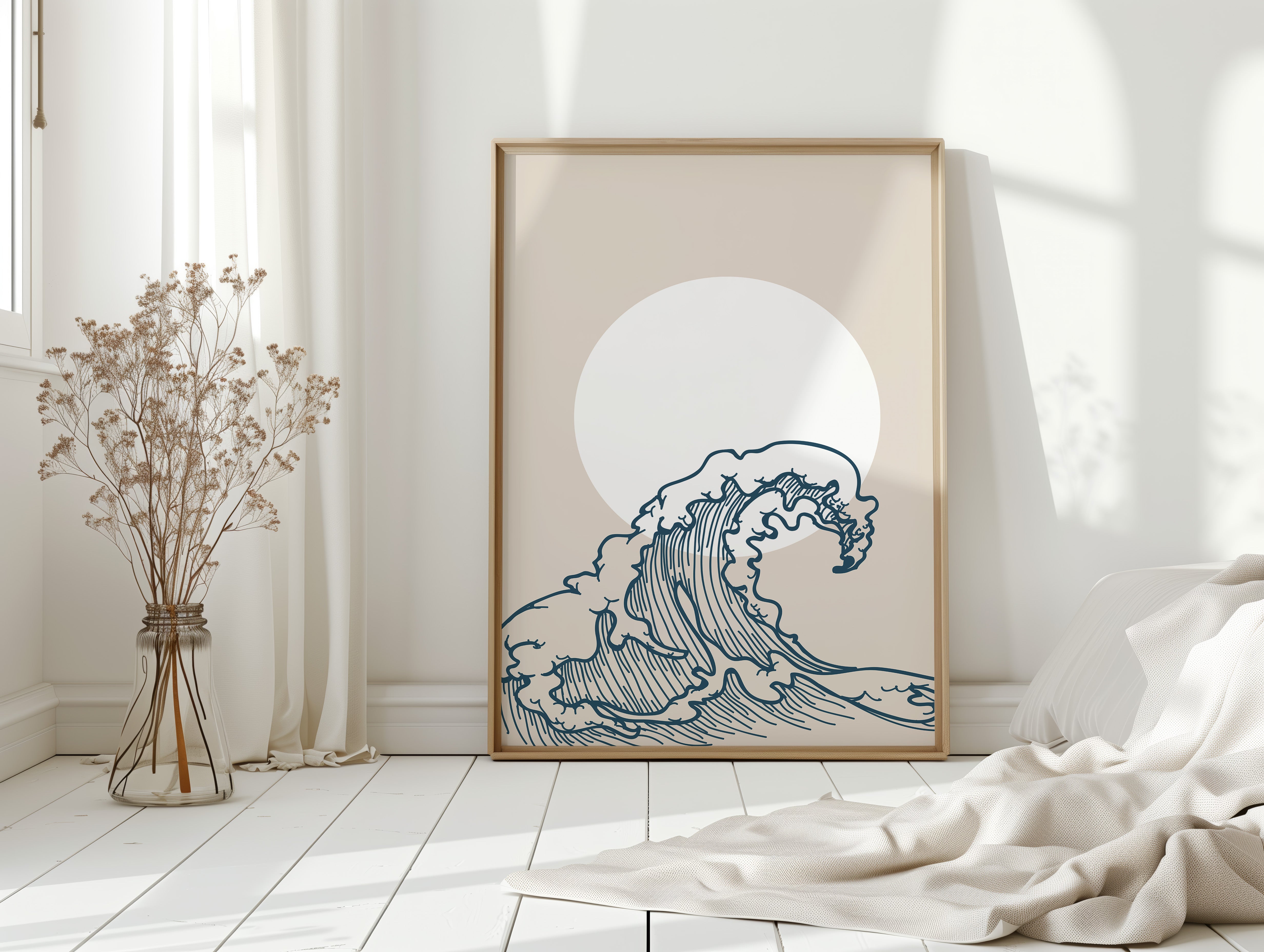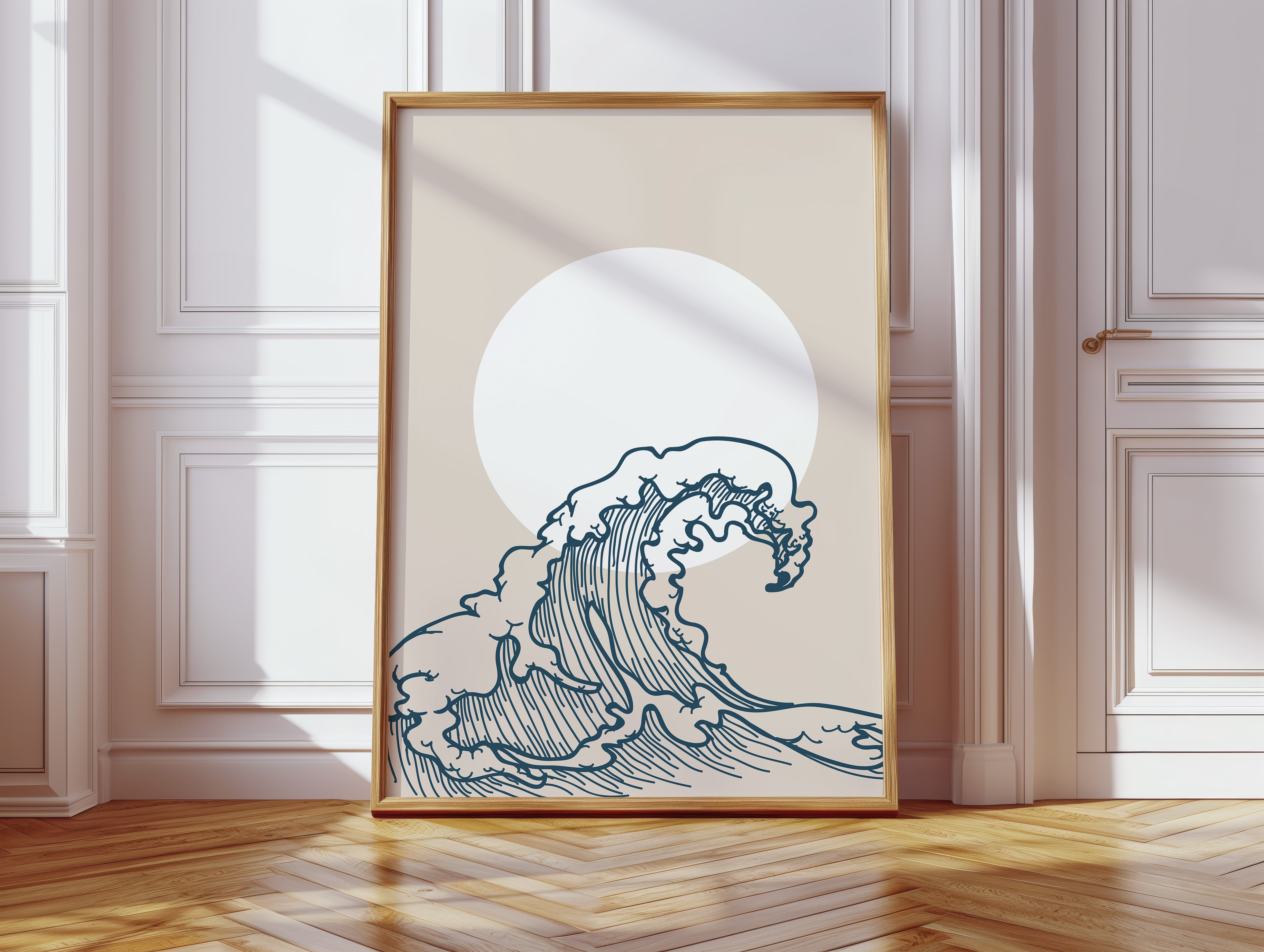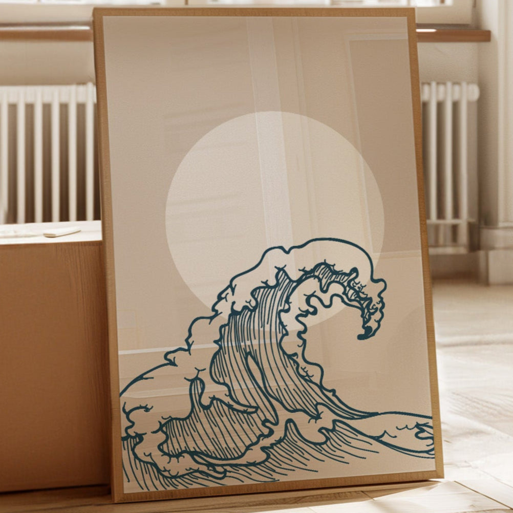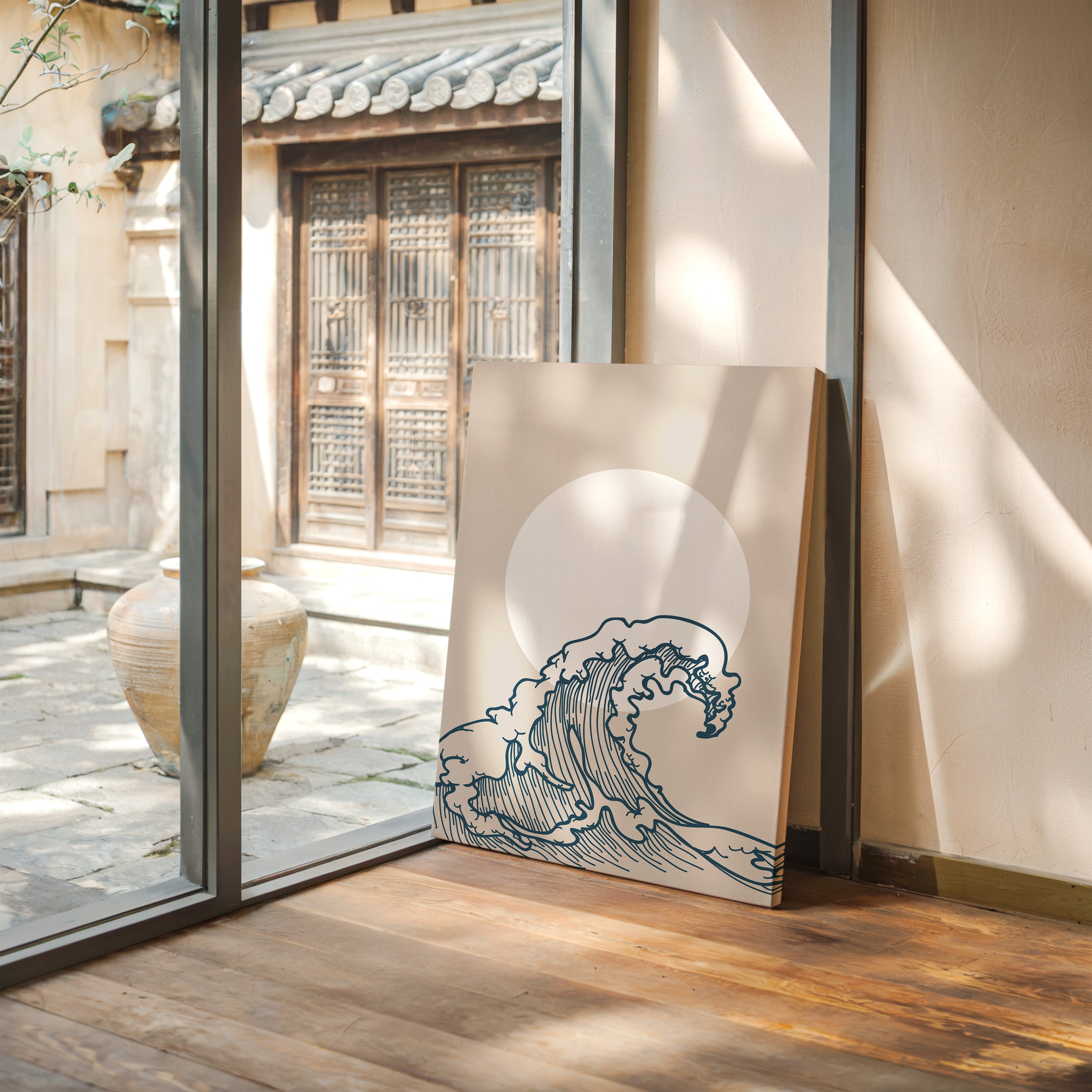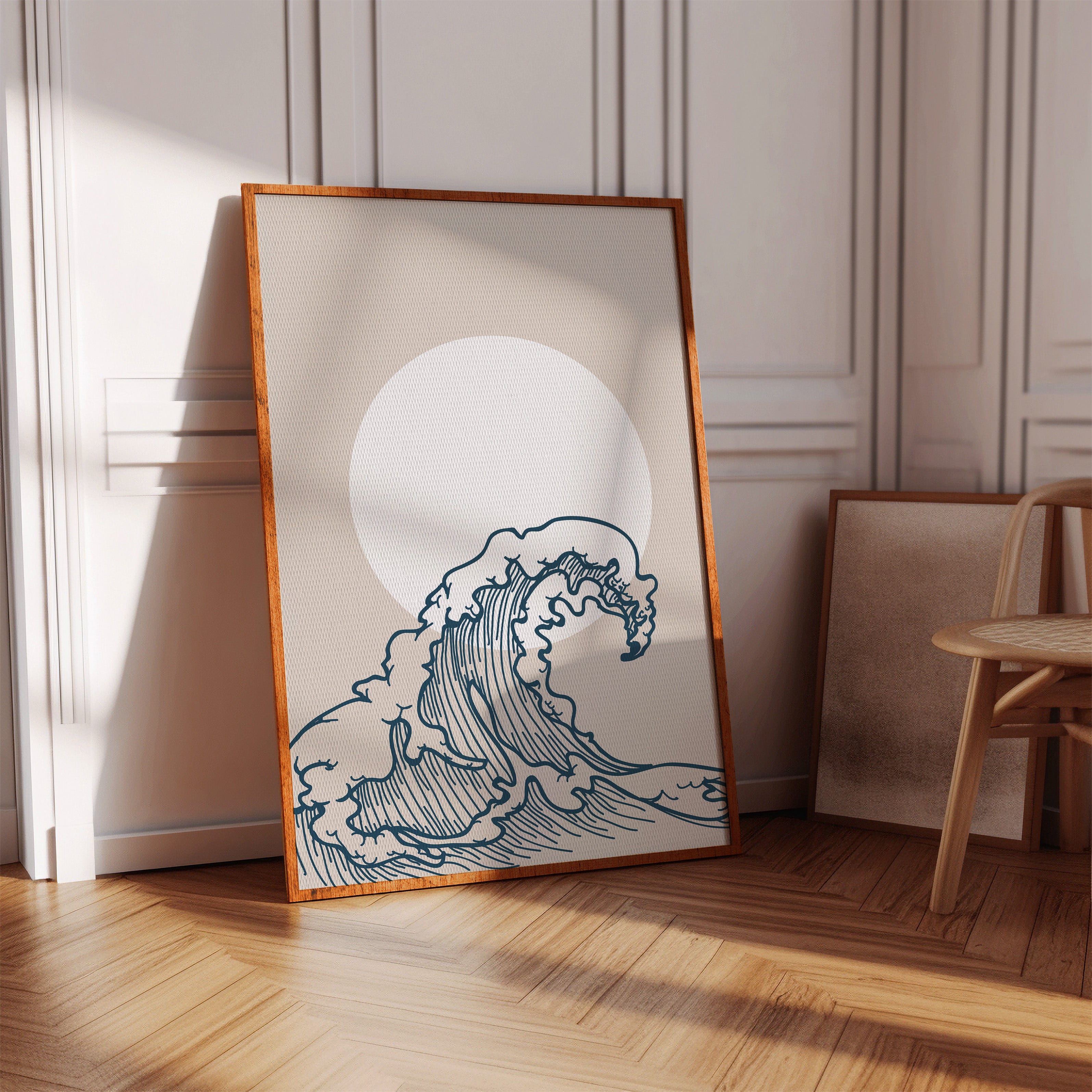 A single wave rises against the luminous moon, its flowing lines capturing the eternal dance between sea and sky. This minimalist piece from our Contemporary collection brings Japanese woodblock traditions into modern expression. Deep navy brushstrokes create rhythmic movement across the canvas, while negative space speaks volumes in peaceful beige tones. The wave's dramatic curl suggests both power and grace, its detailed linear patterns drawing the eye through each curve and crest. This piece brings serene coastal energy to meditation spaces or reading nooks, offering a moment of contemplative pause in our busy world. Its timeless design speaks to both traditional art lovers and modern minimalists.