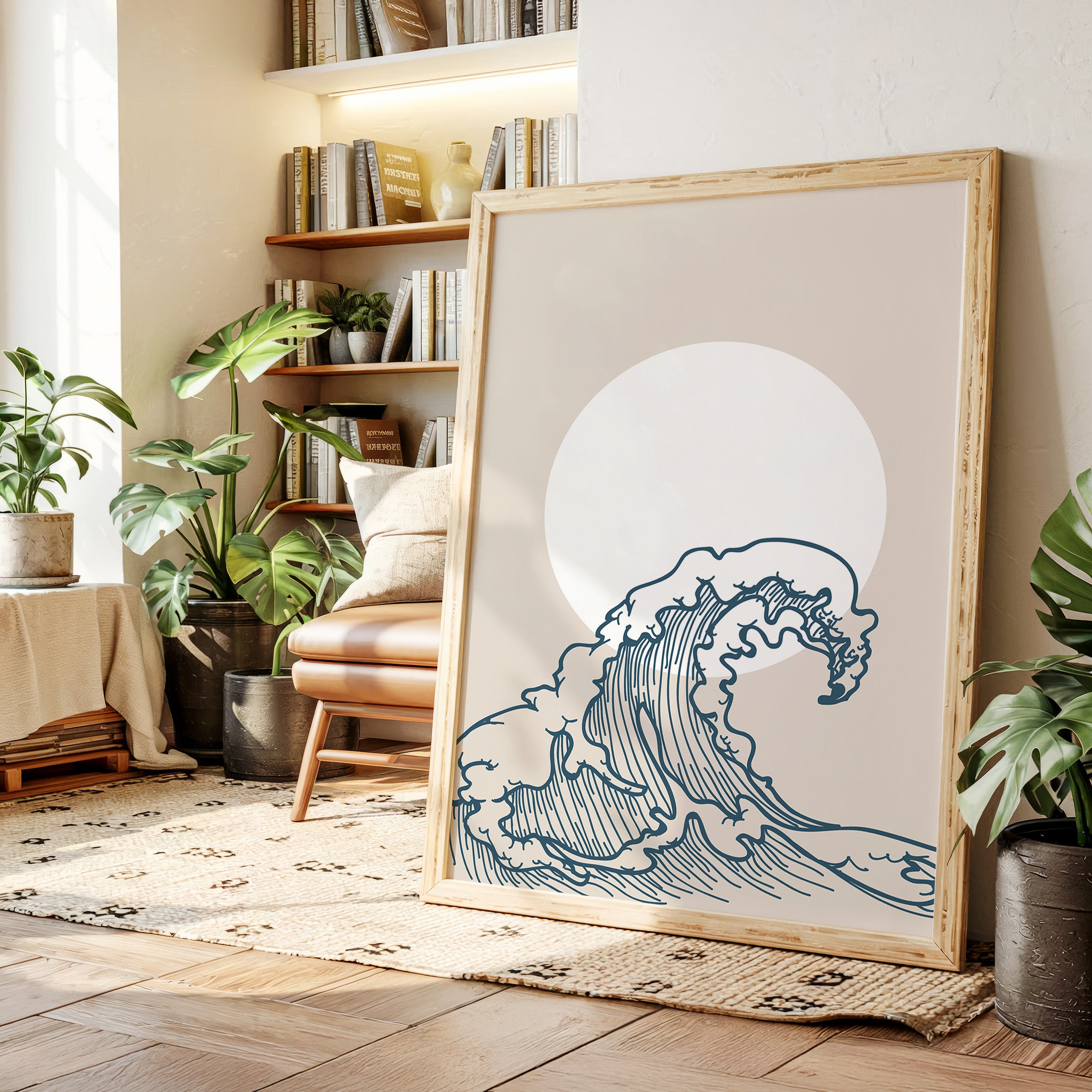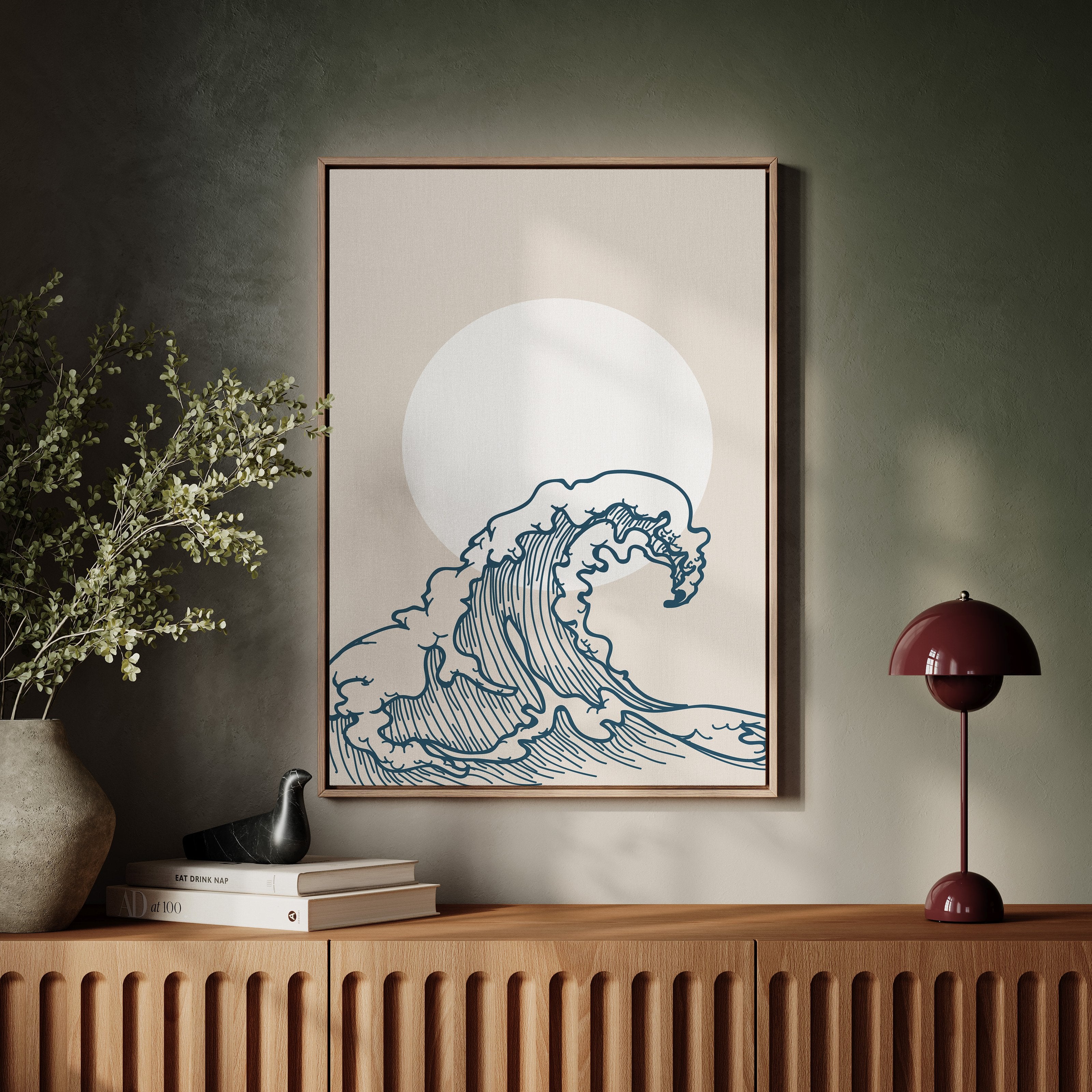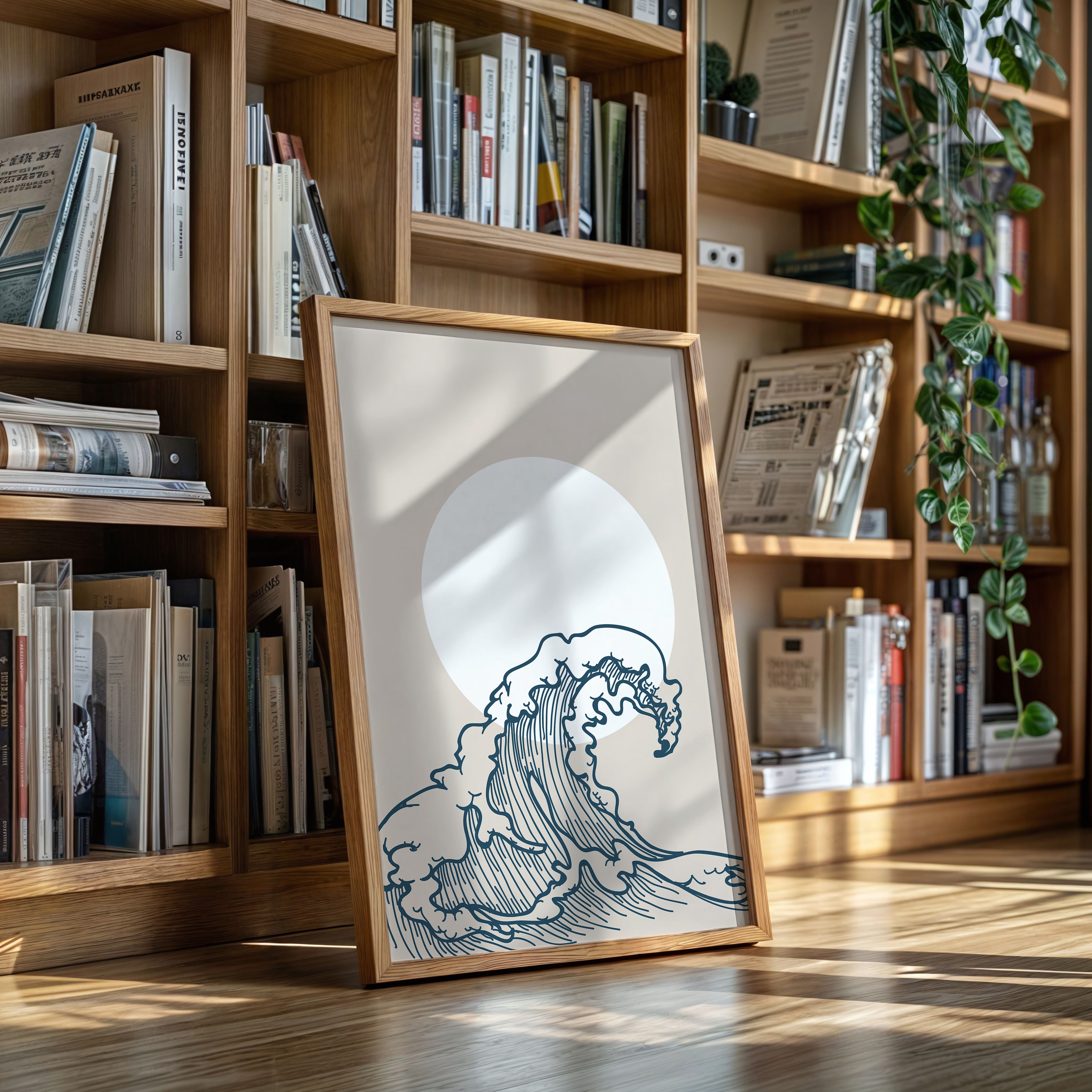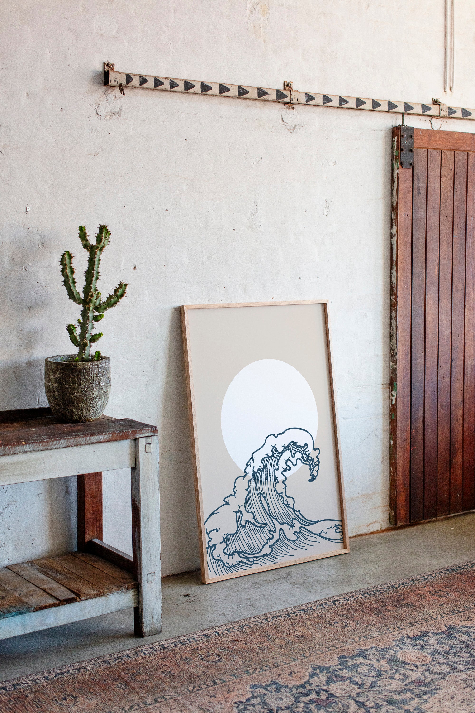 A single wave rises against the luminous moon, its flowing lines capturing the eternal dance between sea and sky. This minimalist piece from our Contemporary collection brings Japanese woodblock traditions into modern expression. Deep navy brushstrokes create rhythmic movement across the canvas, while negative space speaks volumes in peaceful beige tones. The wave's dramatic curl suggests both power and grace, its detailed linear patterns drawing the eye through each curve and crest. This piece brings serene coastal energy to meditation spaces or reading nooks, offering a moment of contemplative pause in our busy world. Its timeless design speaks to both traditional art lovers and modern minimalists.