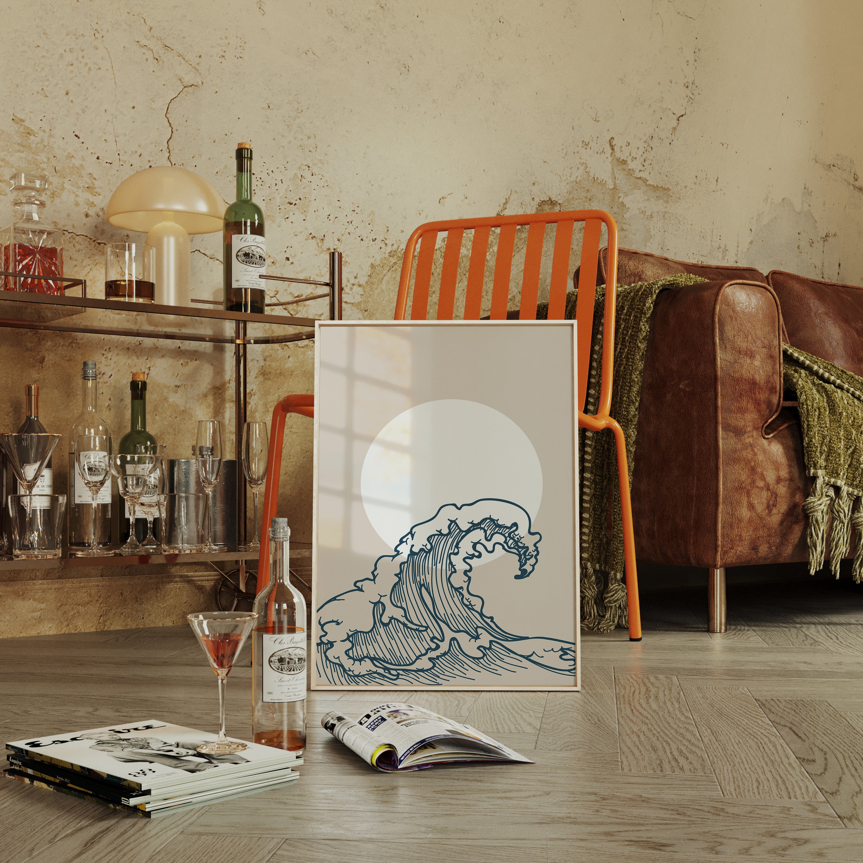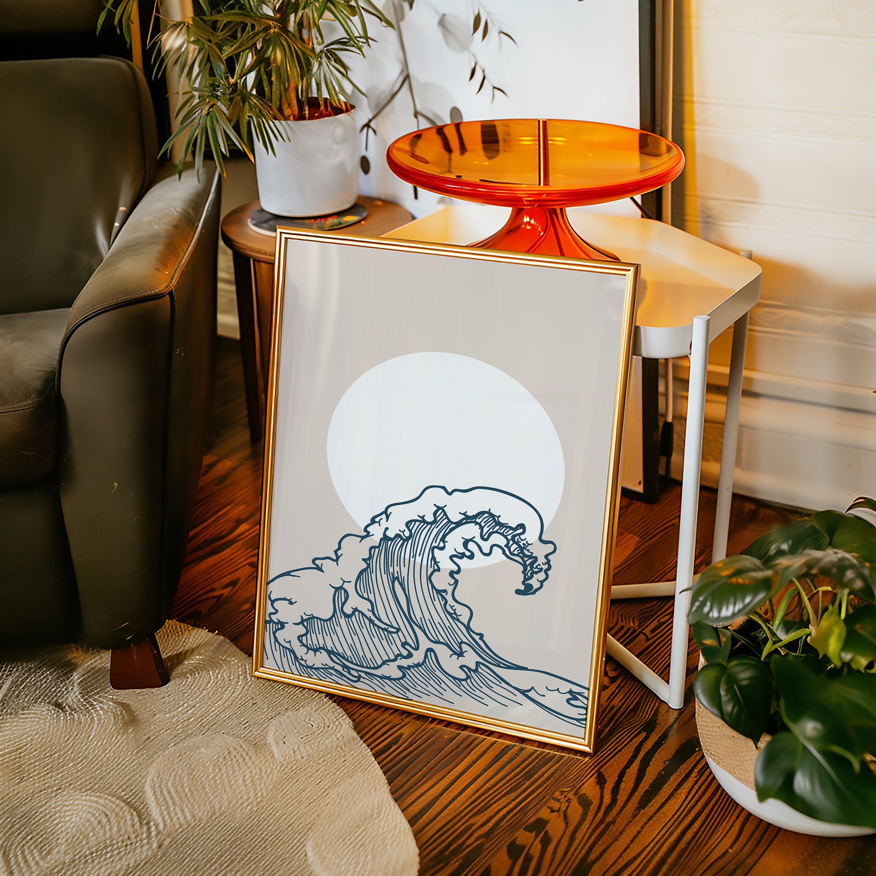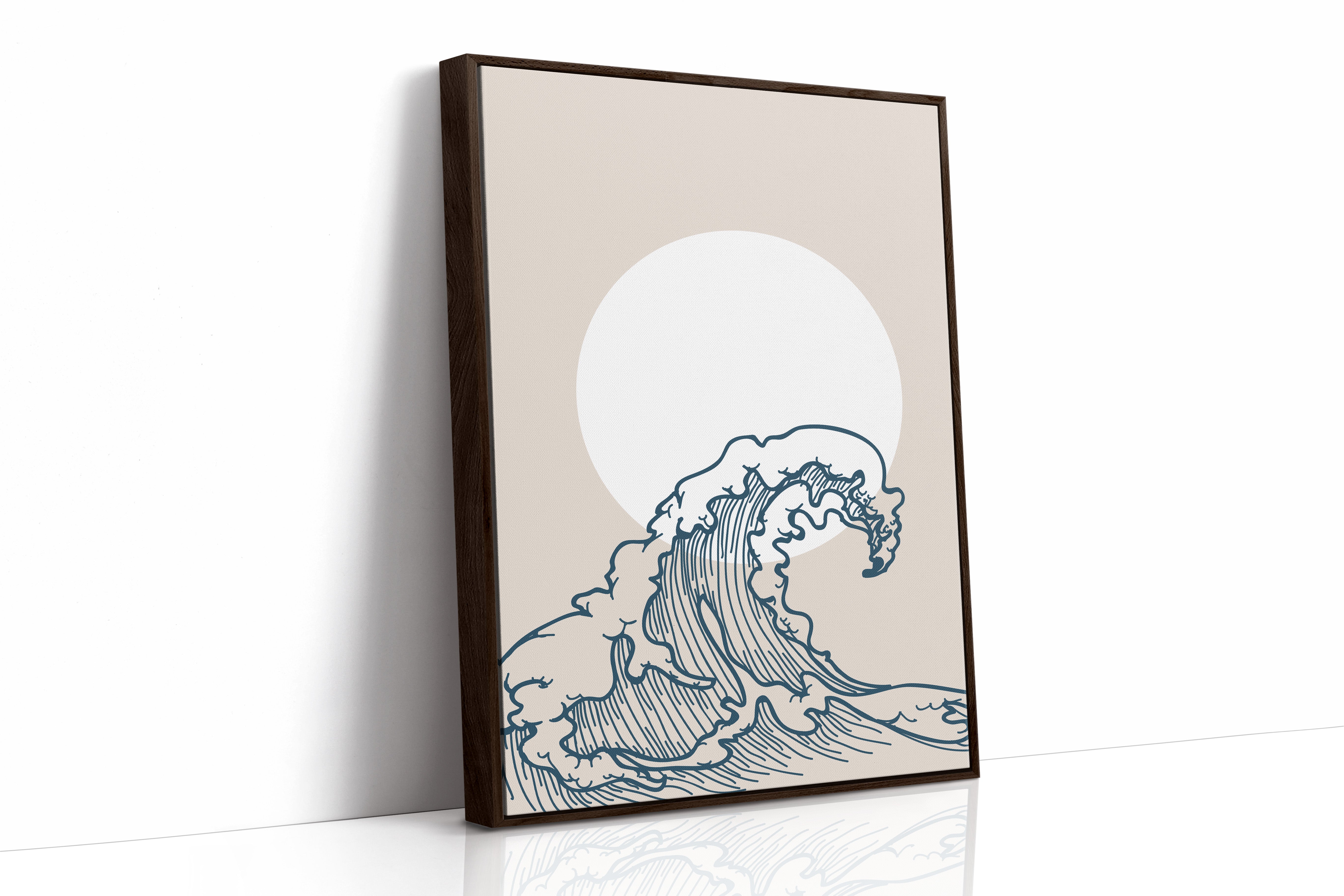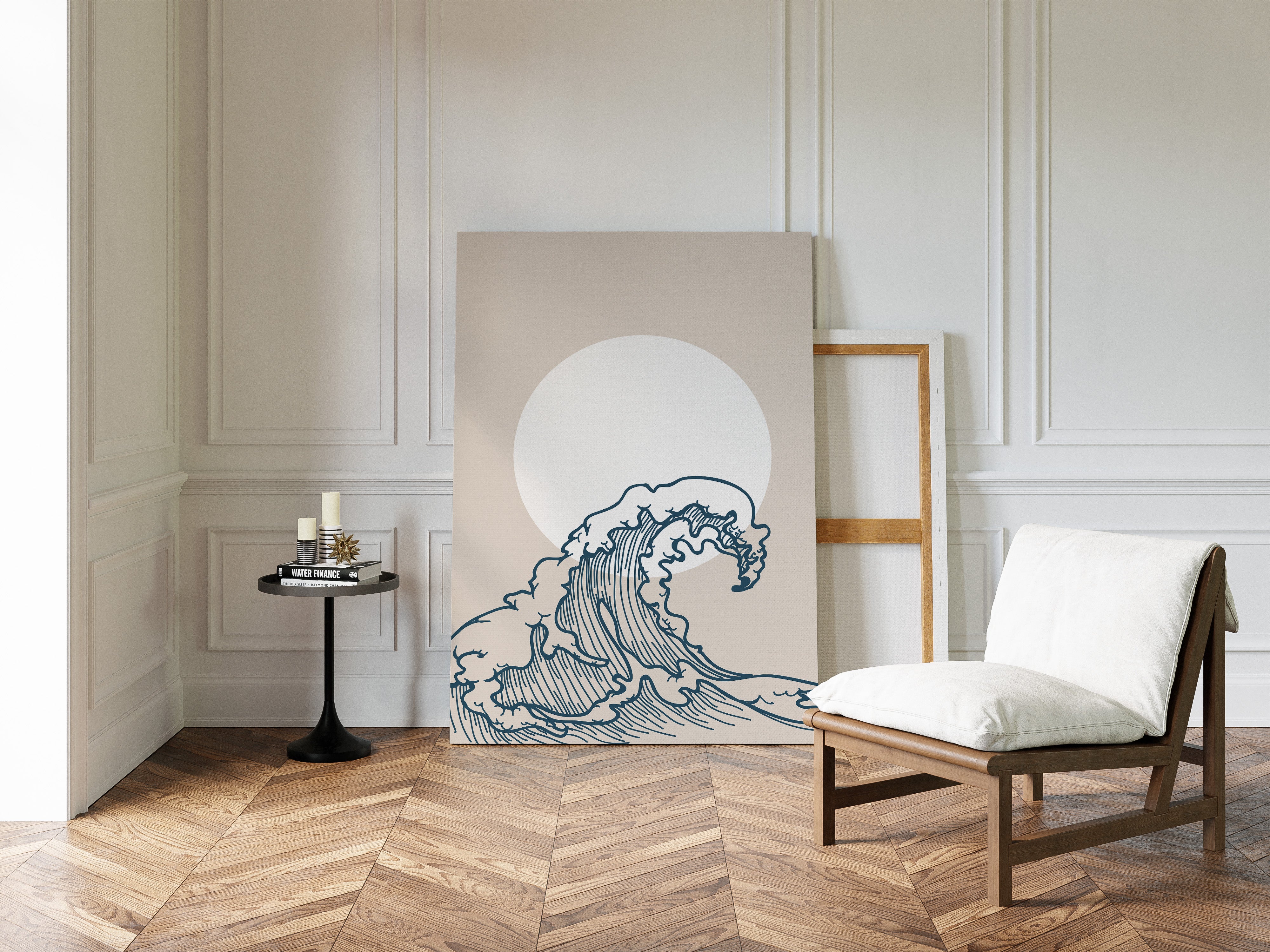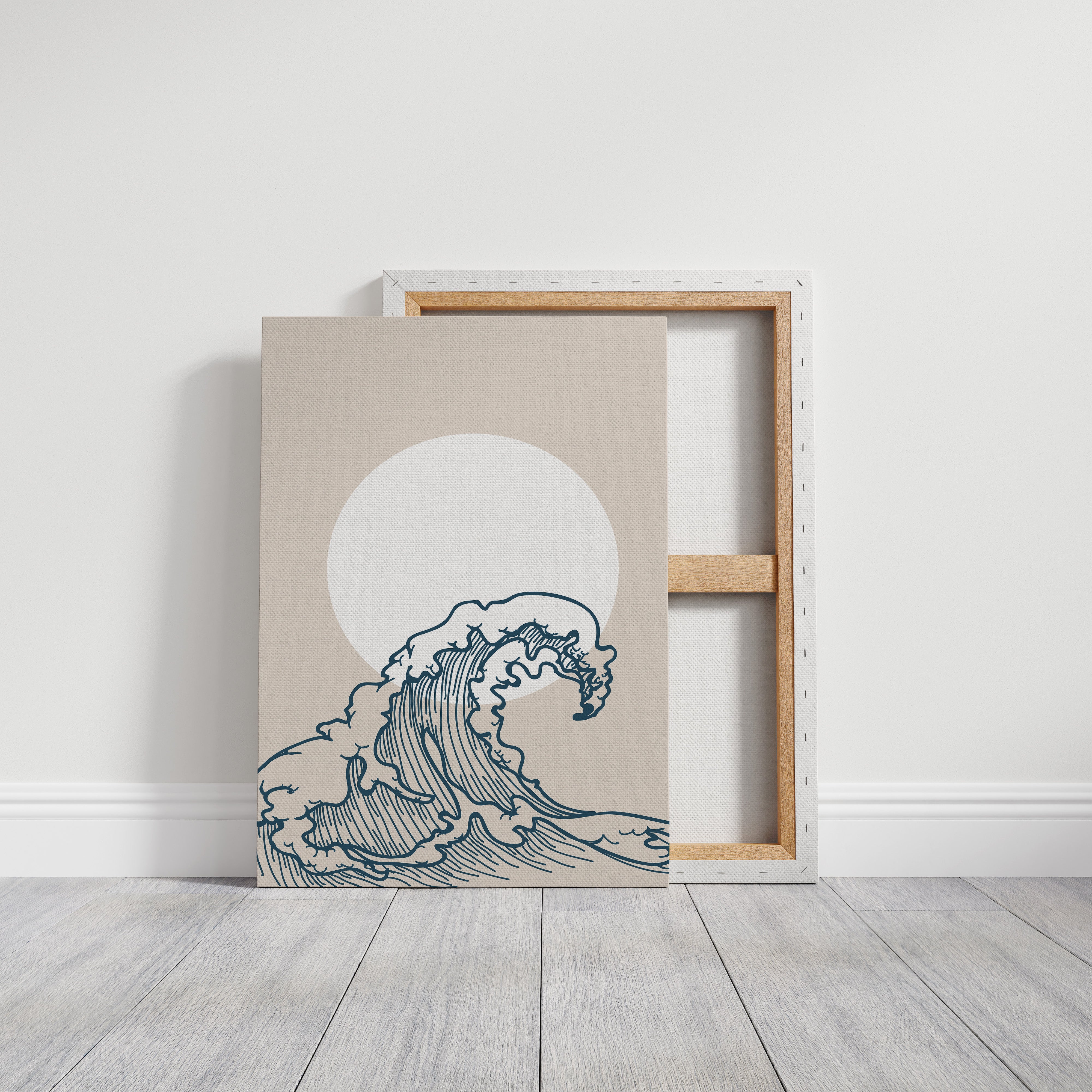 A single wave rises against the luminous moon, its flowing lines capturing the eternal dance between sea and sky. This minimalist piece from our Contemporary collection brings Japanese woodblock traditions into modern expression. Deep navy brushstrokes create rhythmic movement across the canvas, while negative space speaks volumes in peaceful beige tones. The wave's dramatic curl suggests both power and grace, its detailed linear patterns drawing the eye through each curve and crest. This piece brings serene coastal energy to meditation spaces or reading nooks, offering a moment of contemplative pause in our busy world. Its timeless design speaks to both traditional art lovers and modern minimalists.