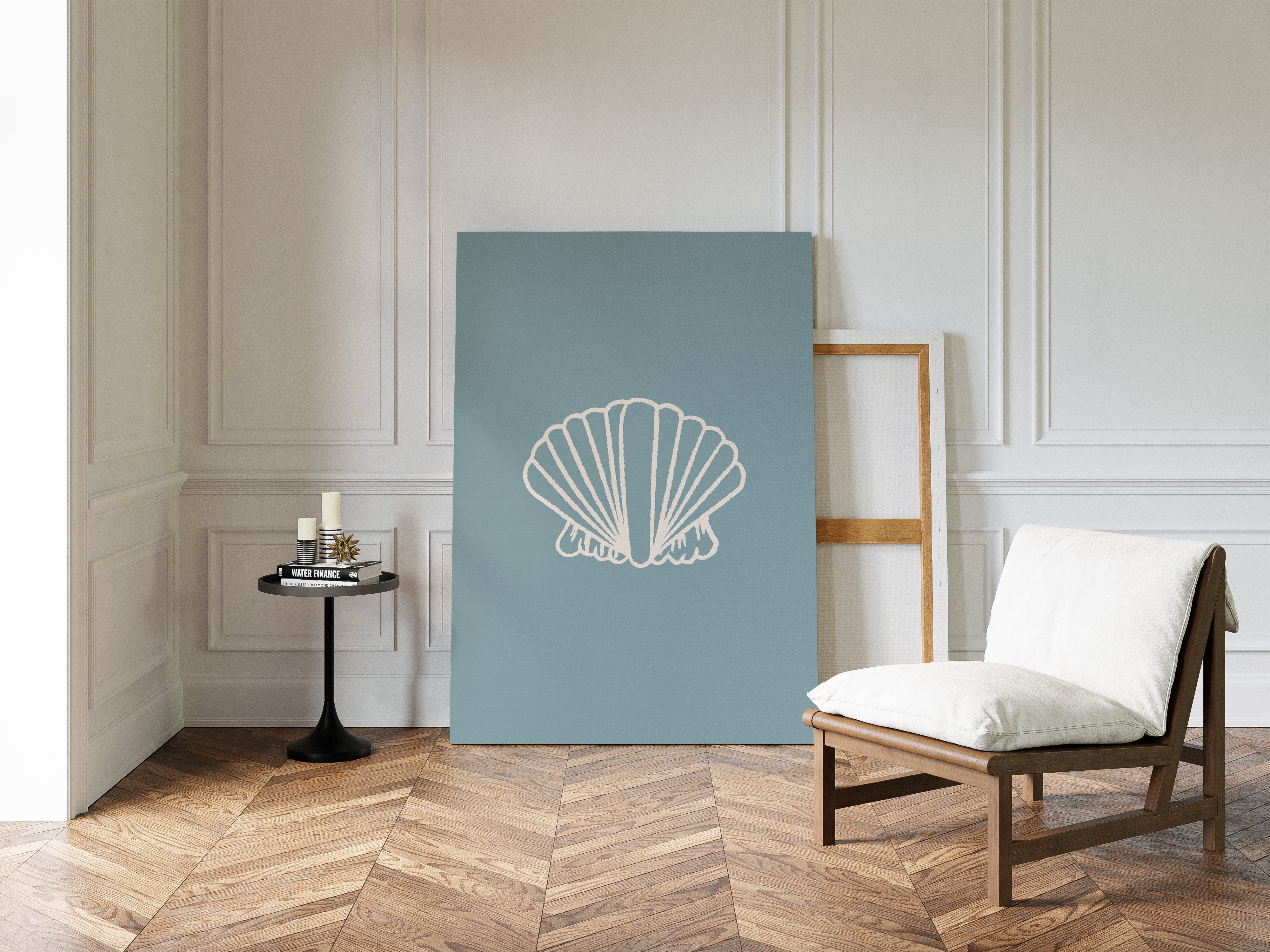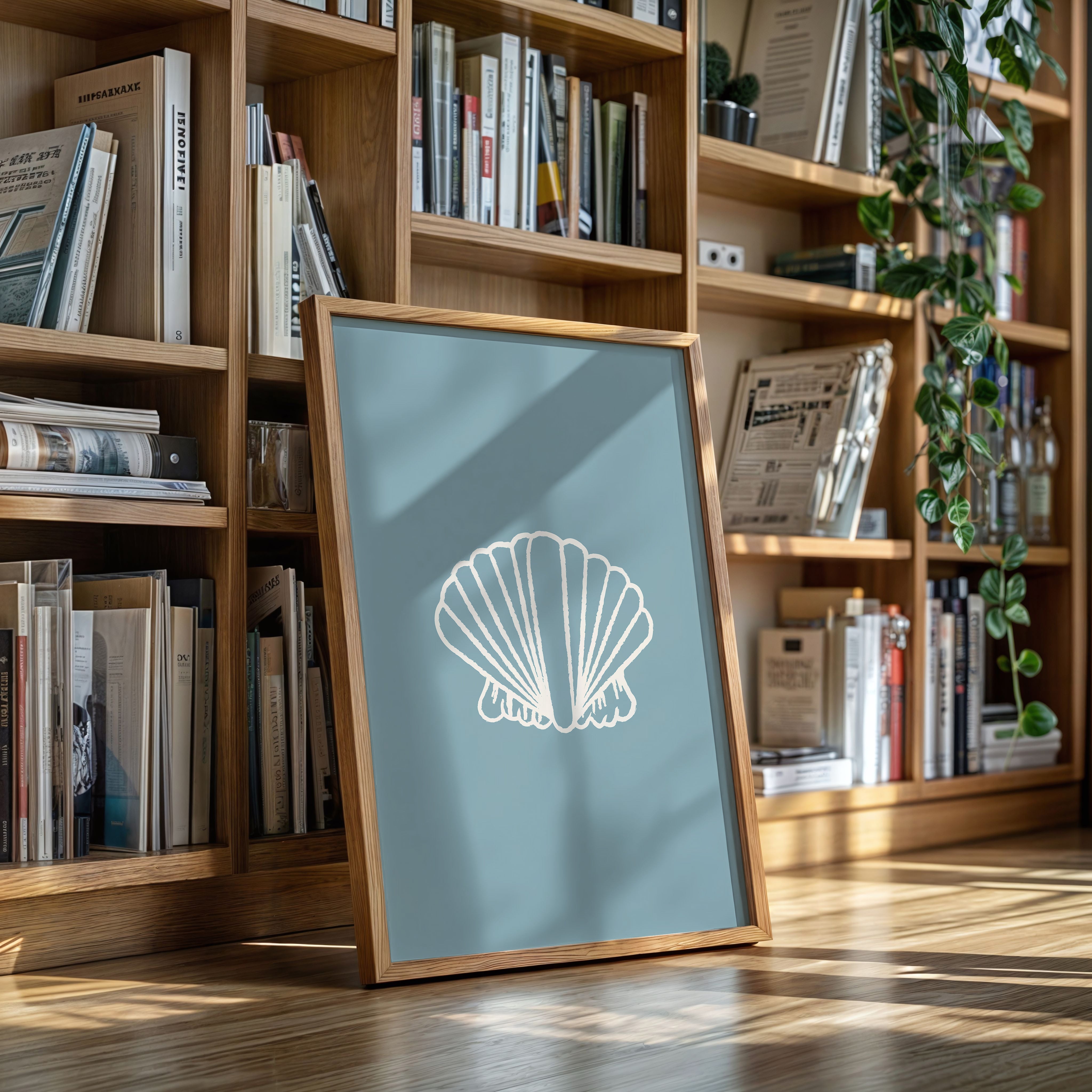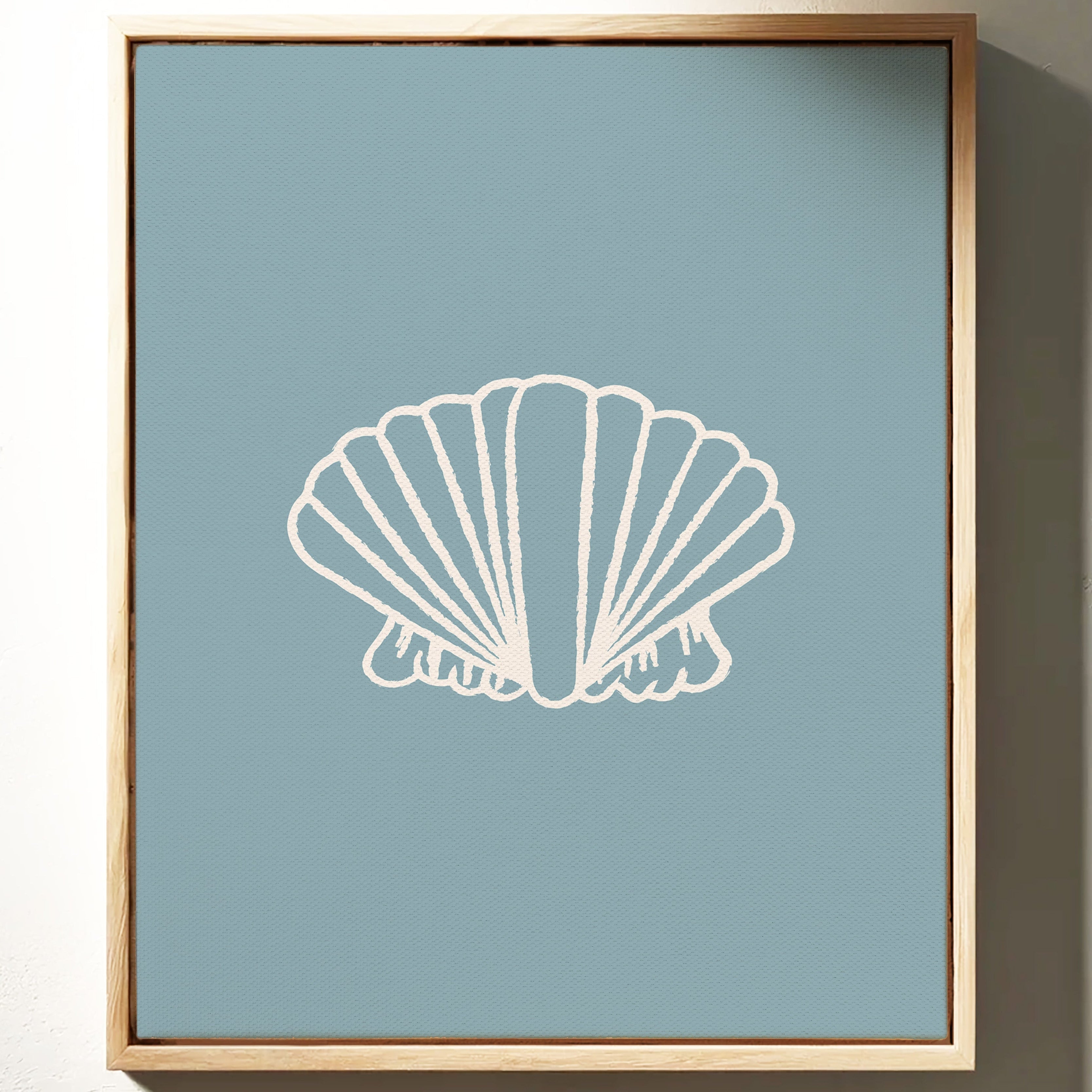 A delicate seashell hovers against tranquil blue waters, its white ridges catching soft light like memories washing ashore. This piece from our Contemporary collection marries minimalist design with coastal serenity. The shell's graceful fan-like form creates a striking silhouette, while the textured outline adds an artistic touch that speaks to both modern aesthetics and timeless natural beauty. The soothing sage-blue background evokes the gentle rhythm of tidal pools and morning mist. Perfect for bringing peaceful coastal energy to a modern bathroom, bedroom, or any space seeking that perfect balance of sophistication and seaside charm. Its clean lines and calming presence invite moments of quiet reflection.