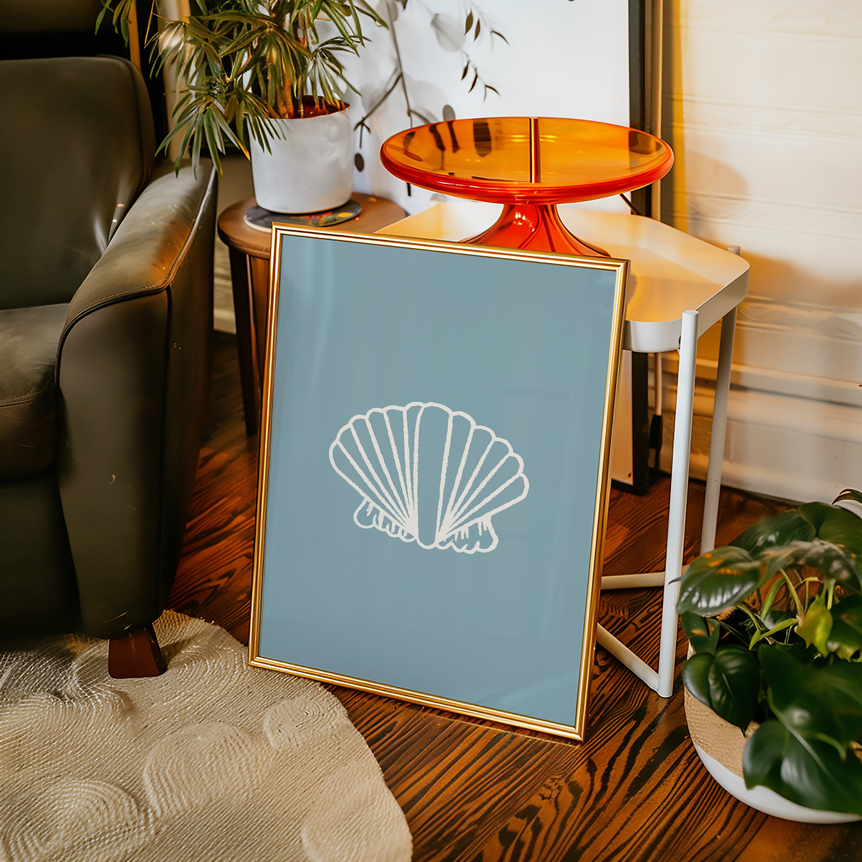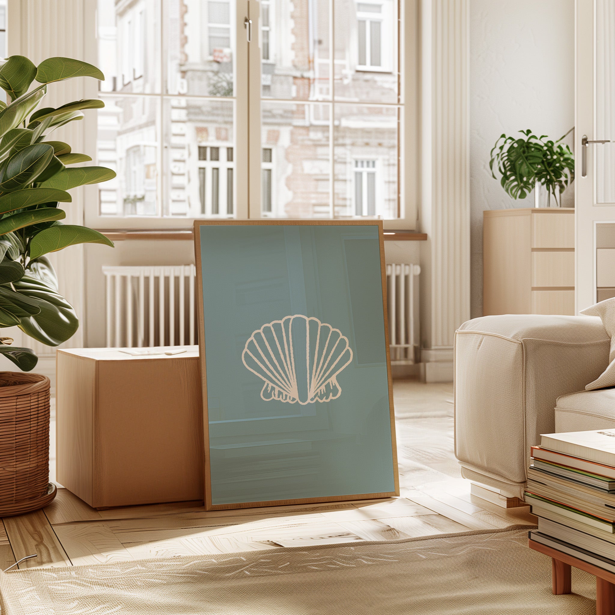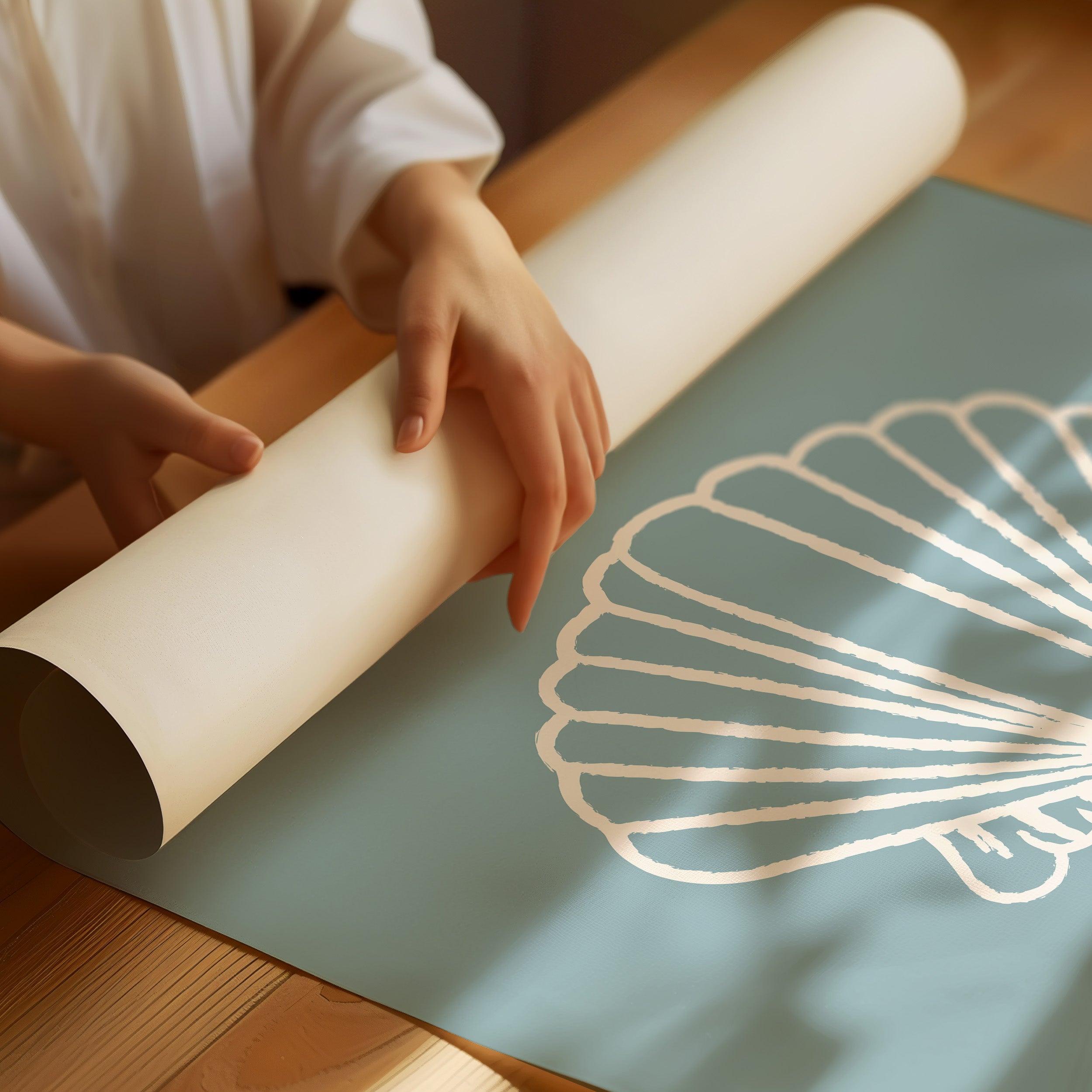 A delicate seashell hovers against tranquil blue waters, its white ridges catching soft light like memories washing ashore. This piece from our Contemporary collection marries minimalist design with coastal serenity. The shell's graceful fan-like form creates a striking silhouette, while the textured outline adds an artistic touch that speaks to both modern aesthetics and timeless natural beauty. The soothing sage-blue background evokes the gentle rhythm of tidal pools and morning mist. Perfect for bringing peaceful coastal energy to a modern bathroom, bedroom, or any space seeking that perfect balance of sophistication and seaside charm. Its clean lines and calming presence invite moments of quiet reflection.