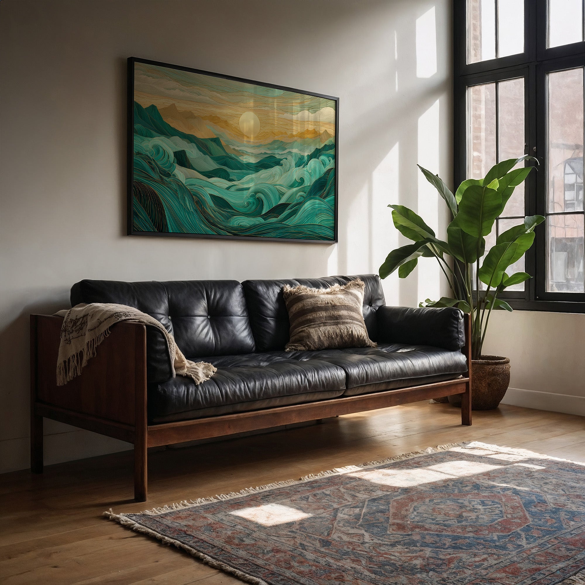 Sunlight streams through windows, casting golden warmth across a serene living space where an artistic interpretation of rolling waves meets mountainous terrain. The artwork's sweeping emerald curves and sunlit amber sky create a mesmerizing dance of nature's most dramatic elements. Rich turquoise waves transform into mountain peaks beneath a glowing orb, while delicate plant shadows play across cream walls behind the piece. This statement piece would elevate any contemporary living room, meditation space, or home office where its calming yet dynamic energy can be fully appreciated.